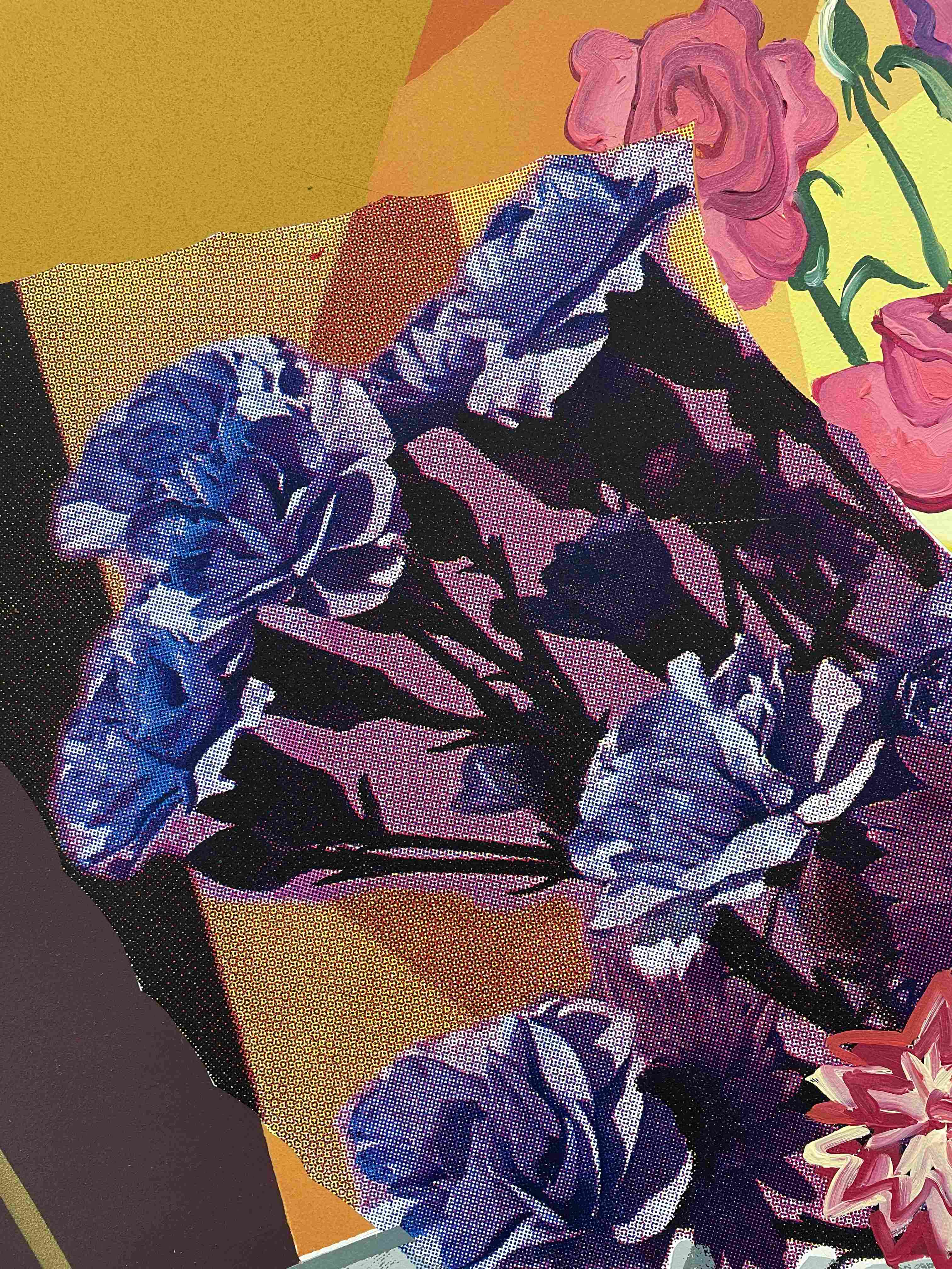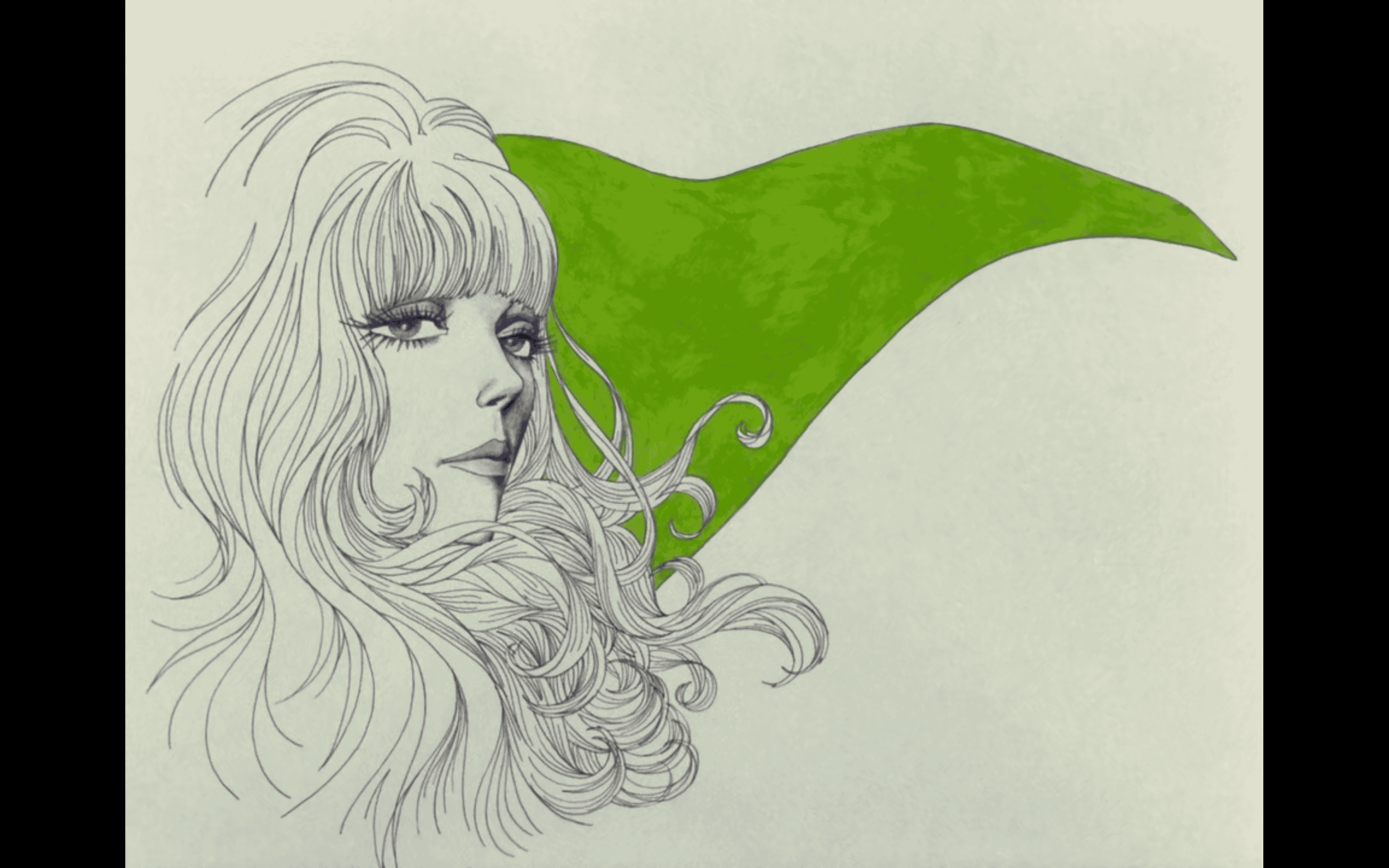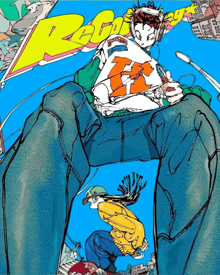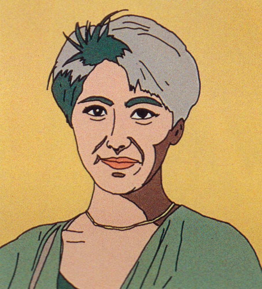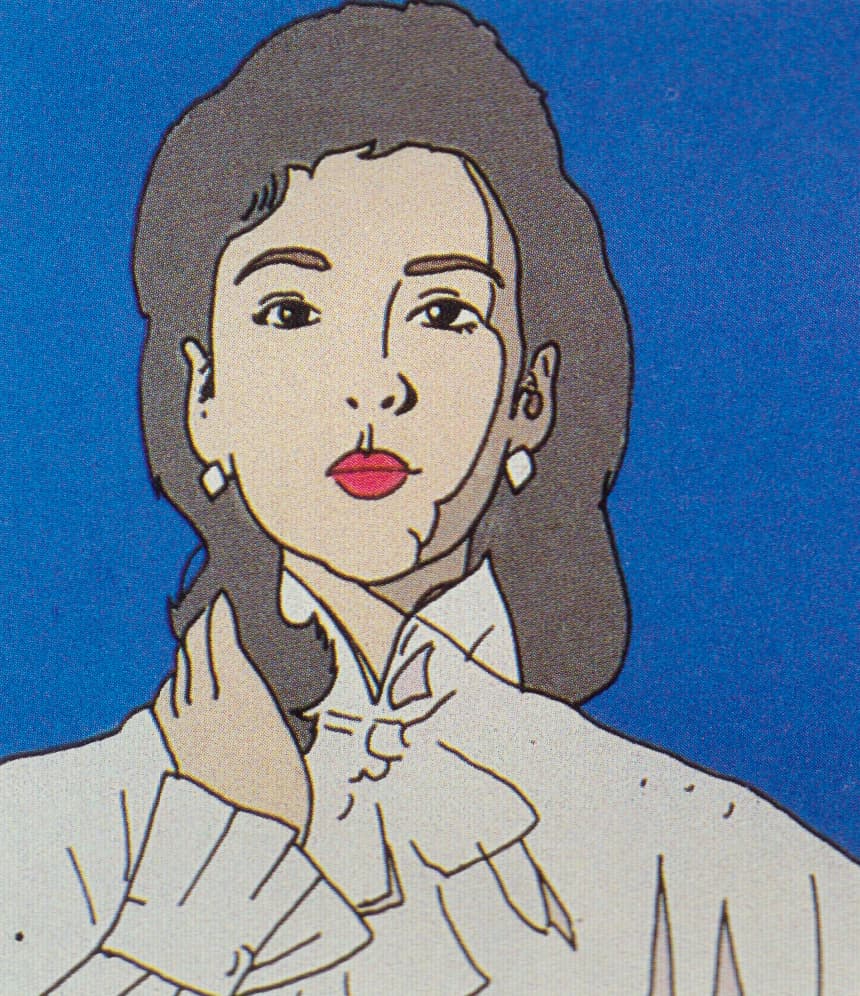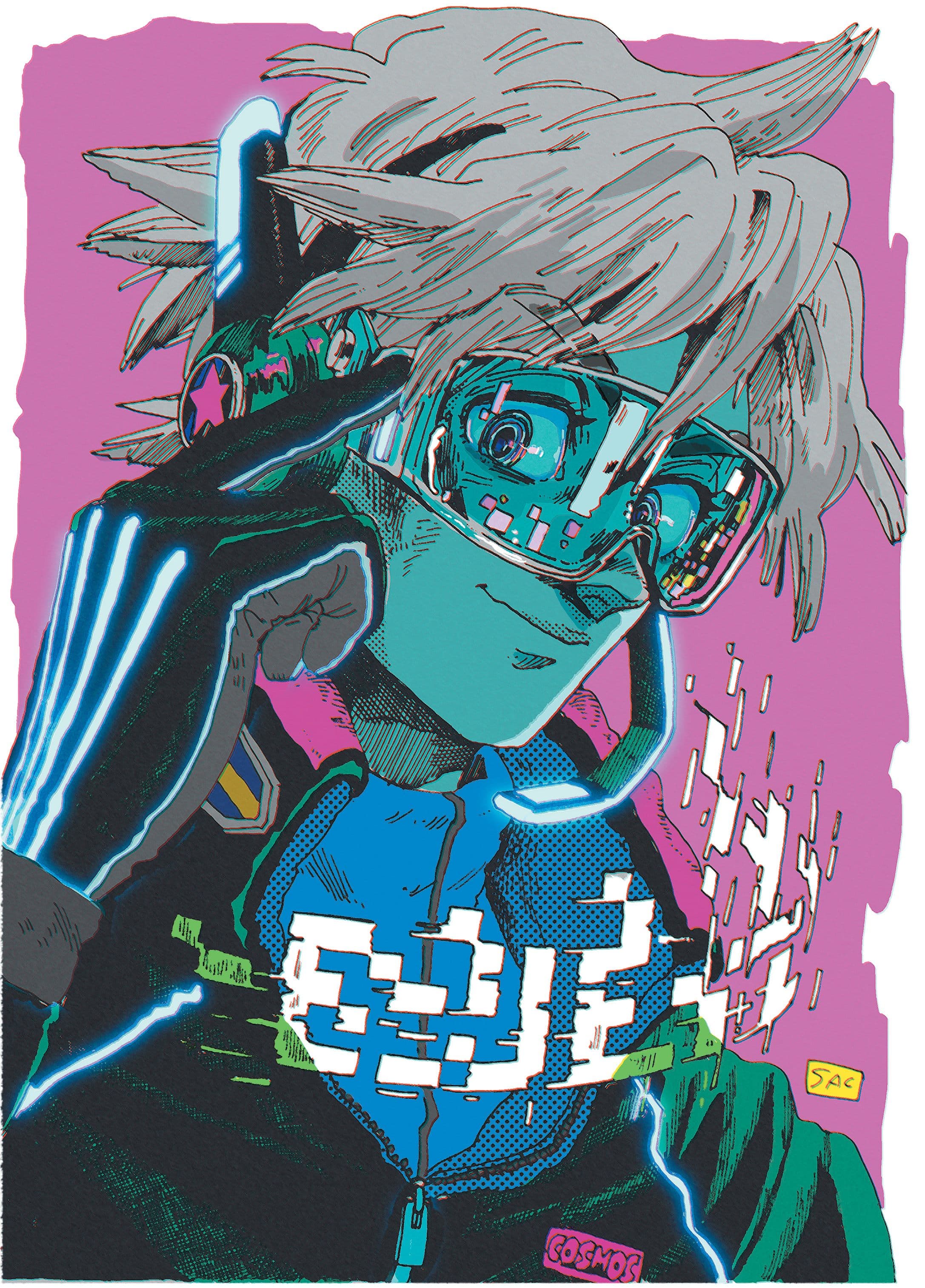 Graphic portrait of a woman with blue hair and a green jacket against a pink background