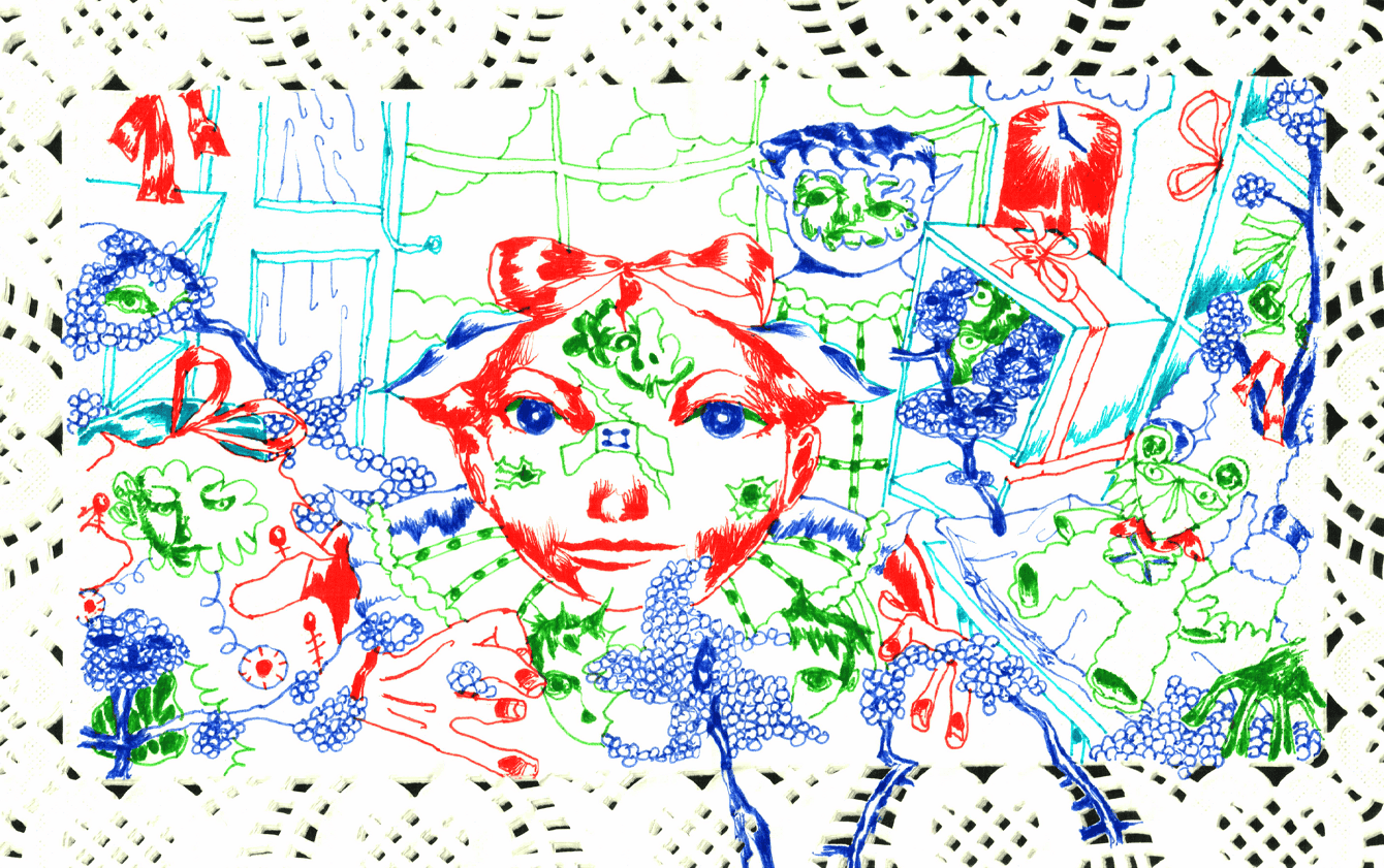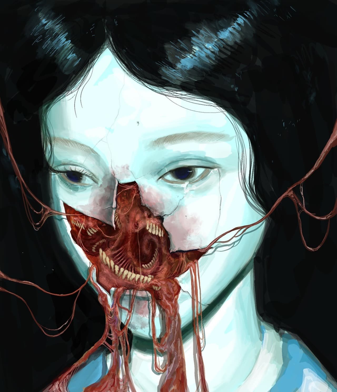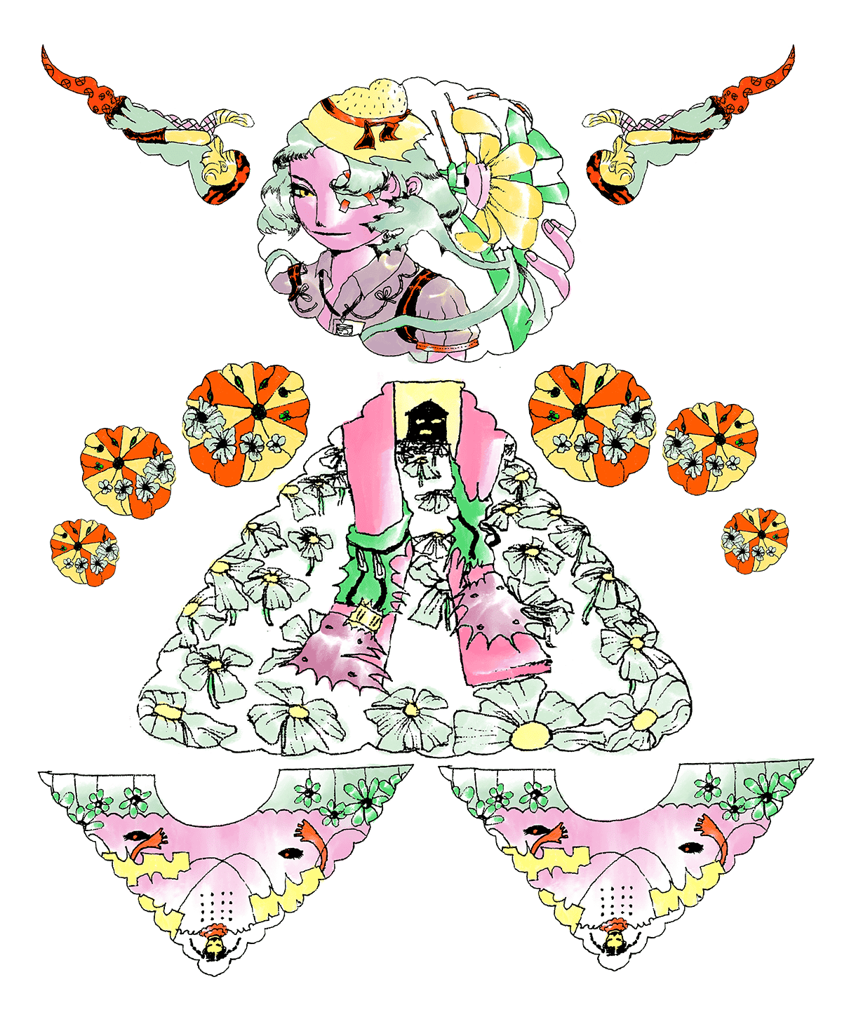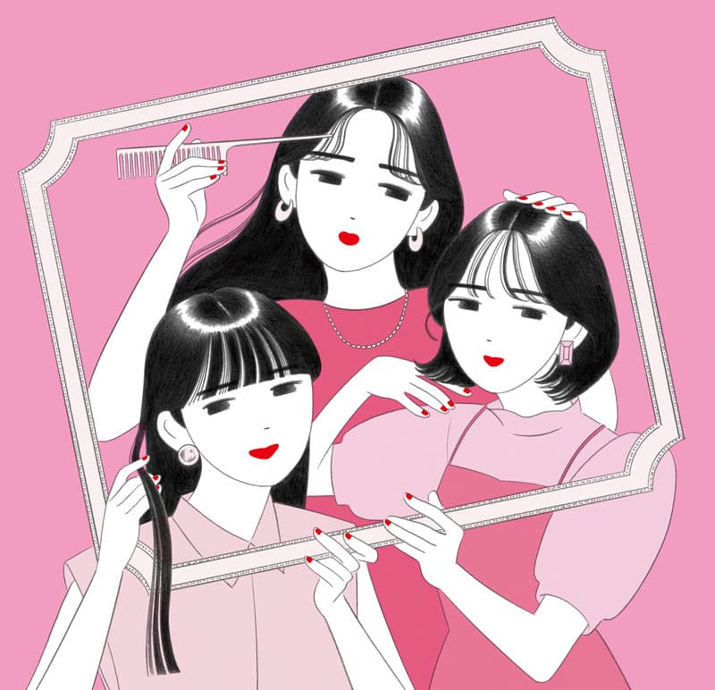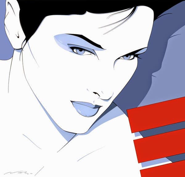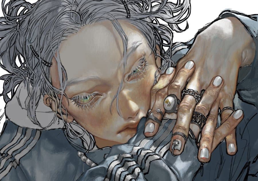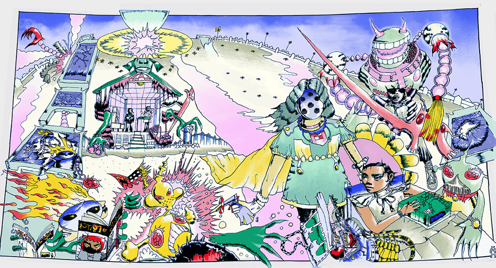 Graphic portrait of a woman with blue hair and a green jacket against a pink background