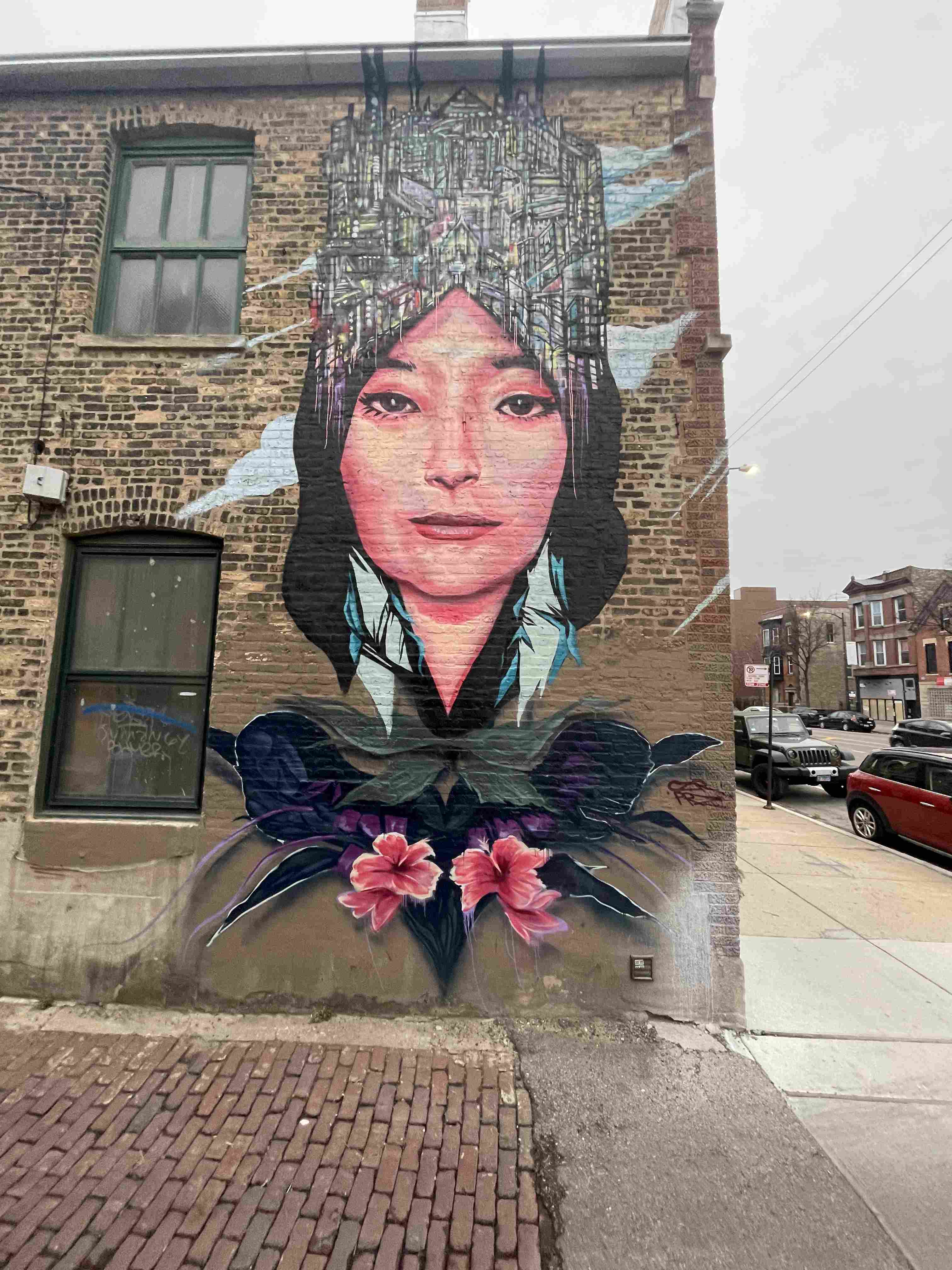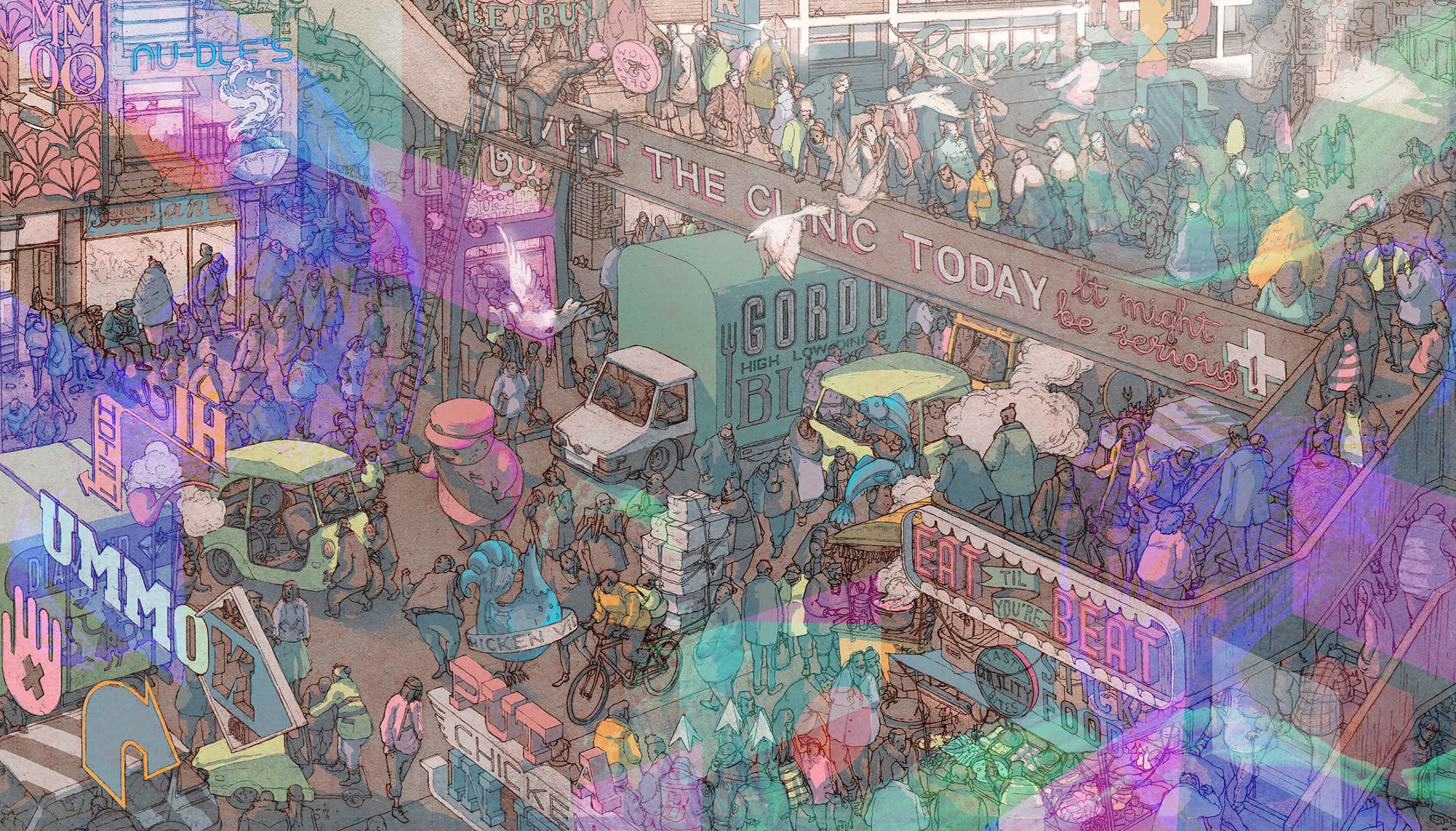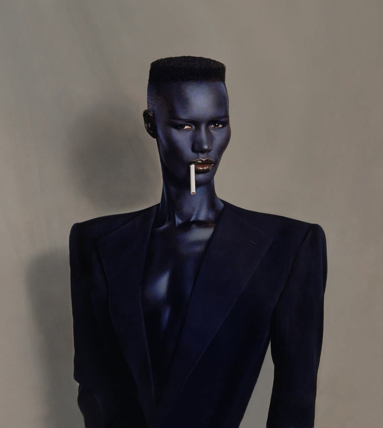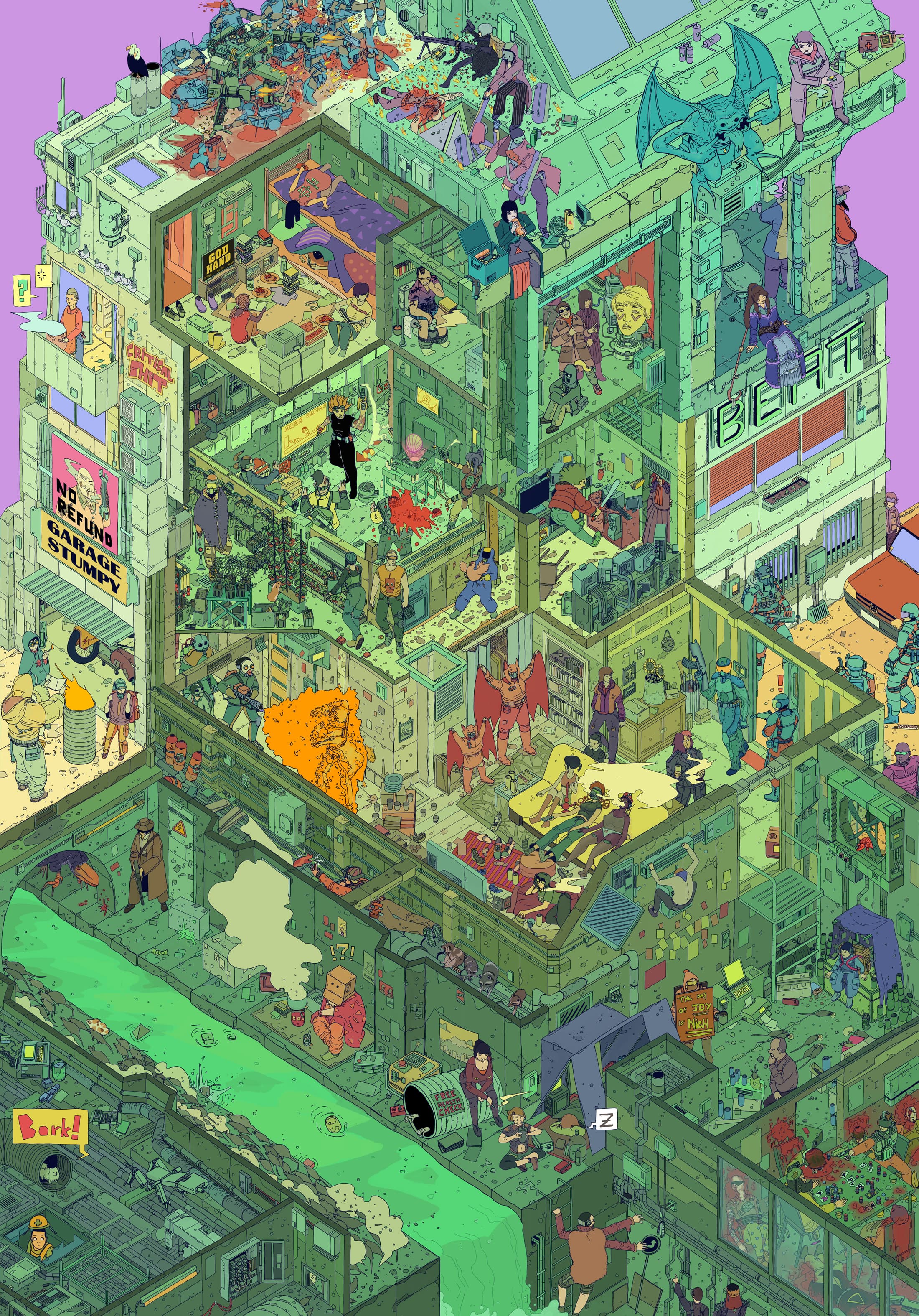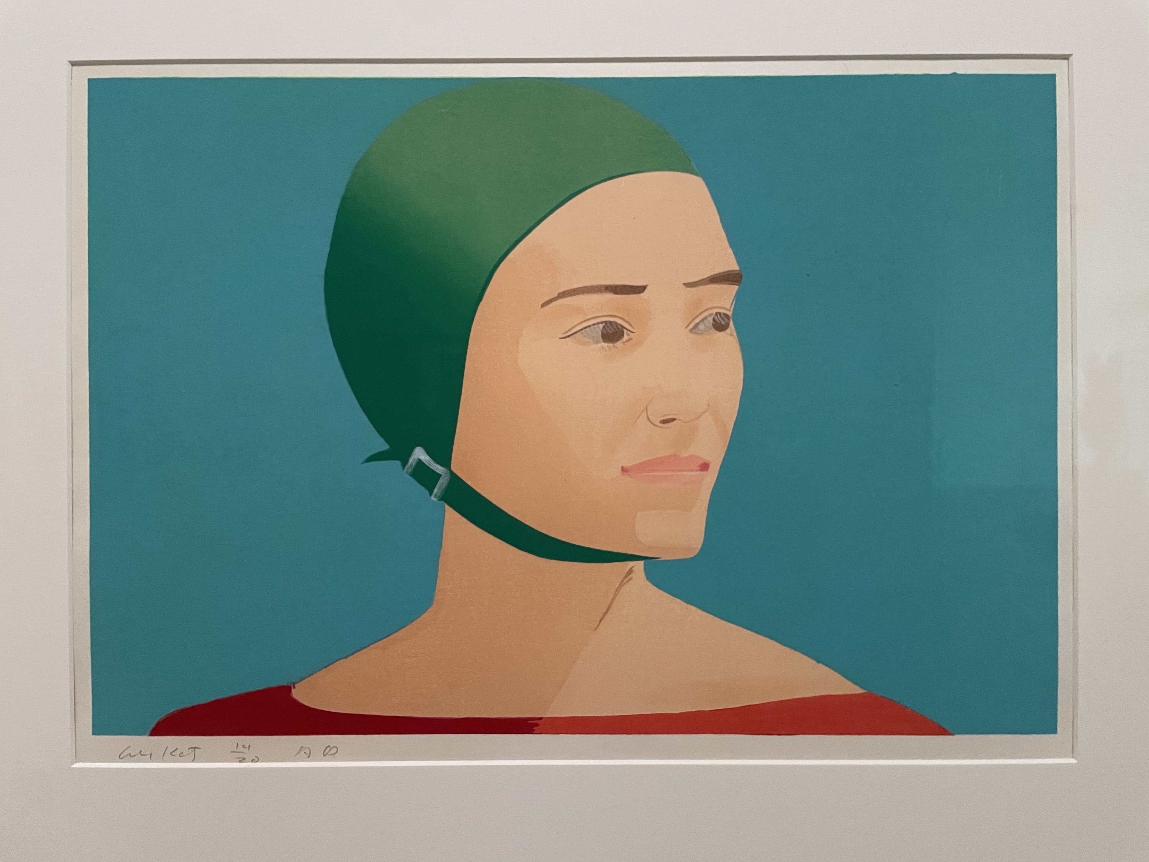 Graphic portrait of a woman with blue hair and a green jacket against a pink background