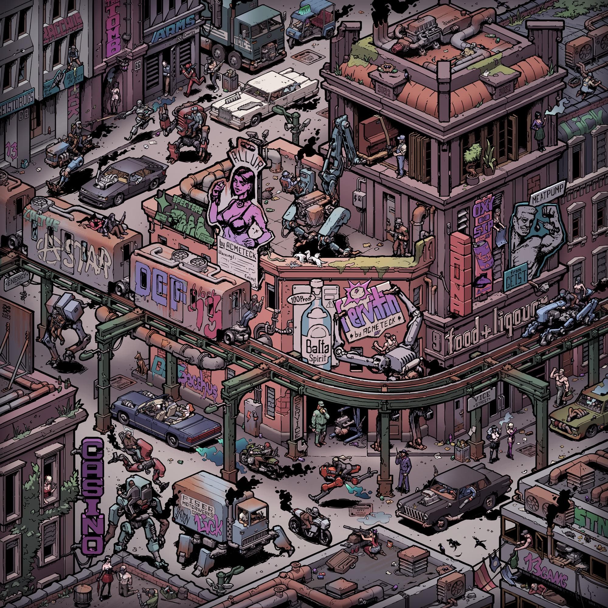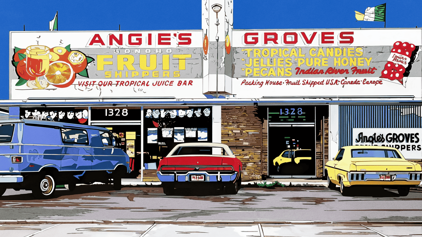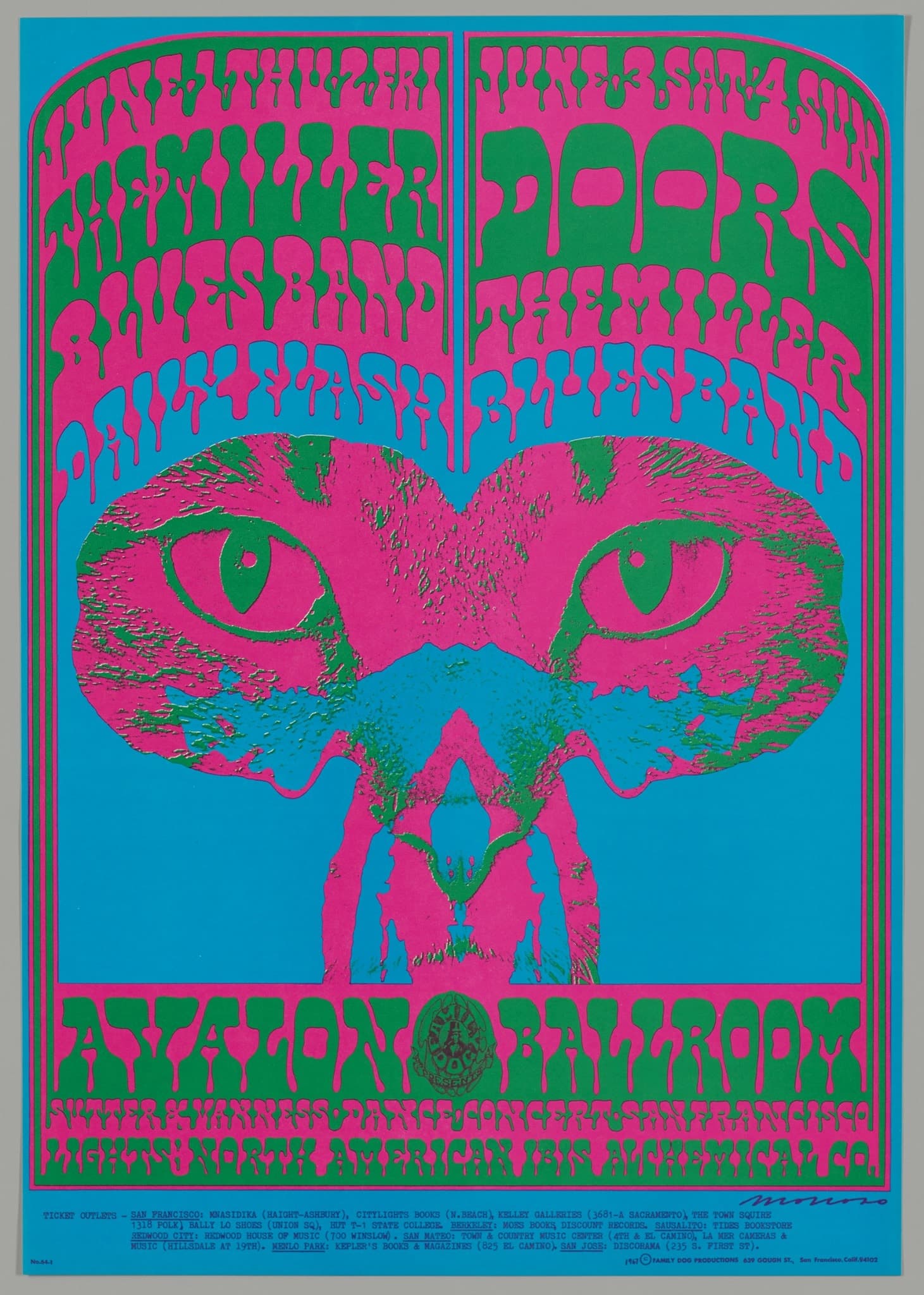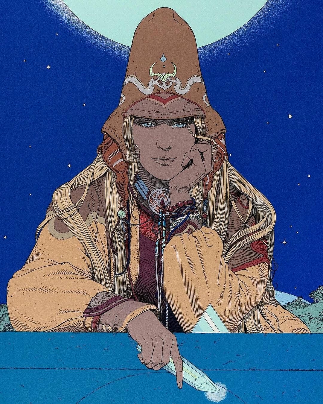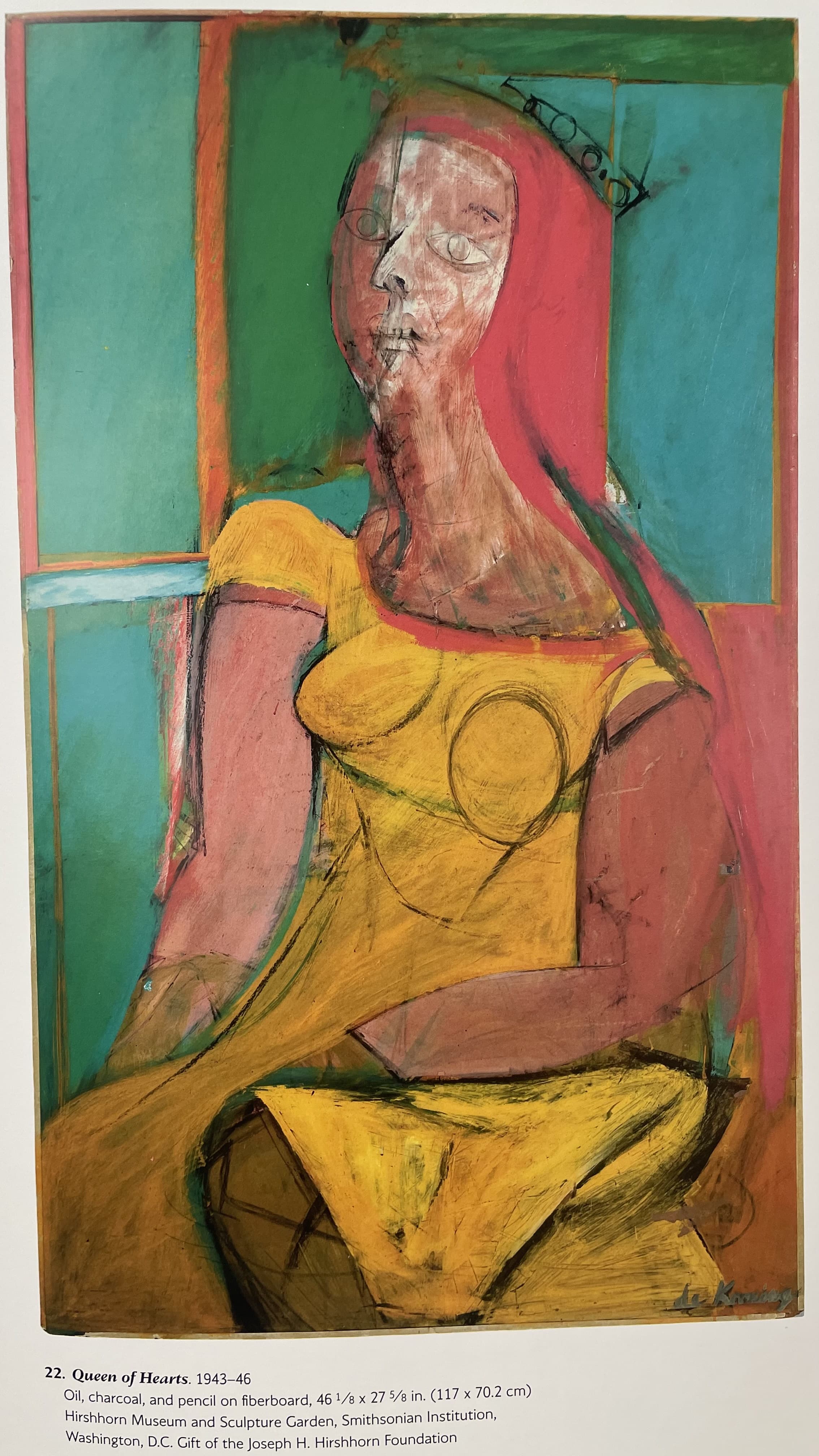 Graphic portrait of a woman with blue hair and a green jacket against a pink background