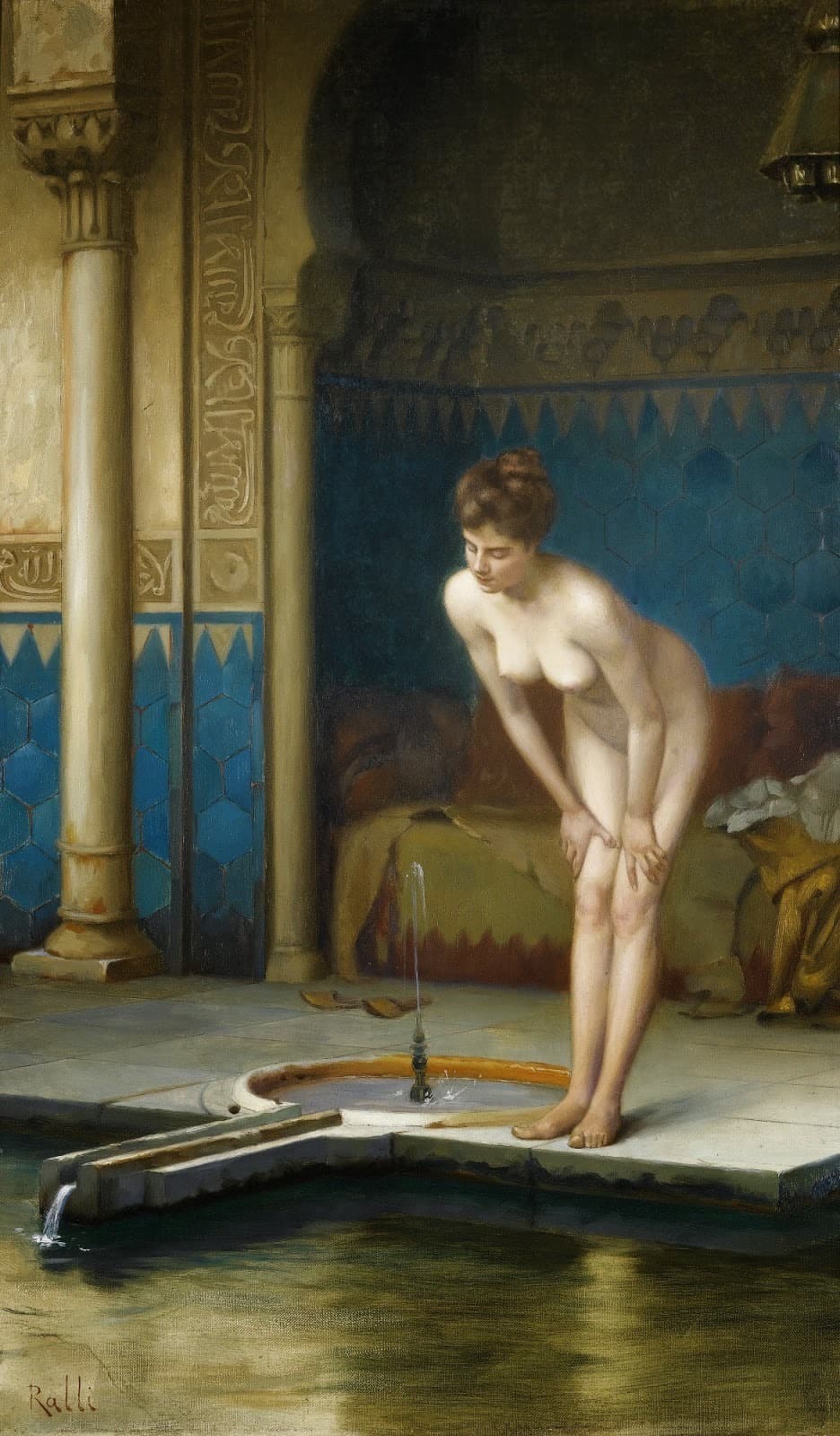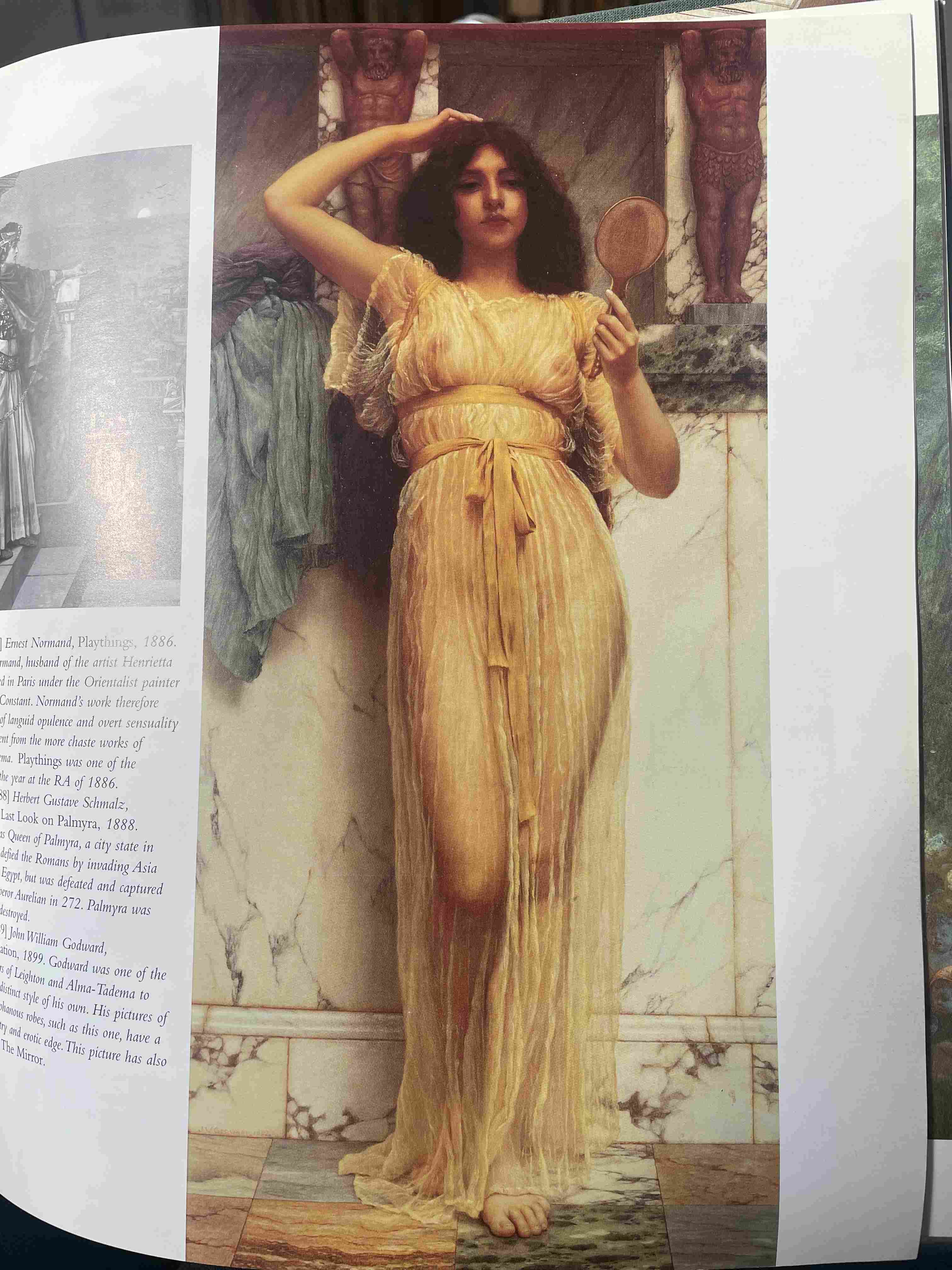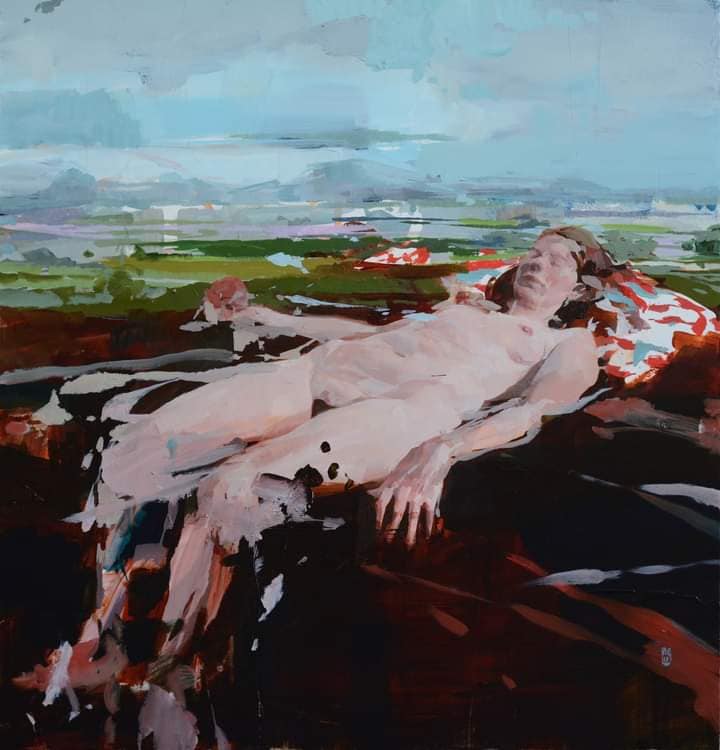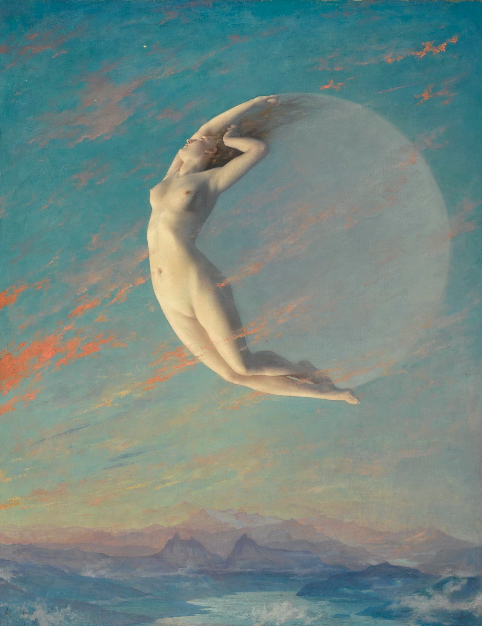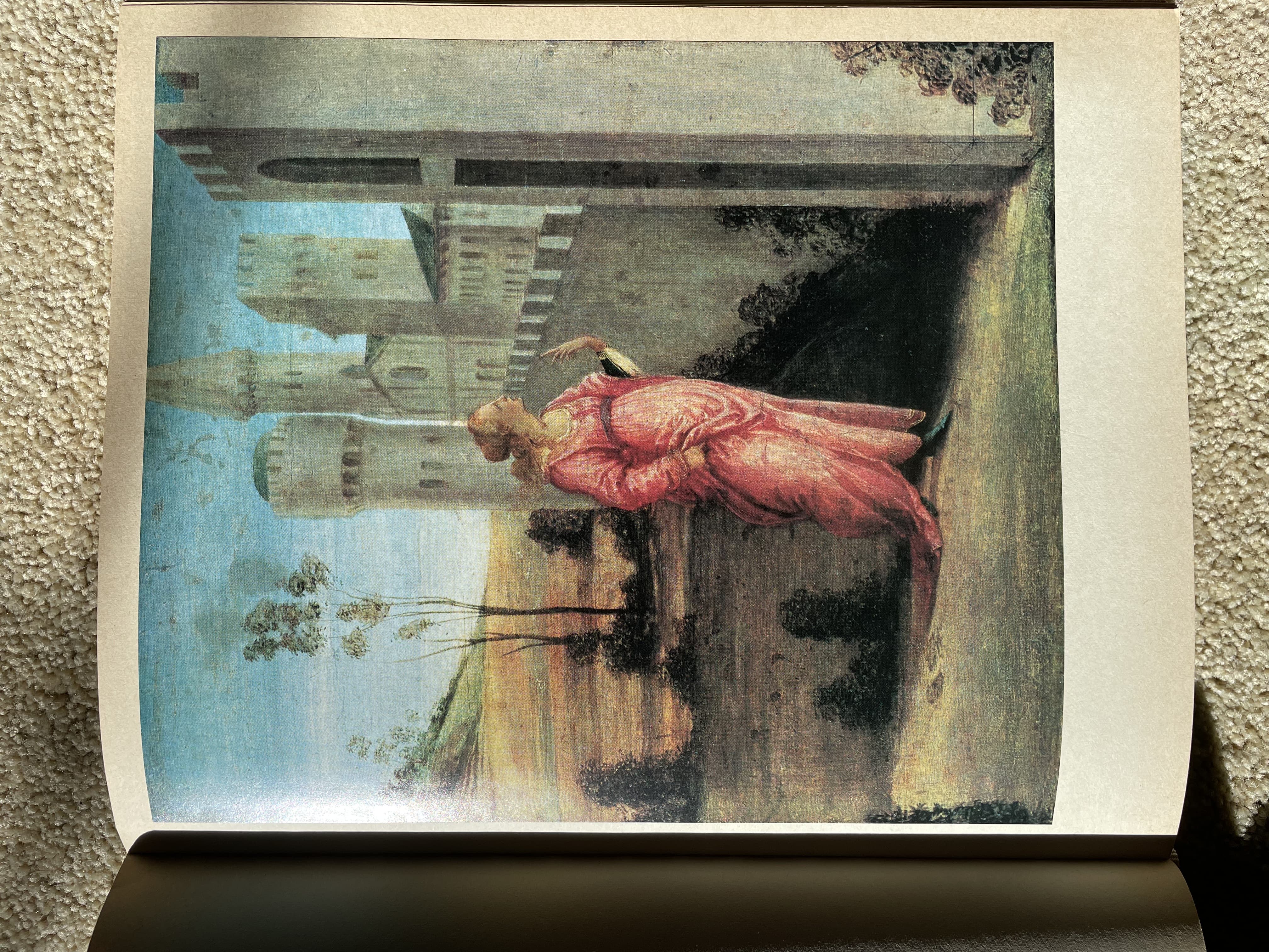 Oil Painting of a Partially Nude Woman Combing Her Hair on a Cliff with a Lute