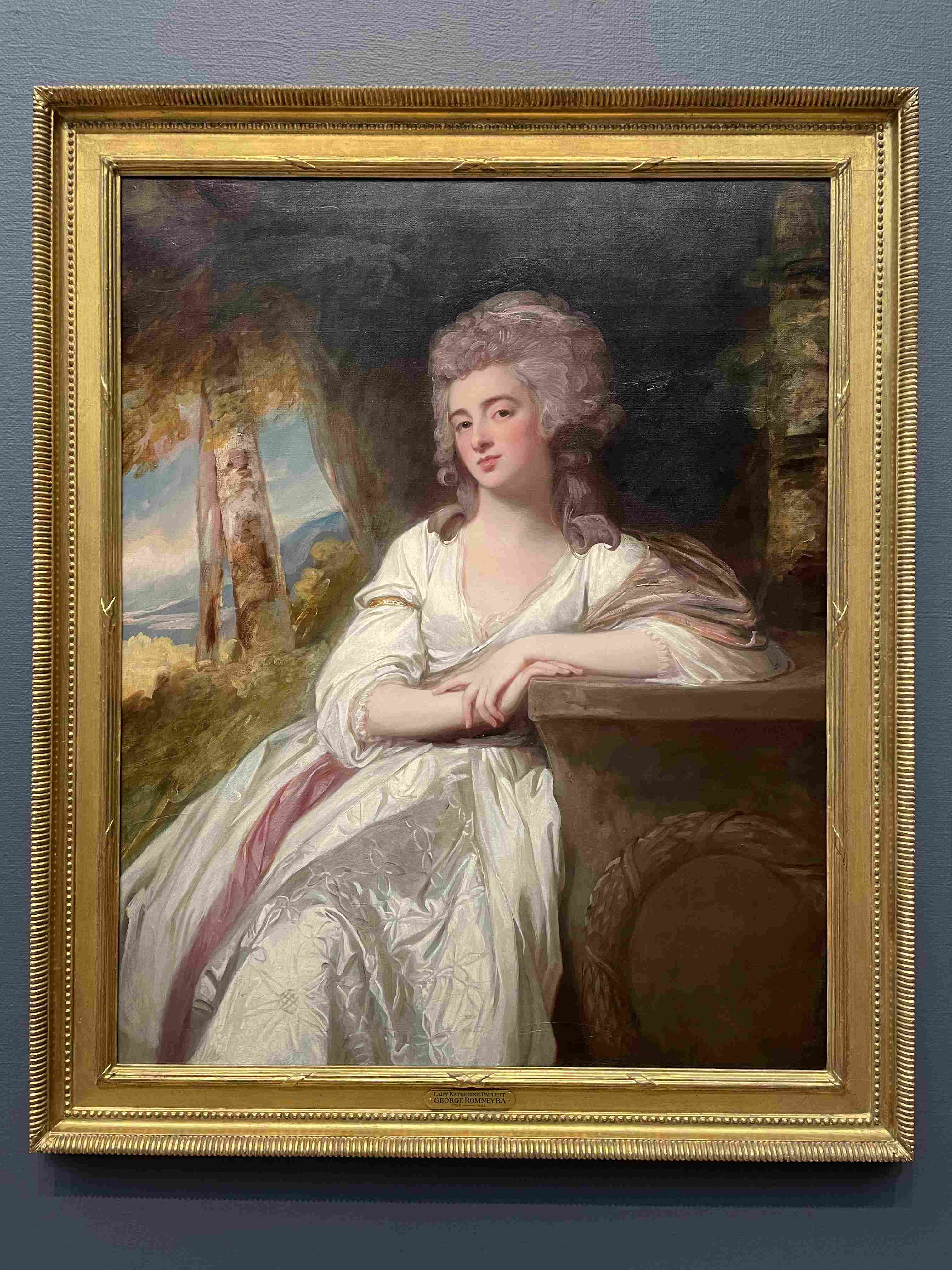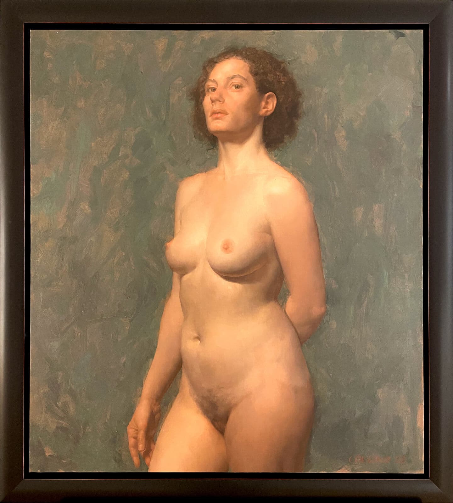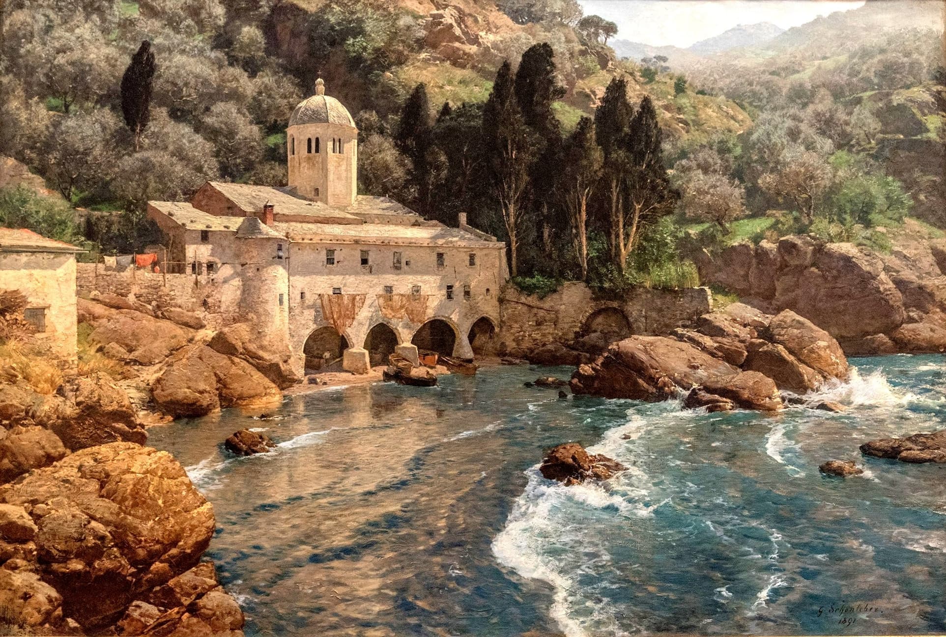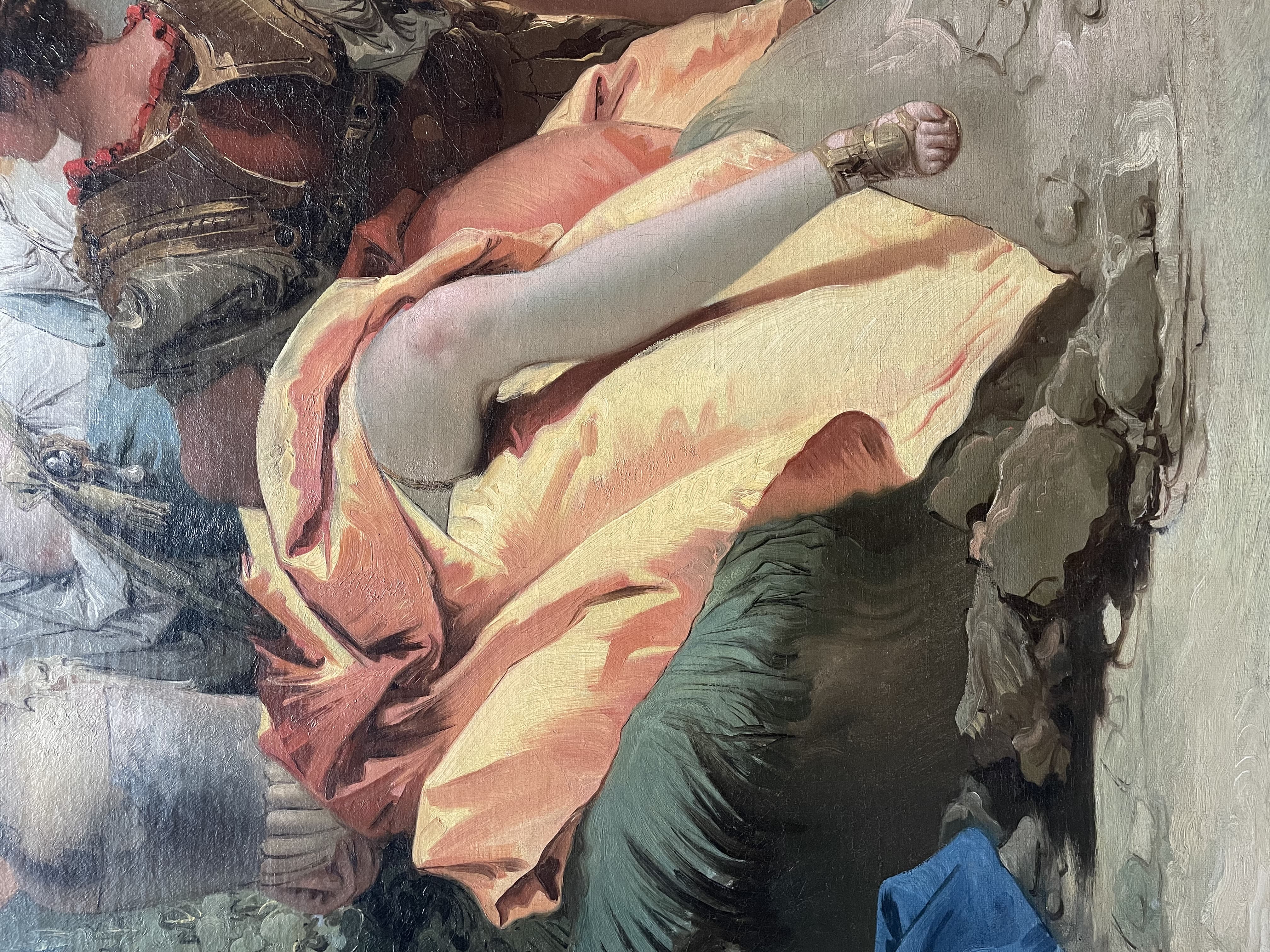 Oil Painting of a Partially Nude Woman Combing Her Hair on a Cliff with a Lute