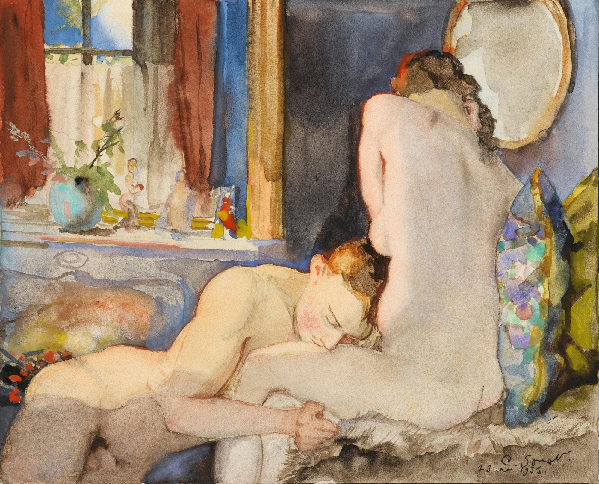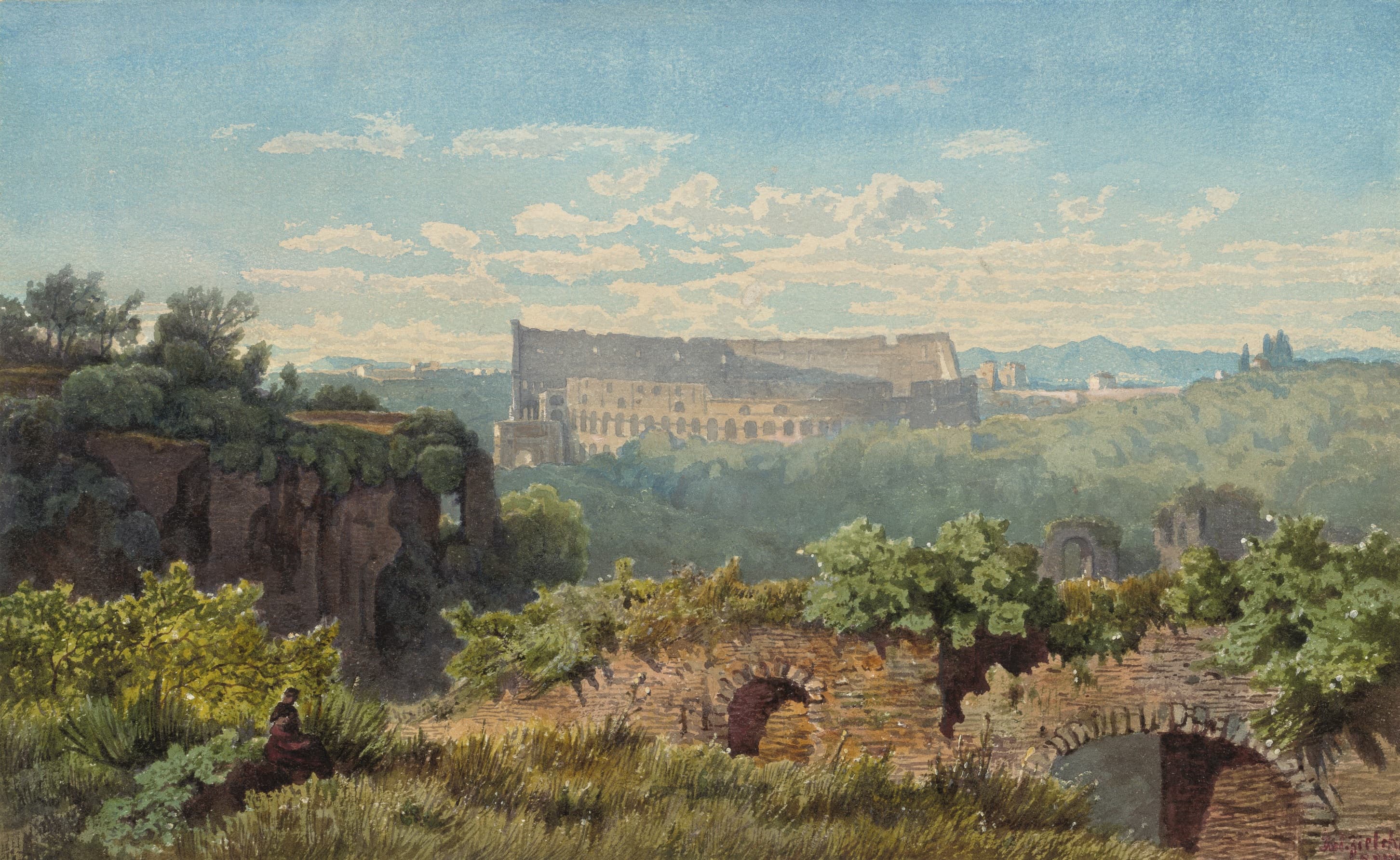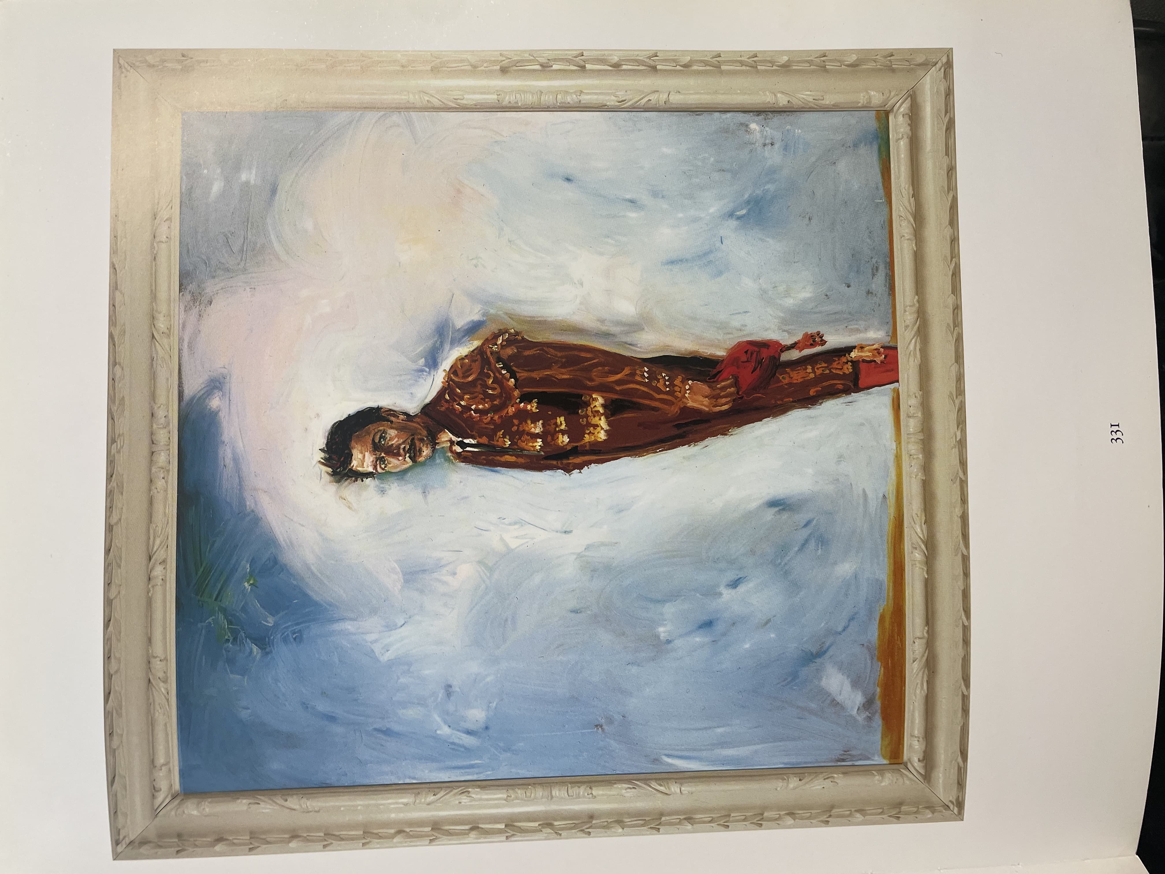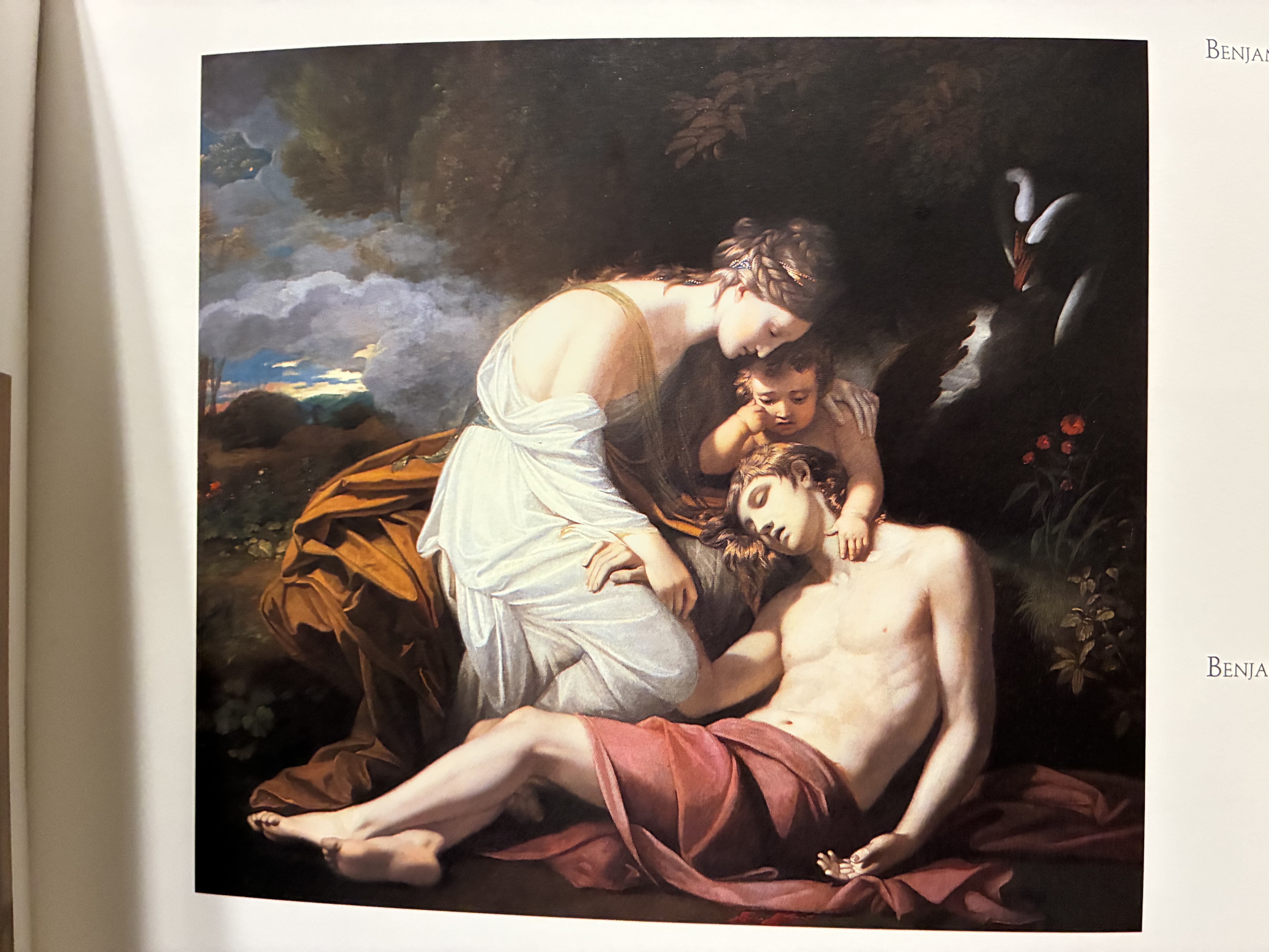 Oil Painting of a Partially Nude Woman Combing Her Hair on a Cliff with a Lute