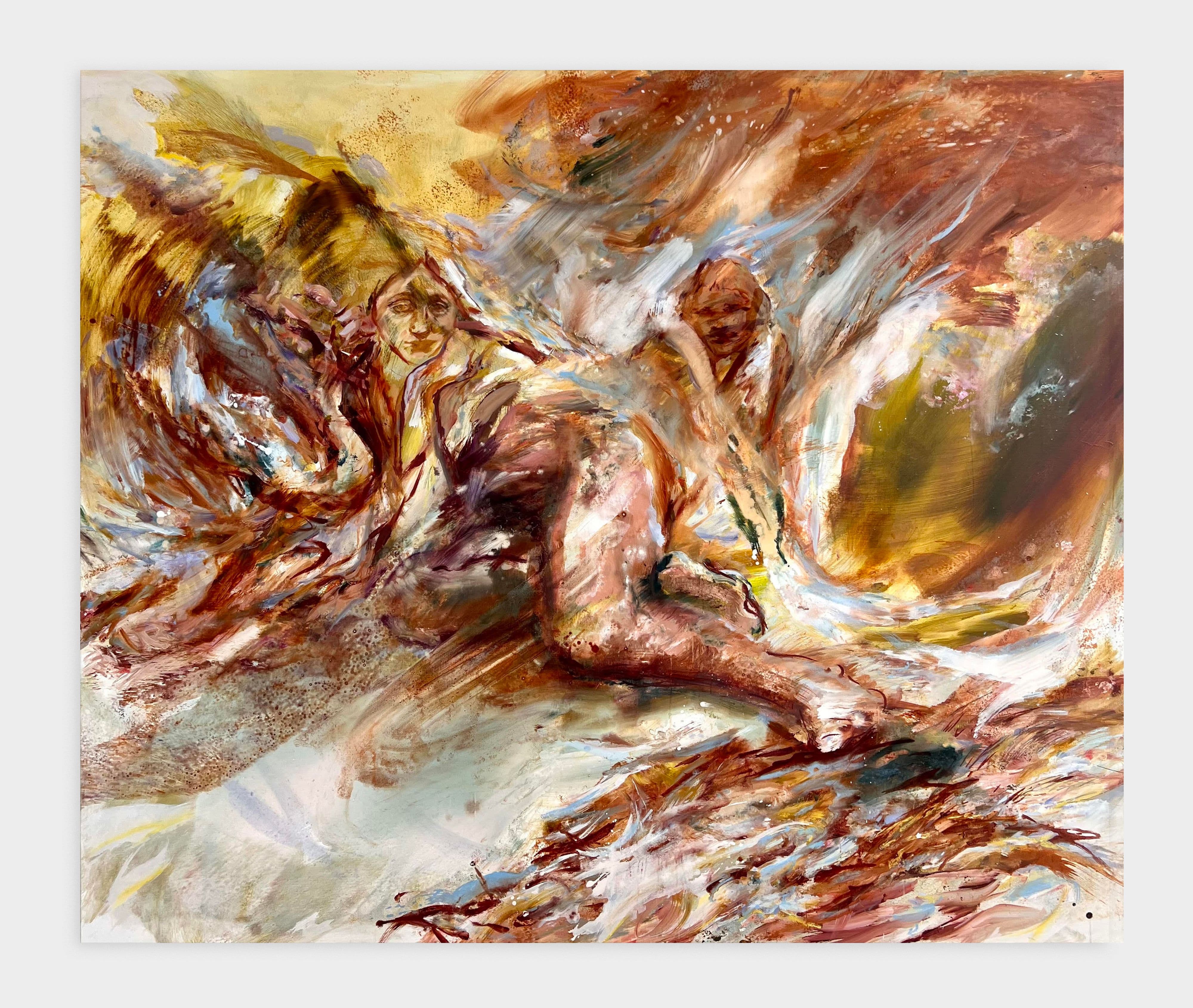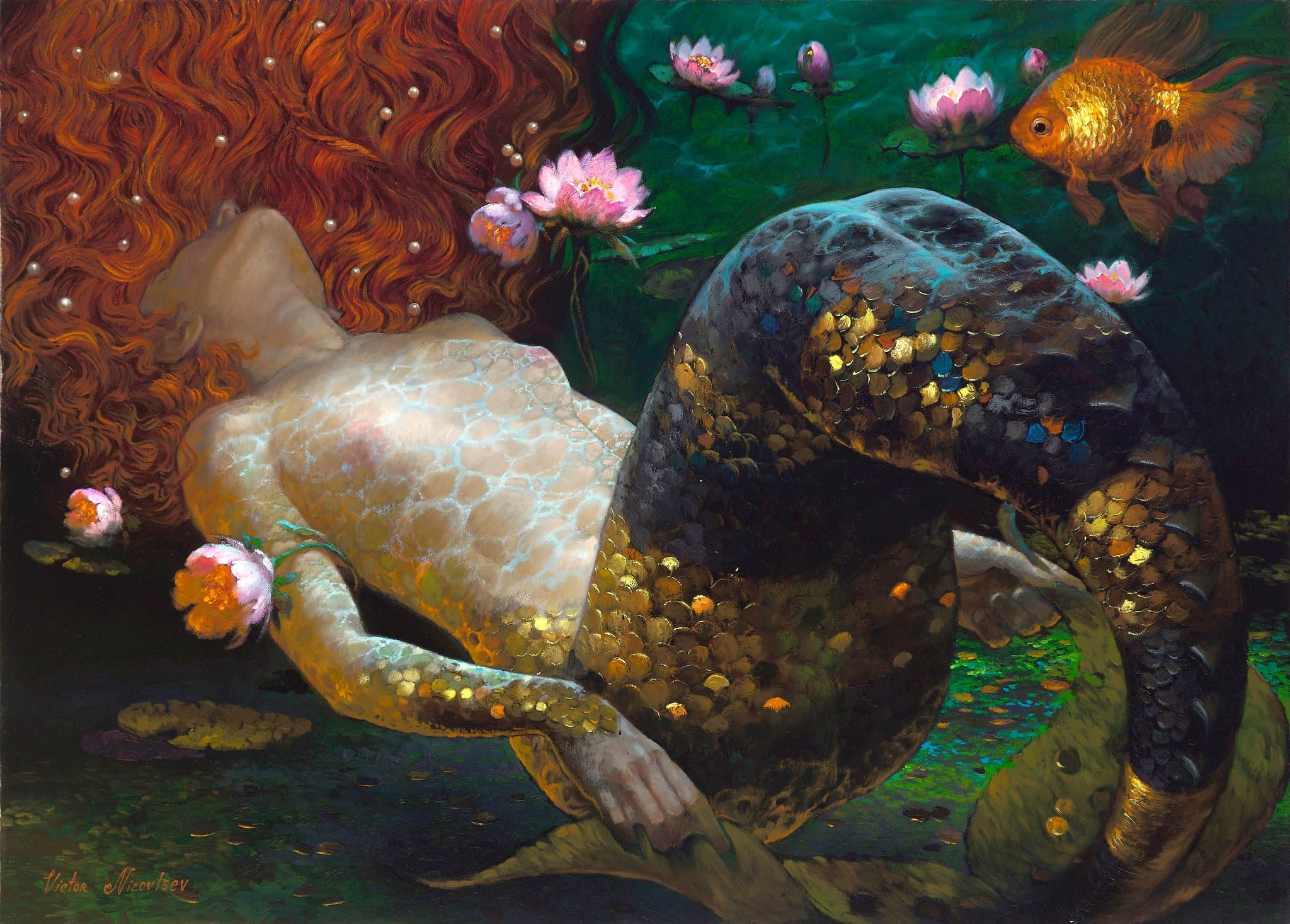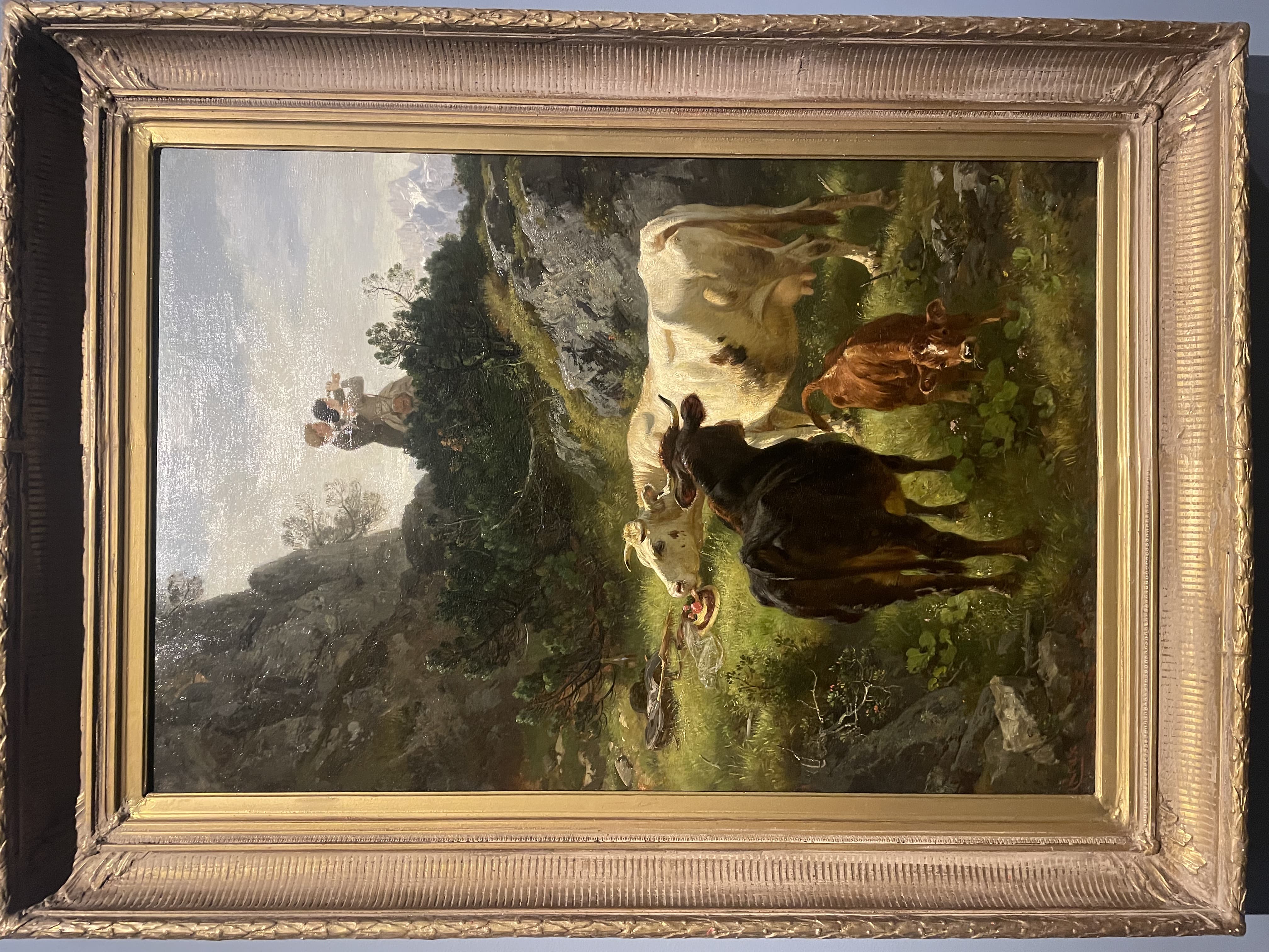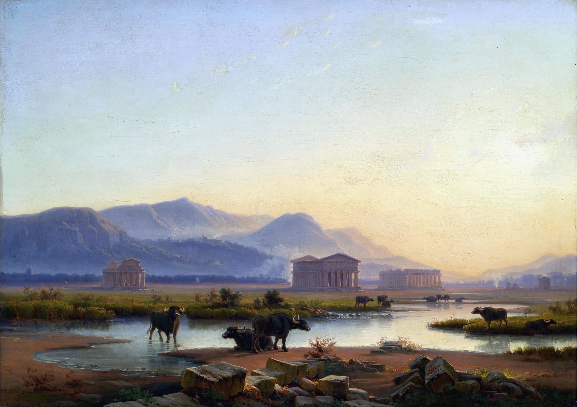 Oil Painting of a Partially Nude Woman Combing Her Hair on a Cliff with a Lute