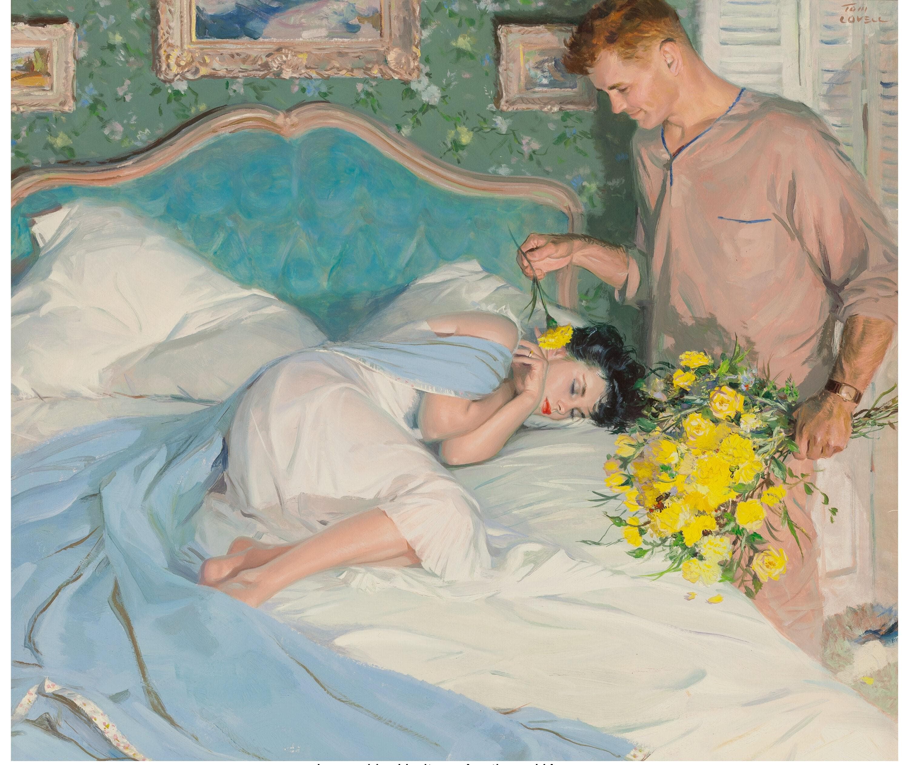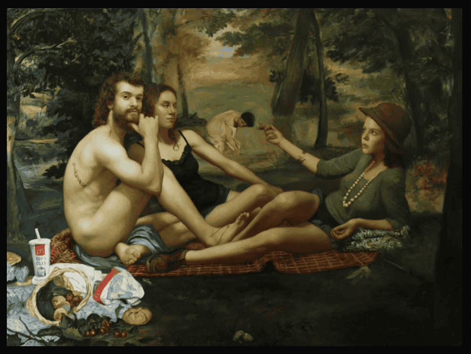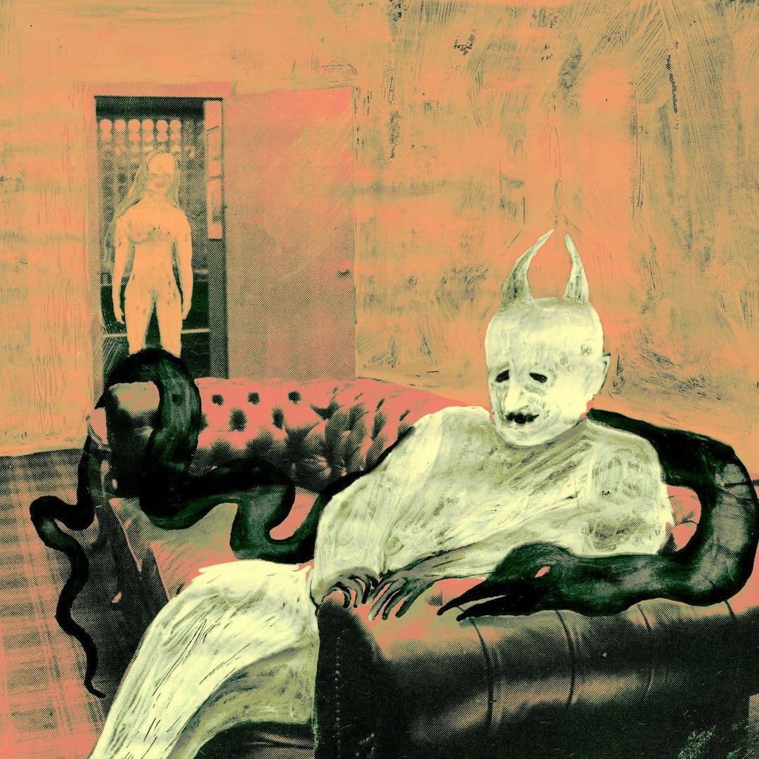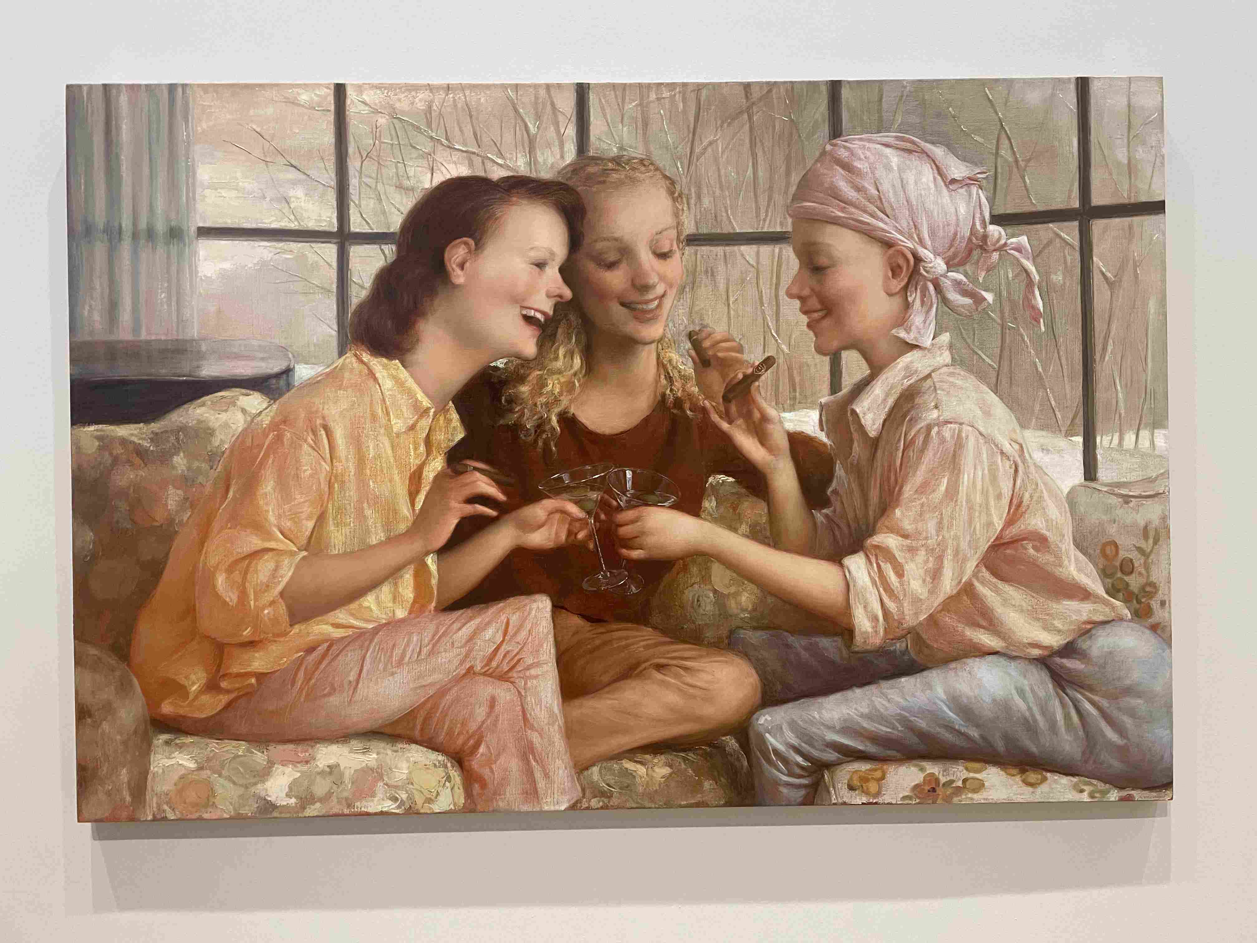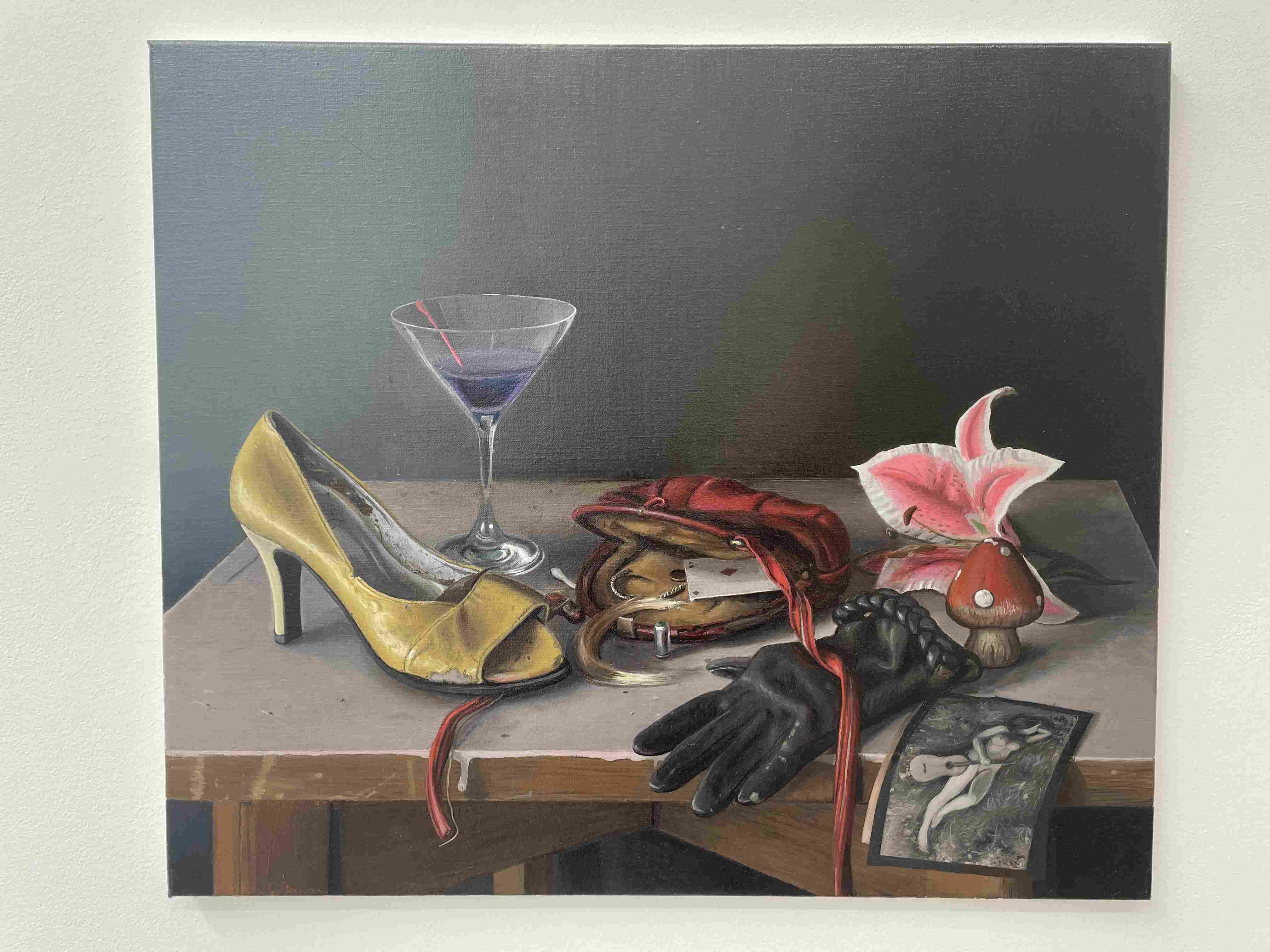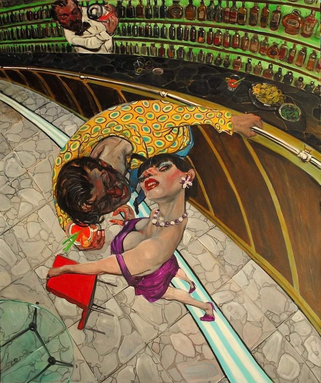 Stylized Painting of a Reclining Woman on a Couch with Drinks Against a Black Background