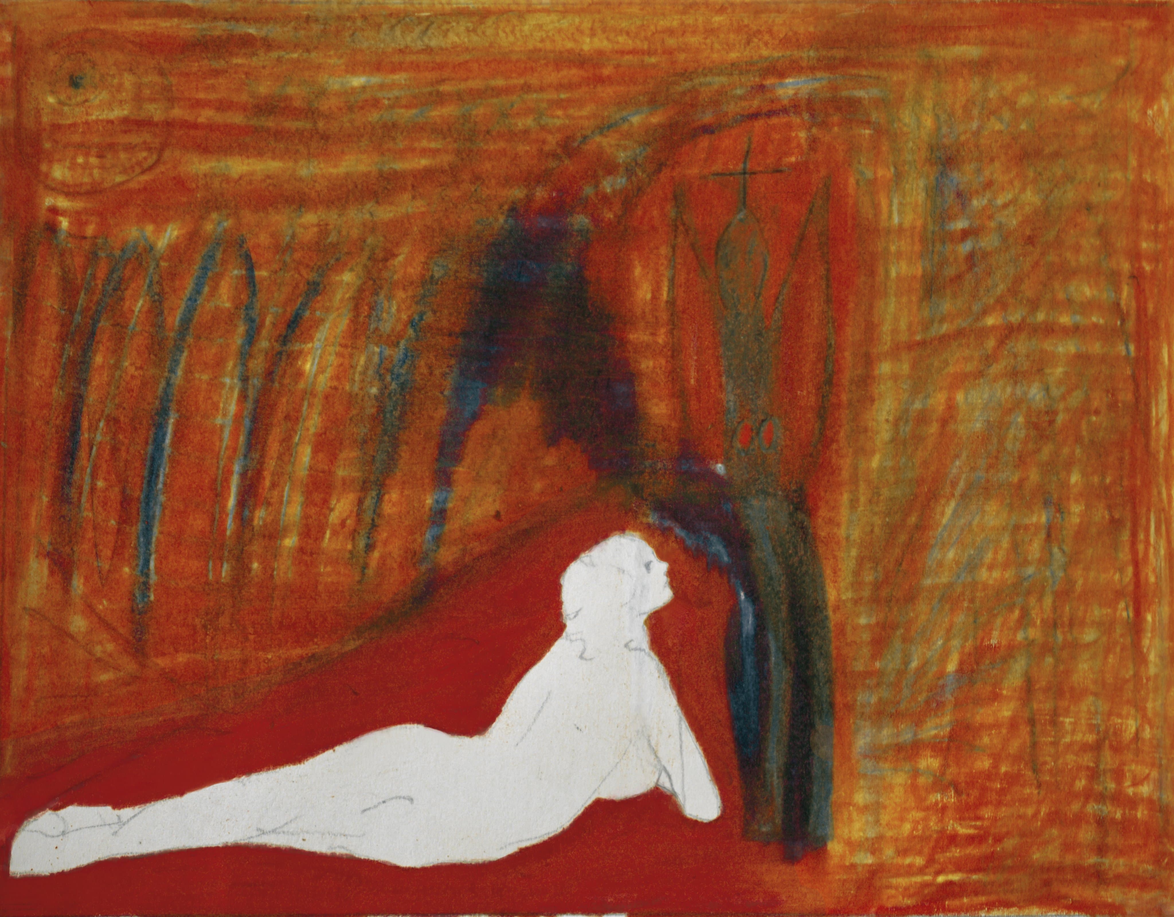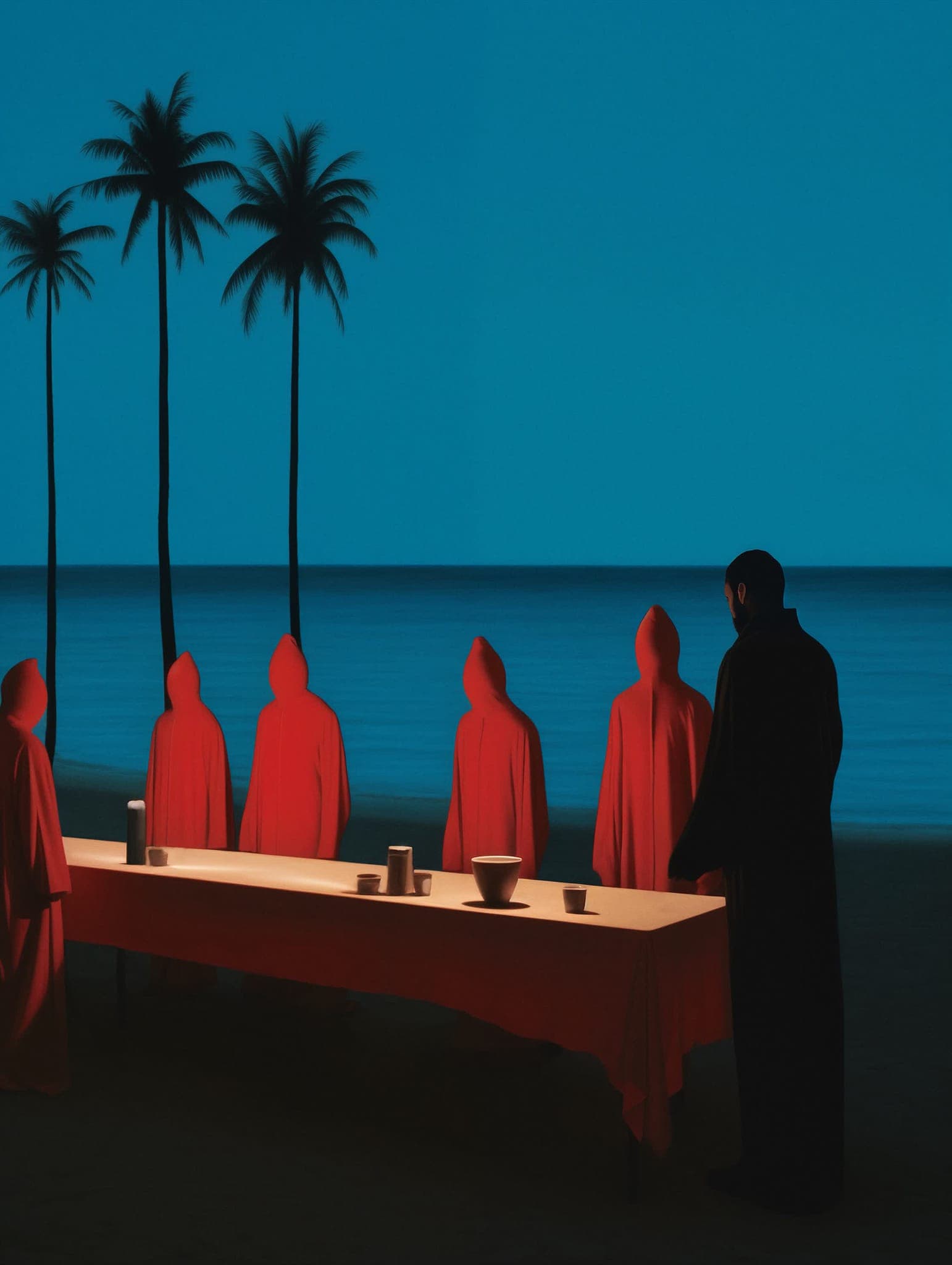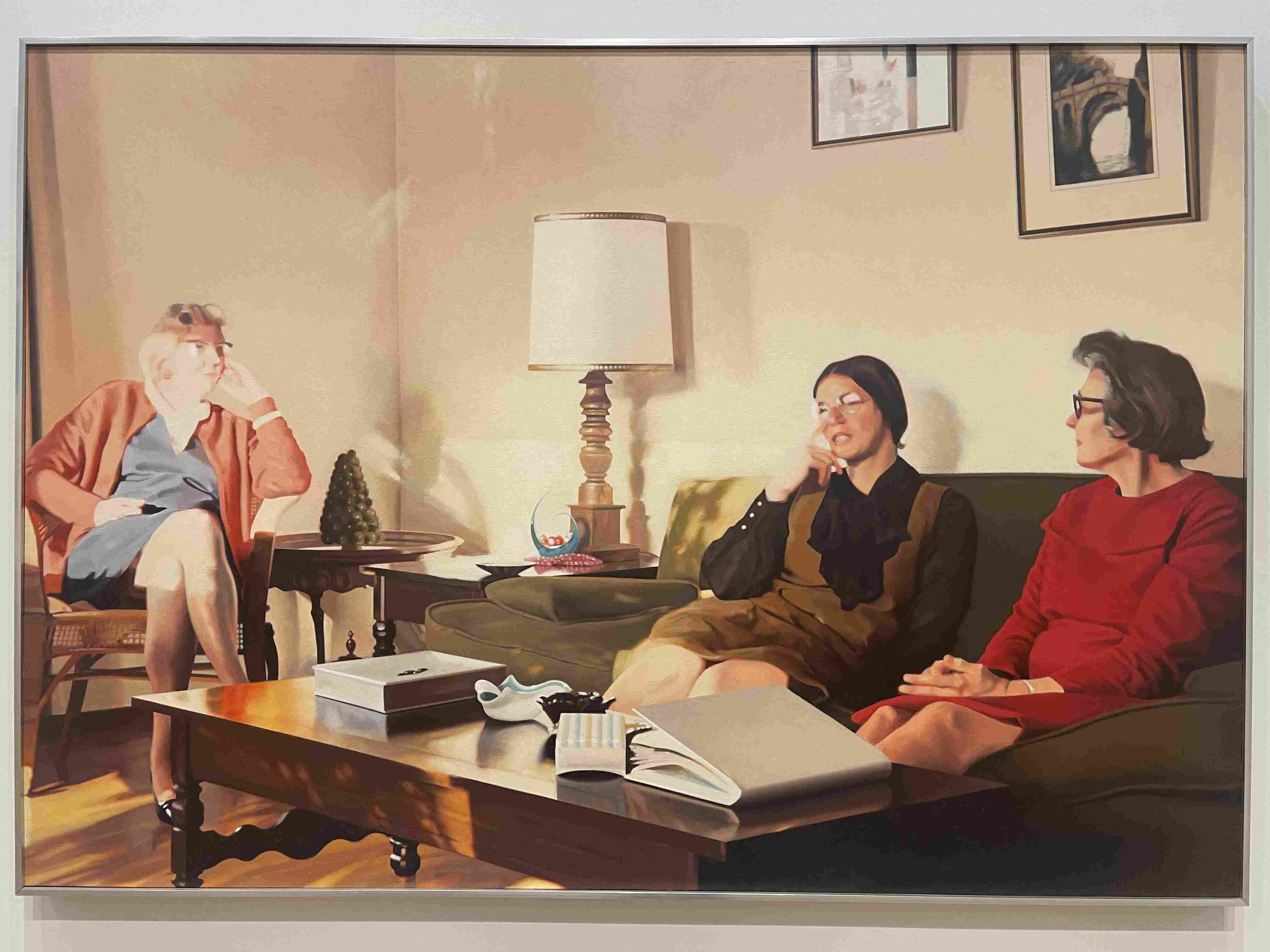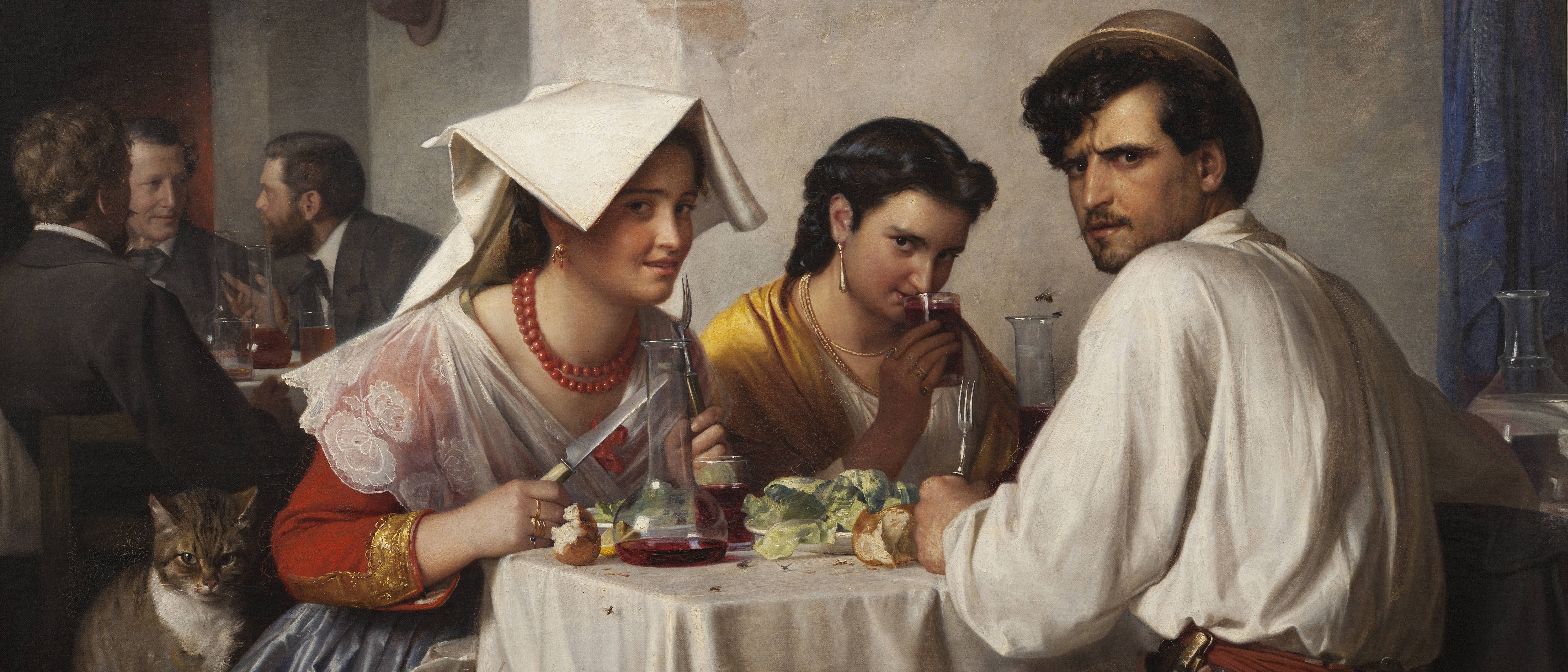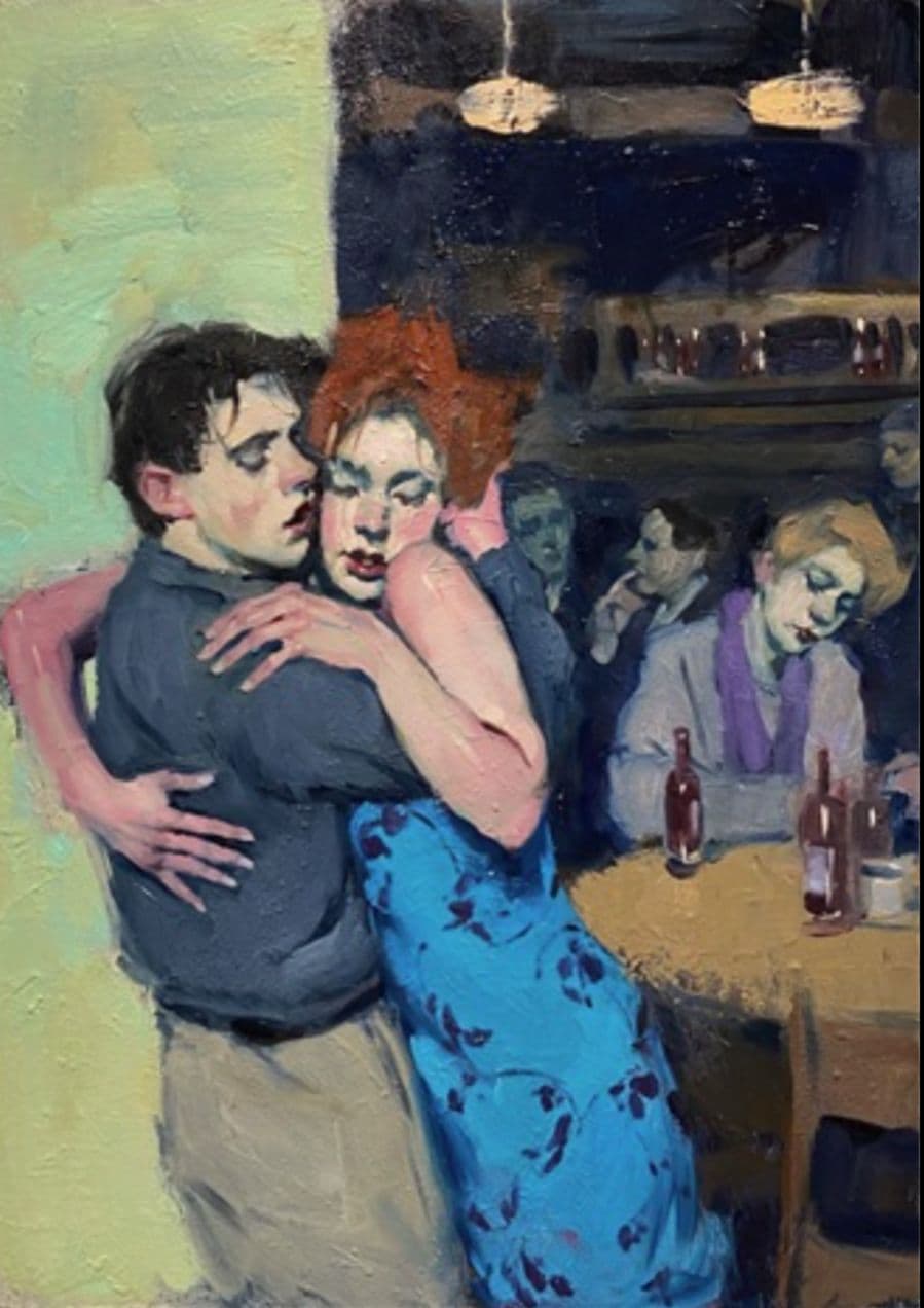 Stylized Painting of a Reclining Woman on a Couch with Drinks Against a Black Background