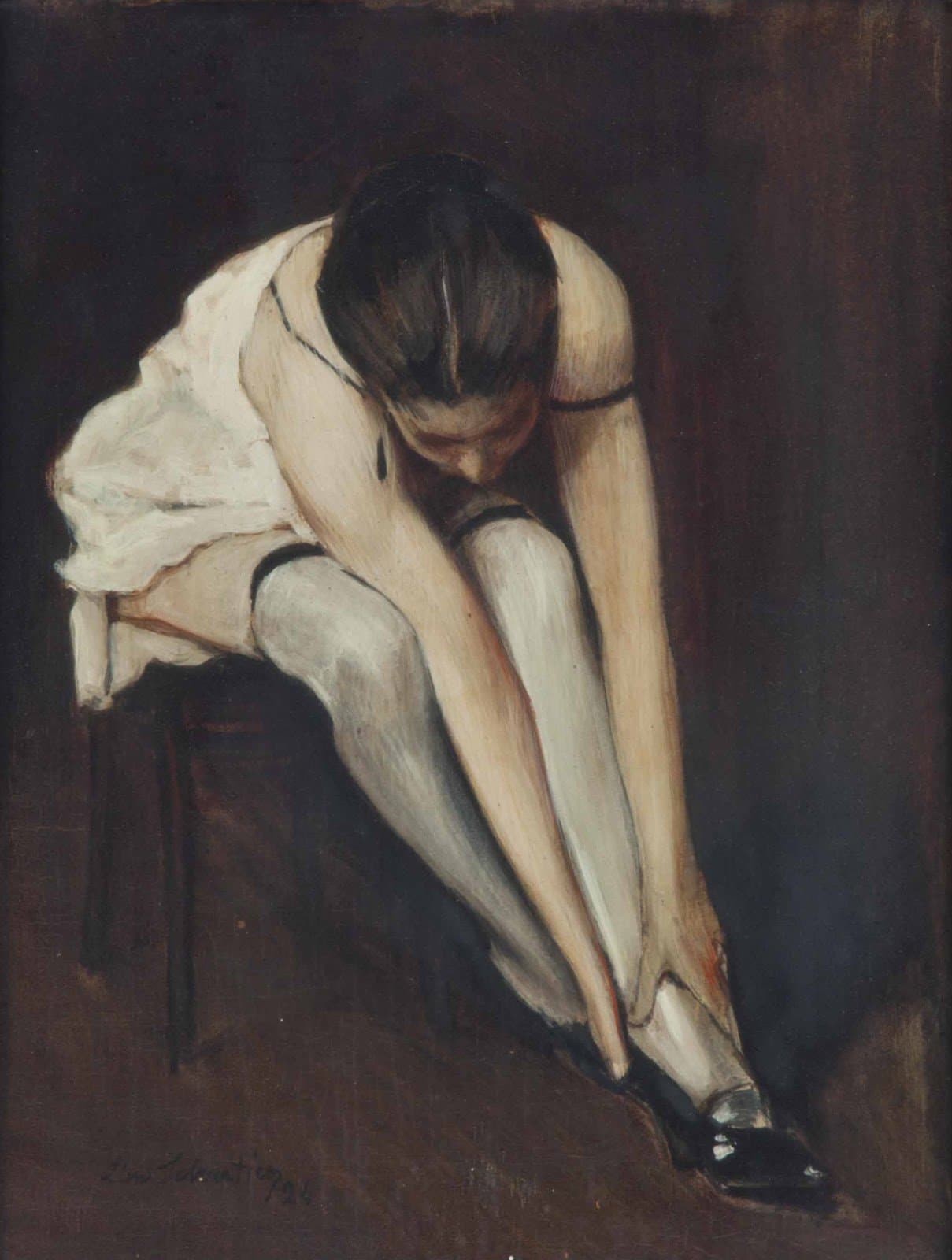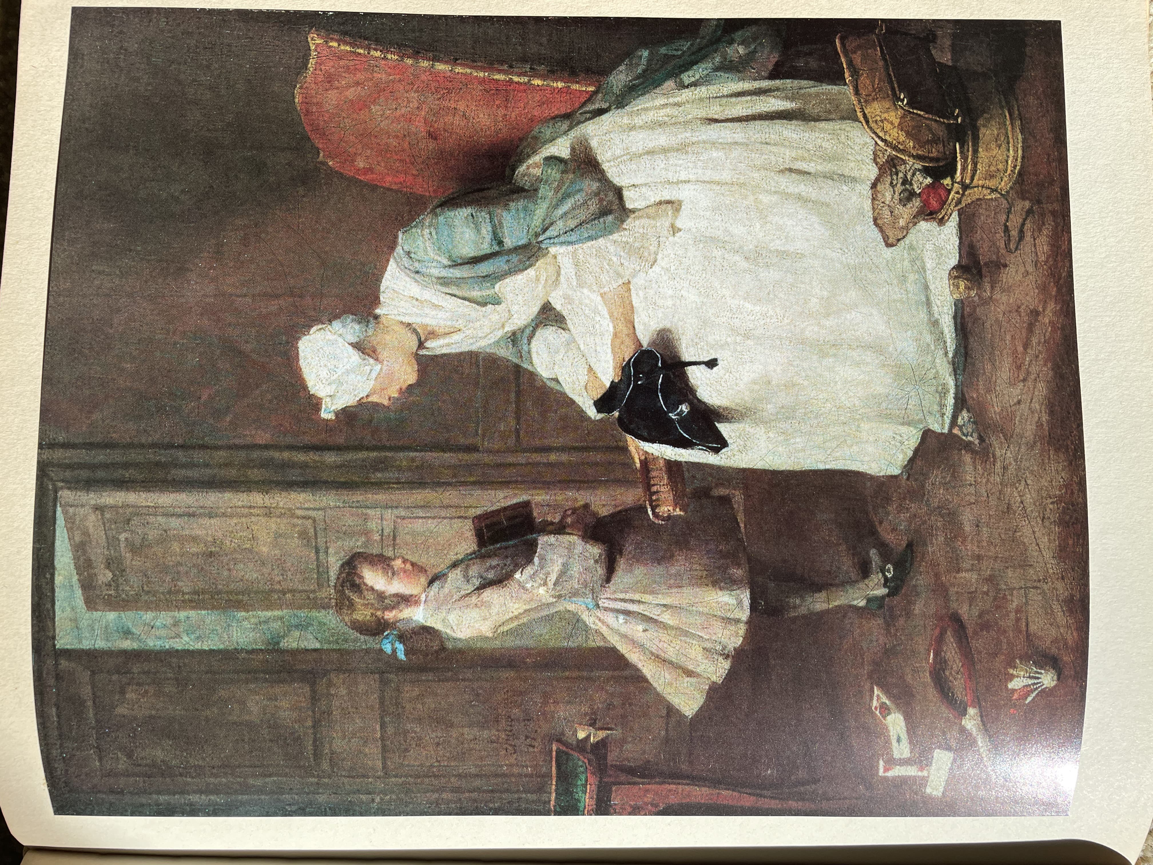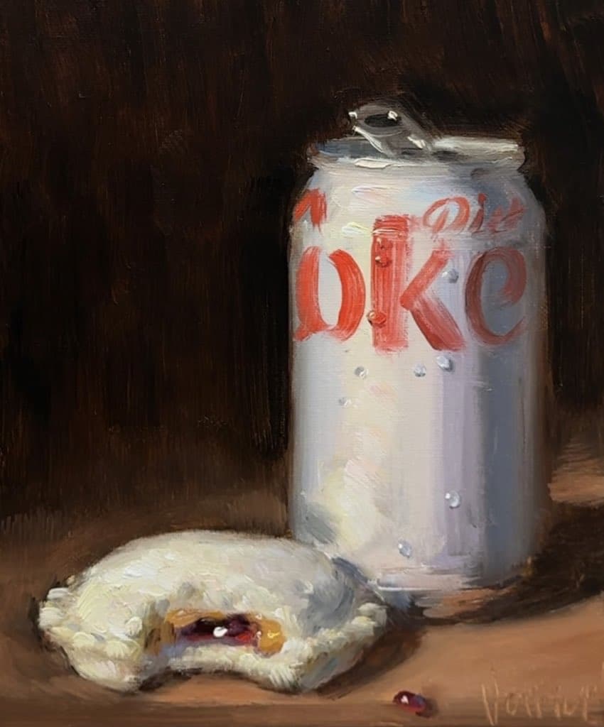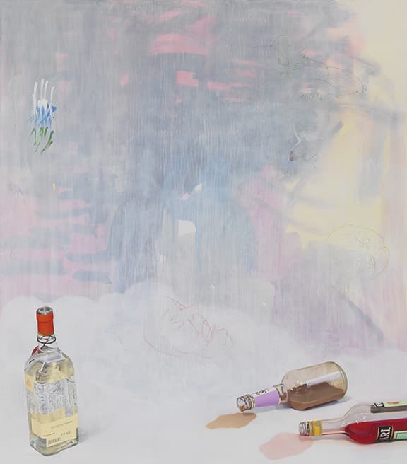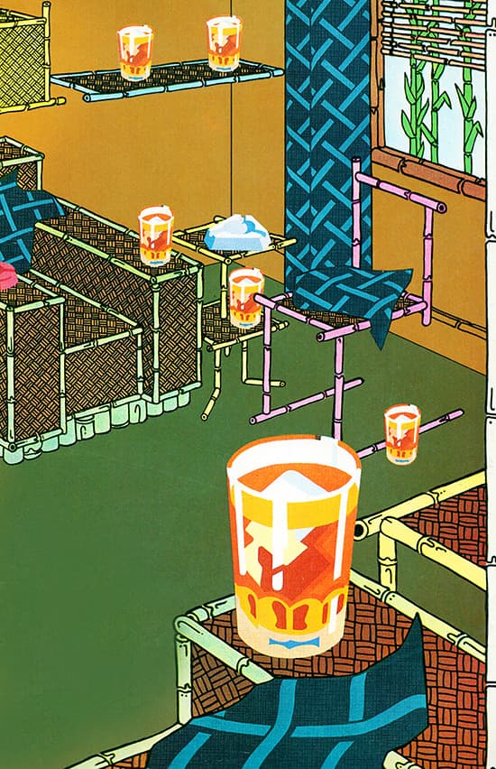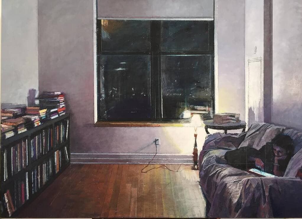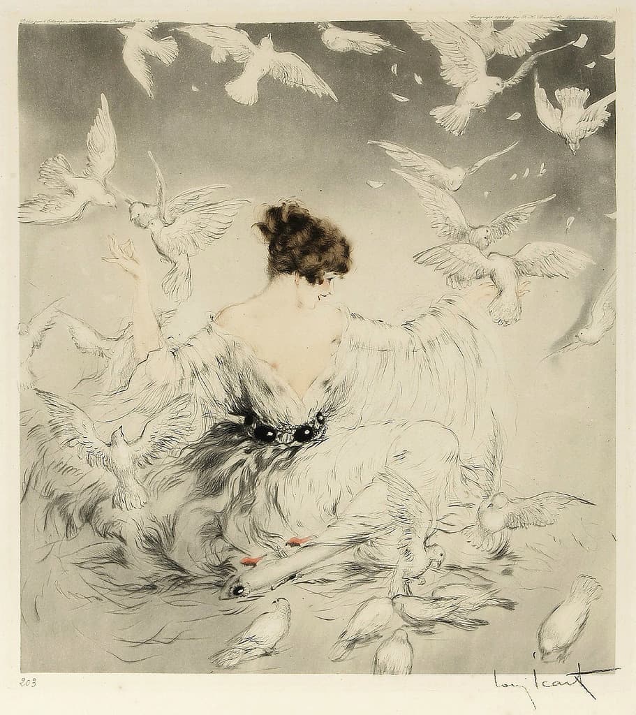 Stylized Painting of a Reclining Woman on a Couch with Drinks Against a Black Background