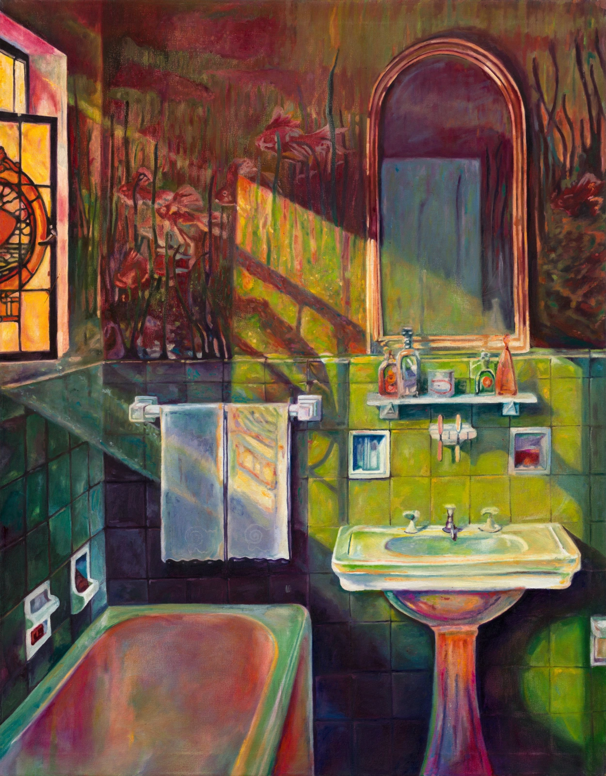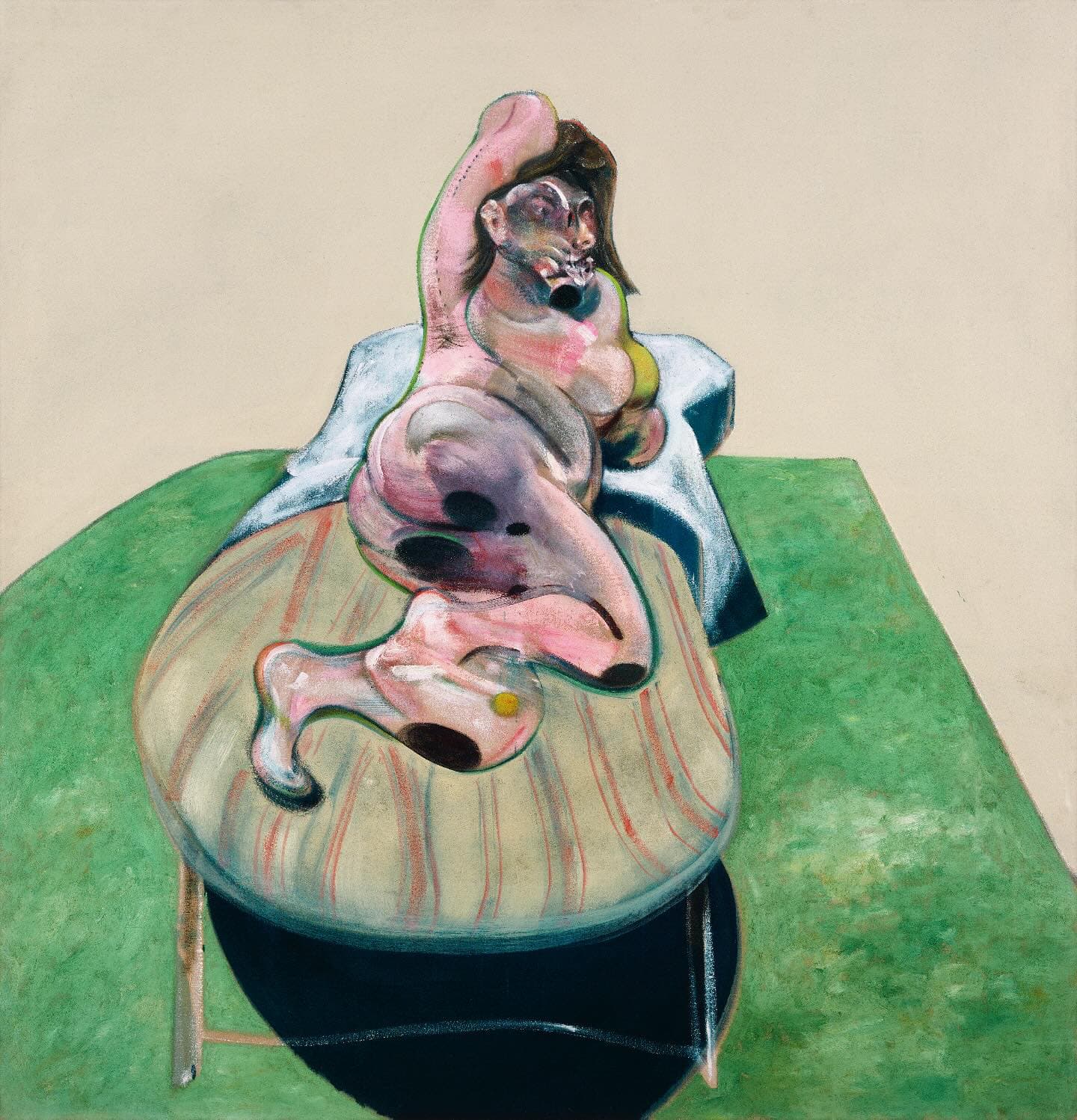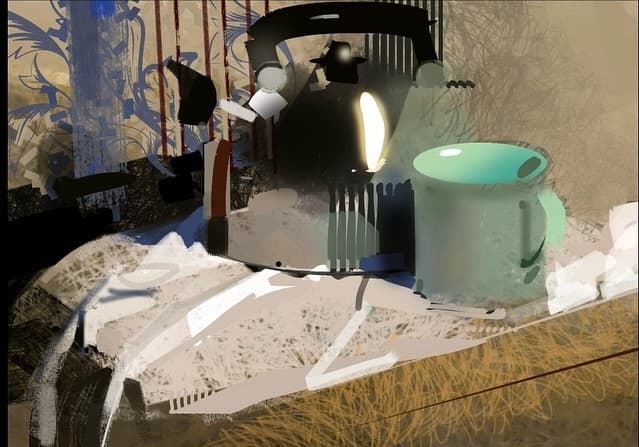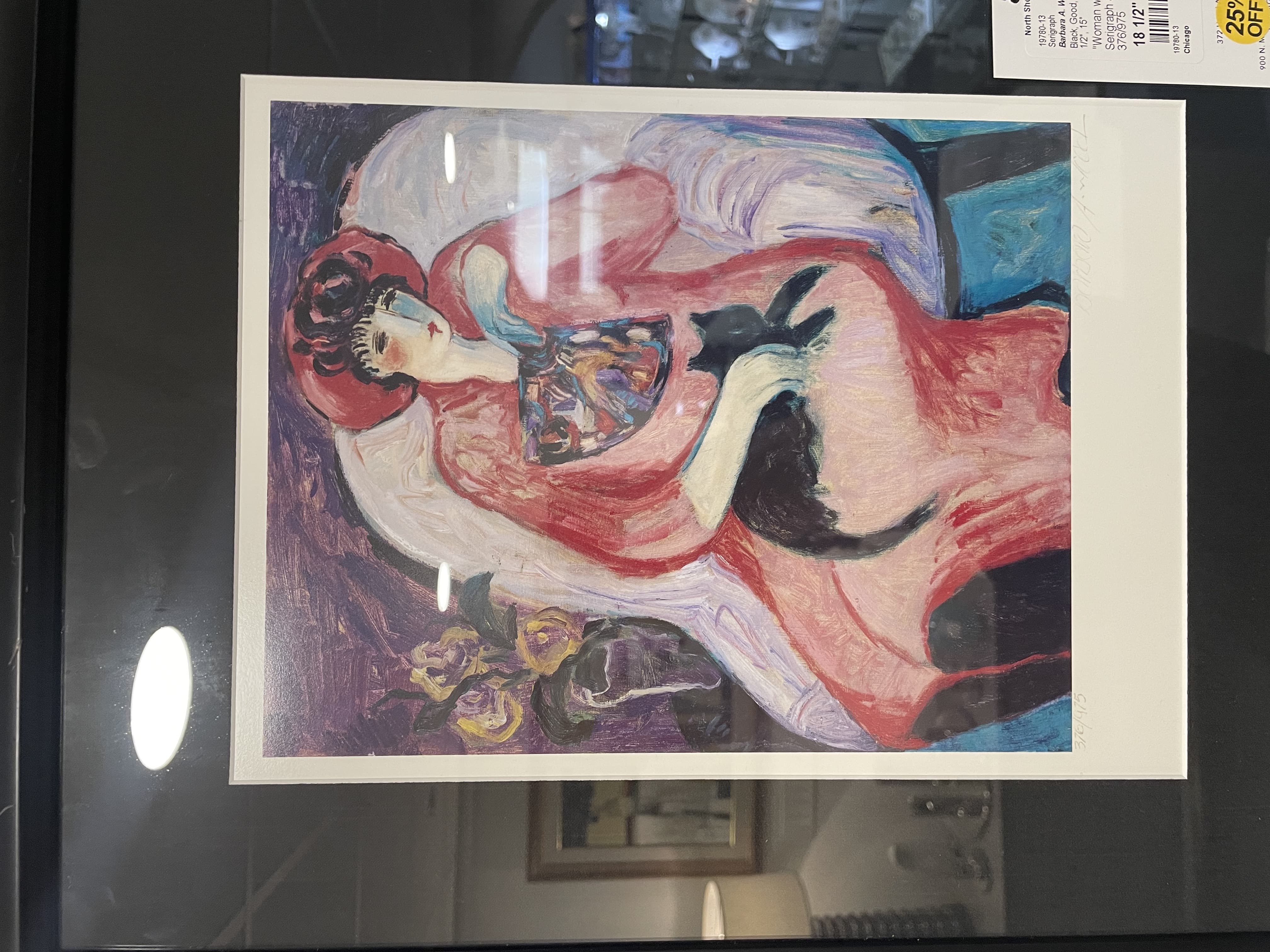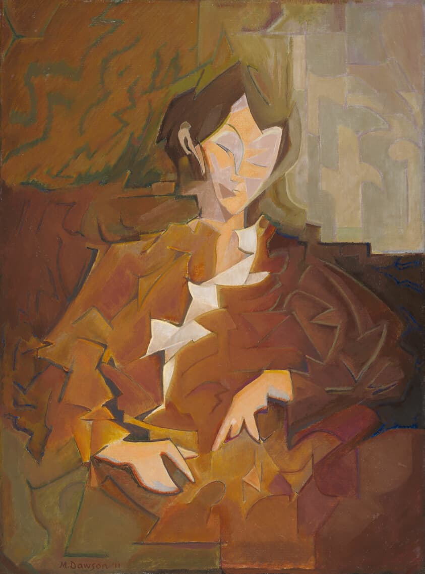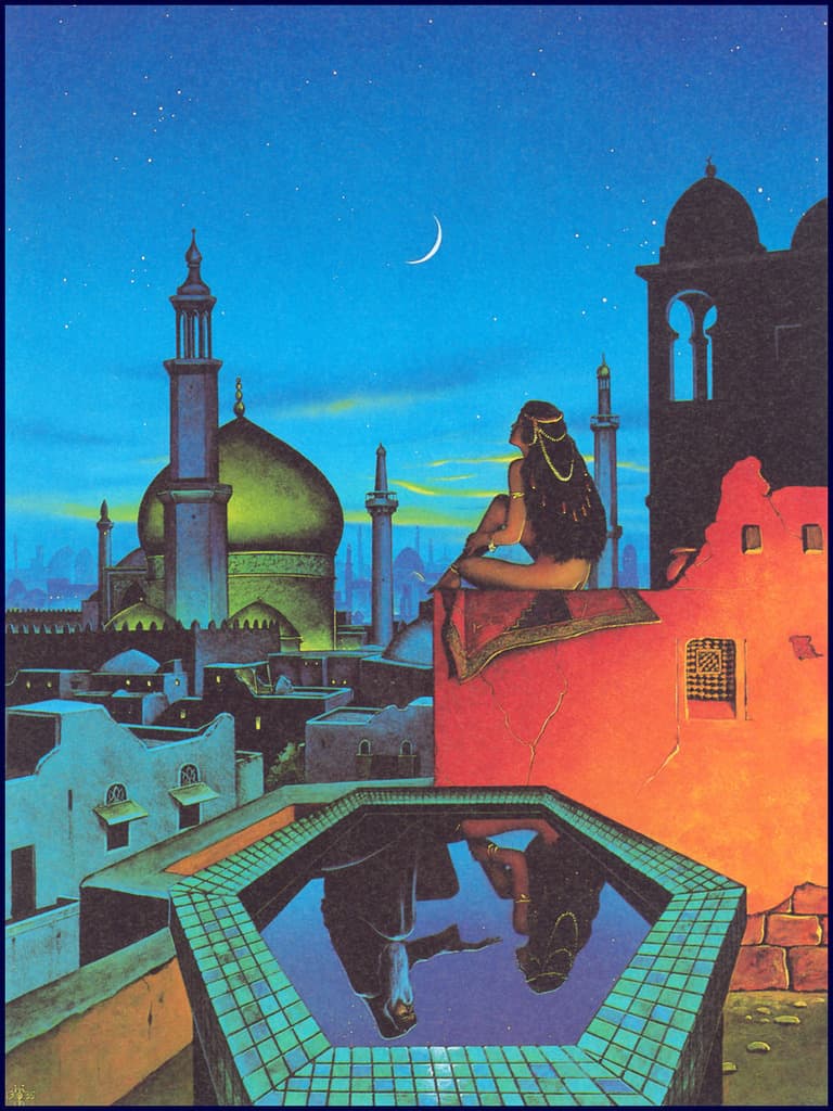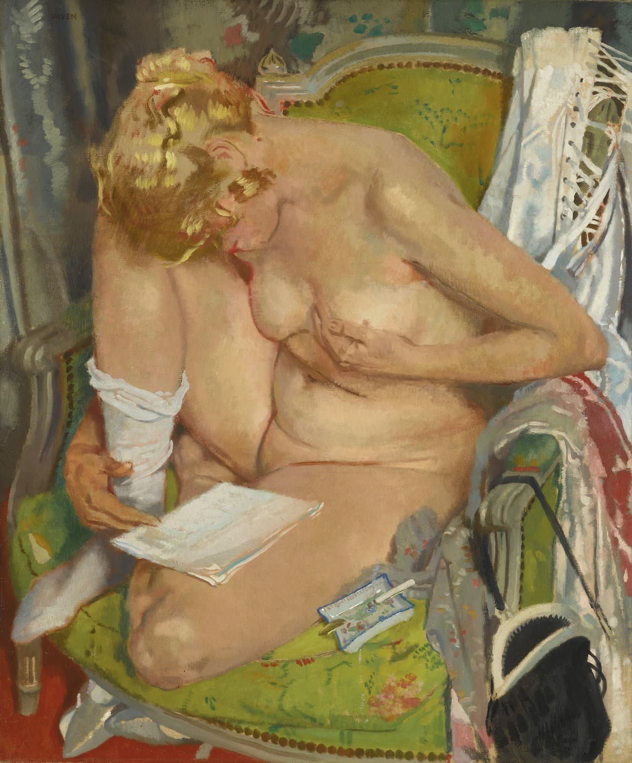 Stylized Painting of a Reclining Woman on a Couch with Drinks Against a Black Background