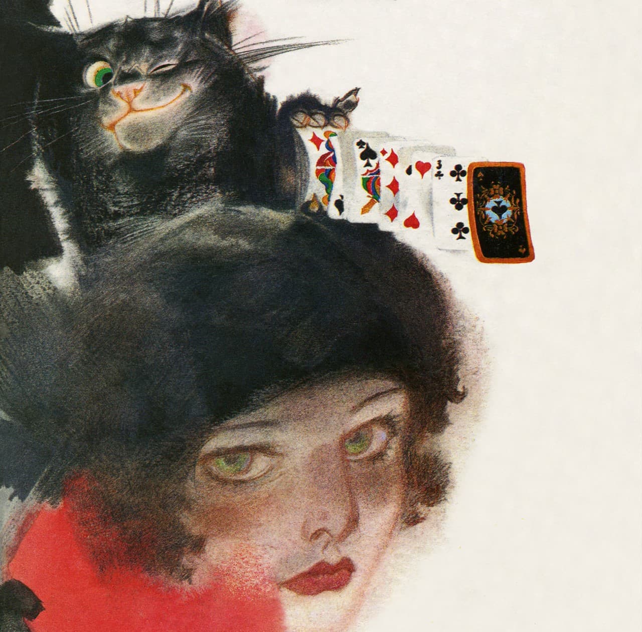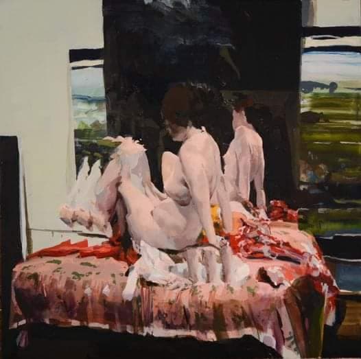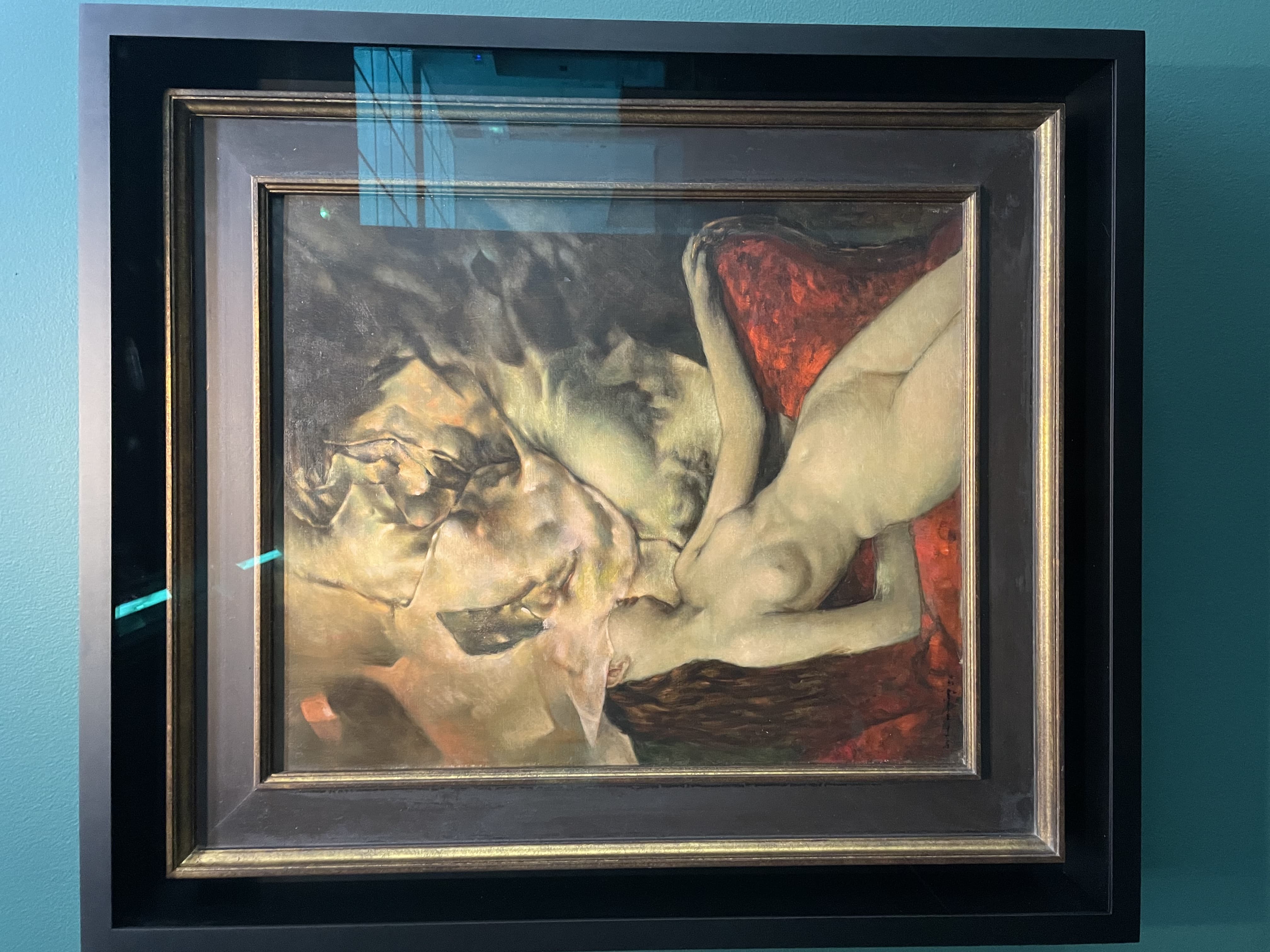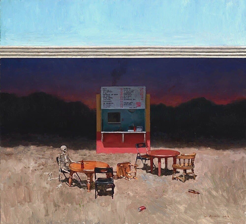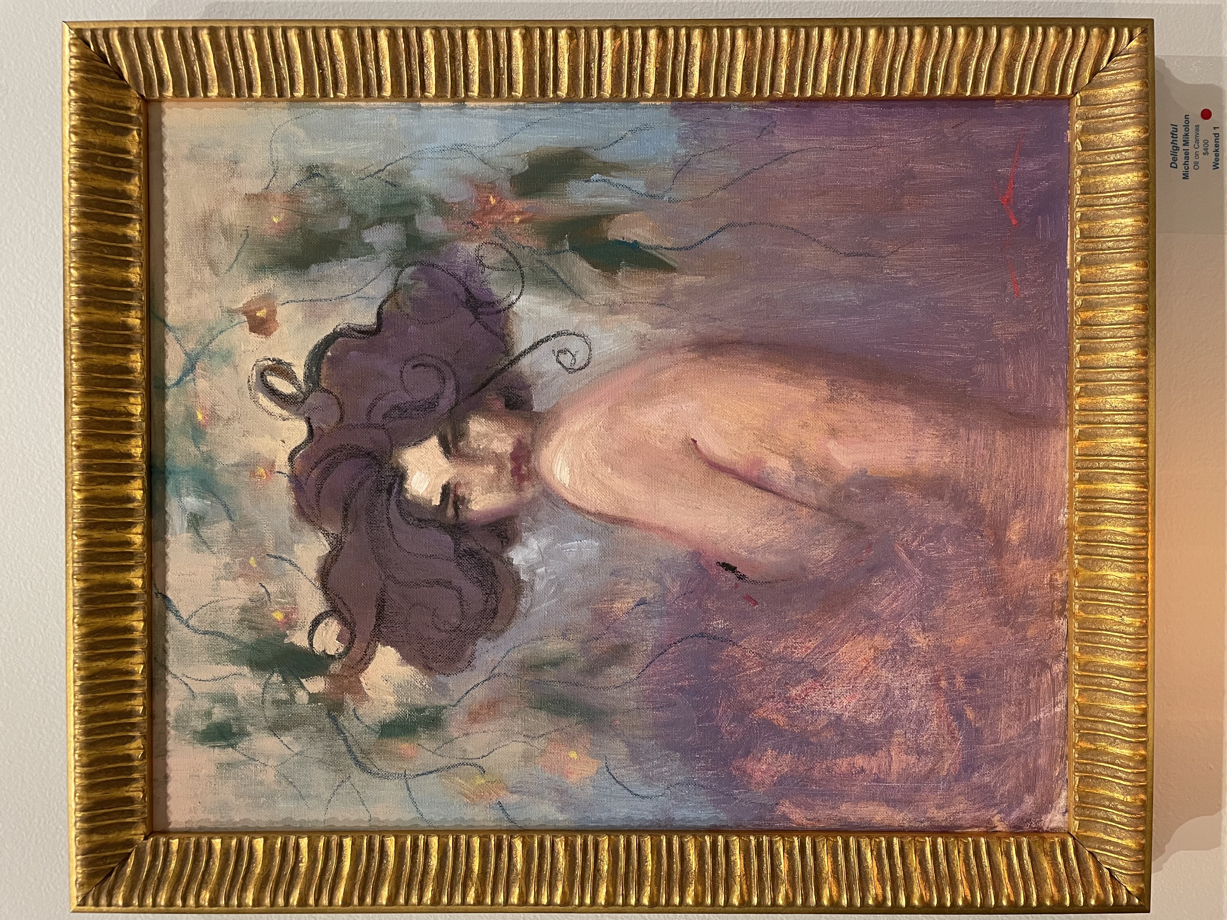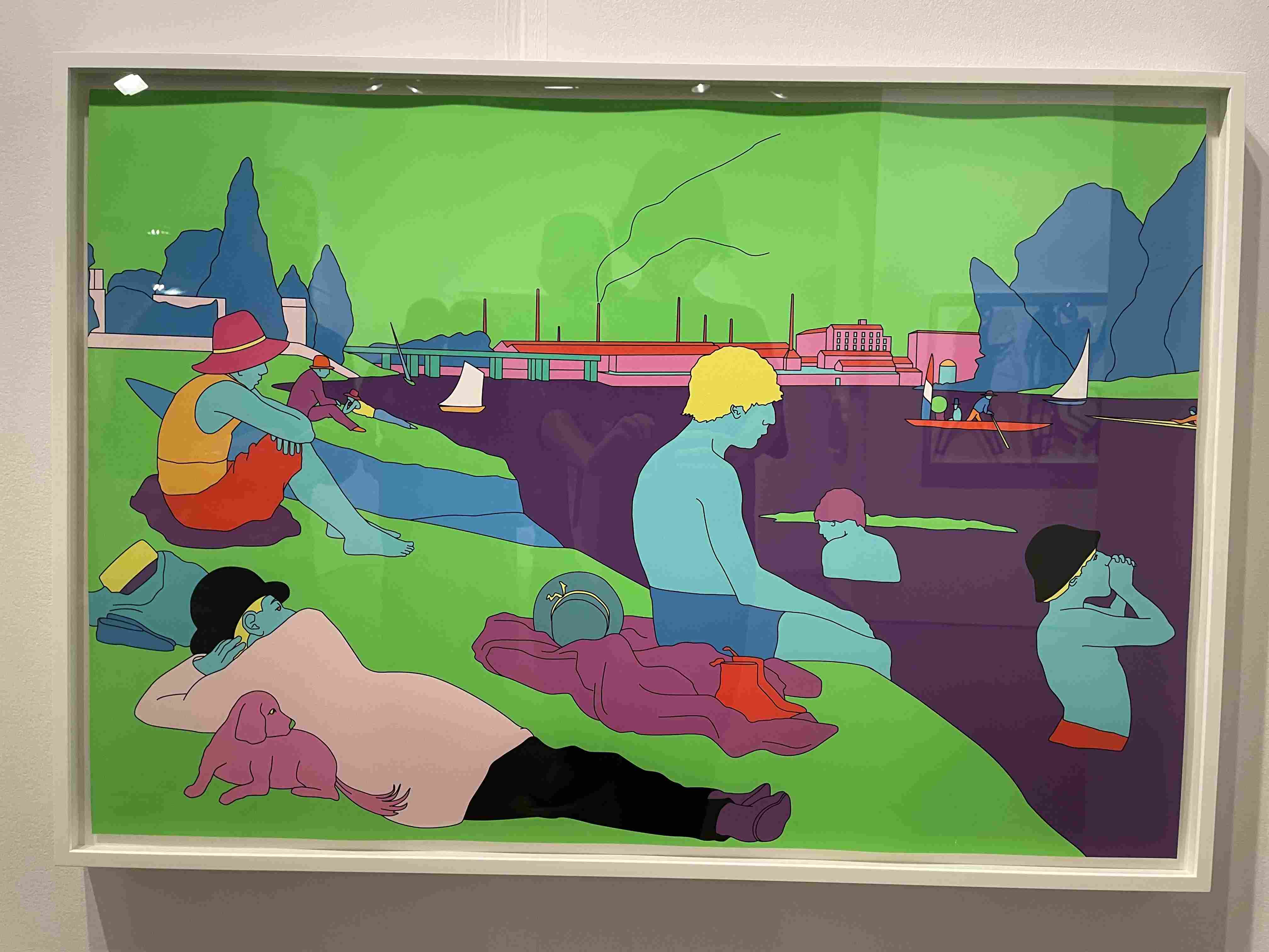Stylized Painting of a Reclining Woman on a Couch with Drinks Against a Black Background