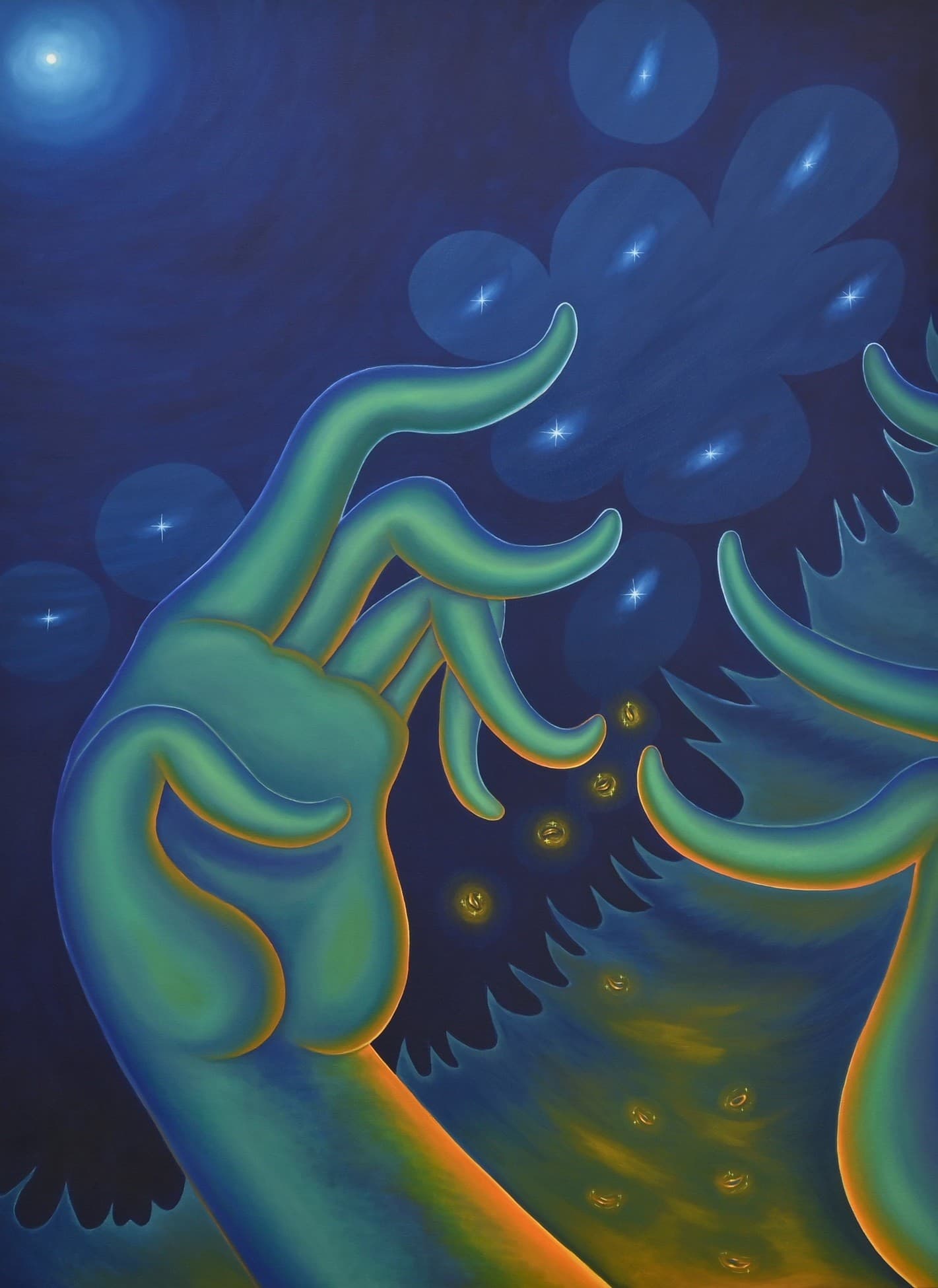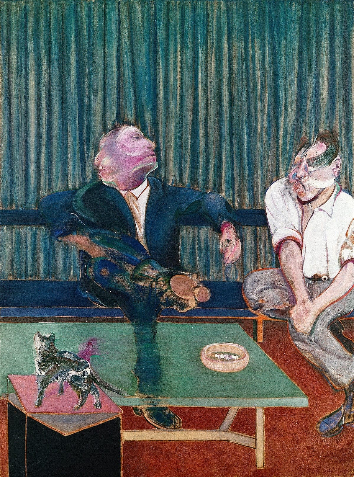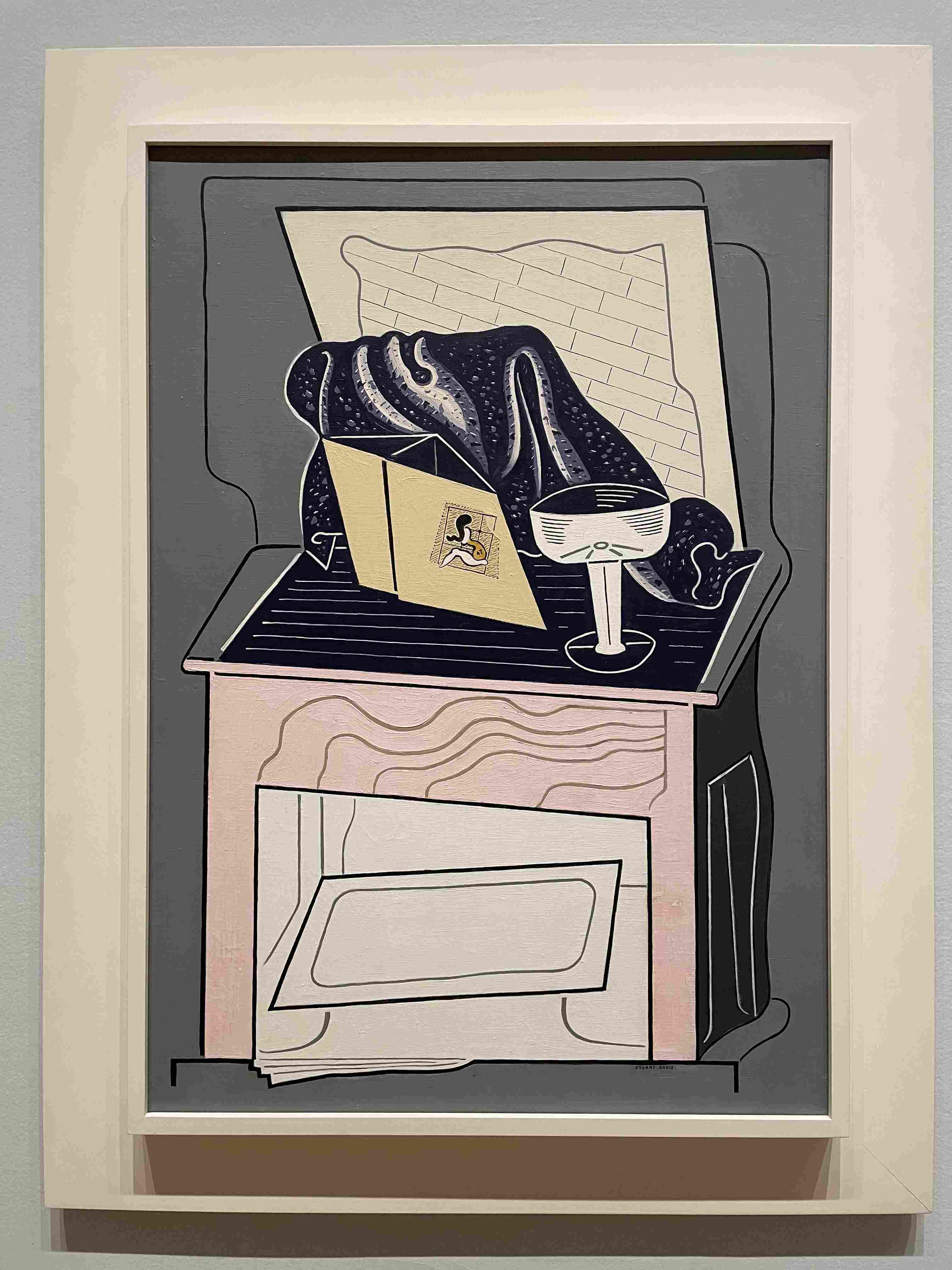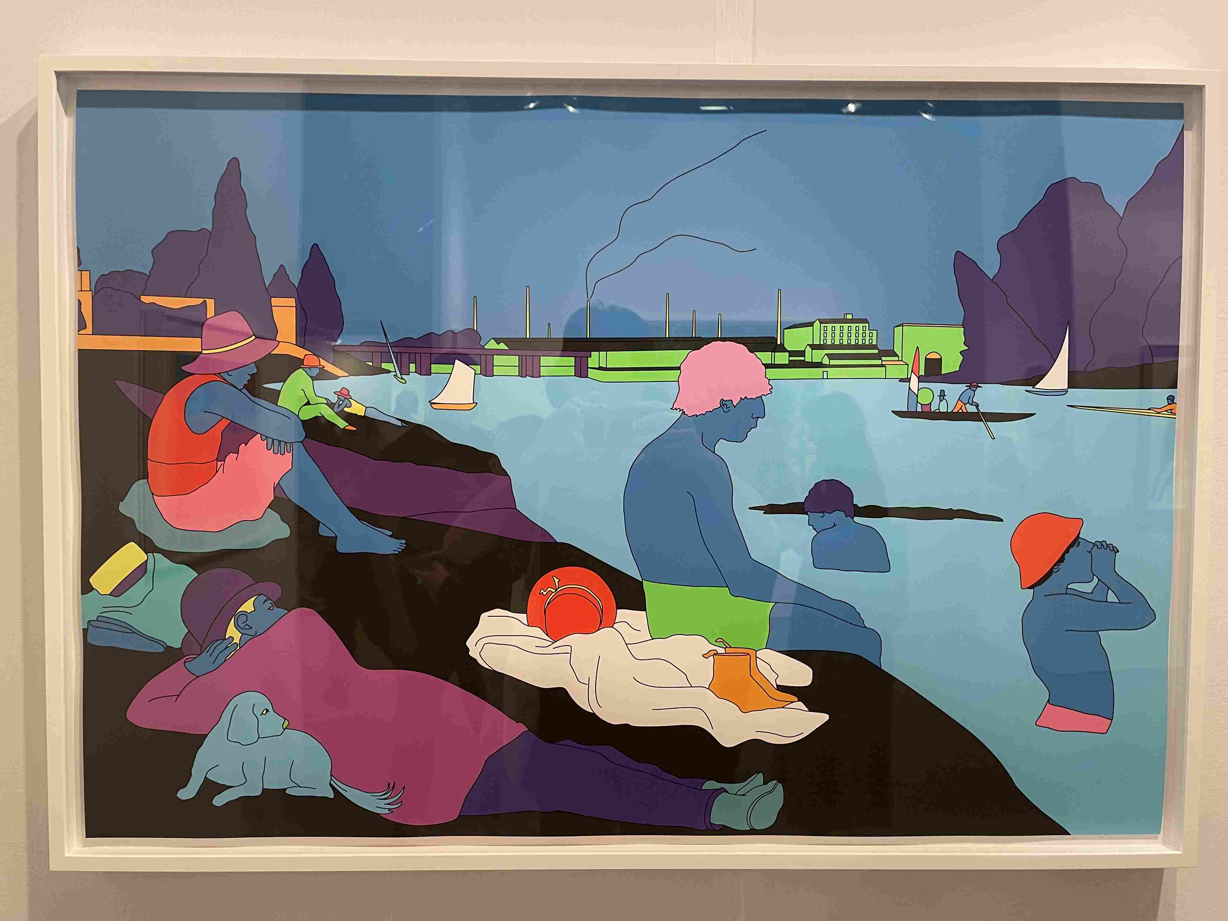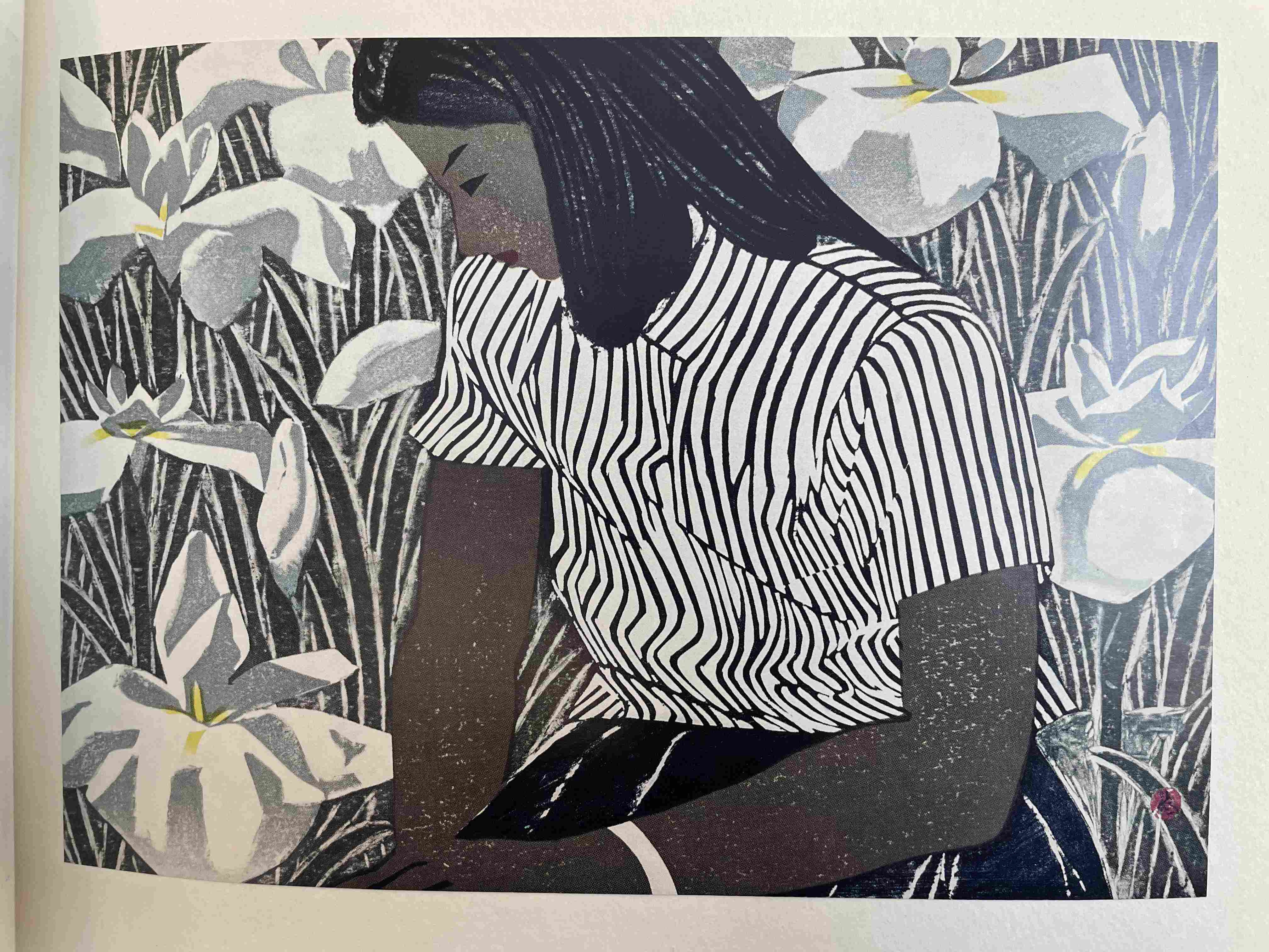 Stylized Painting of a Reclining Woman on a Couch with Drinks Against a Black Background
