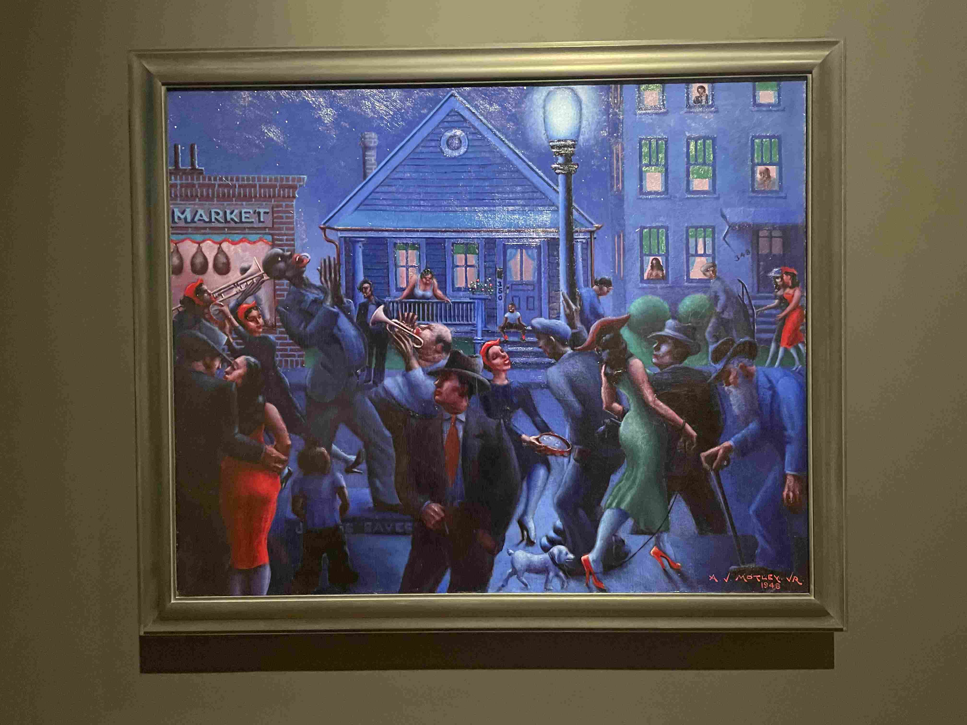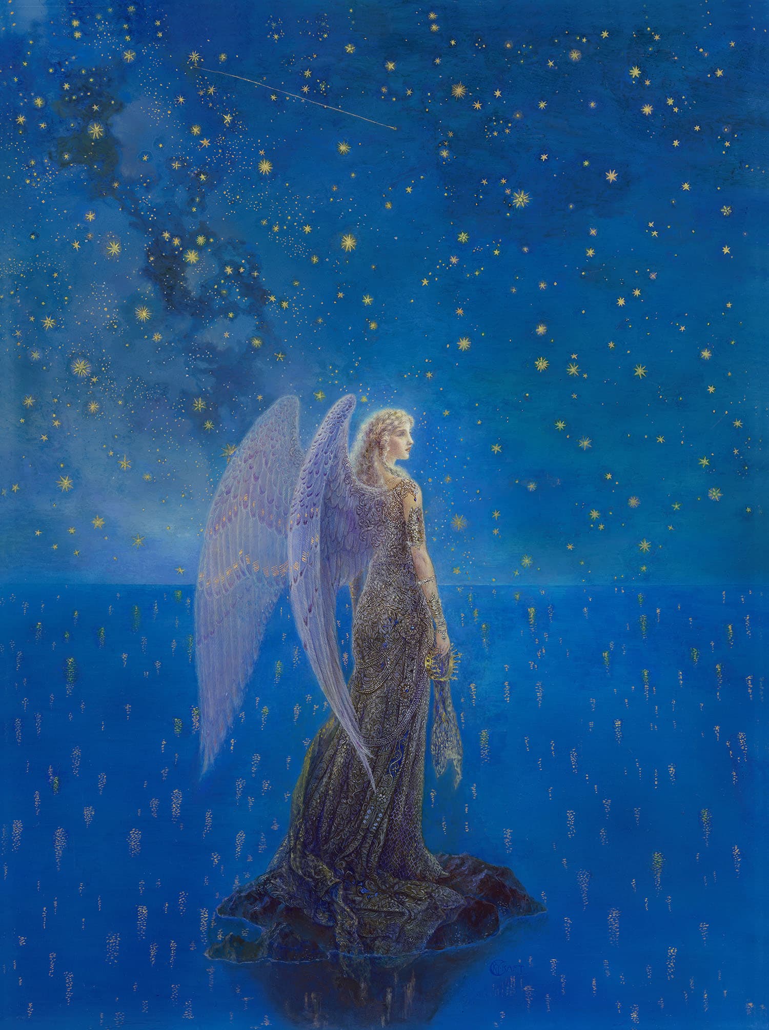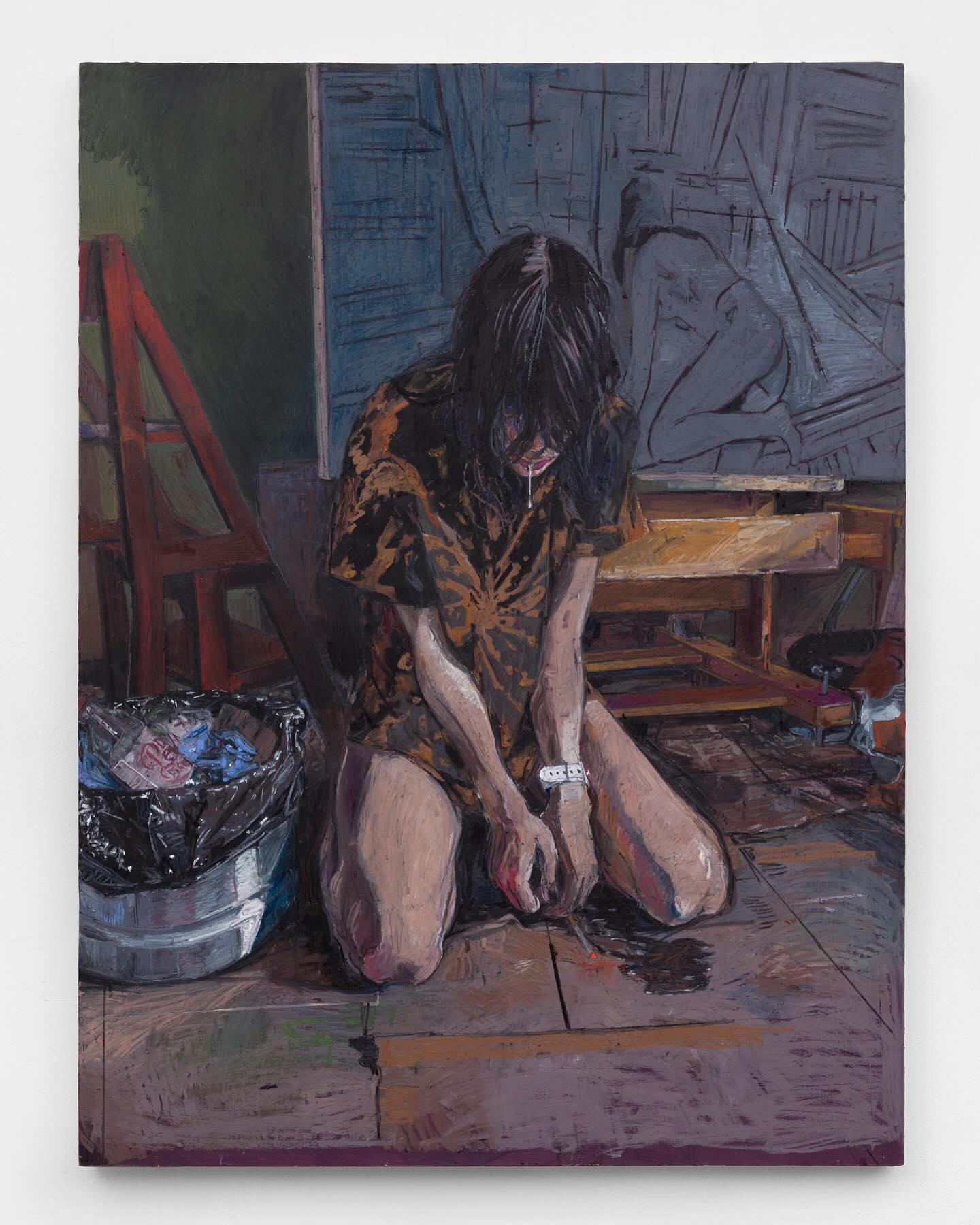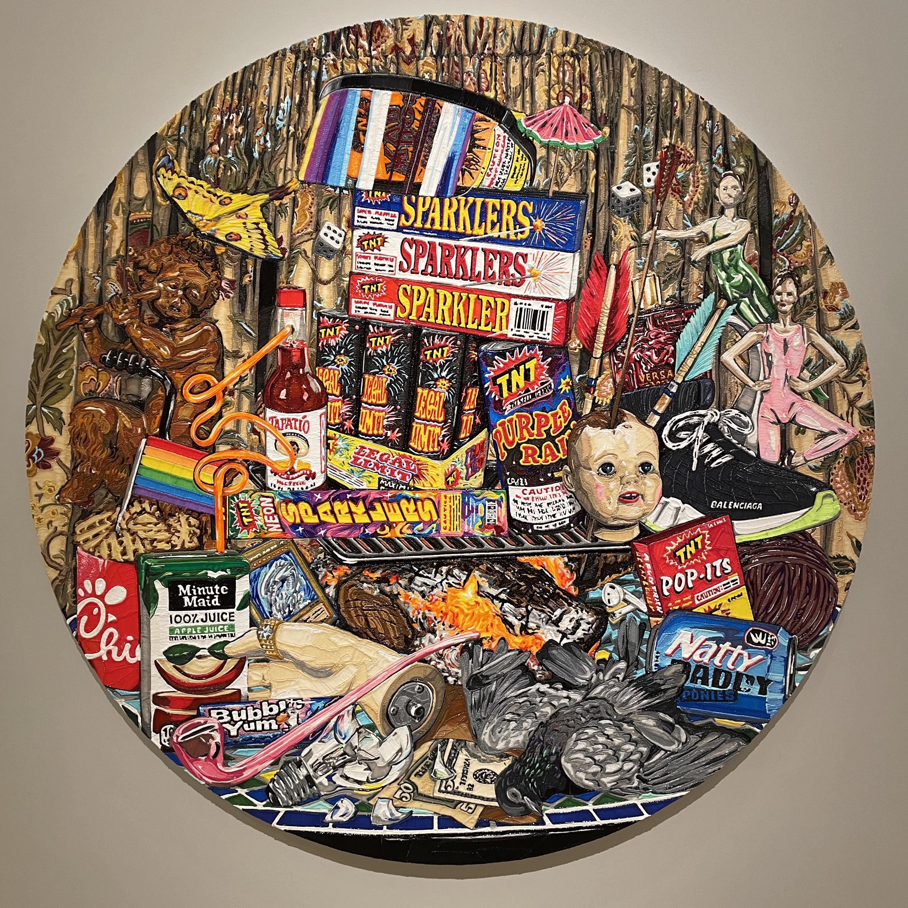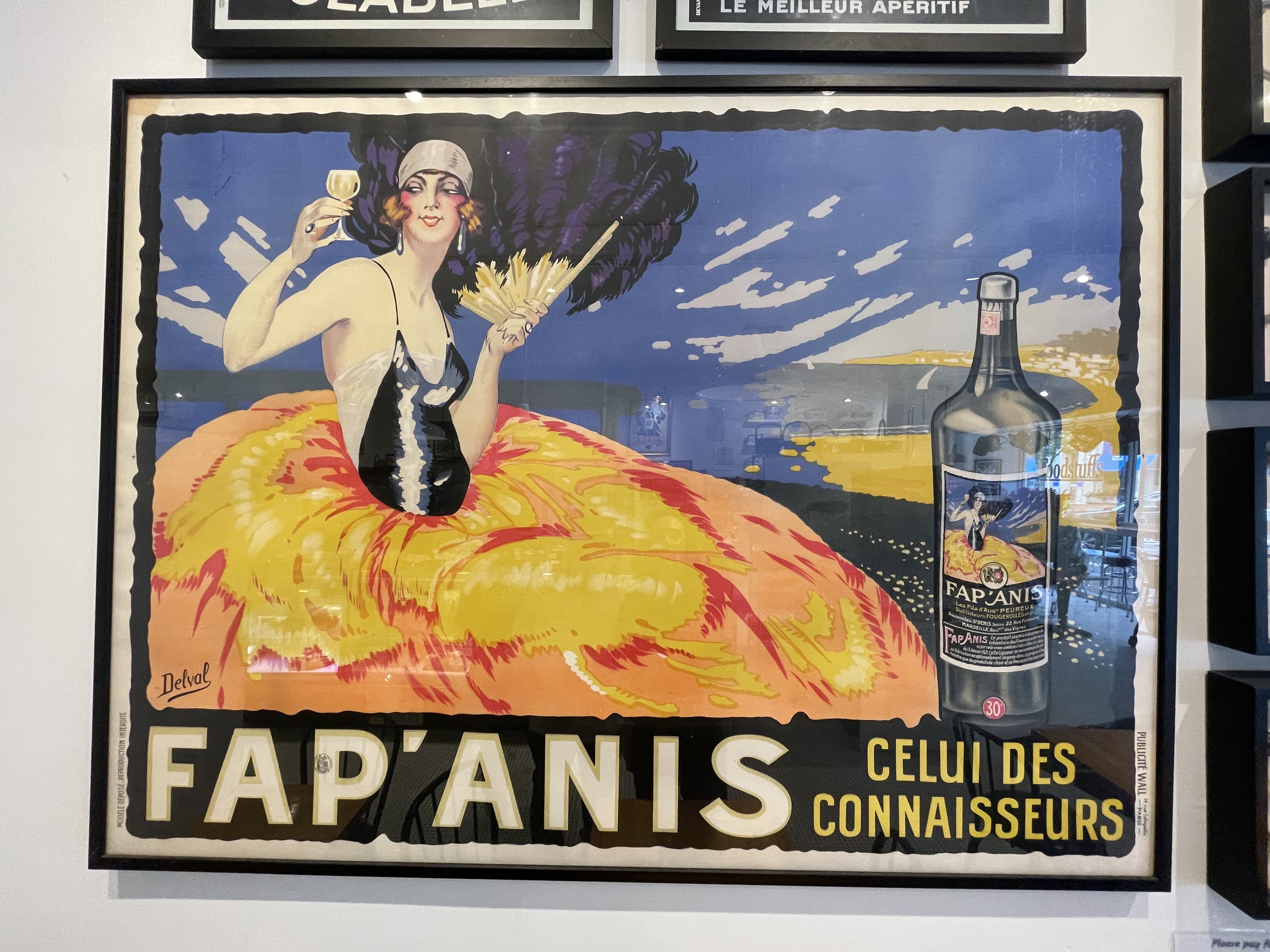 Stylized Painting of a Reclining Woman on a Couch with Drinks Against a Black Background