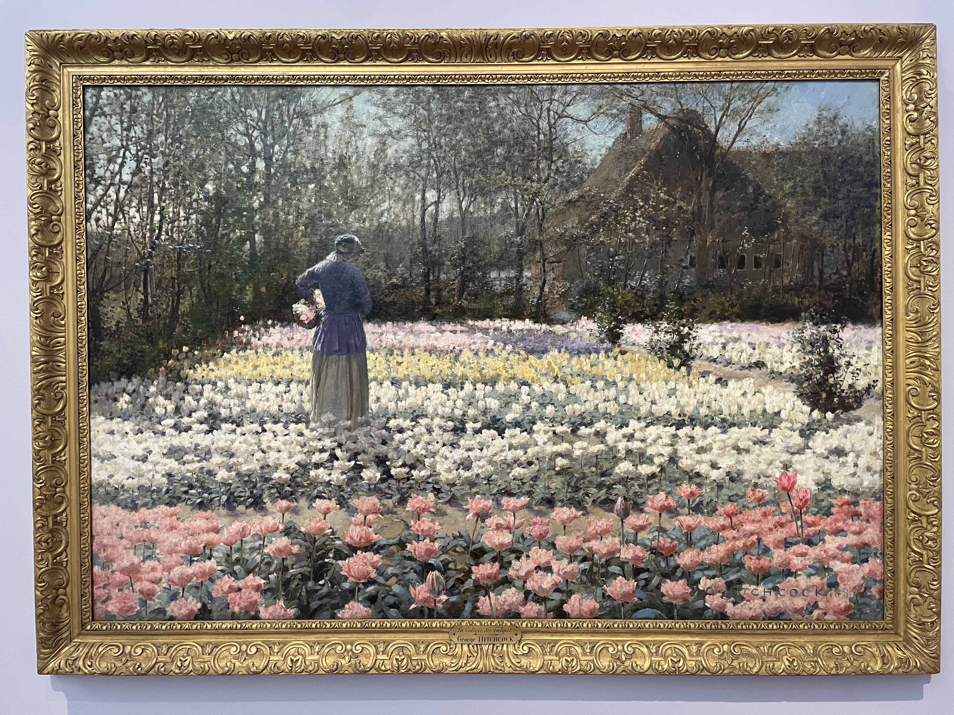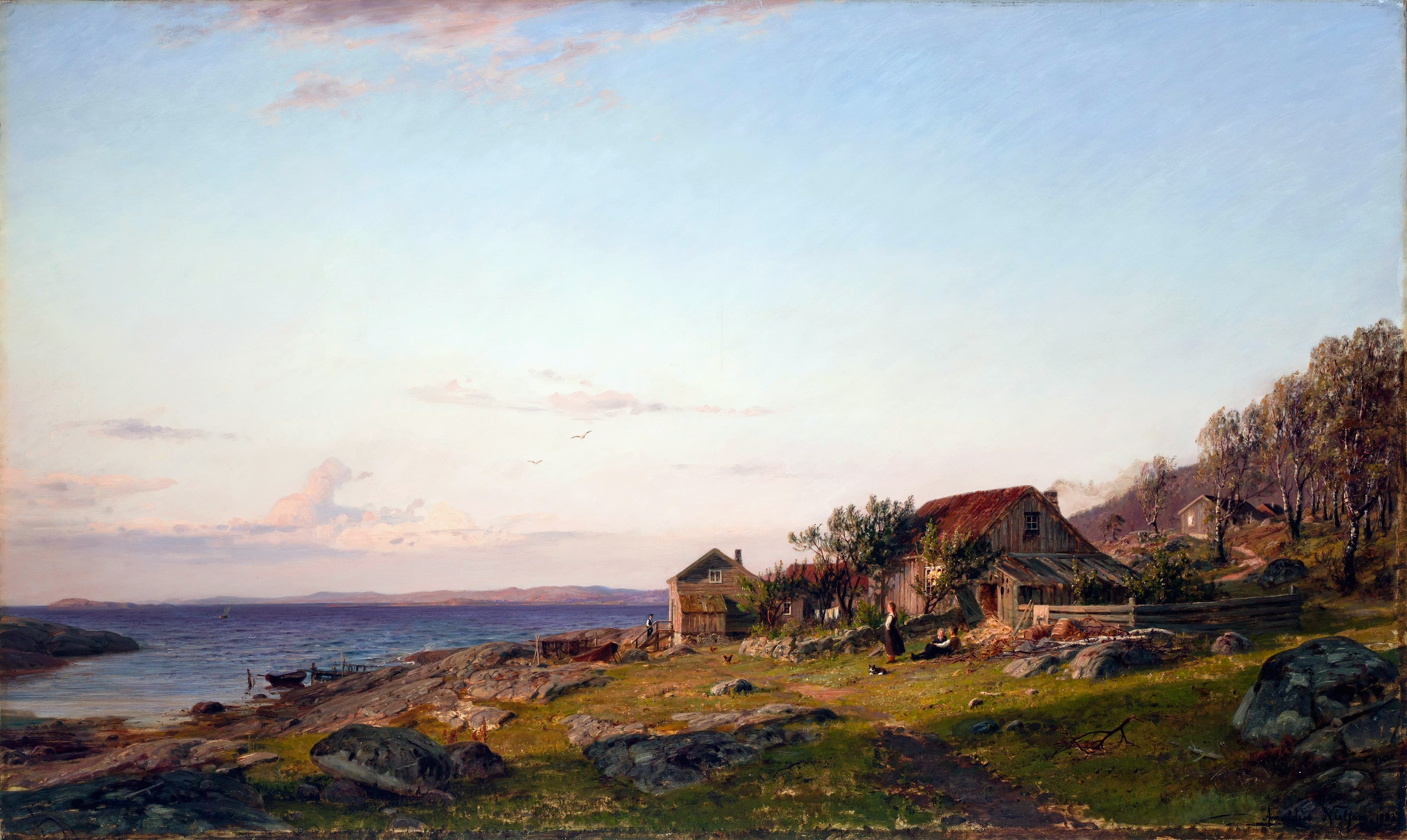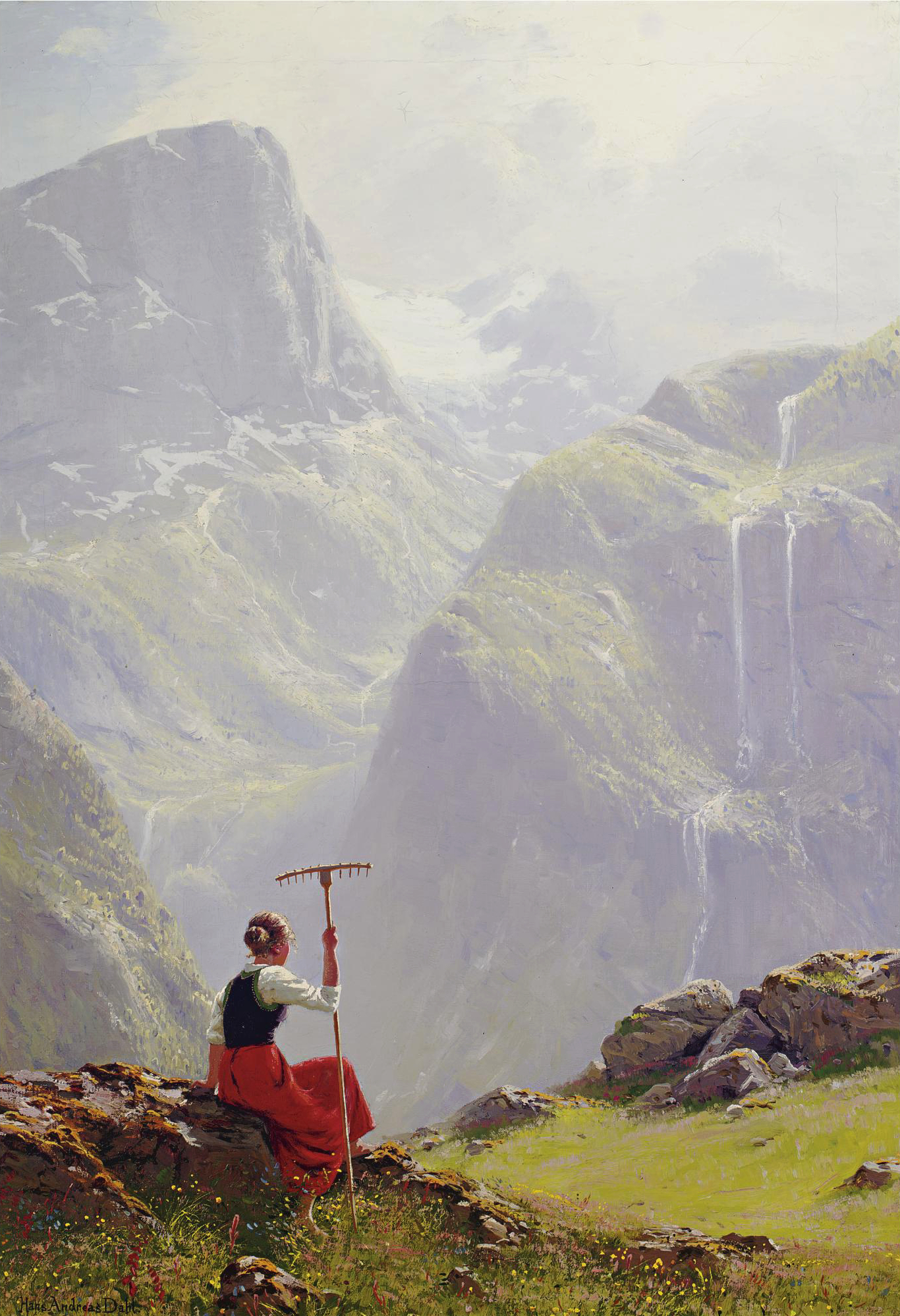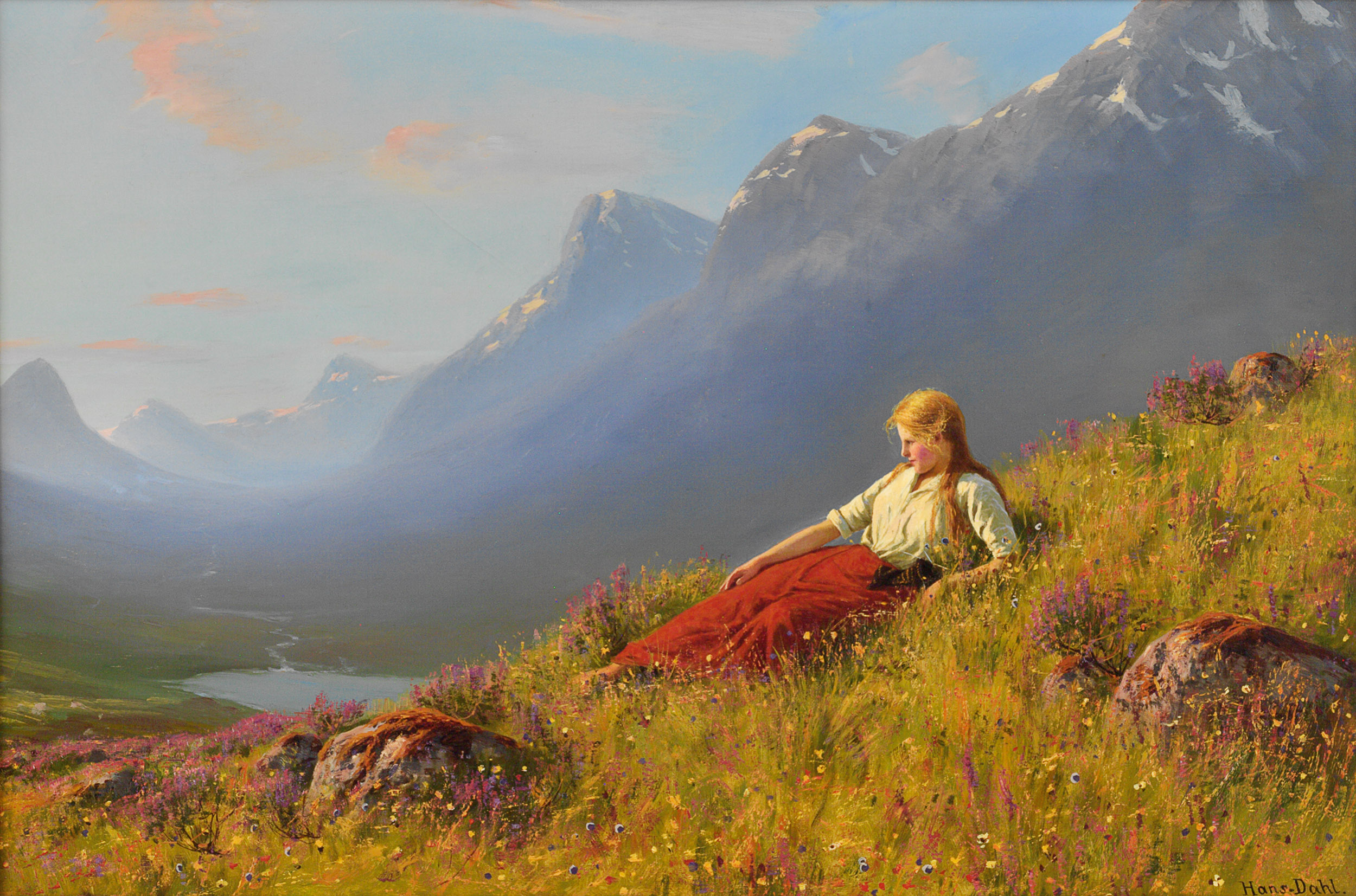 hans dahl young woman gathering flowers by a fjord (late 1900s)