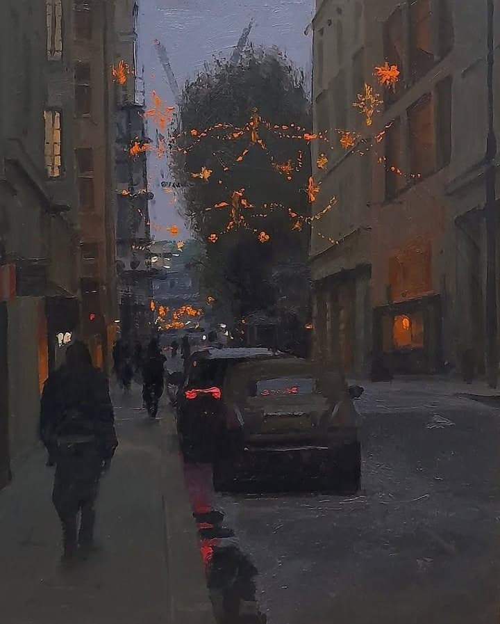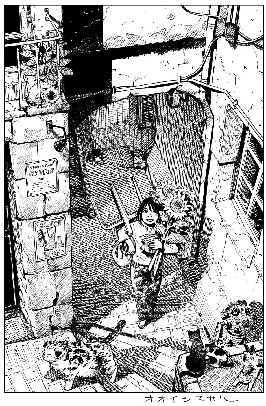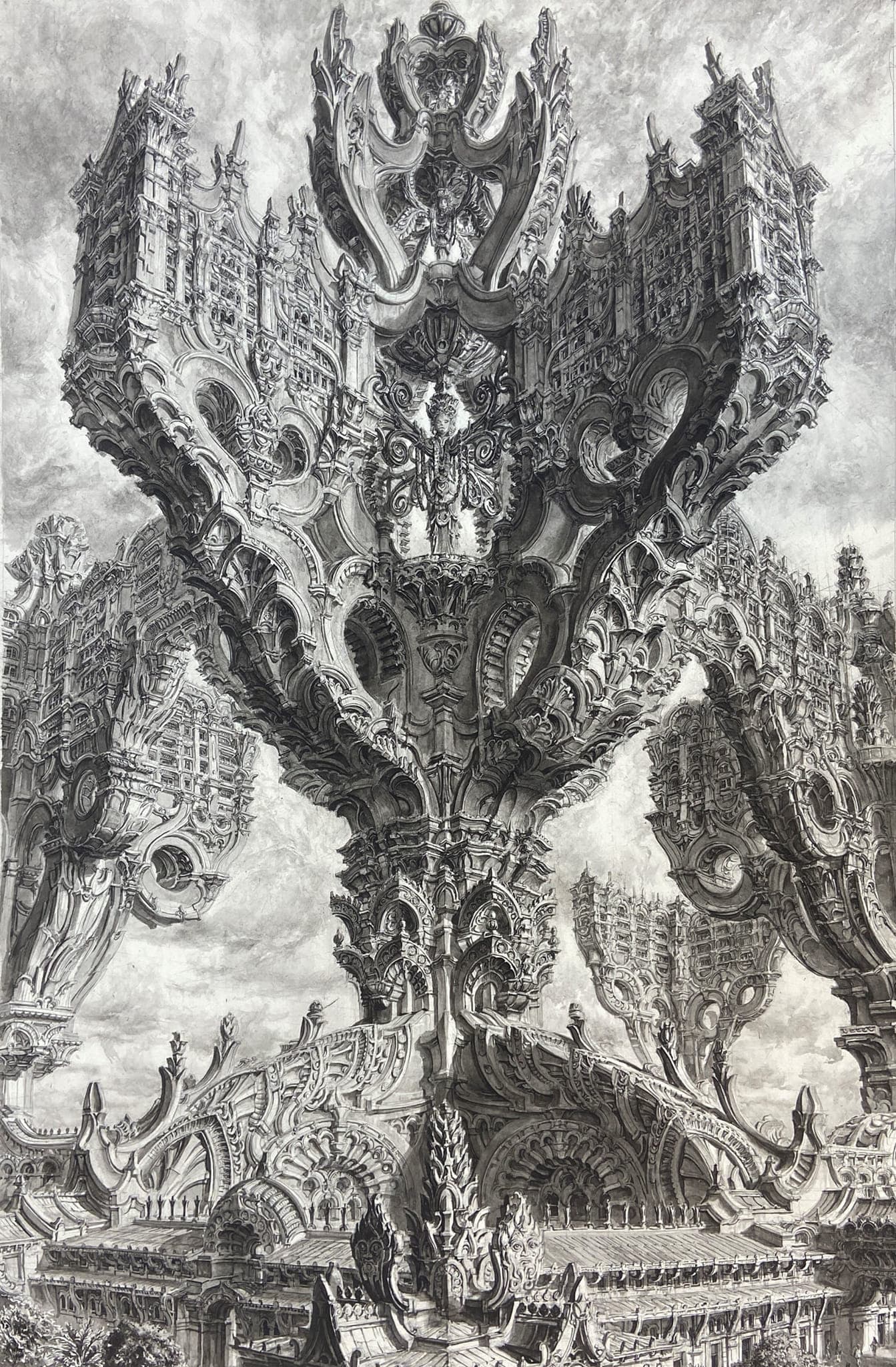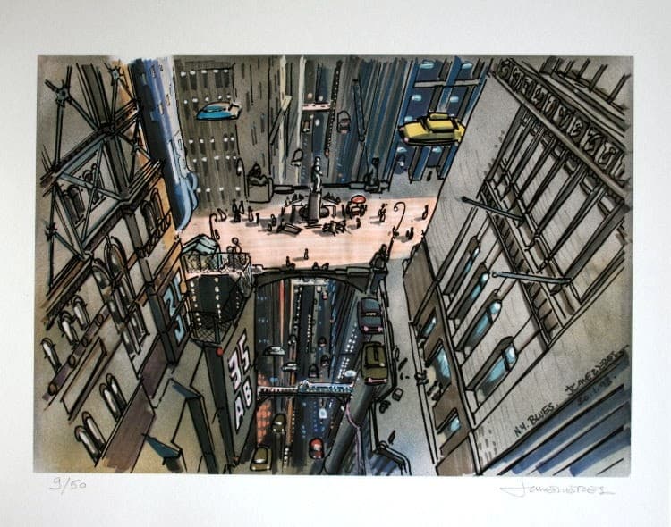 Charcoal and Wash Sketch of a Narrow City Street with Tall Buildings