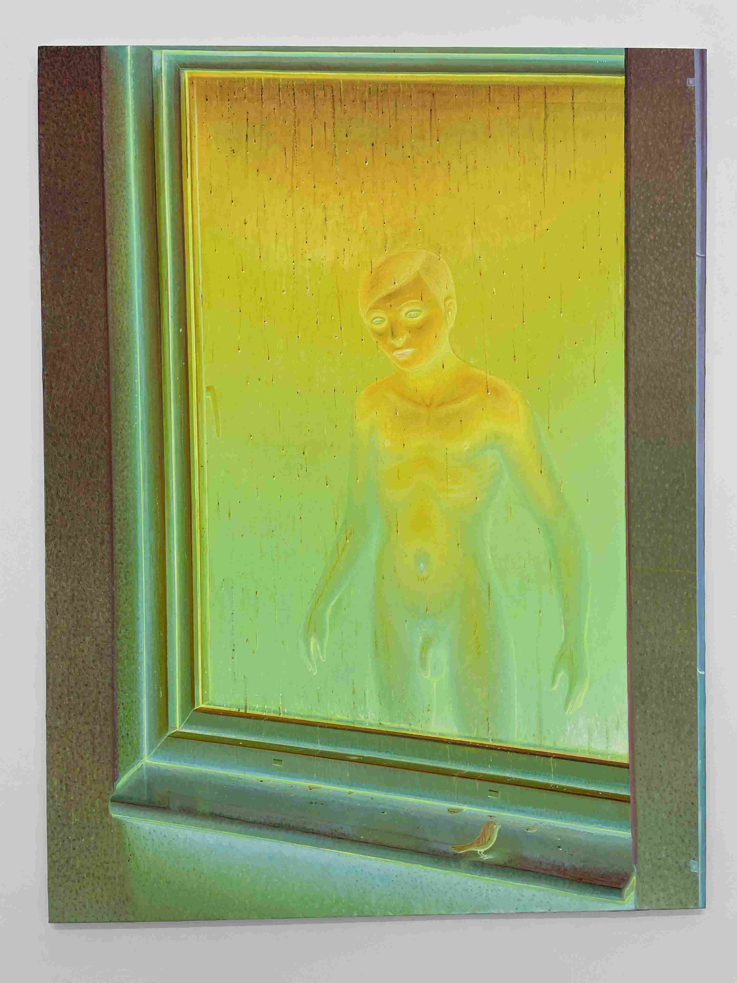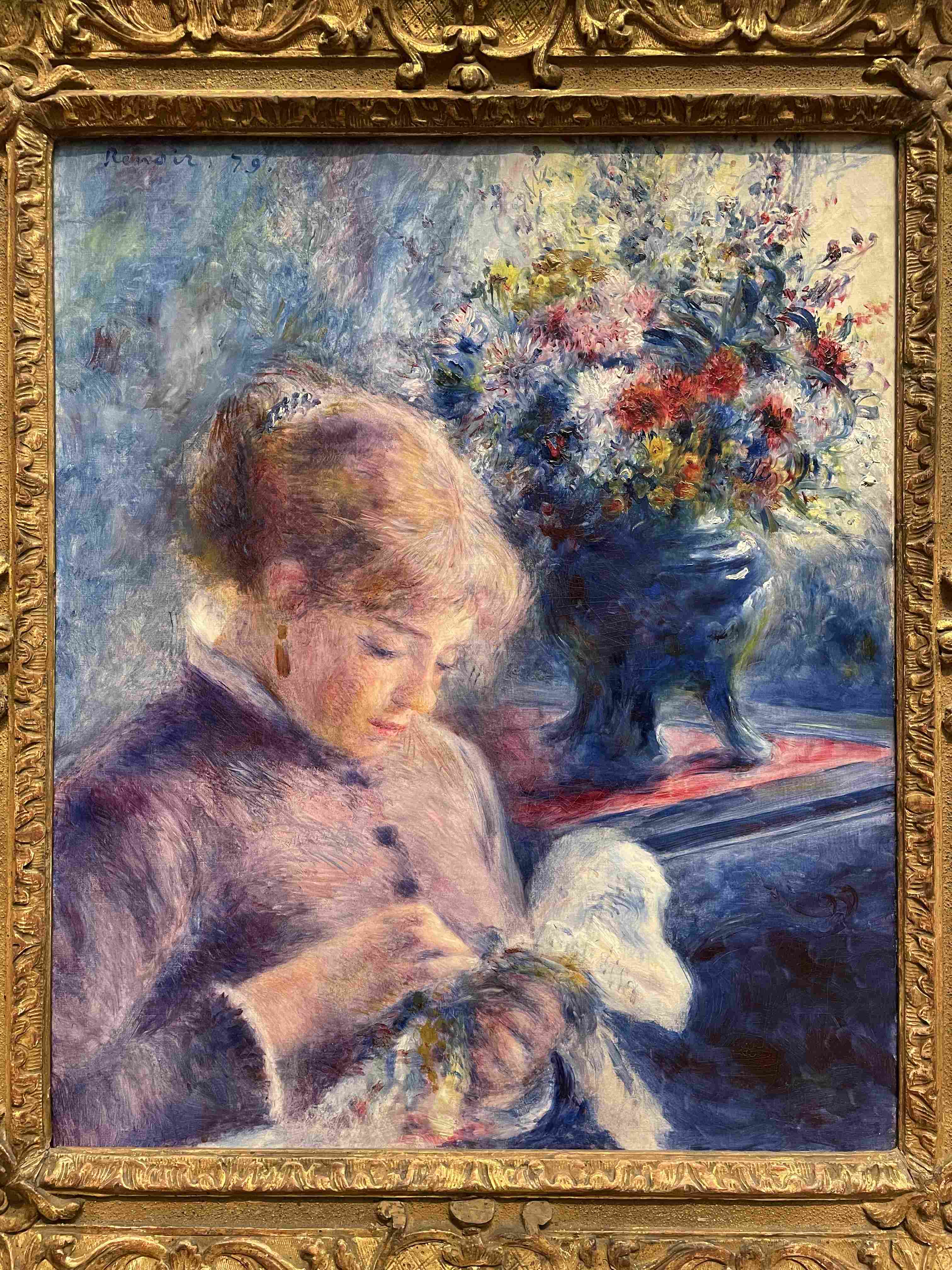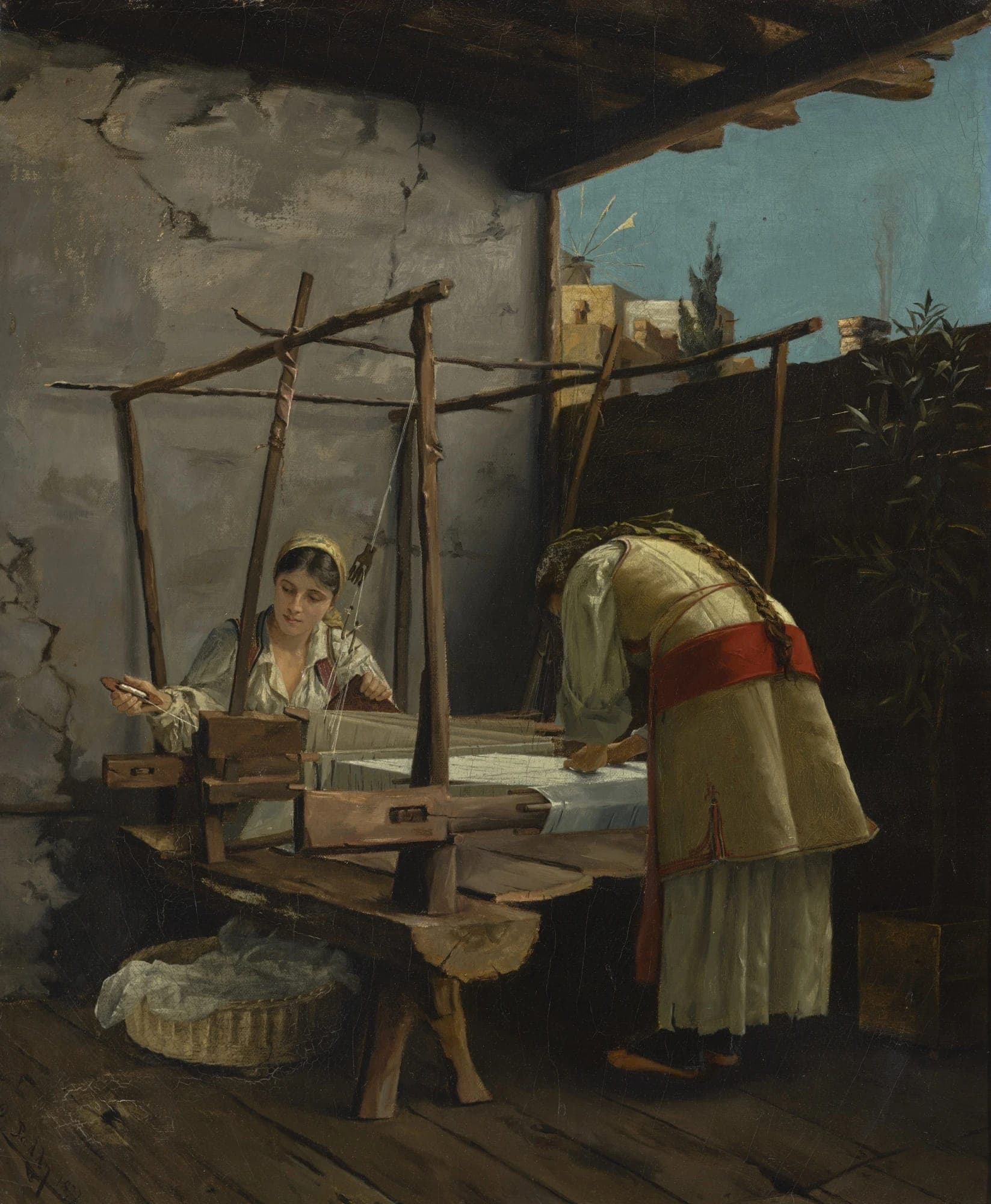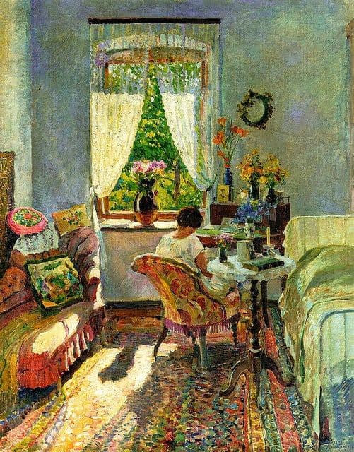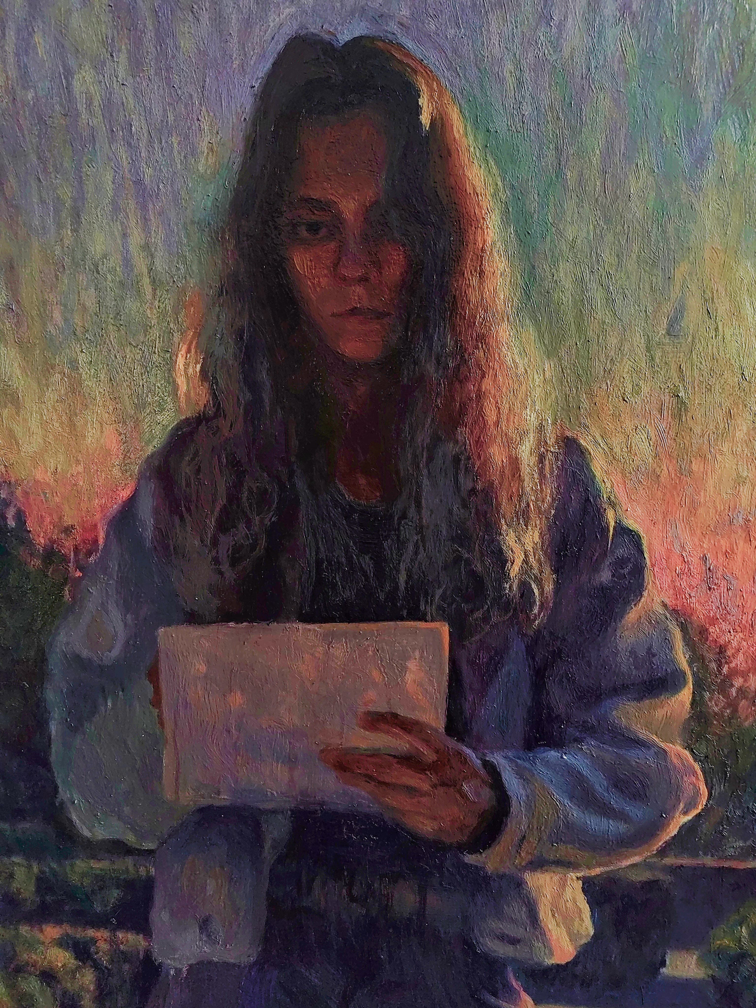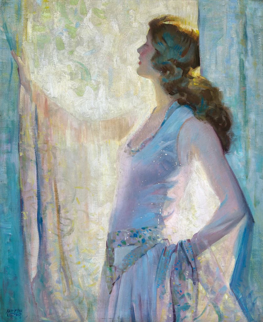 Oil Painting of a Woman in a Blue Dress Sitting in an Open Window