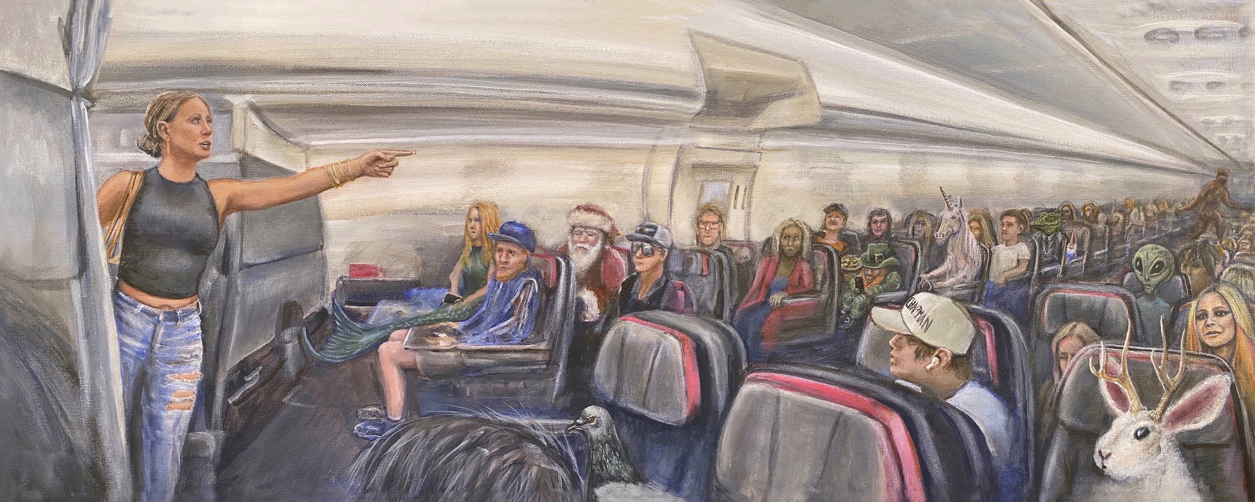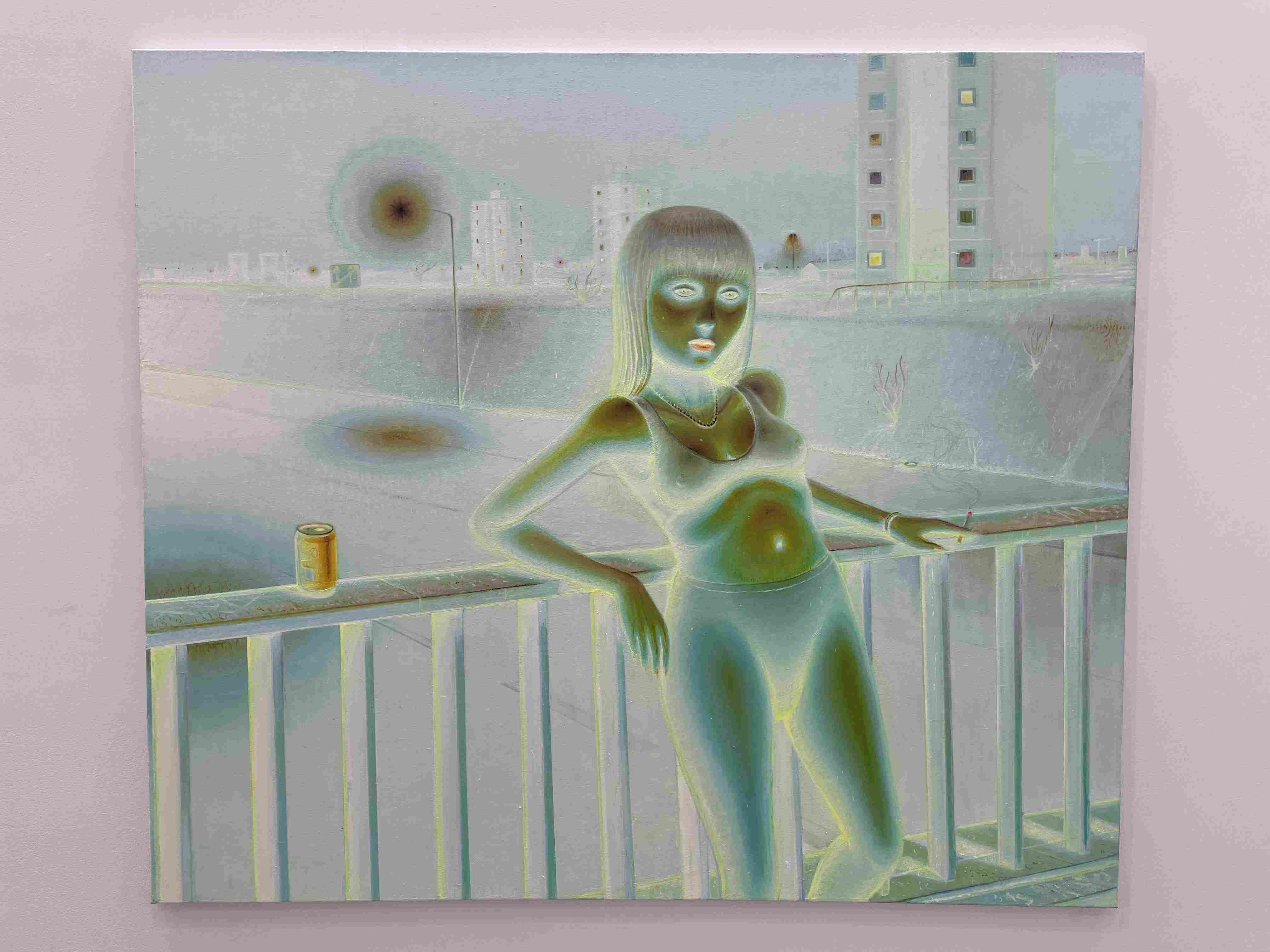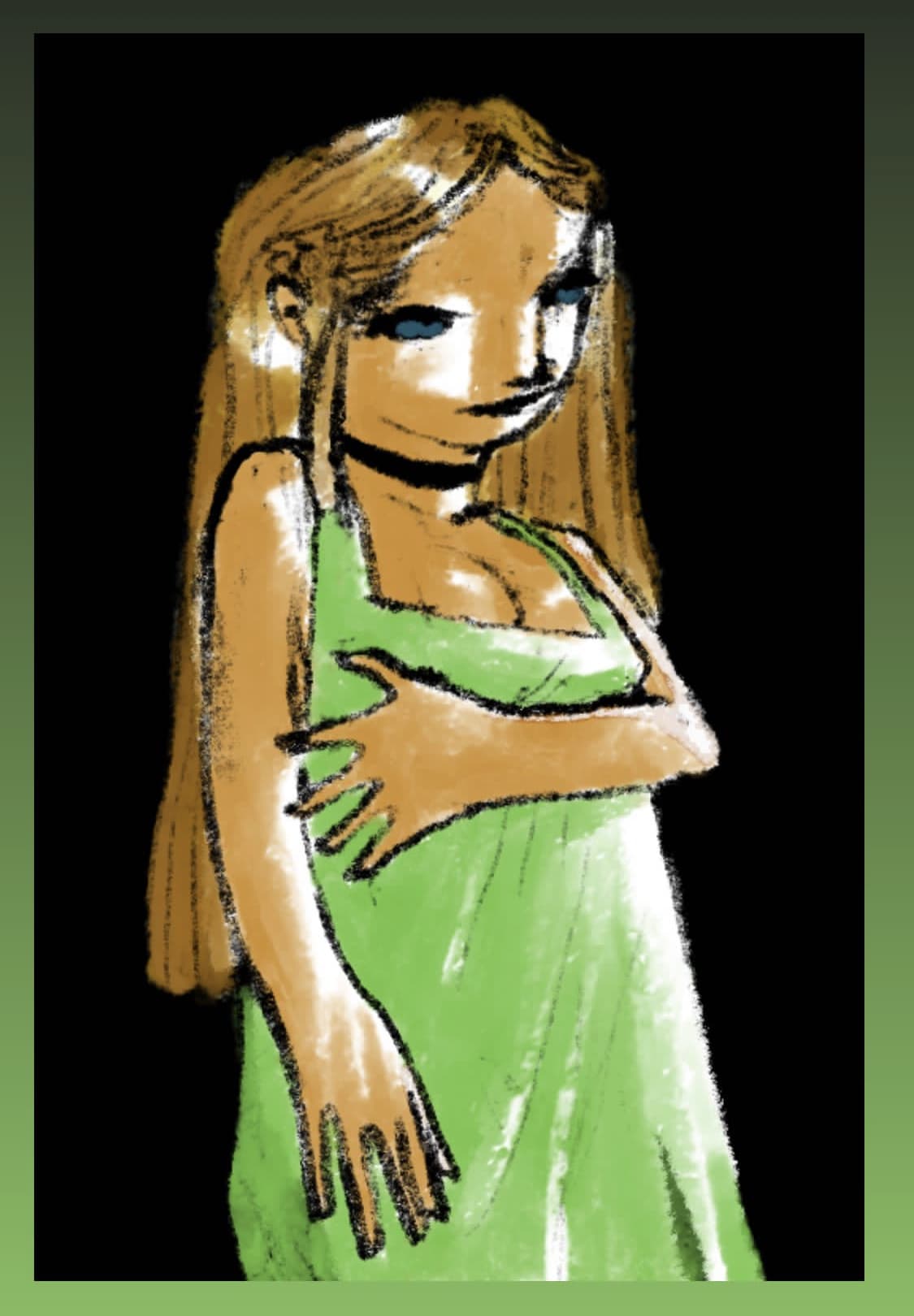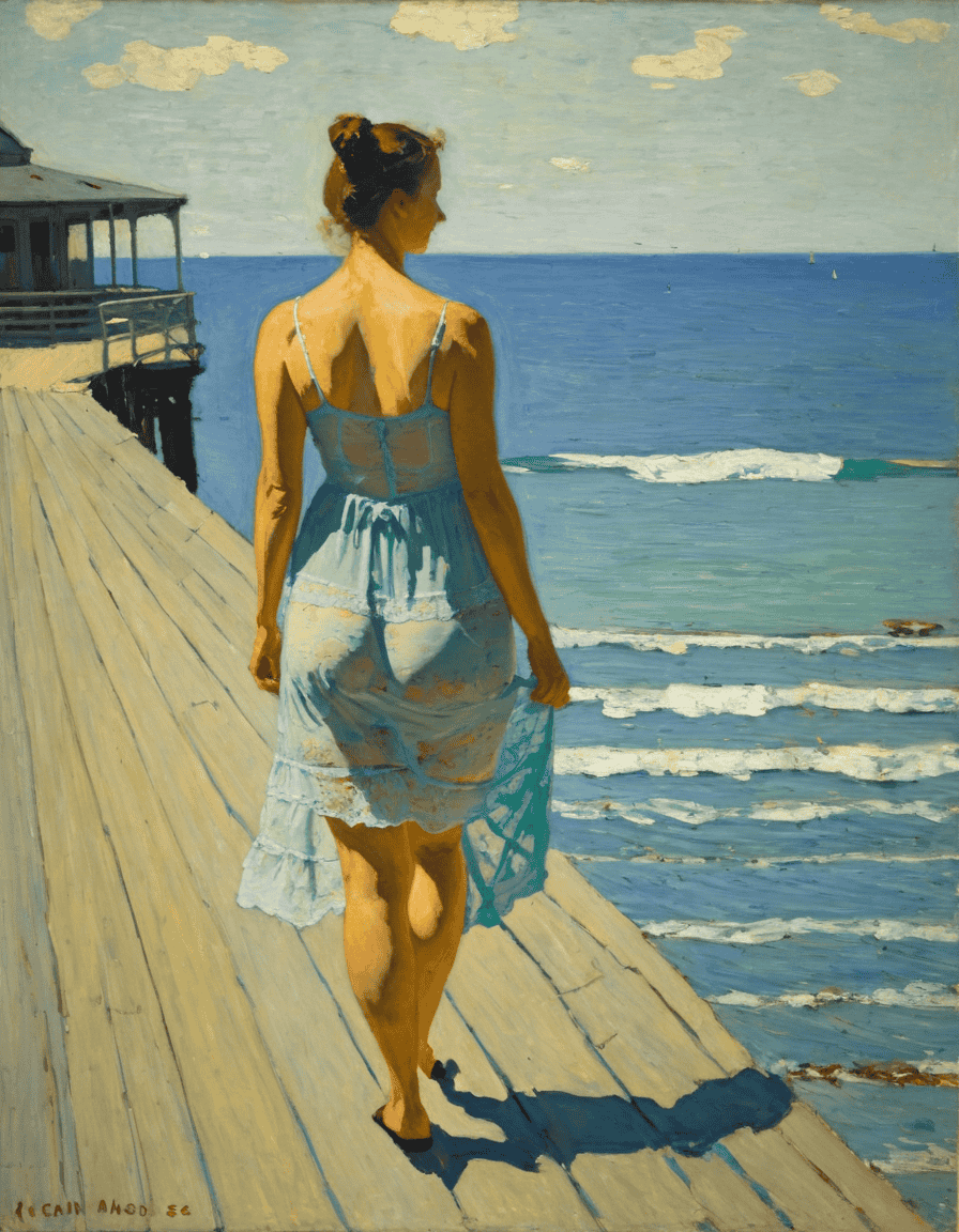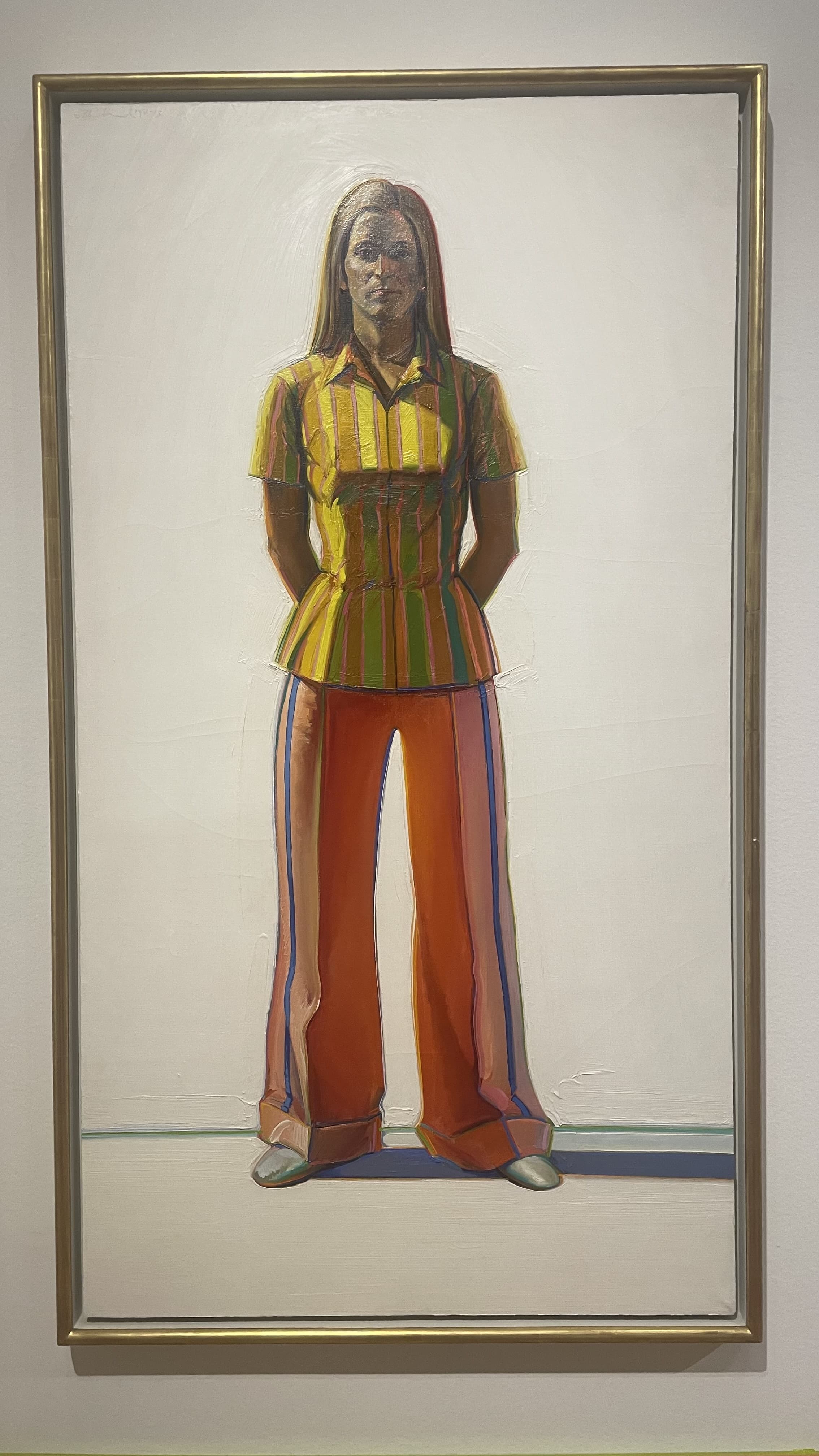 Oil Painting of a Woman in a Lime Green Tunic, White Hat, and Striped Leggings
