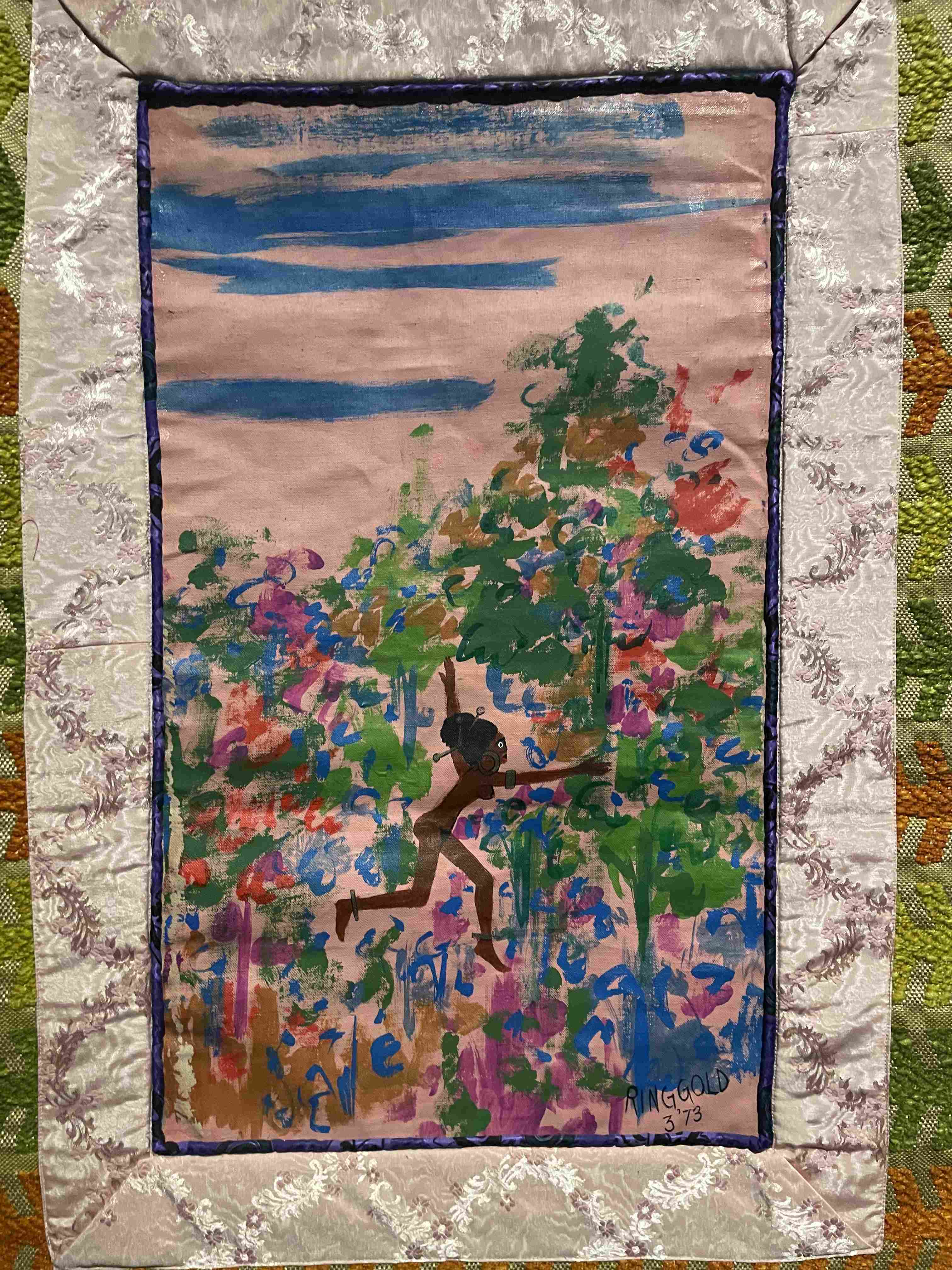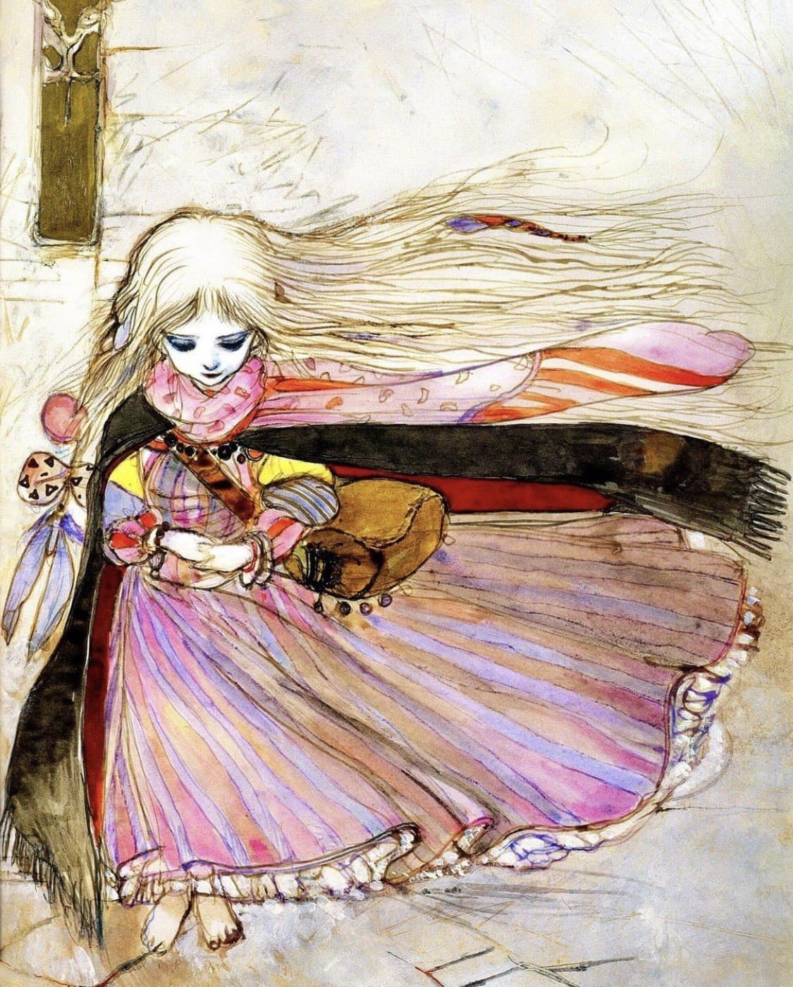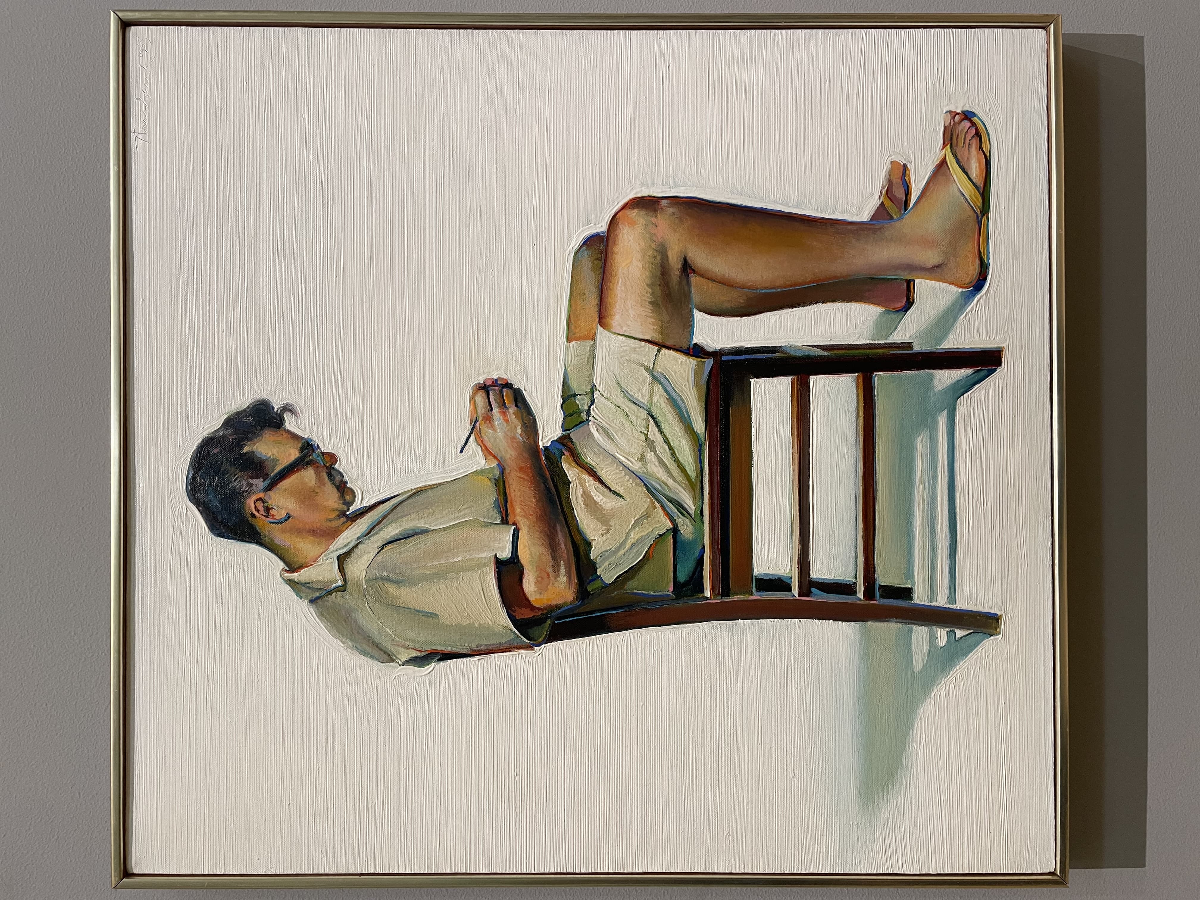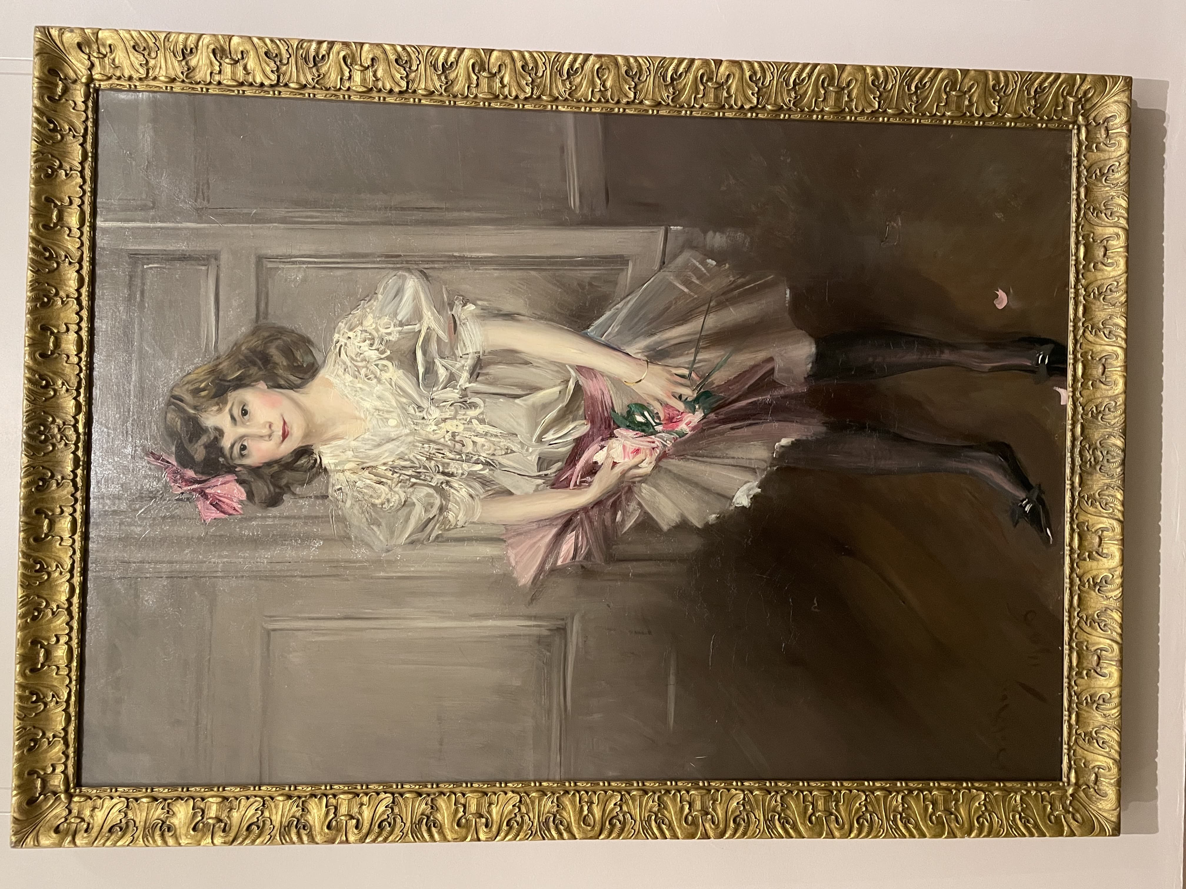 Oil Painting of a Woman in a Lime Green Tunic, White Hat, and Striped Leggings