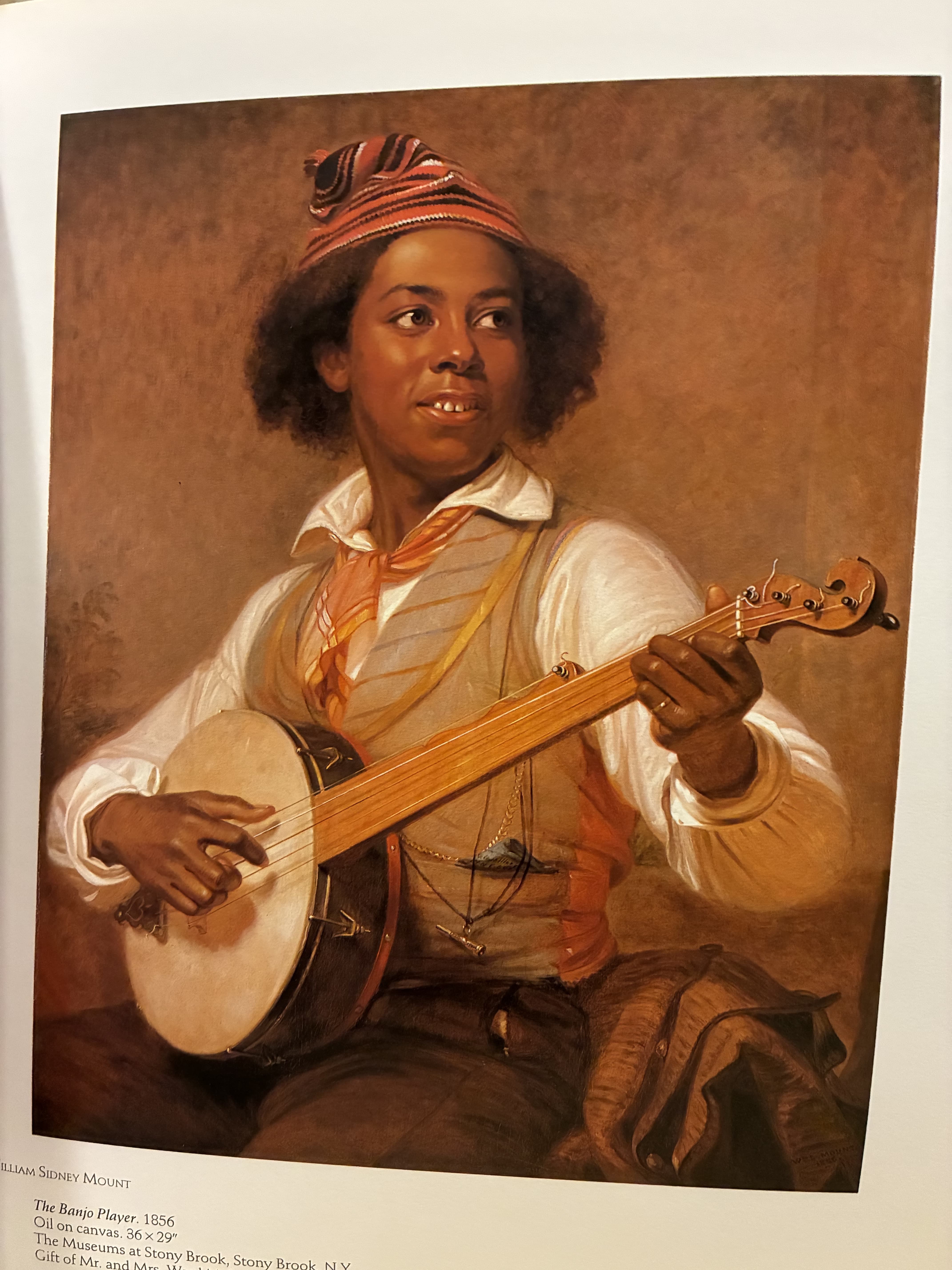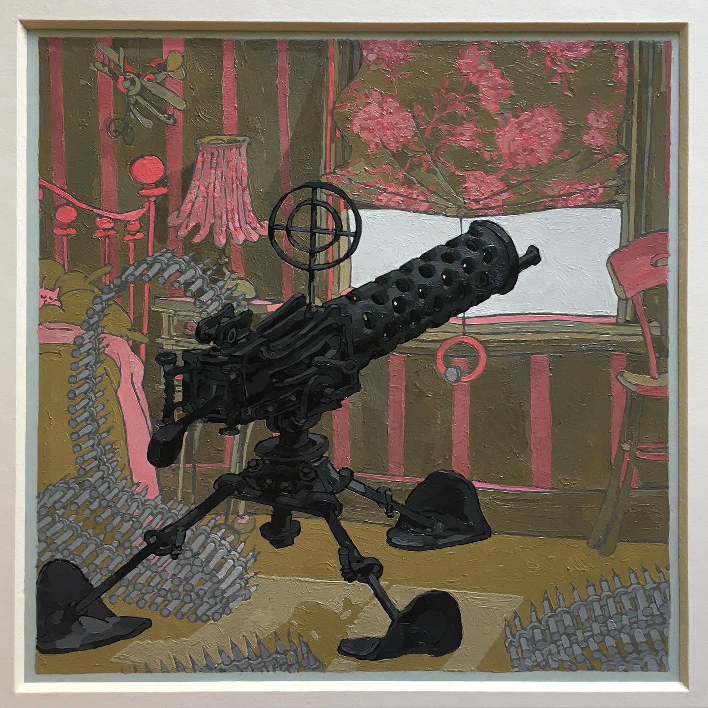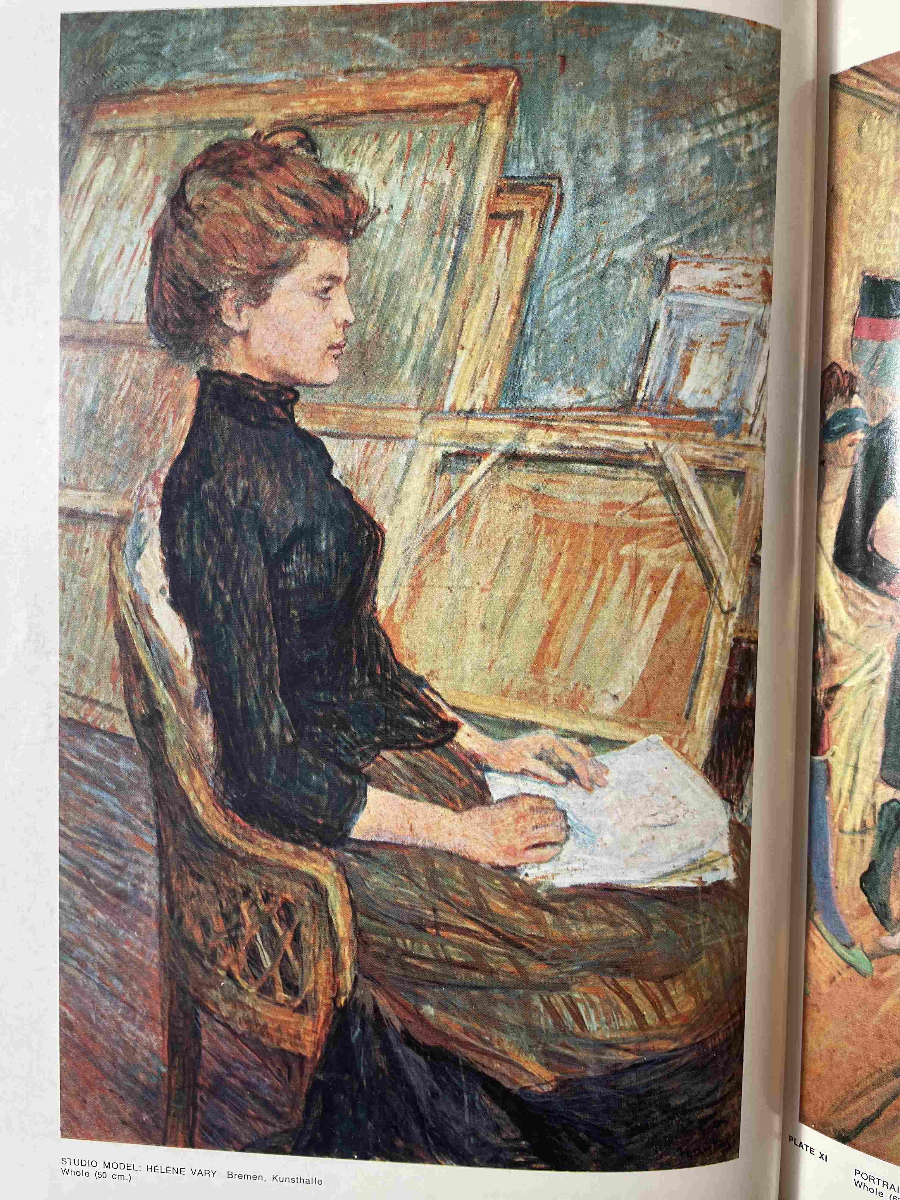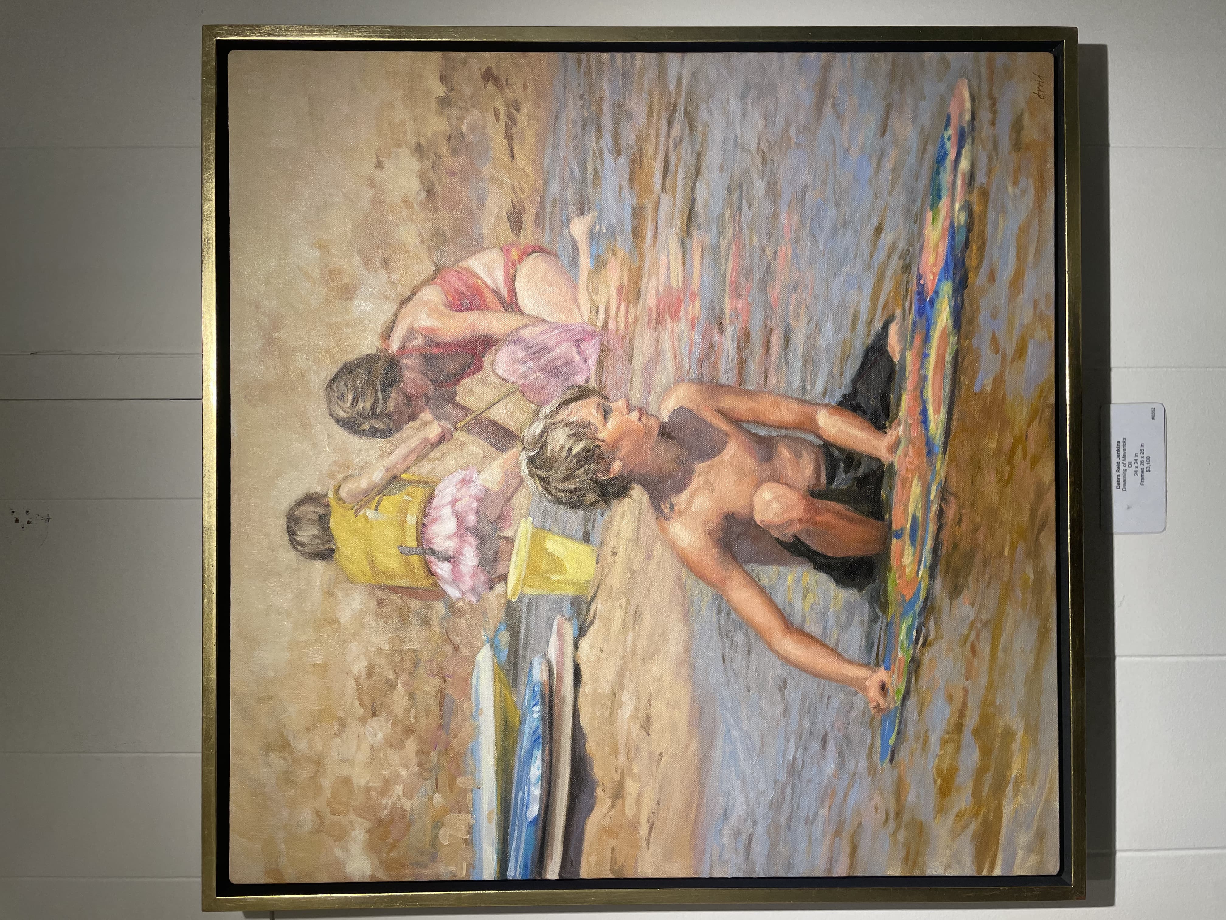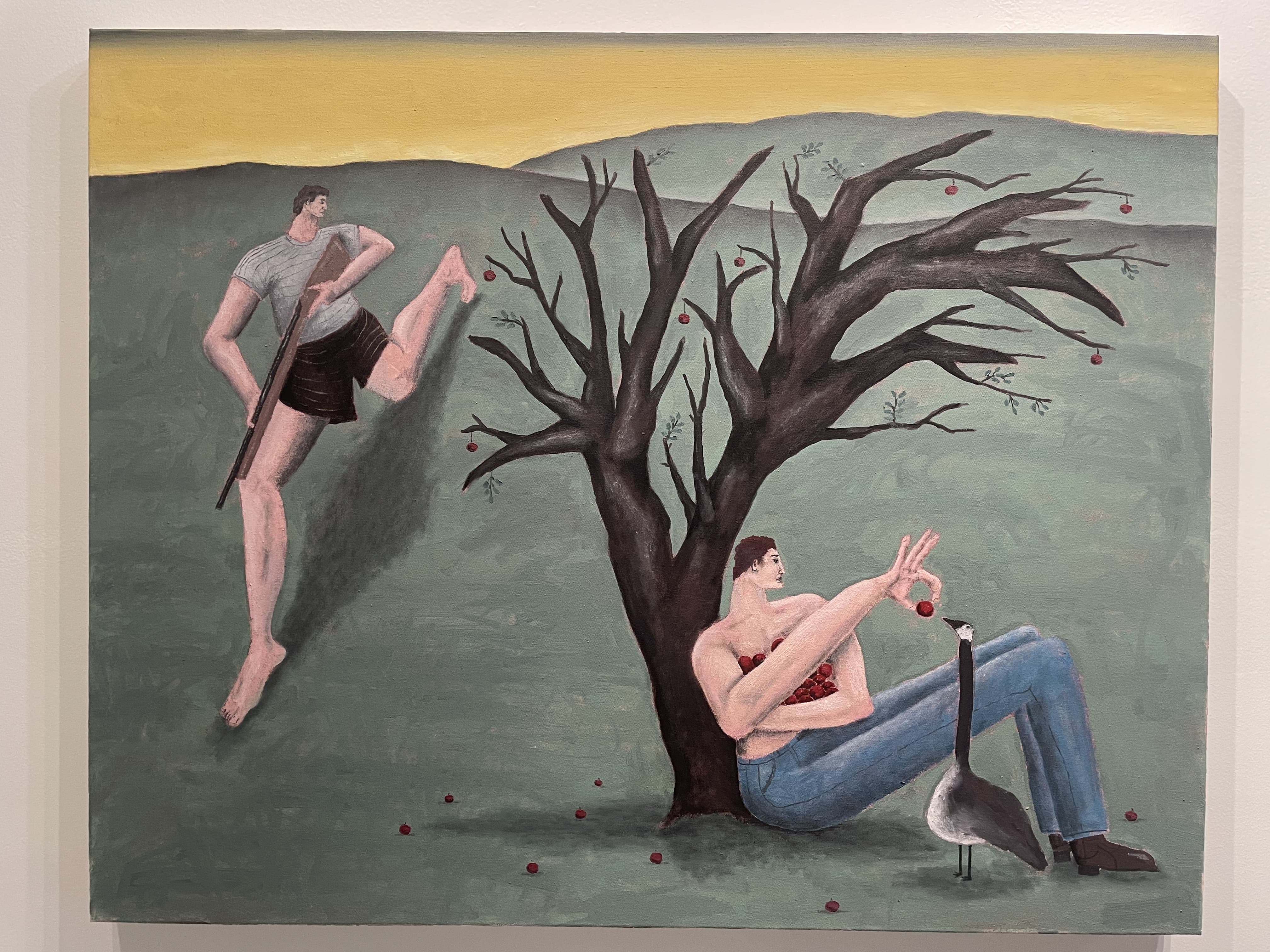 Oil Painting of a Woman in a Lime Green Tunic, White Hat, and Striped Leggings