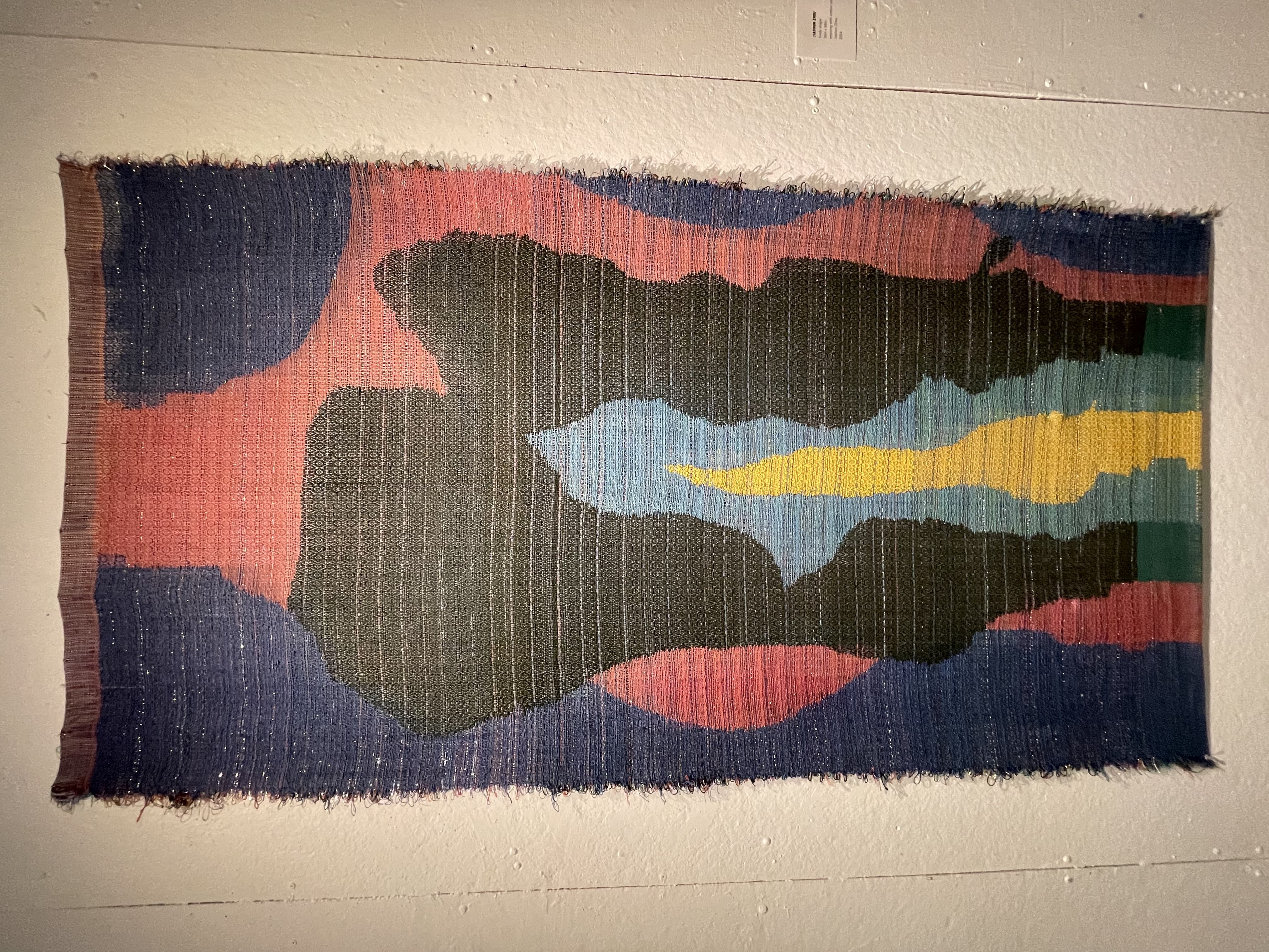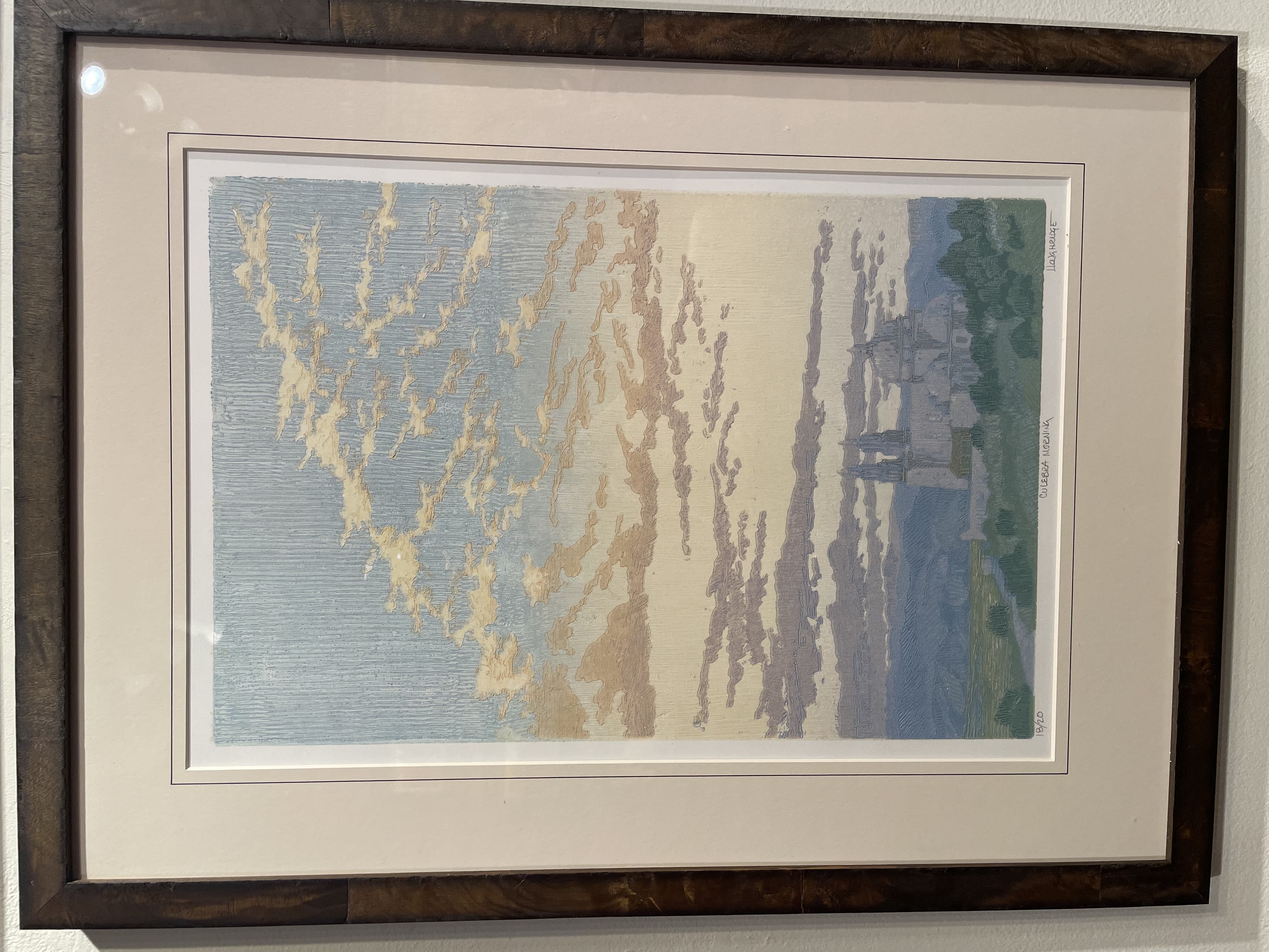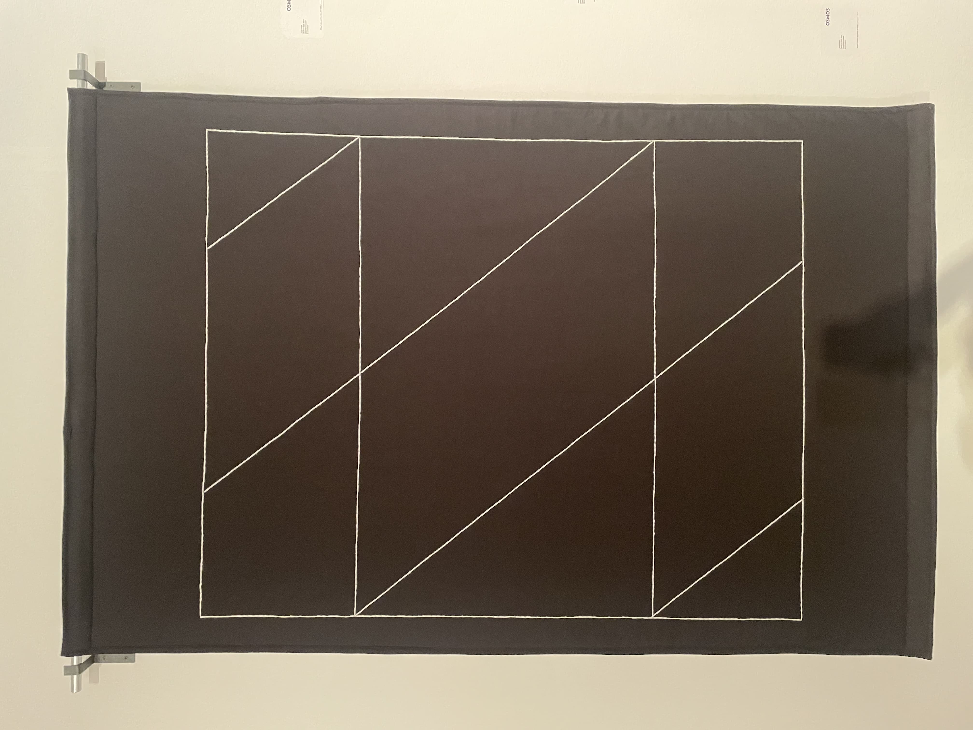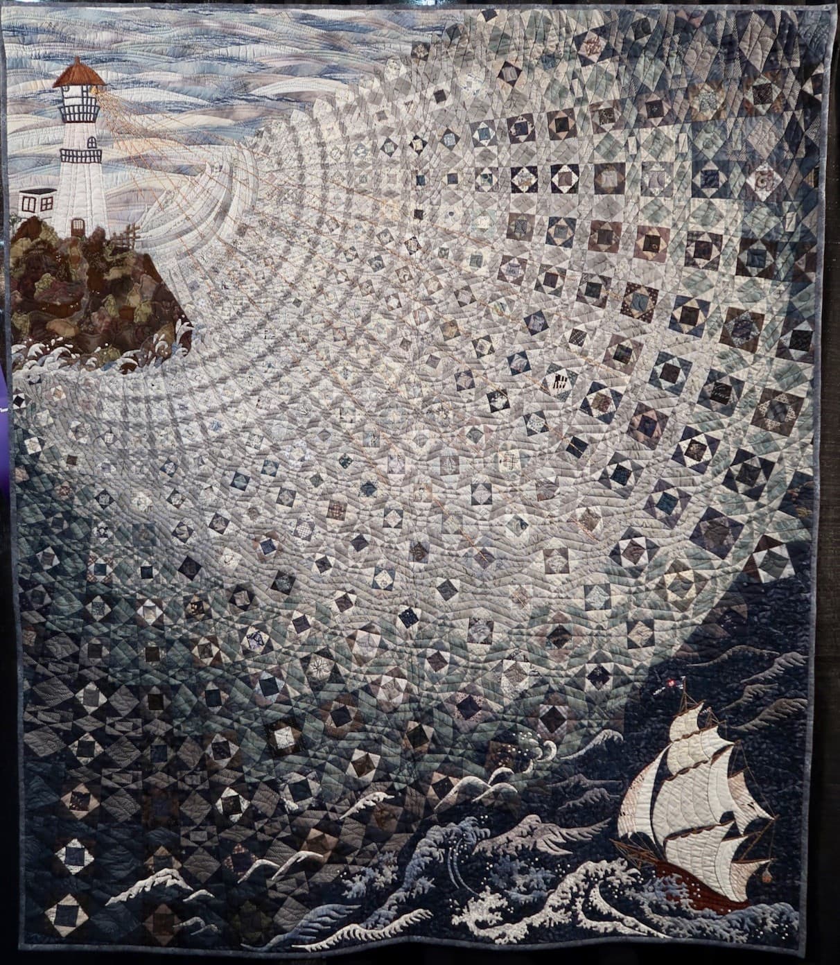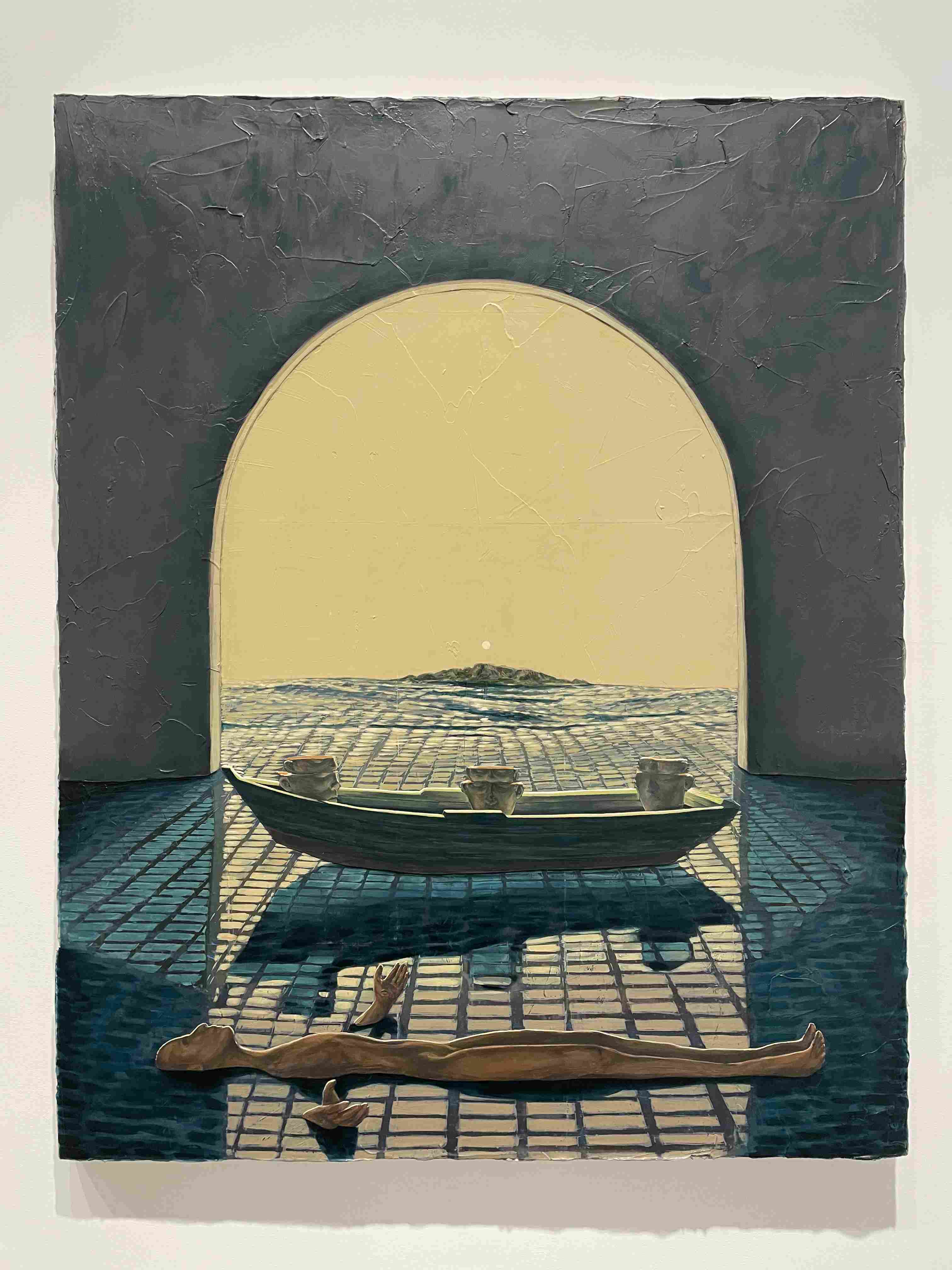 Textile Art Depicting a Dark Boat Hull Reflected in Rippling Water