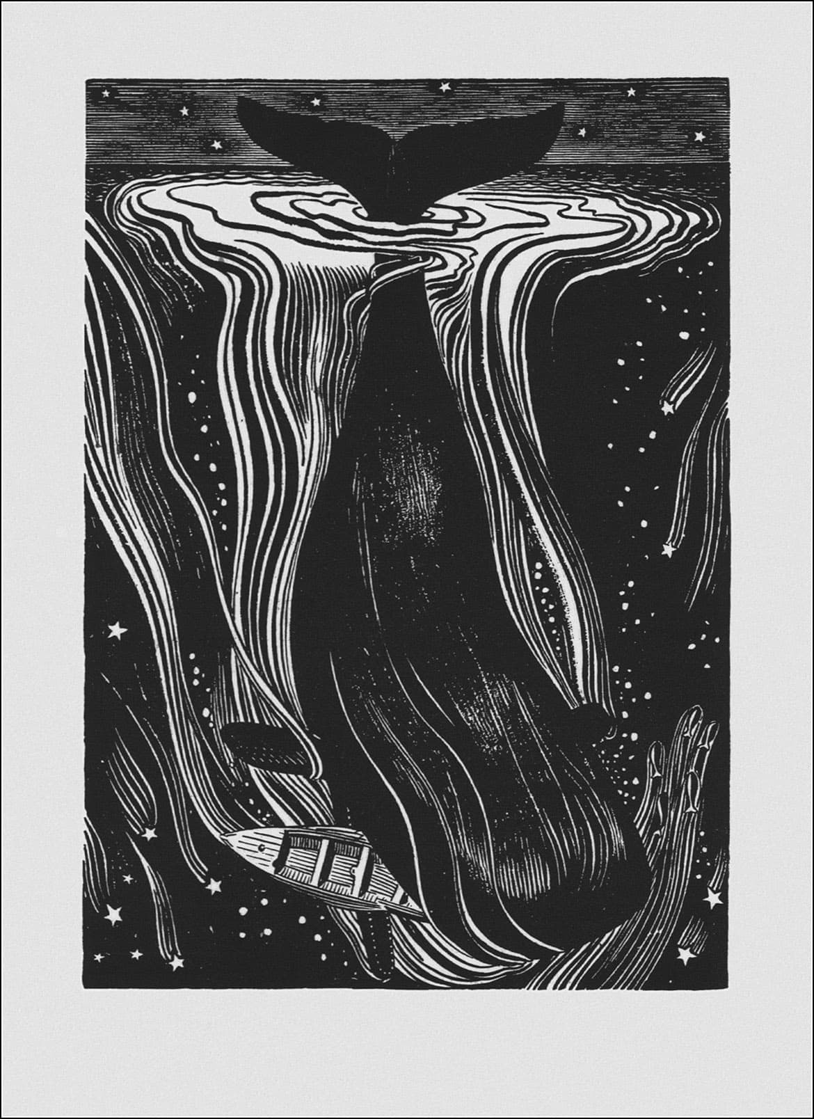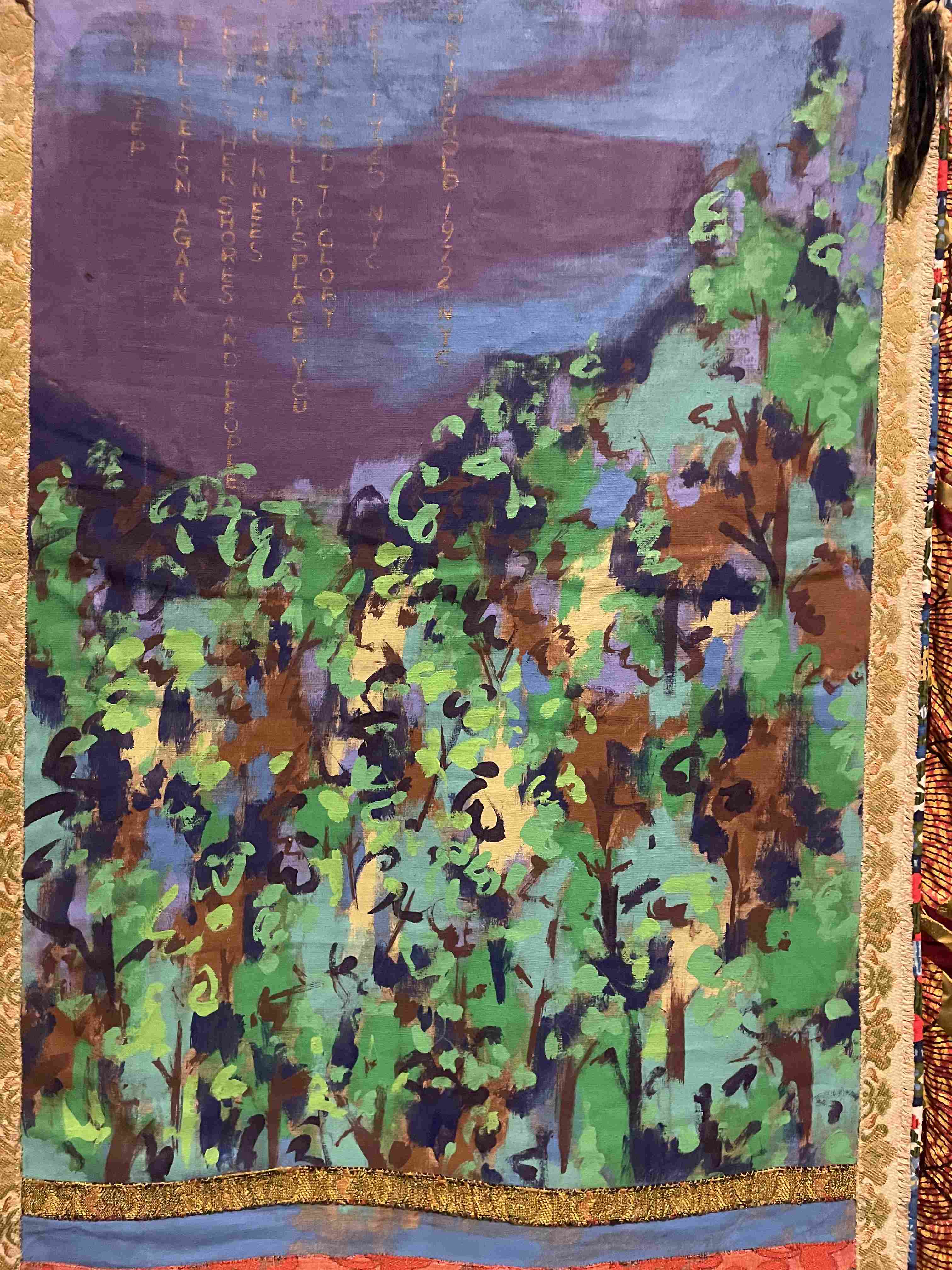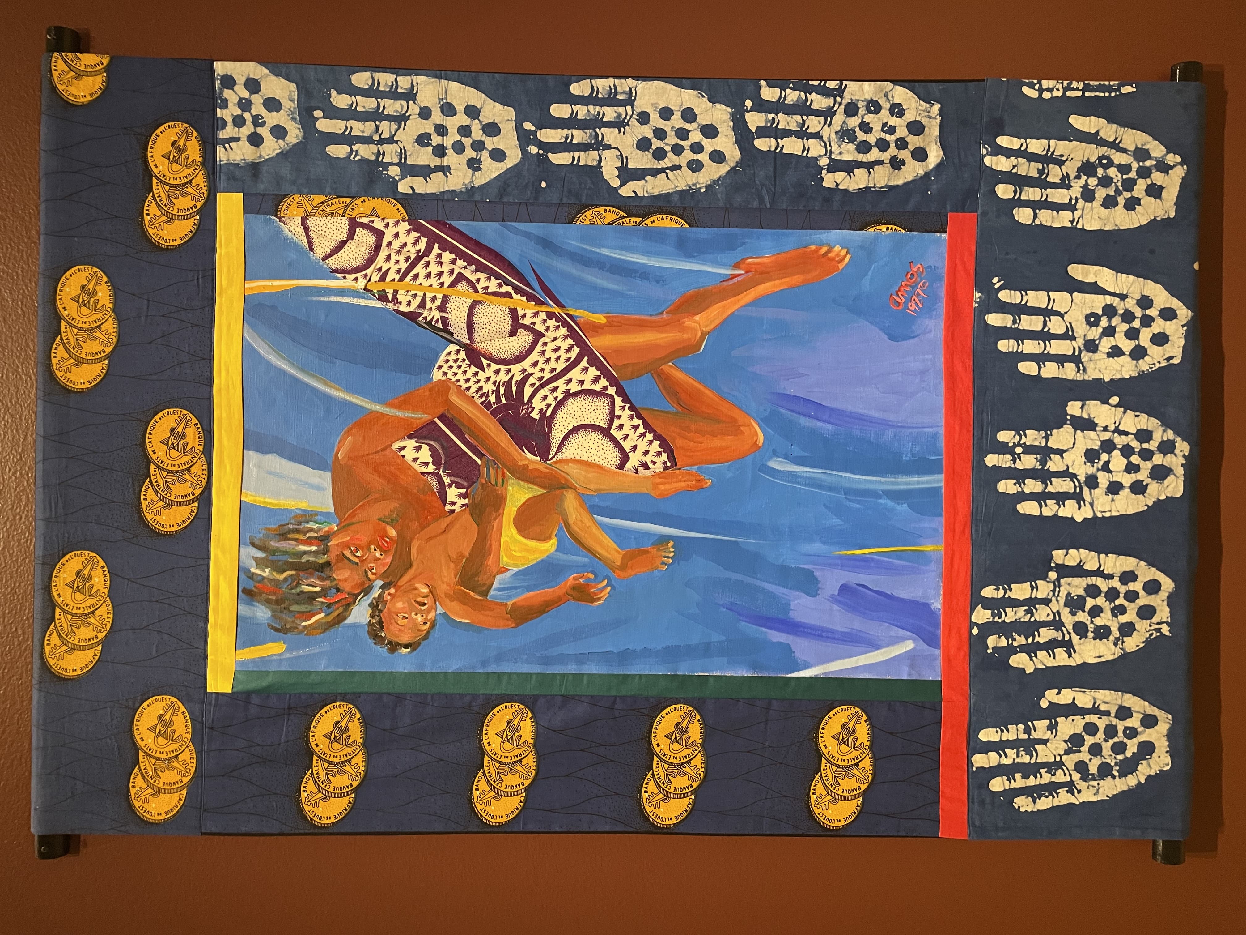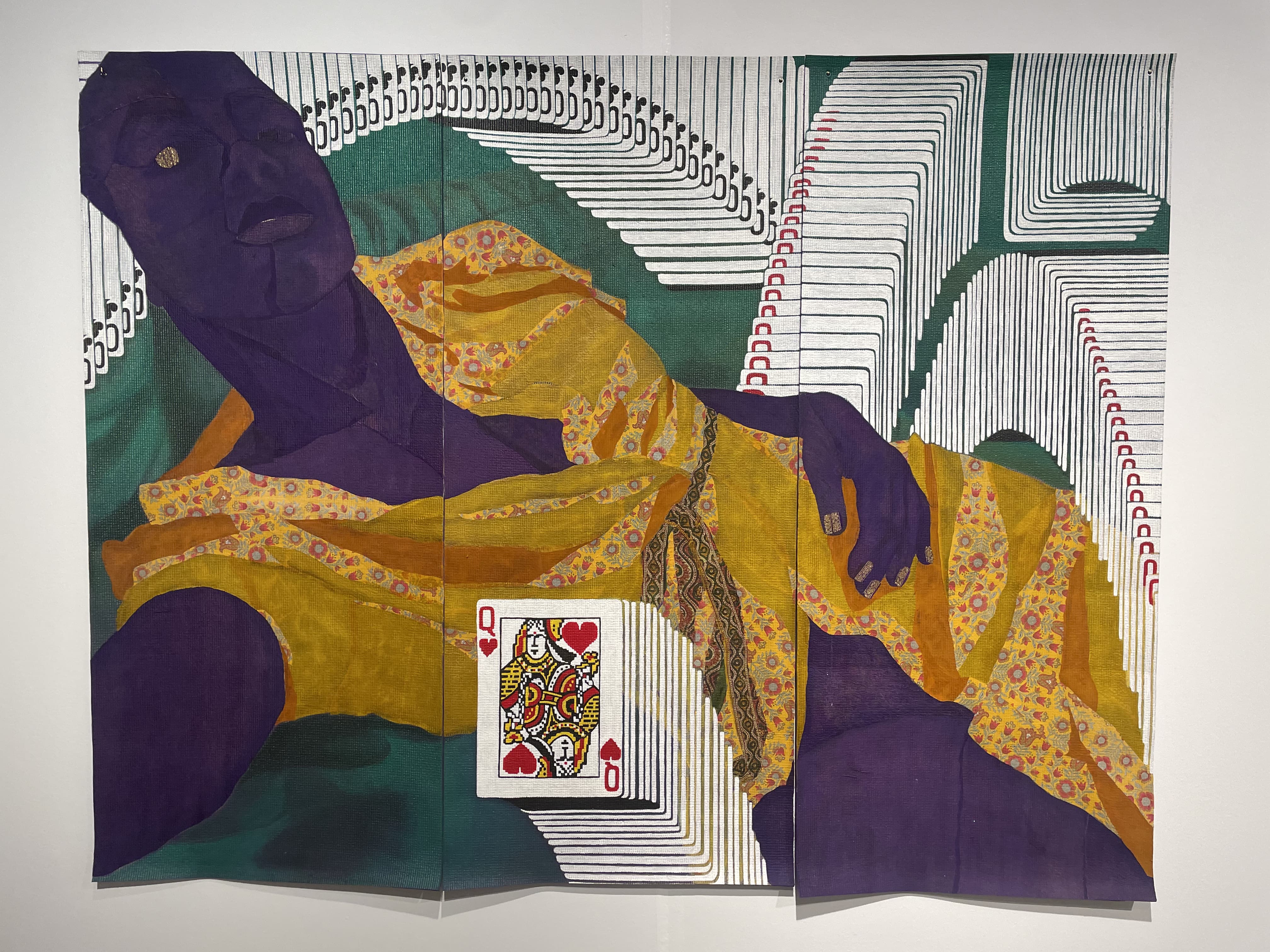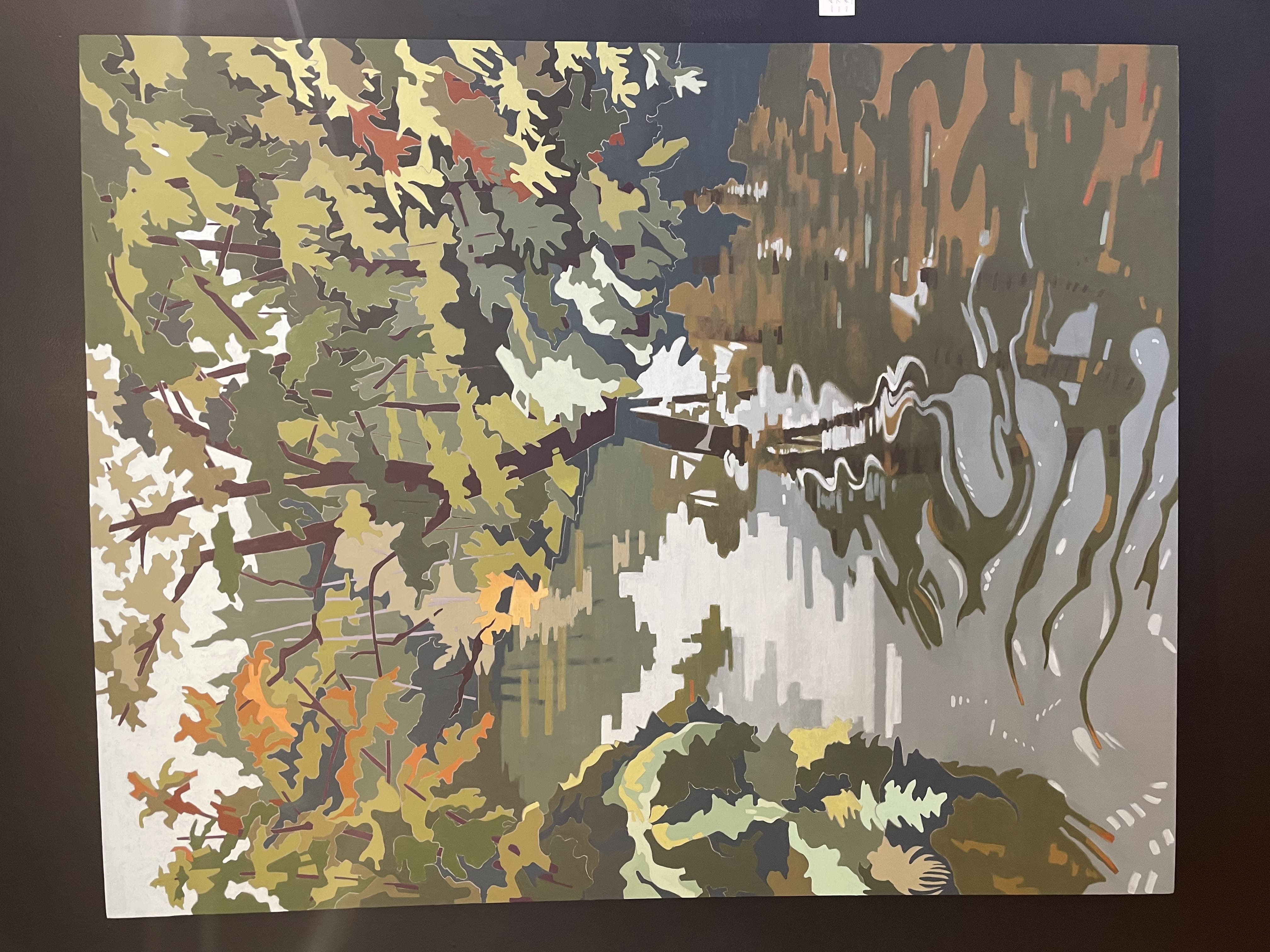 Textile Art Depicting a Dark Boat Hull Reflected in Rippling Water