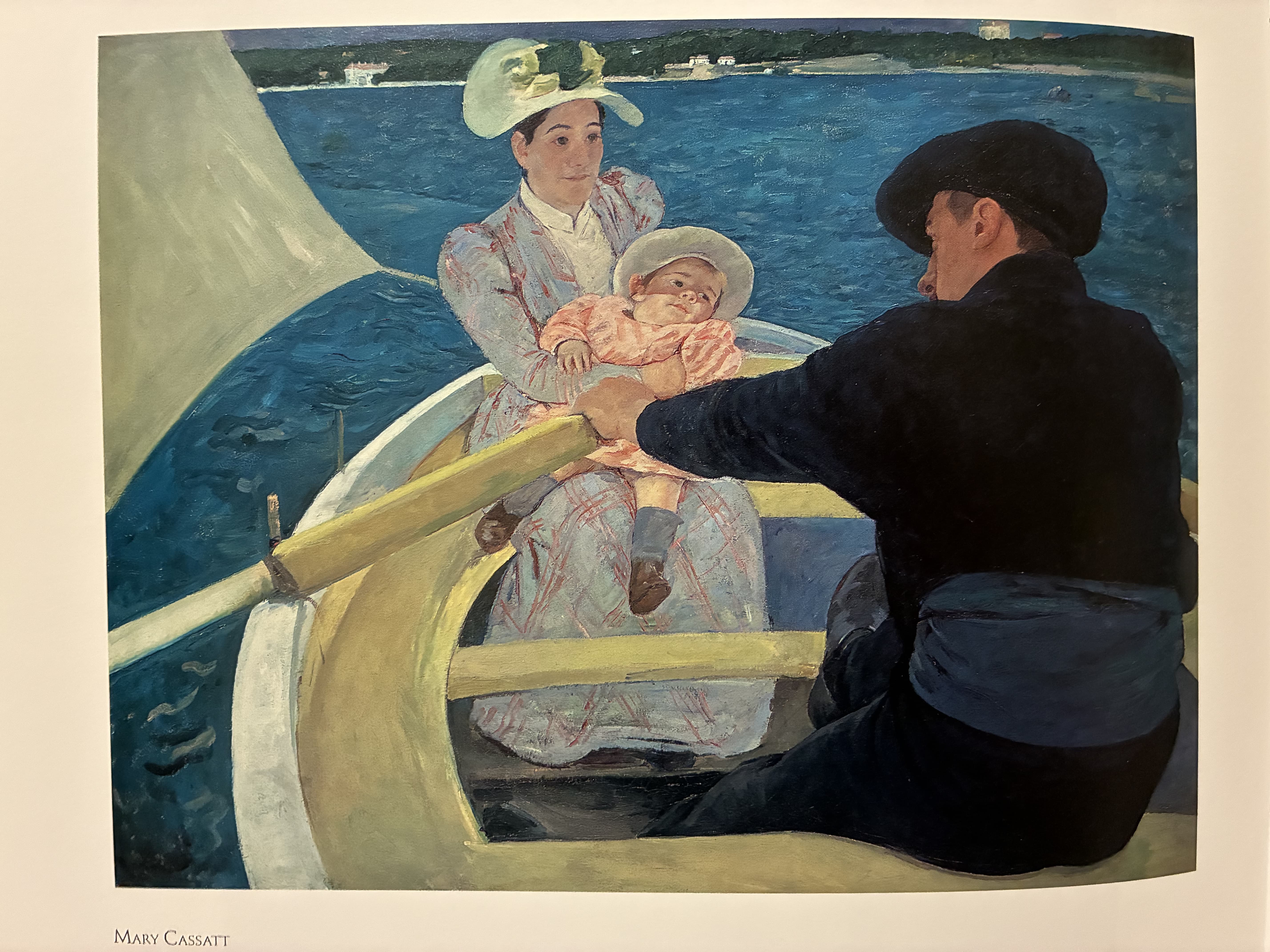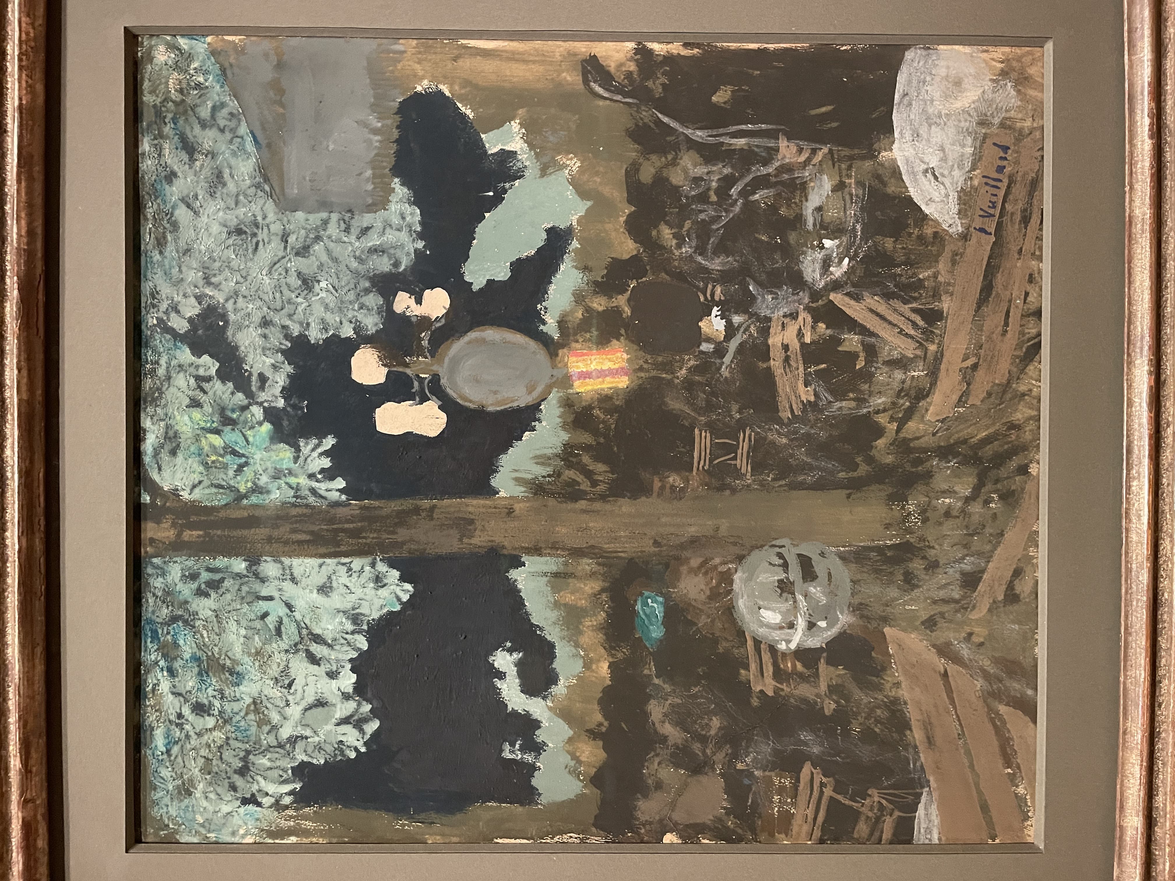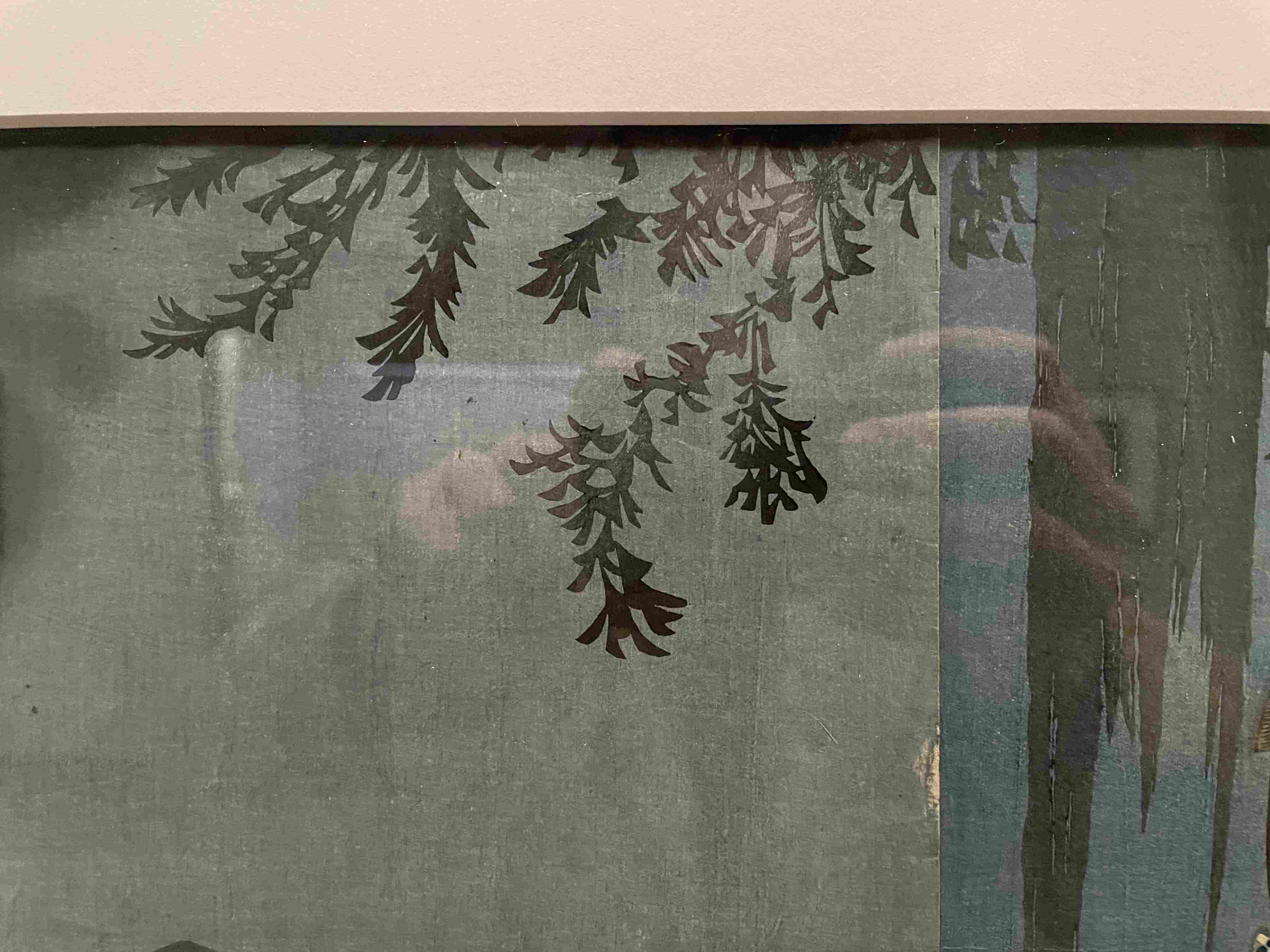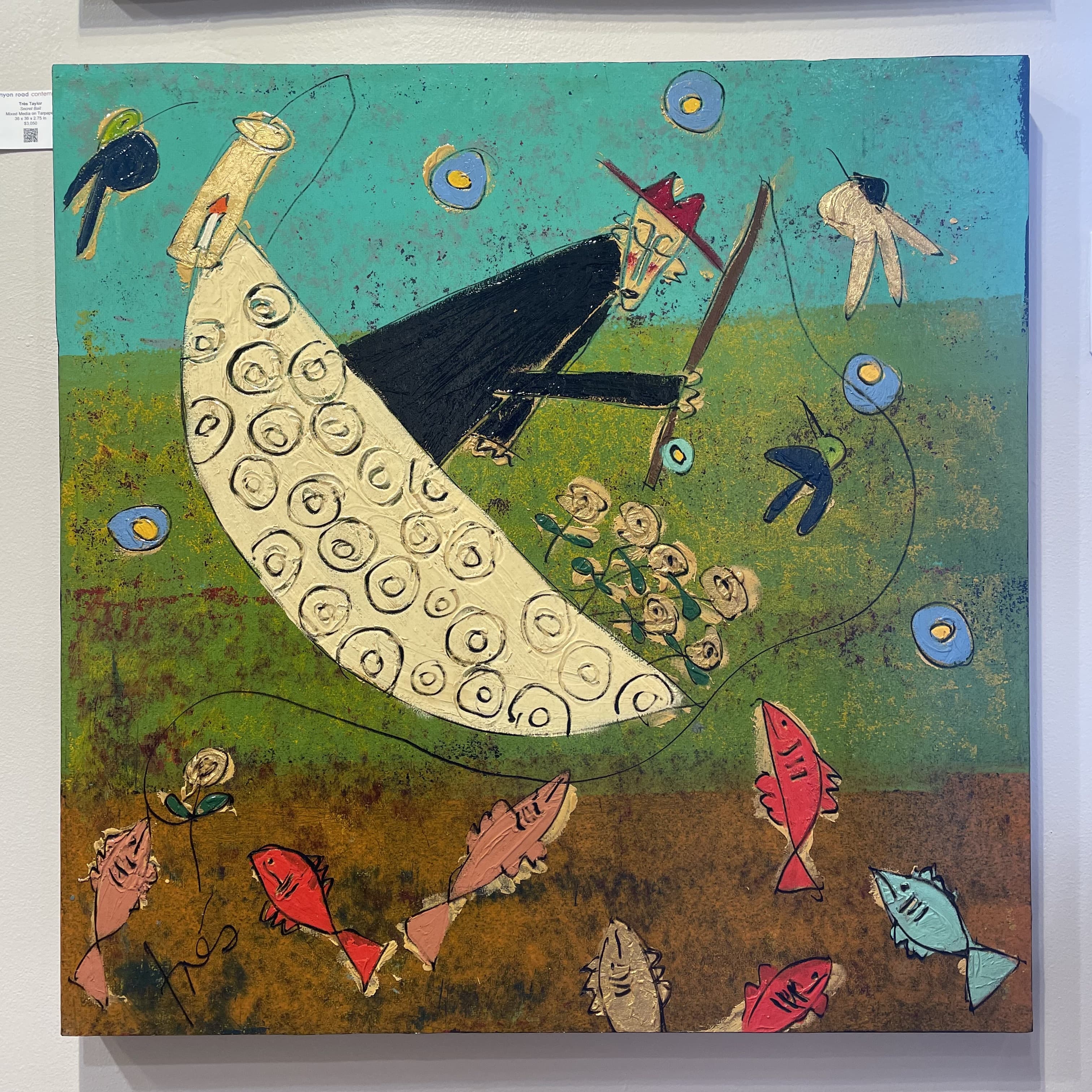 Textile Art Depicting a Dark Boat Hull Reflected in Rippling Water