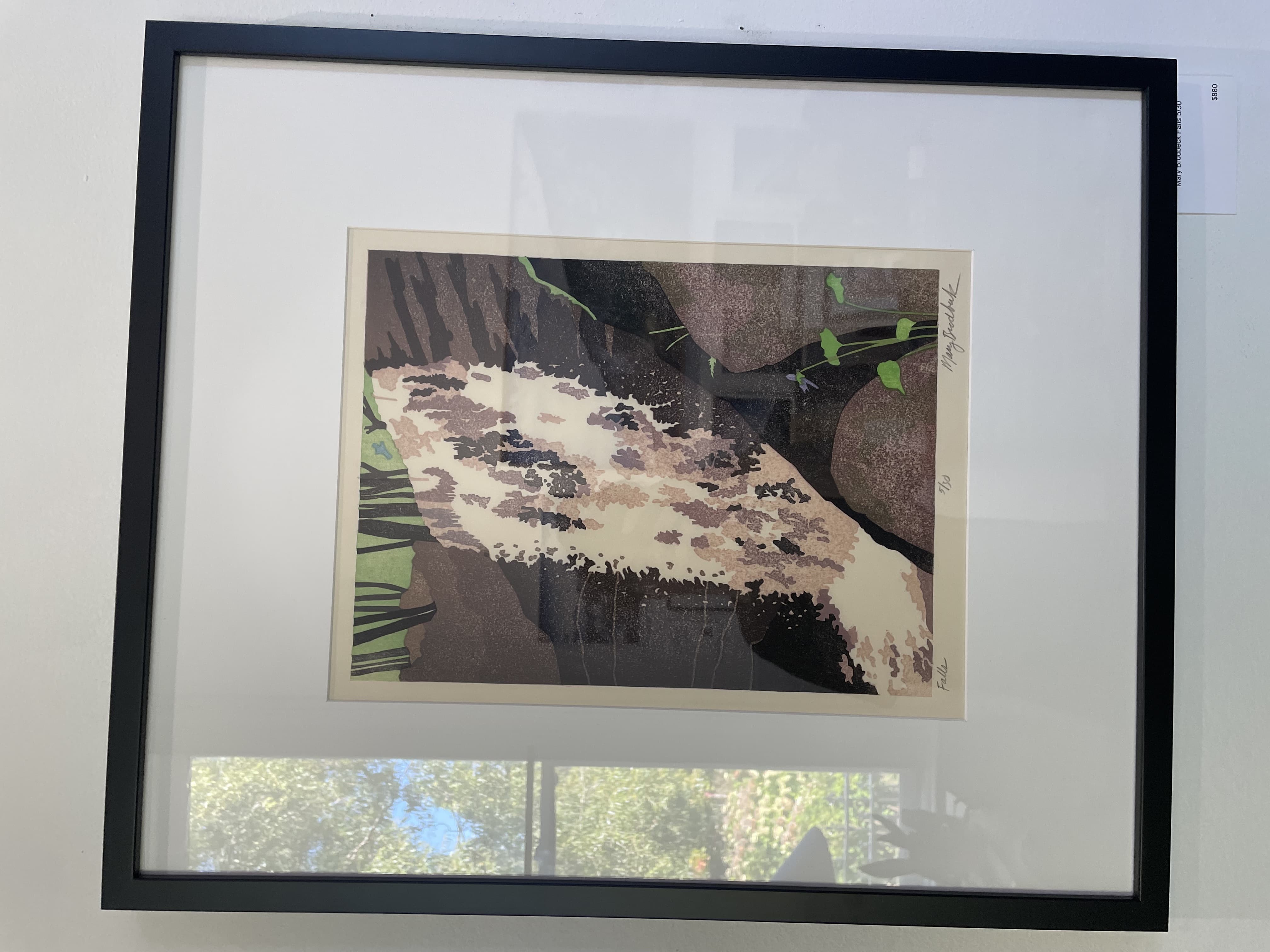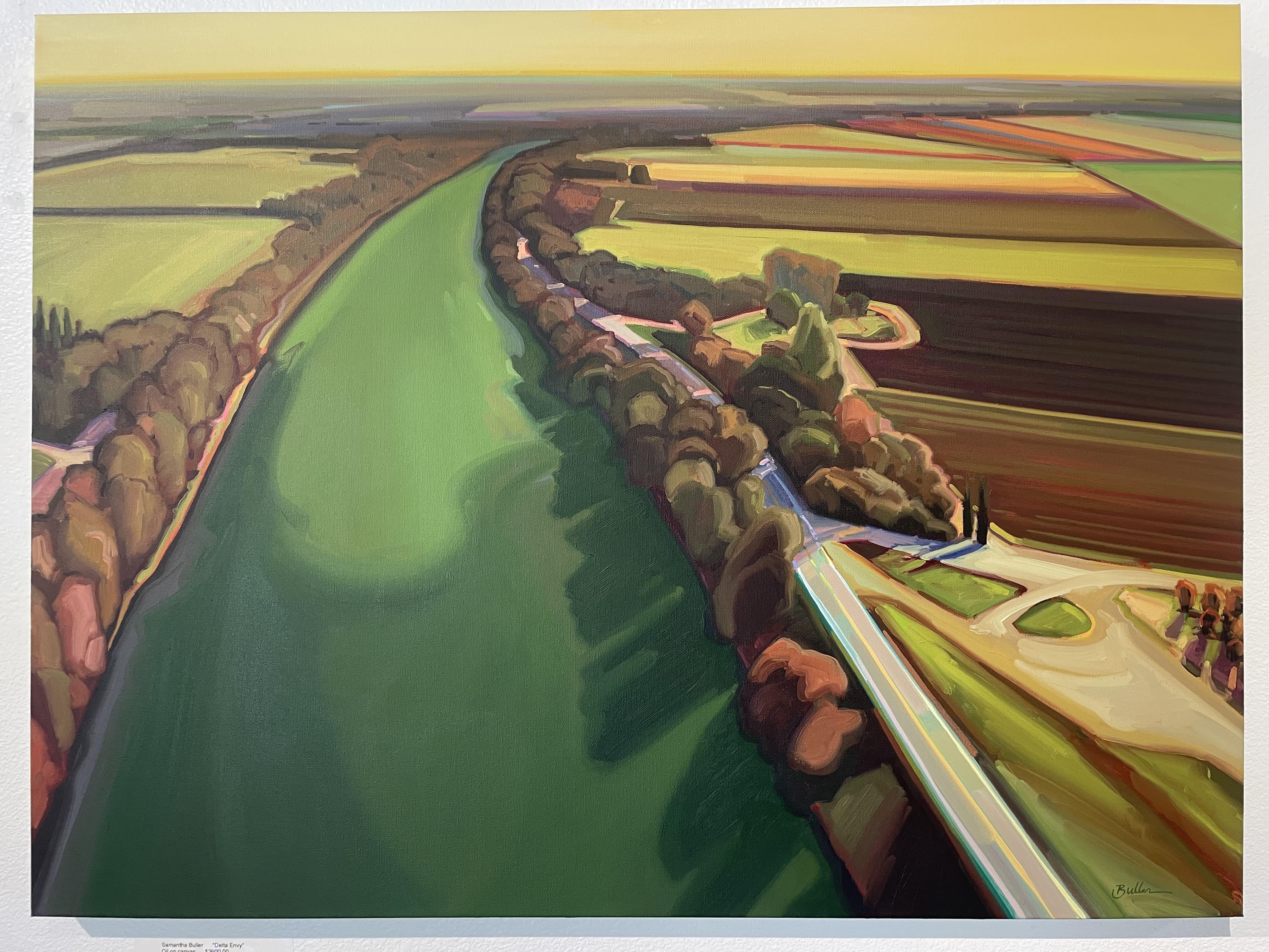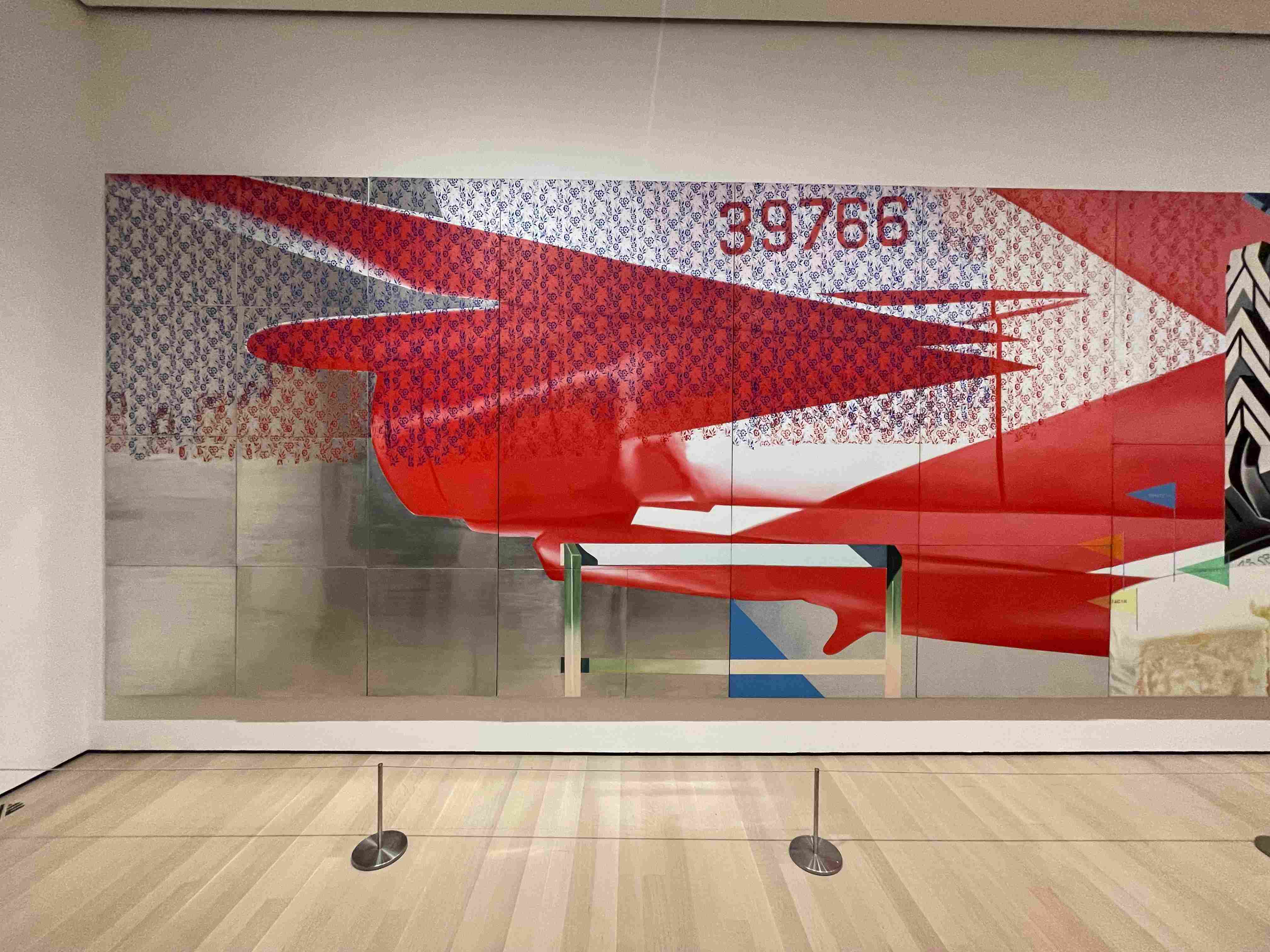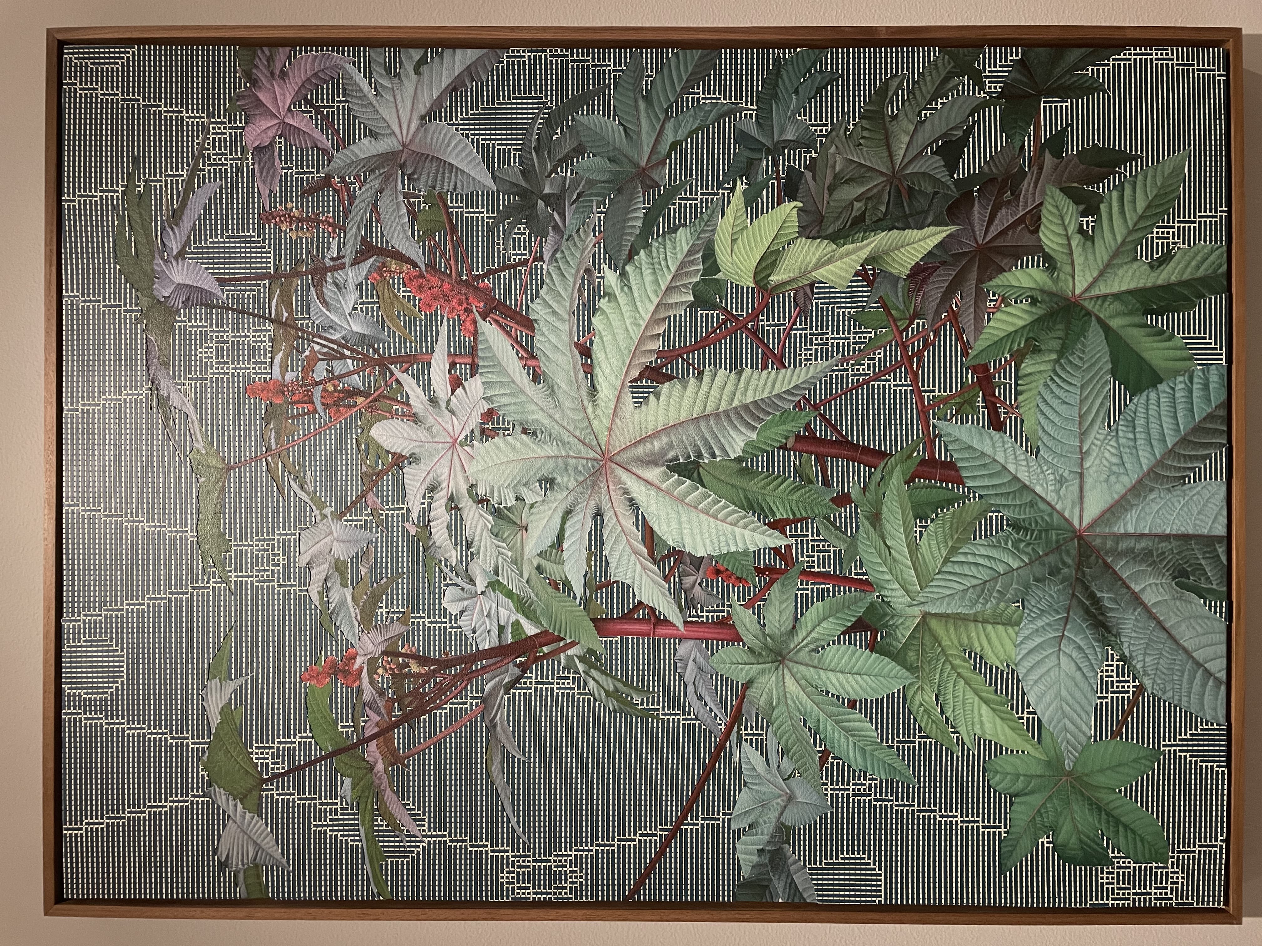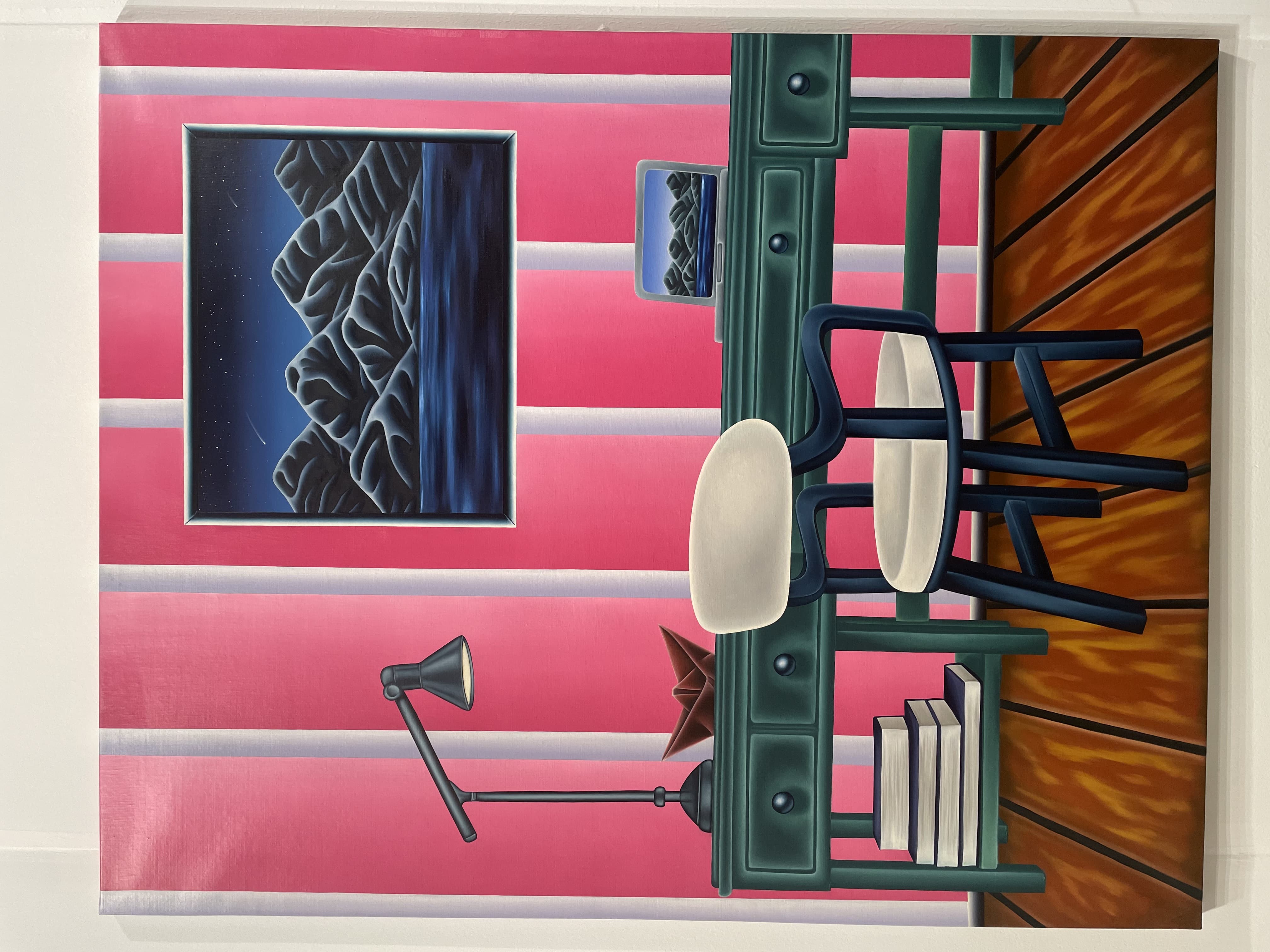 Textile Art Depicting a Dark Boat Hull Reflected in Rippling Water