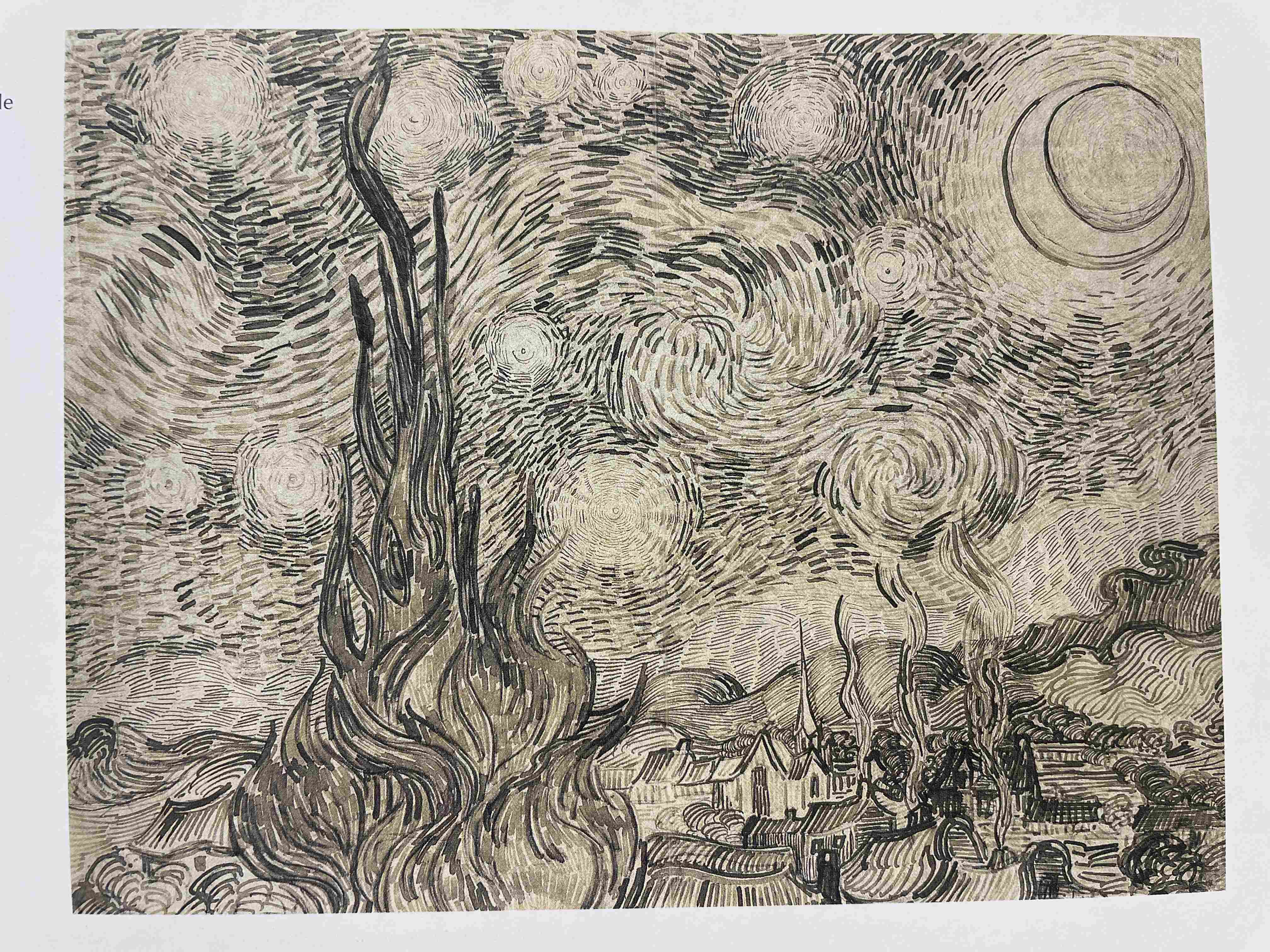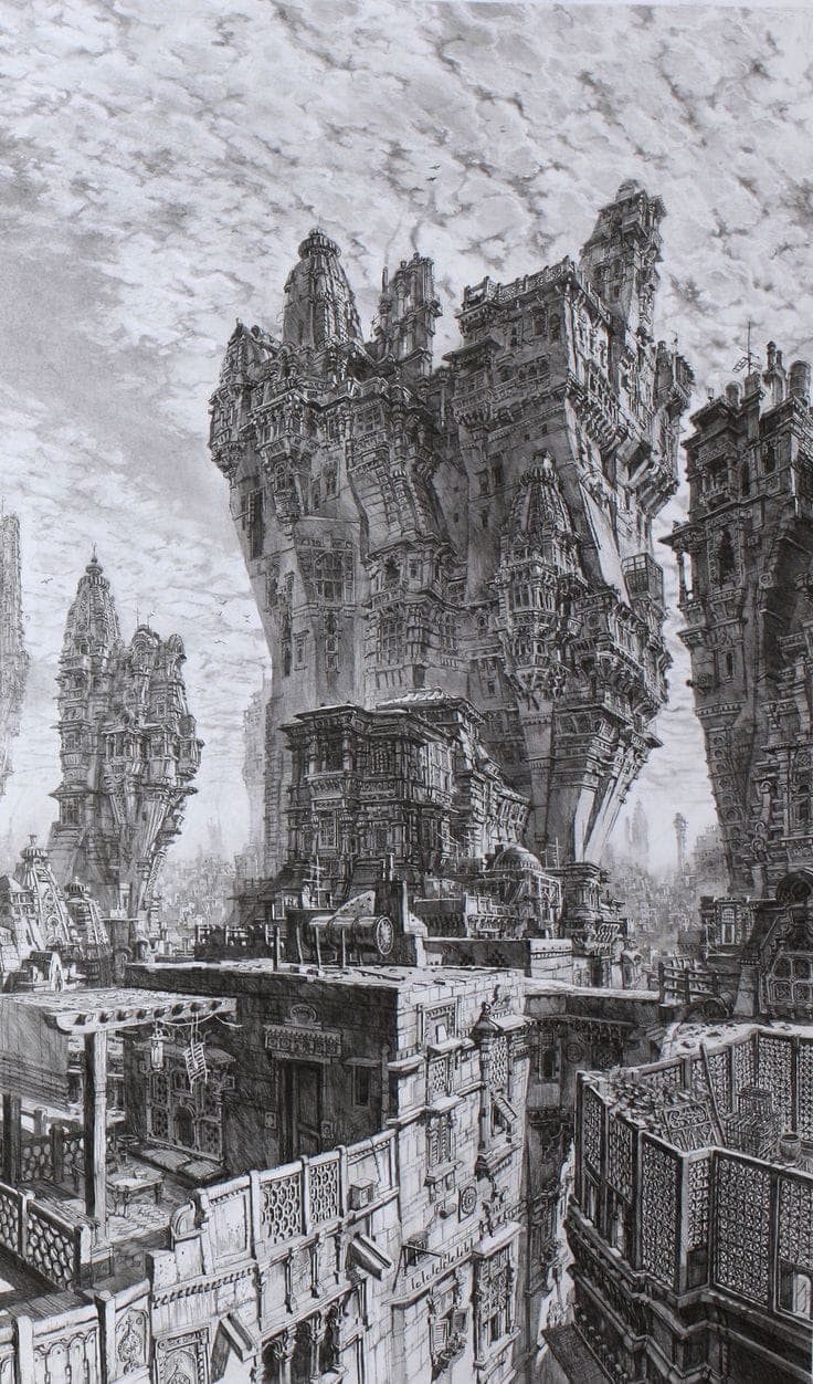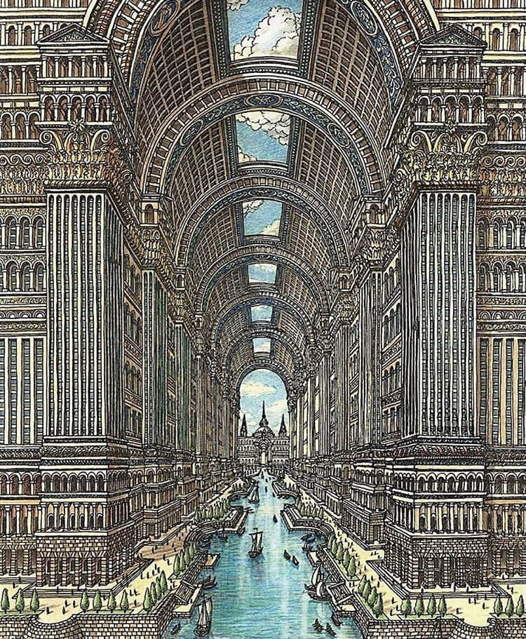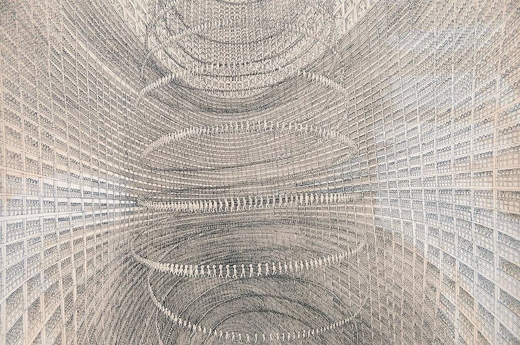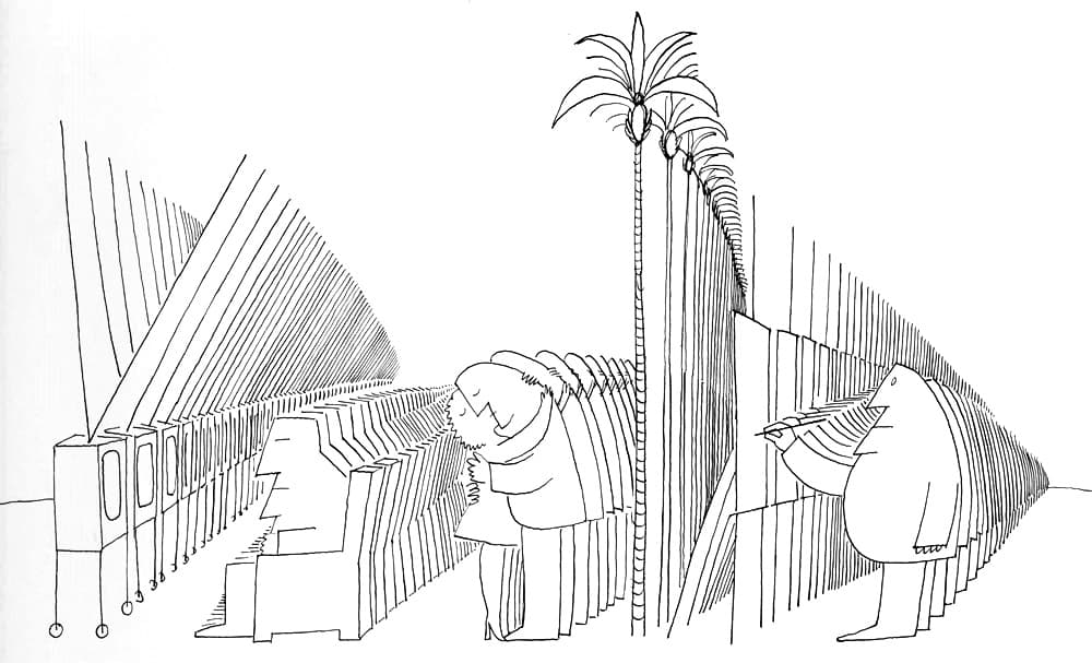 Grid of thirty black ink line drawings depicting various architectural and landscape scenes