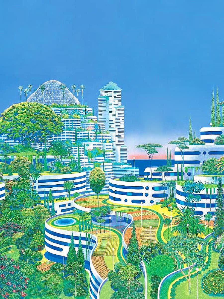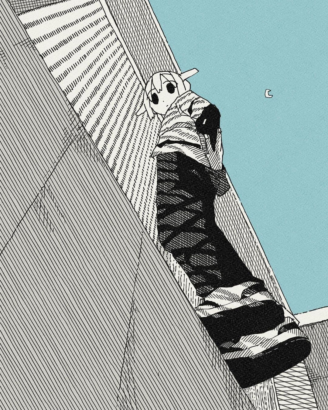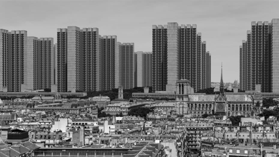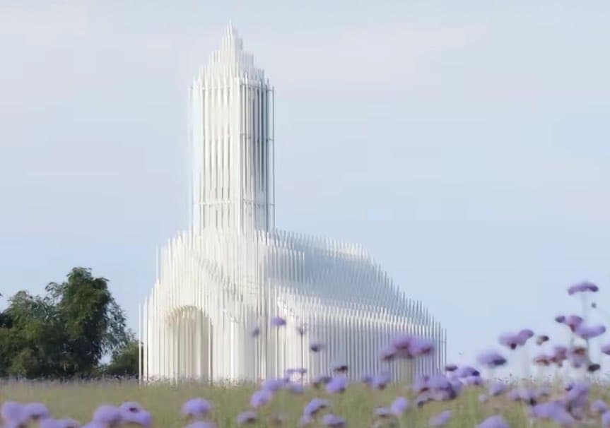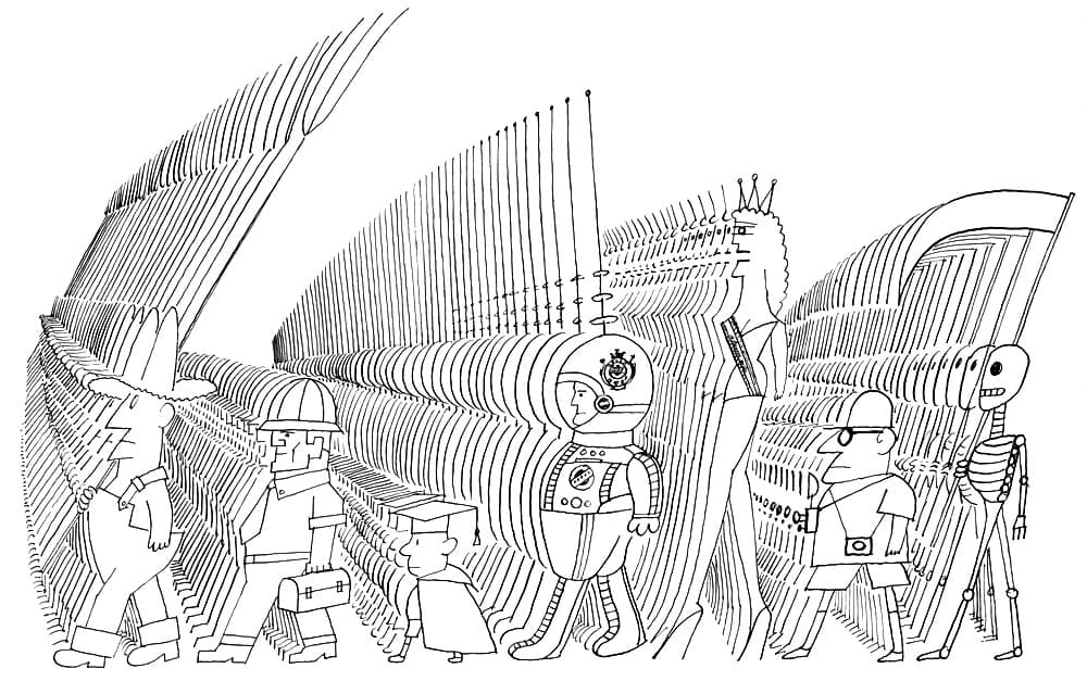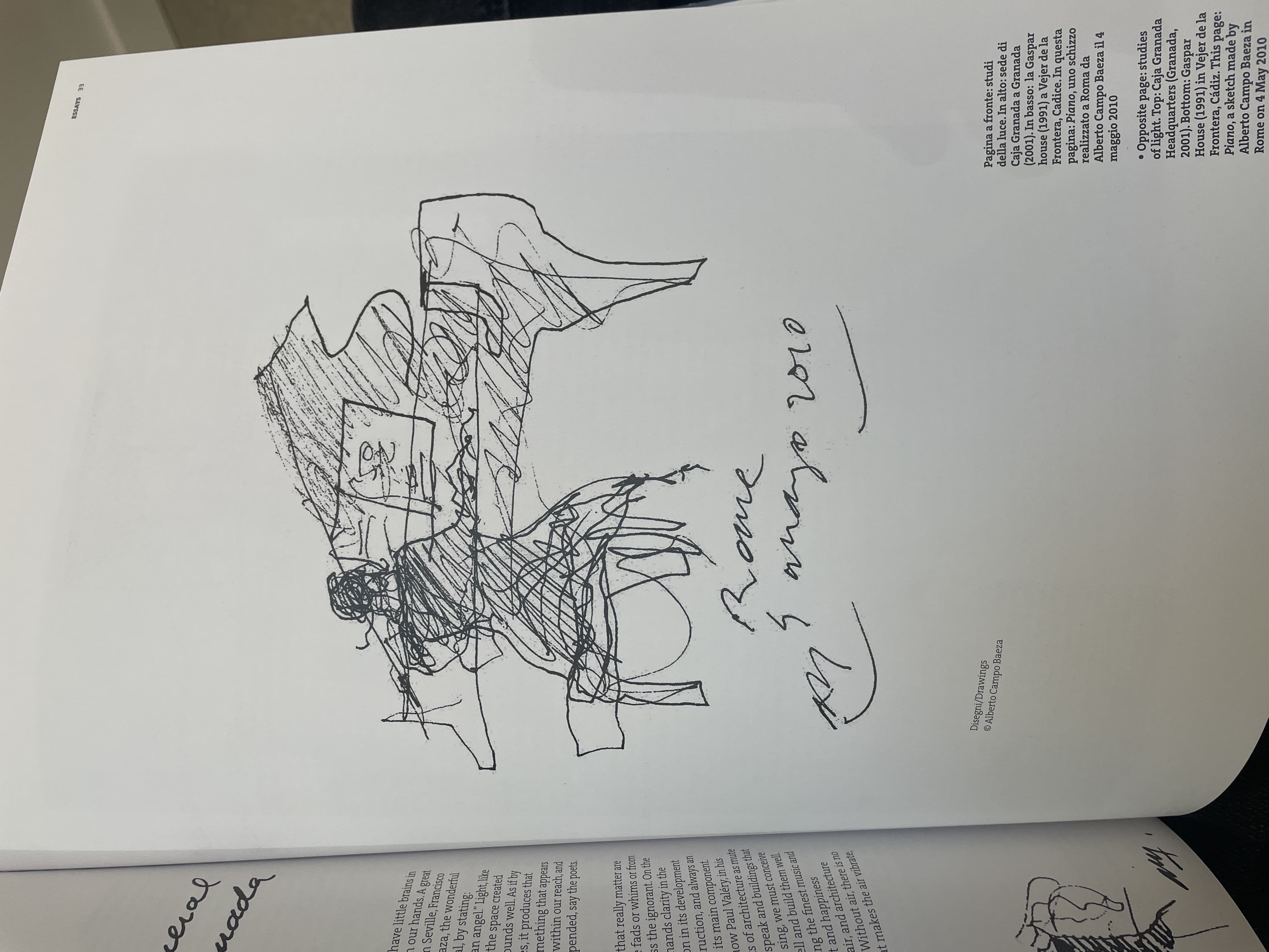 Grid of thirty black ink line drawings depicting various architectural and landscape scenes