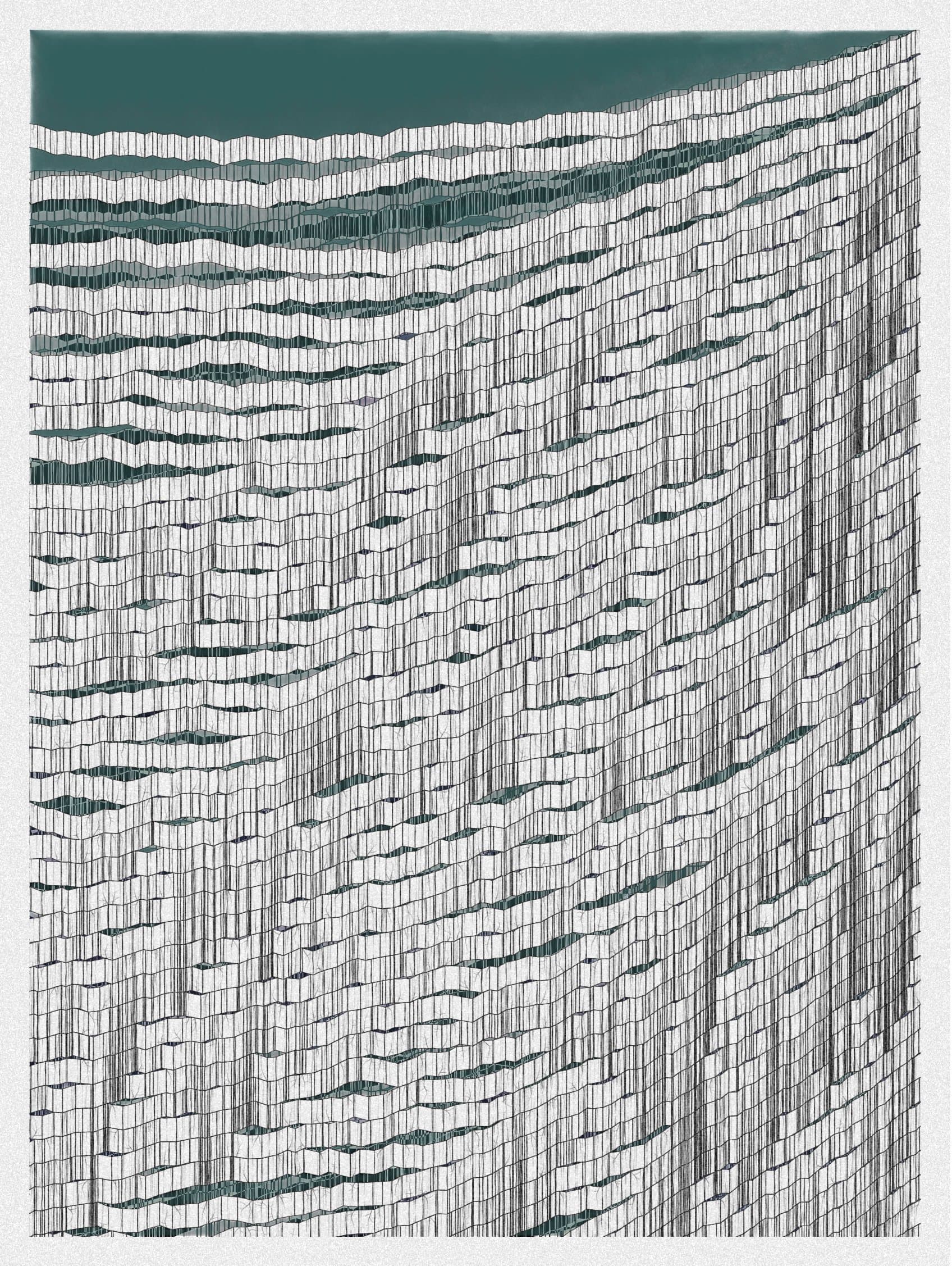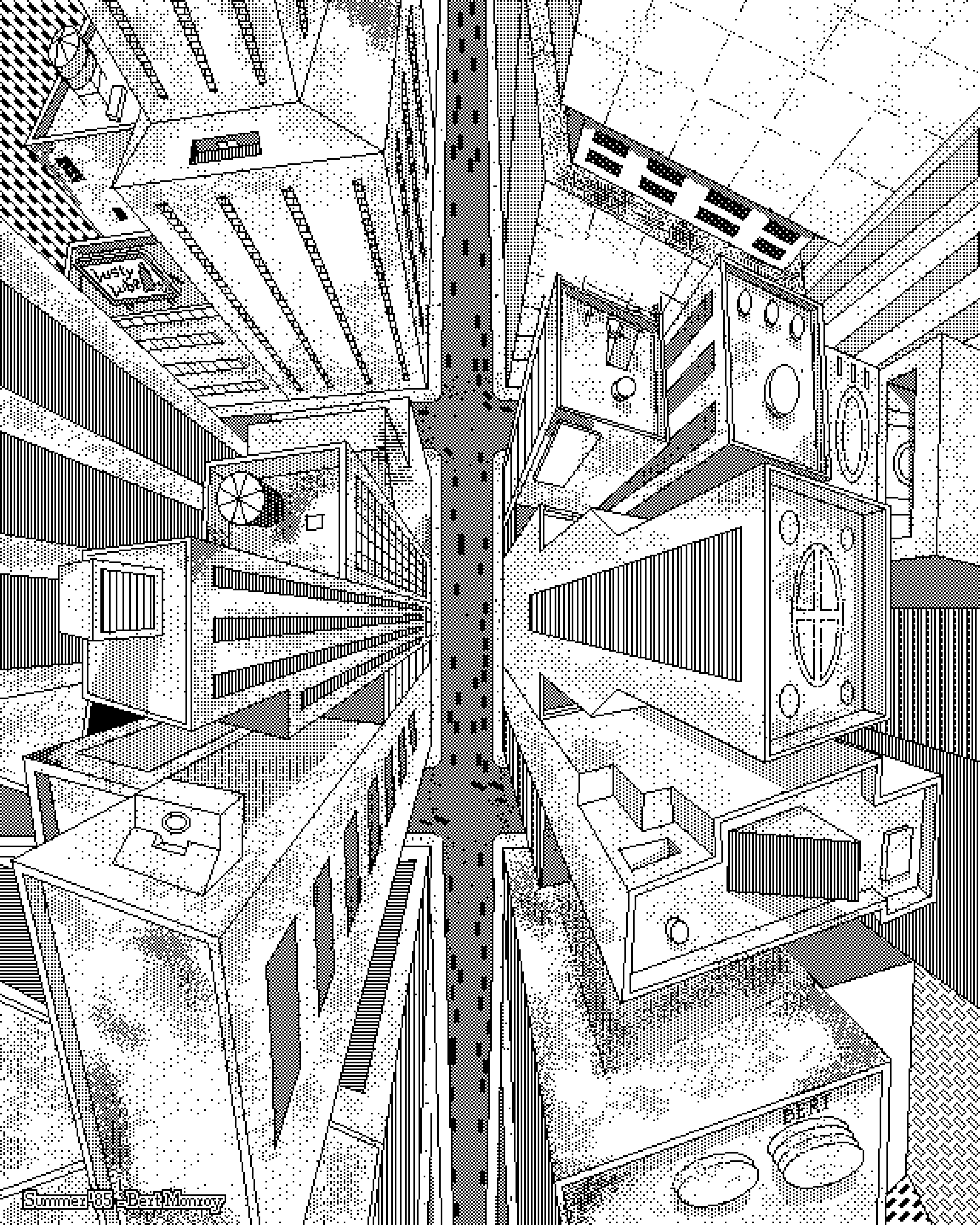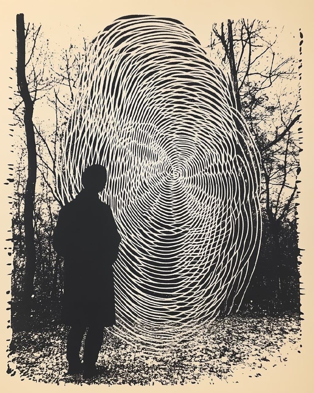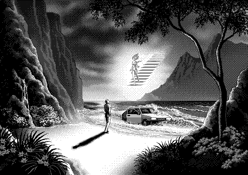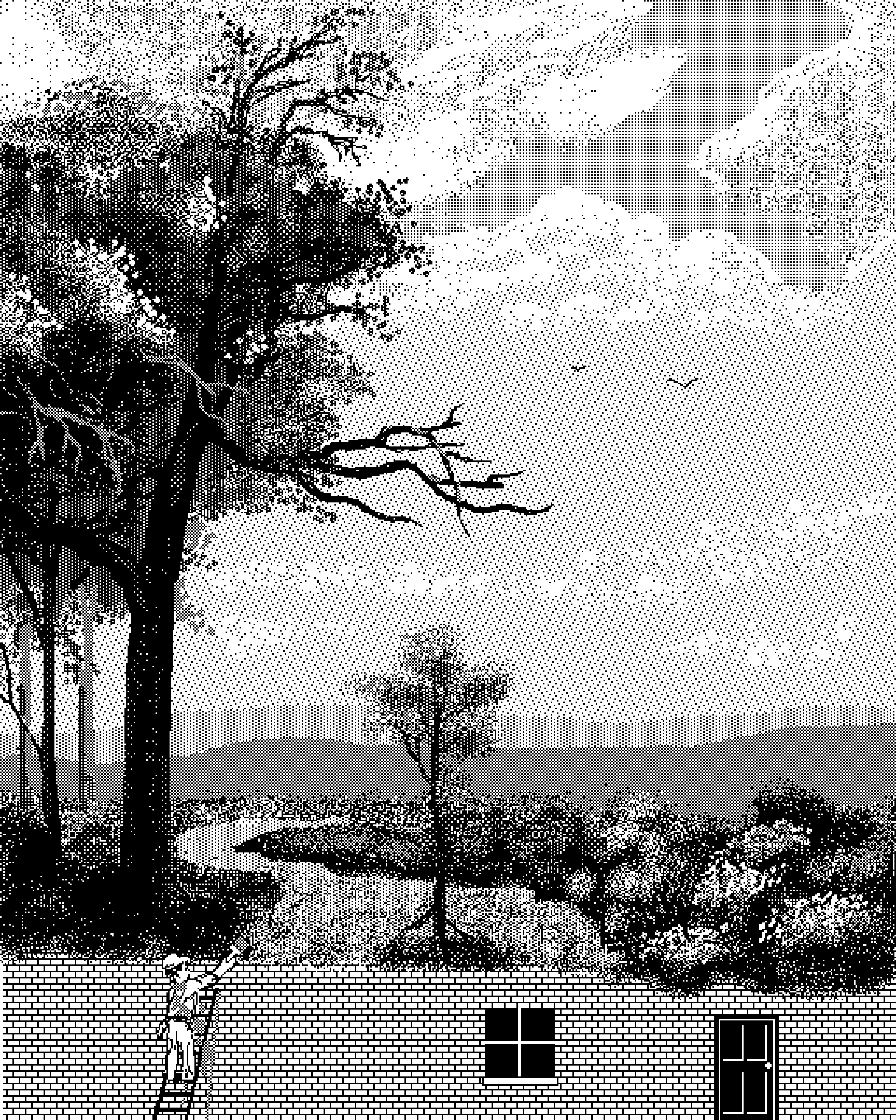 Halftone Grayscale Image of a Landscape with Dense Foliage and a Vertical Structure