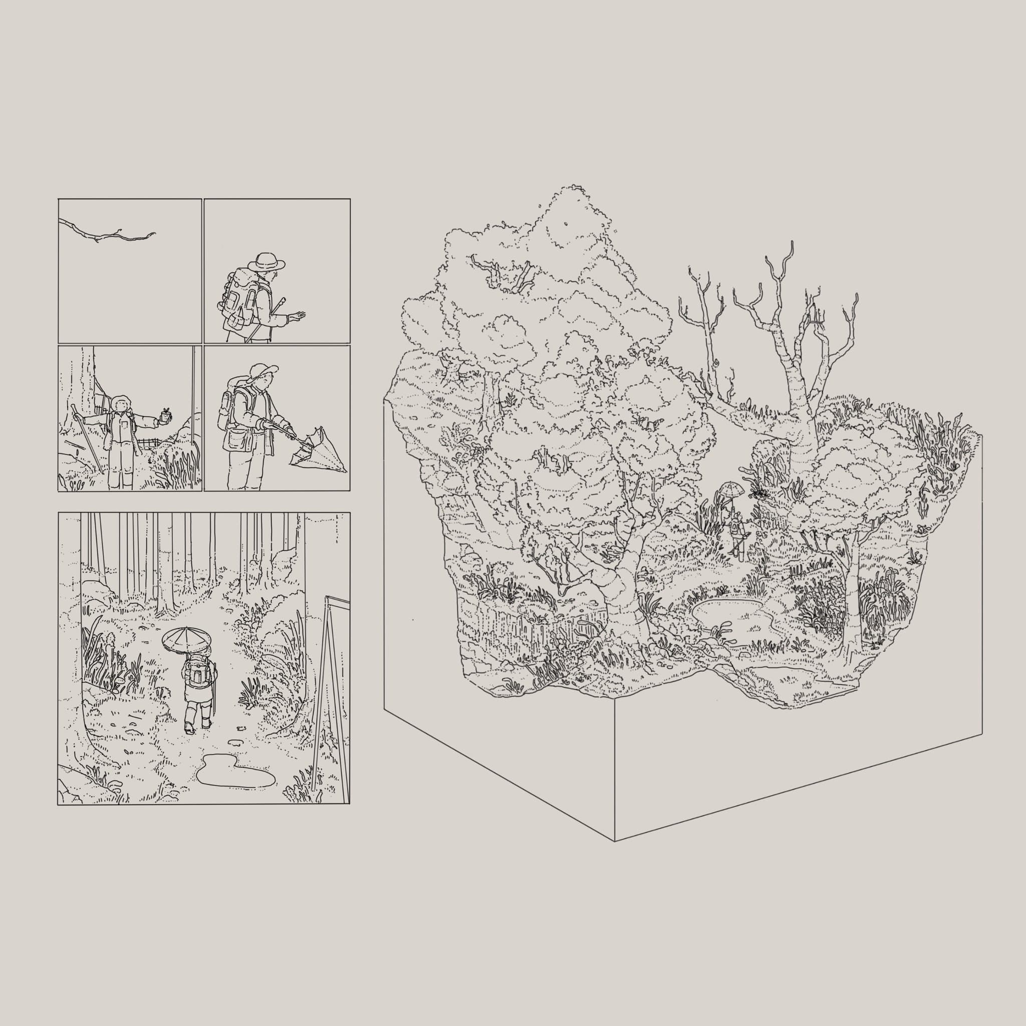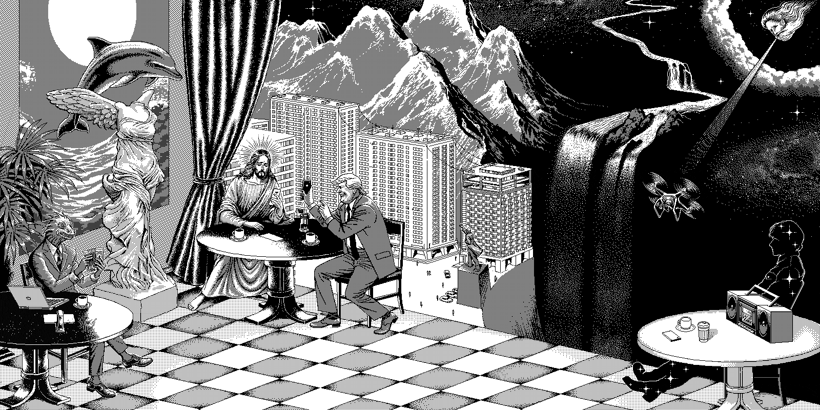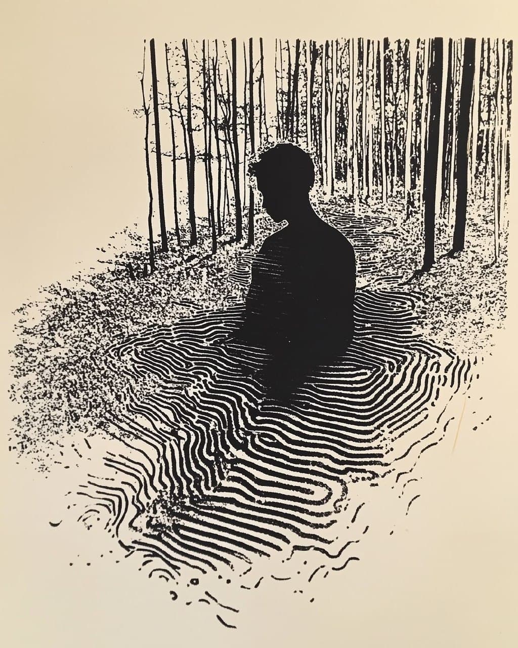 Halftone Grayscale Image of a Landscape with Dense Foliage and a Vertical Structure