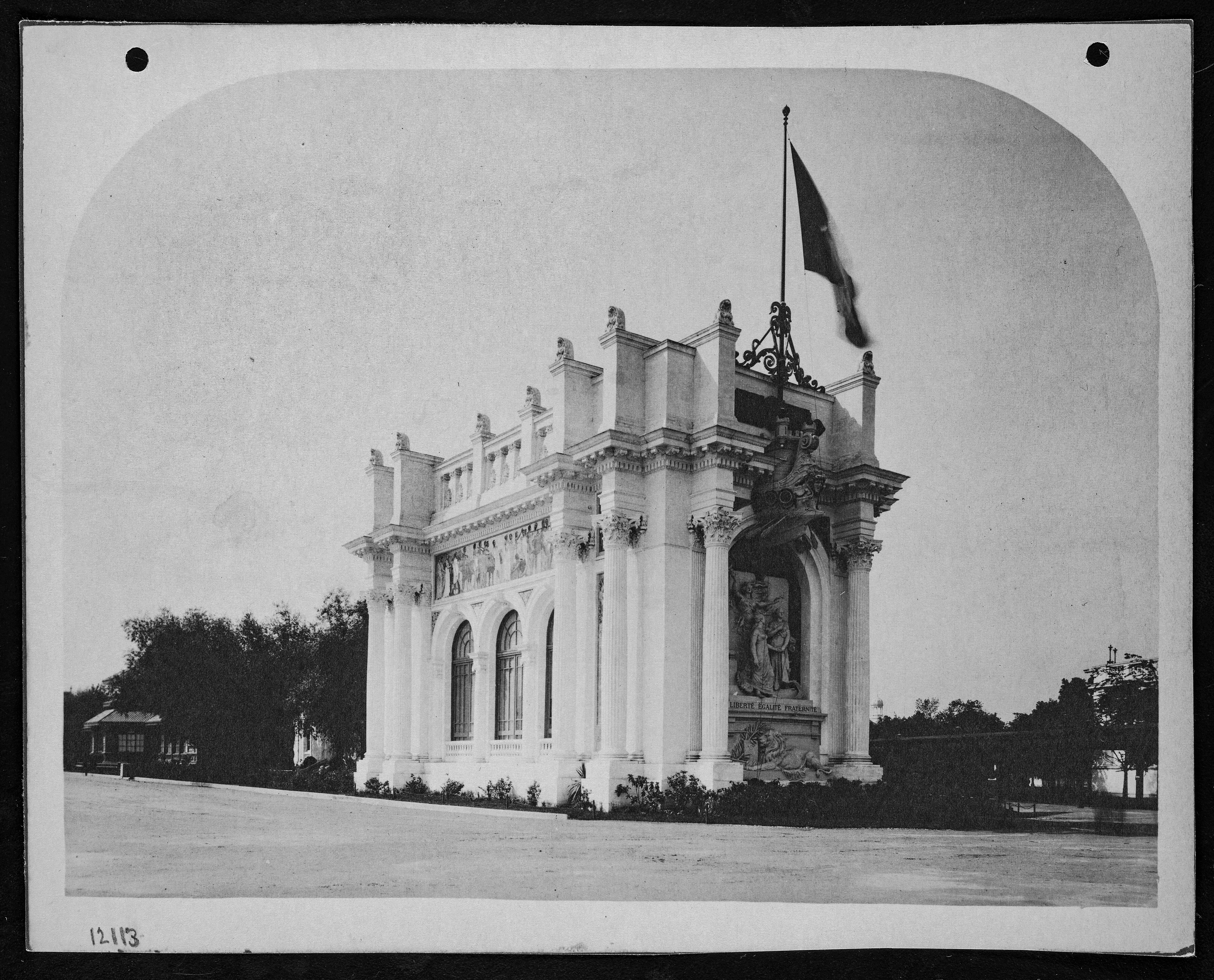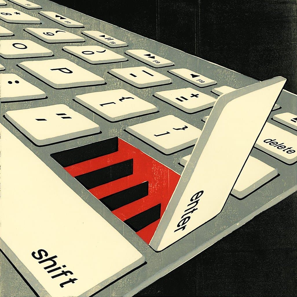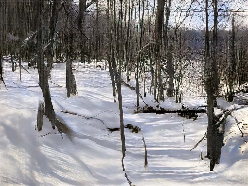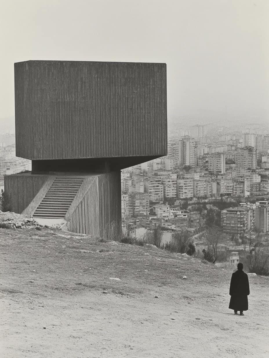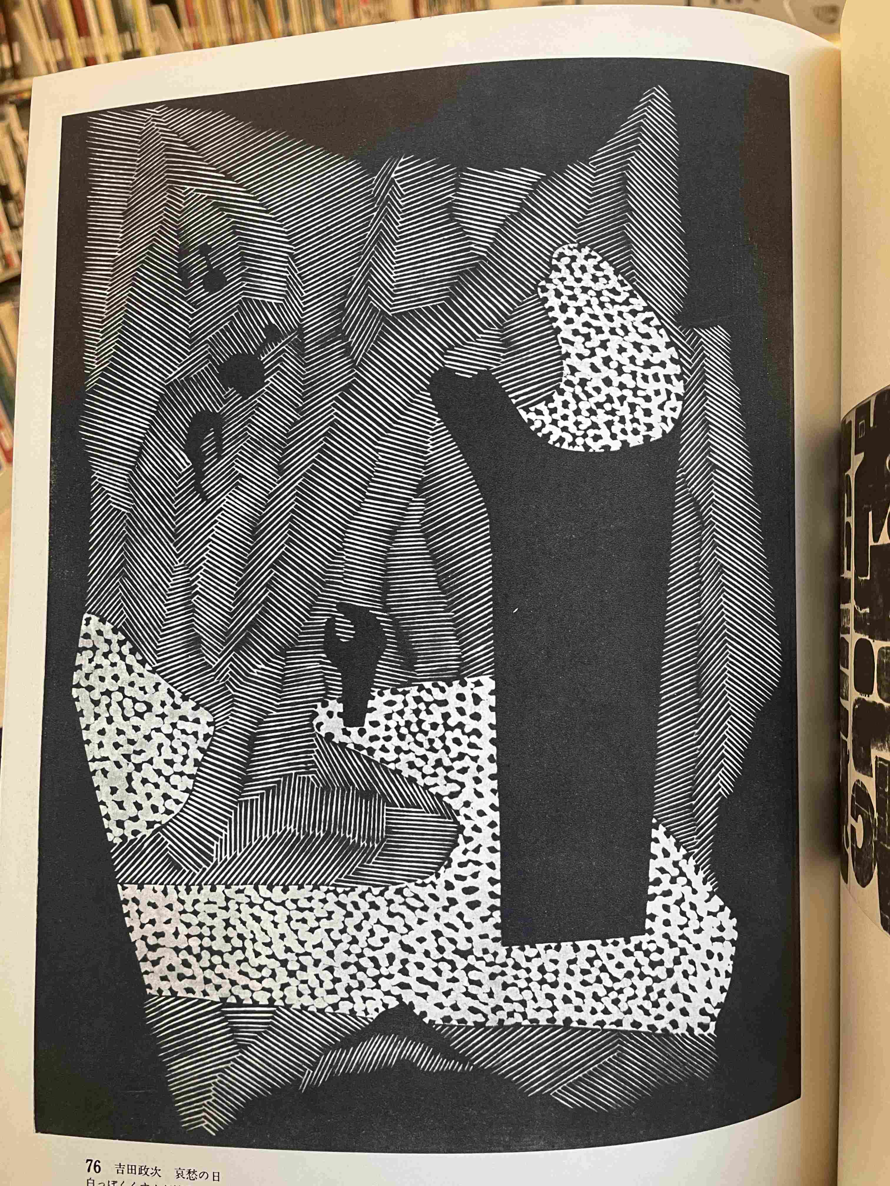 Halftone Grayscale Image of a Landscape with Dense Foliage and a Vertical Structure