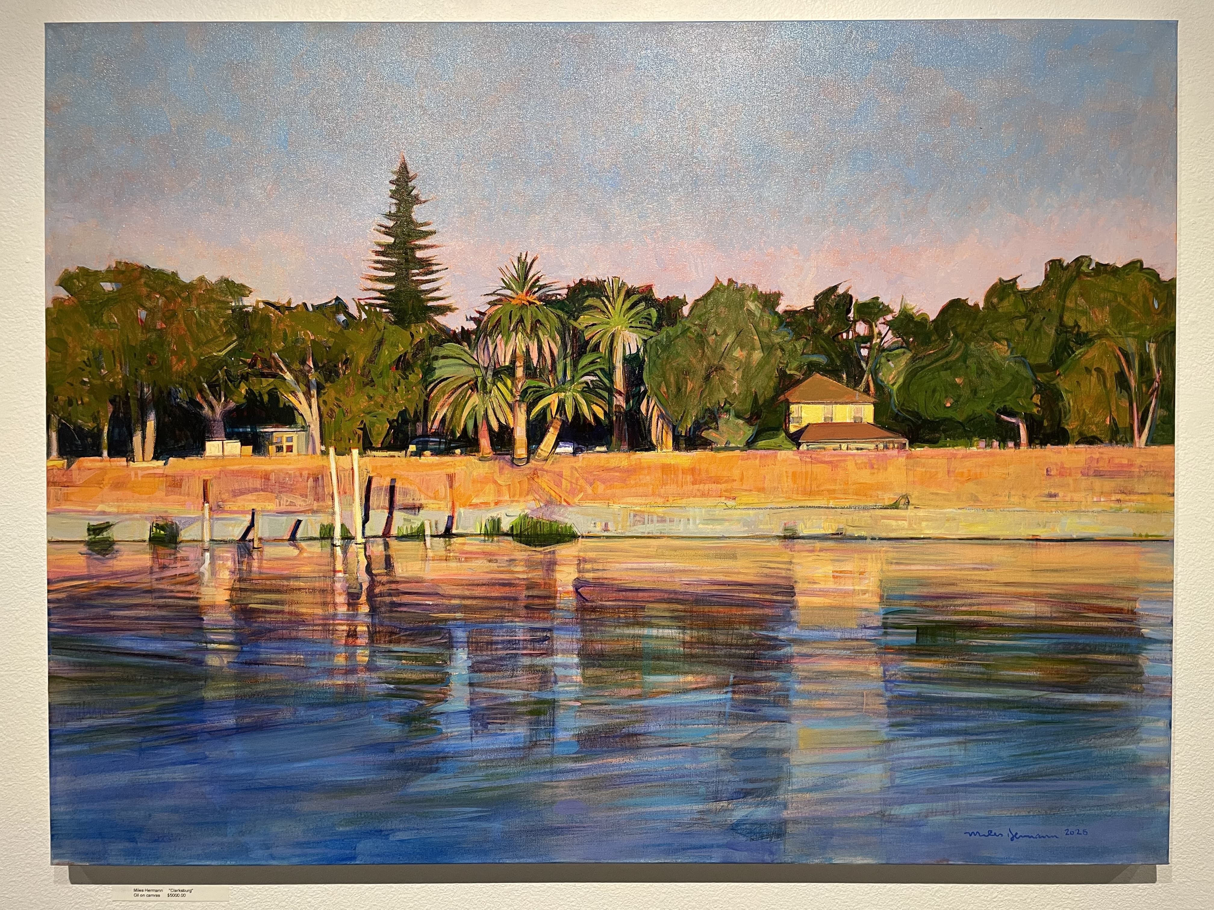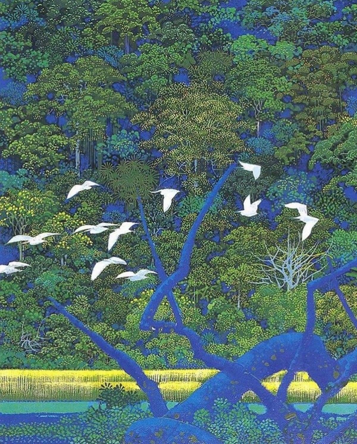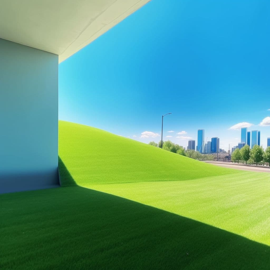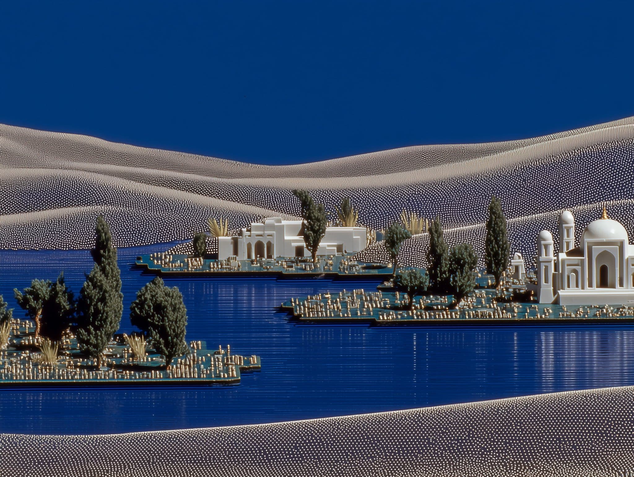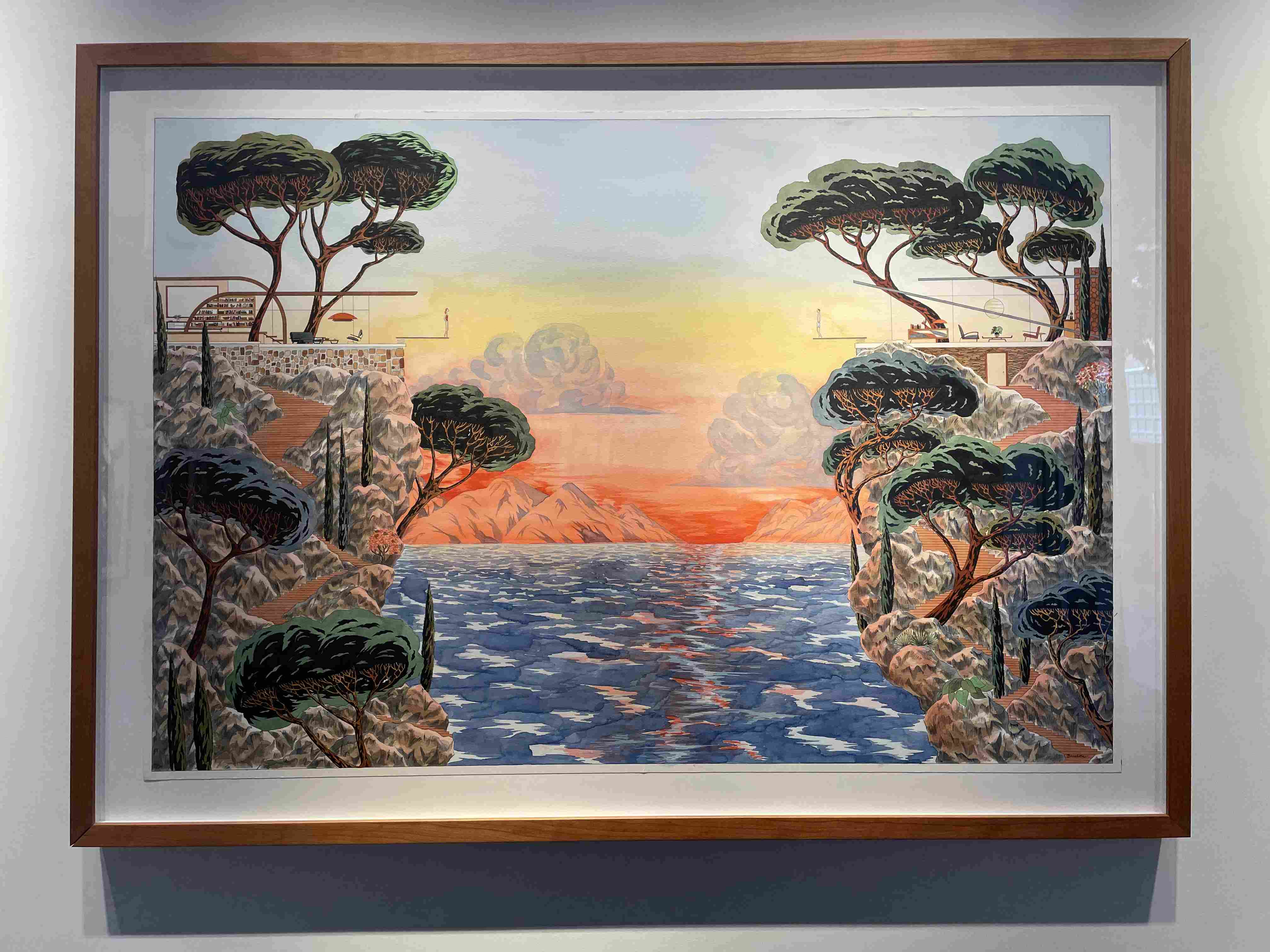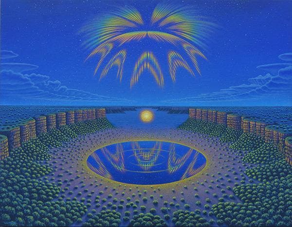 Graphic Illustration of a Long Reflecting Pool with Trees and Gradient Sky