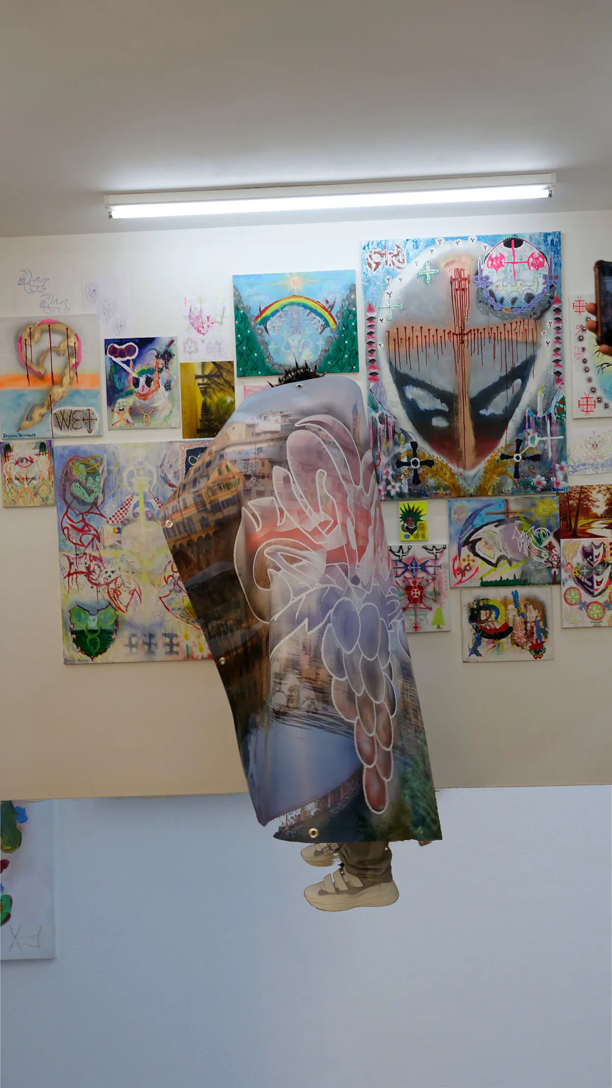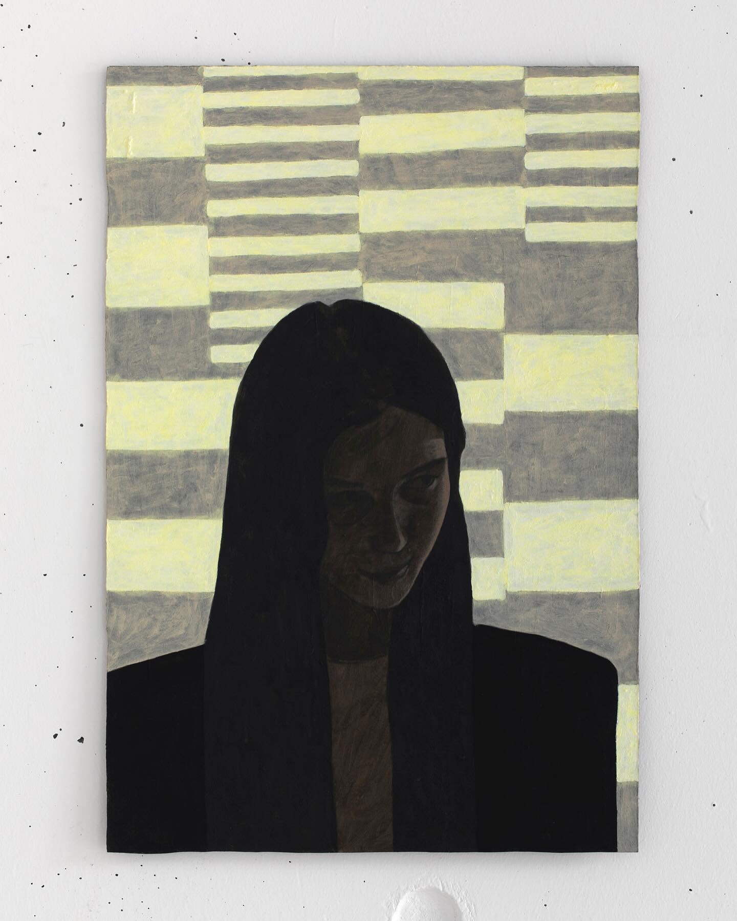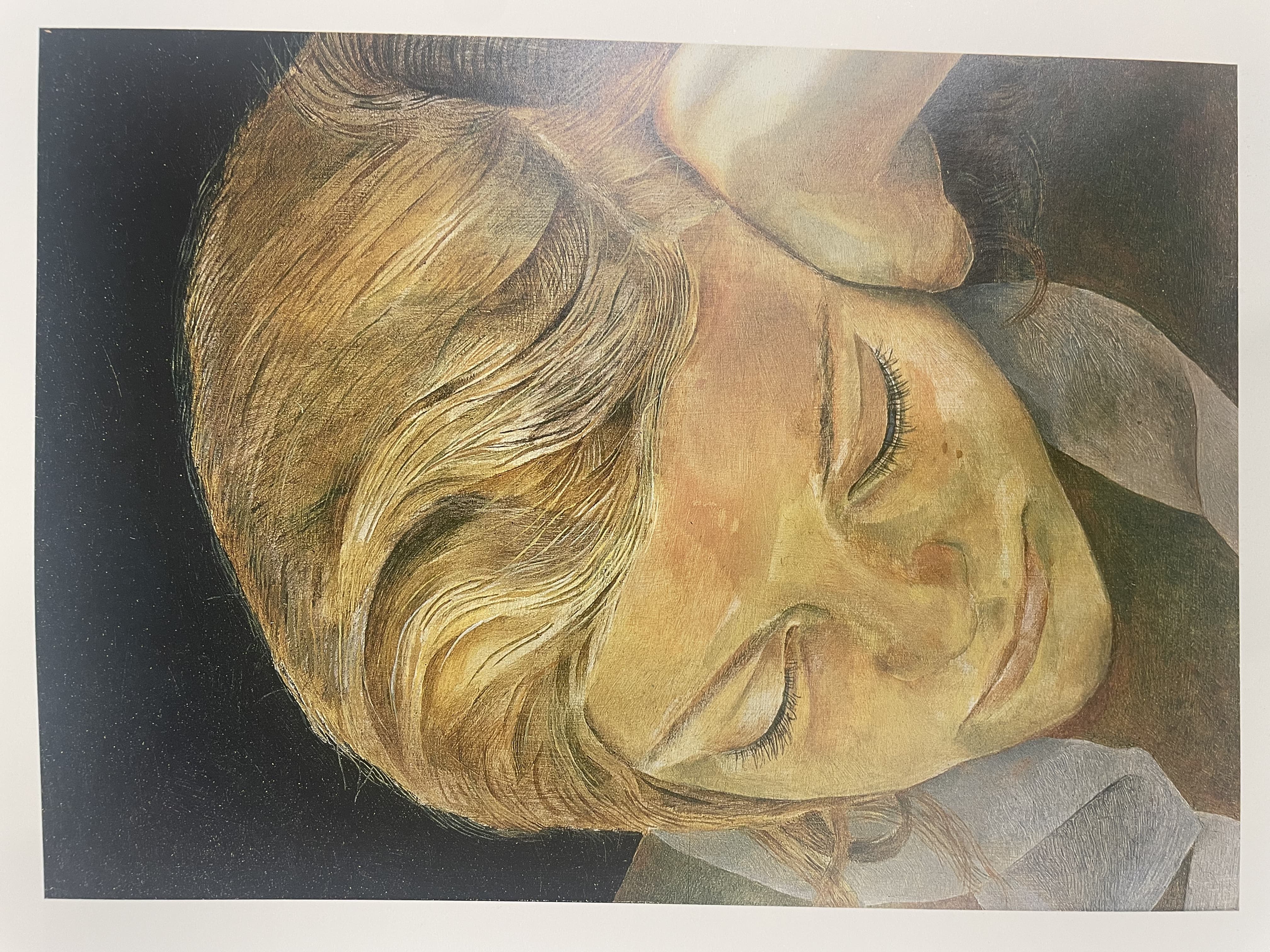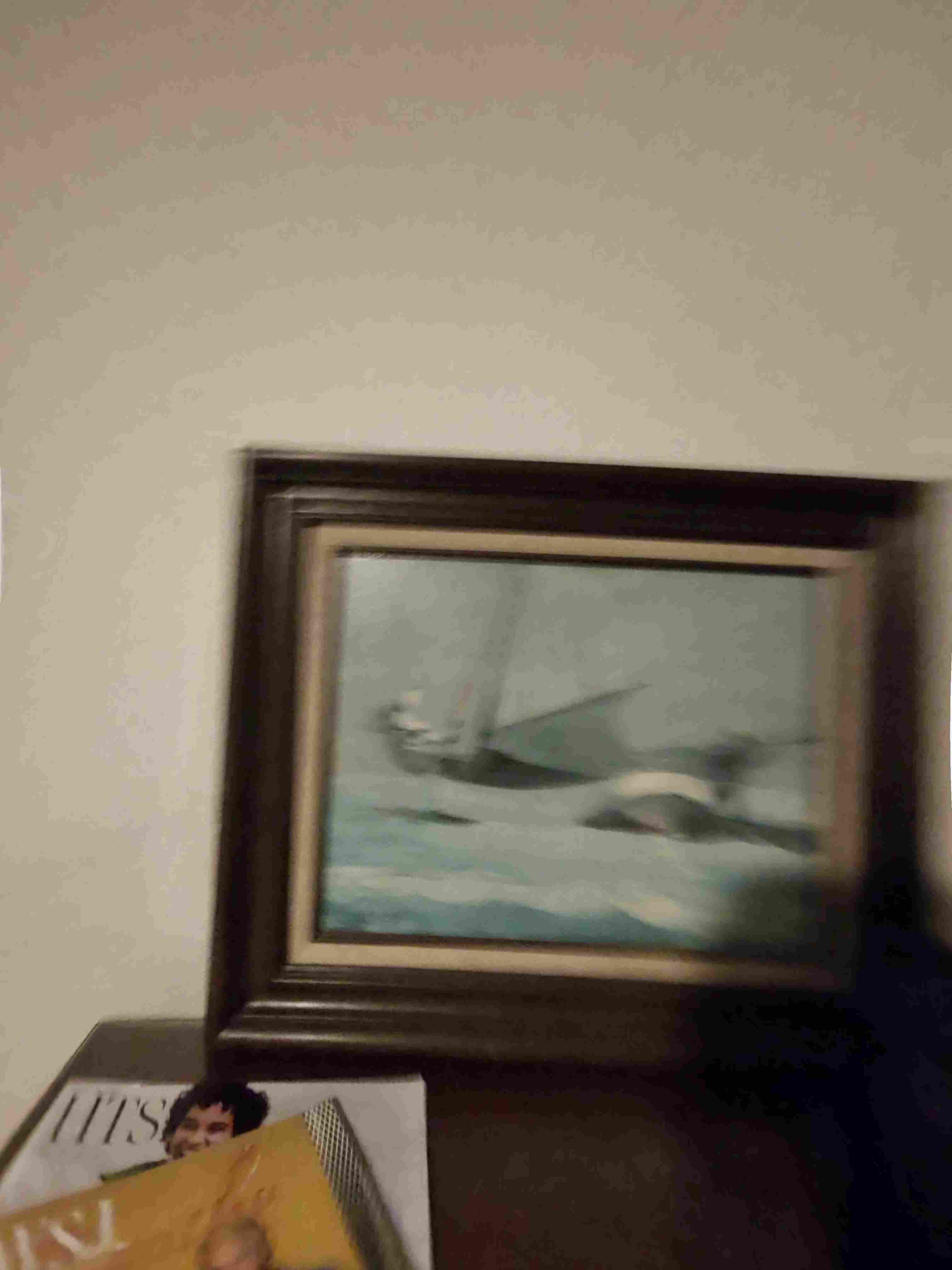 Small photograph of a woman's face taped to a wall