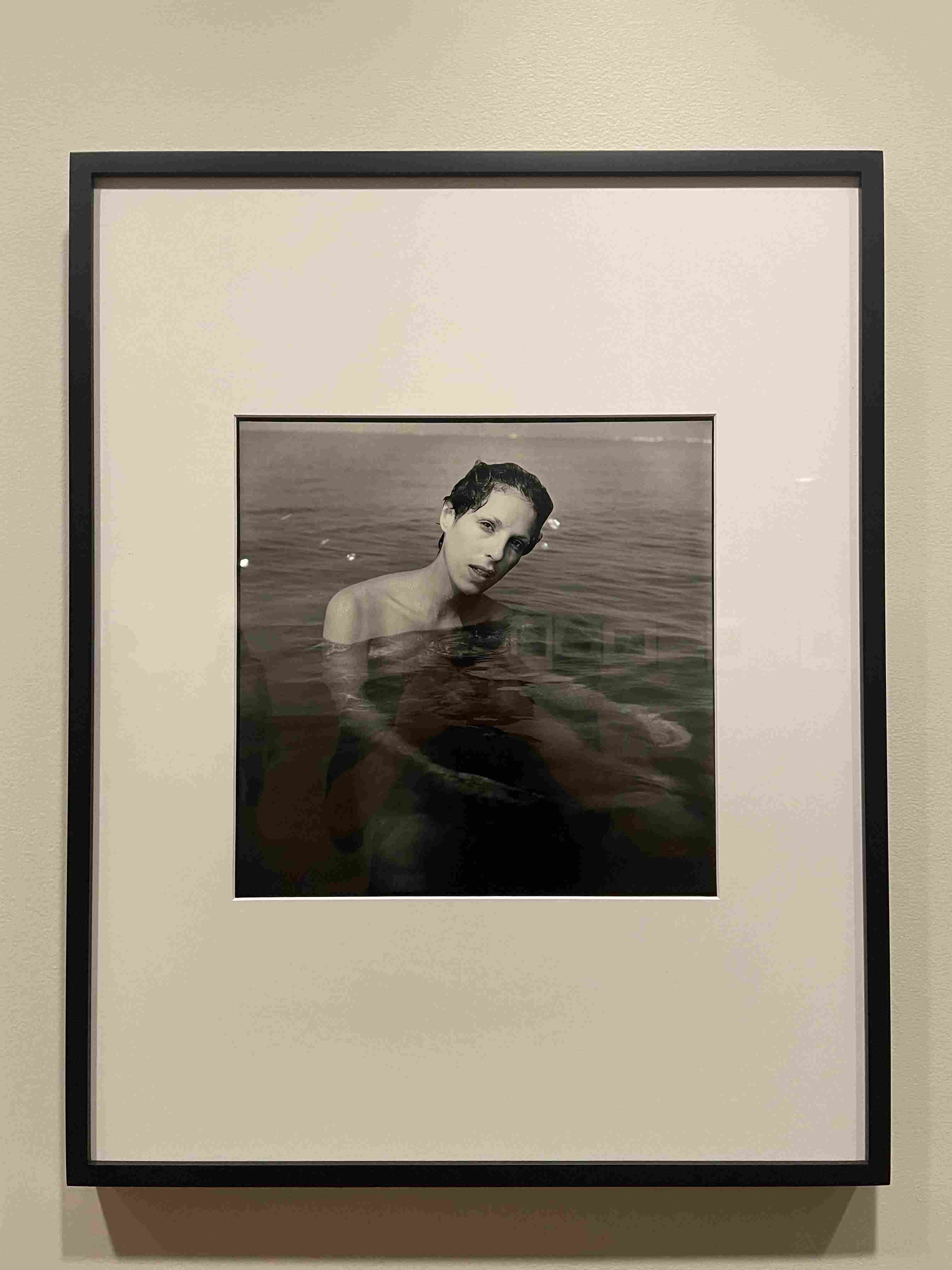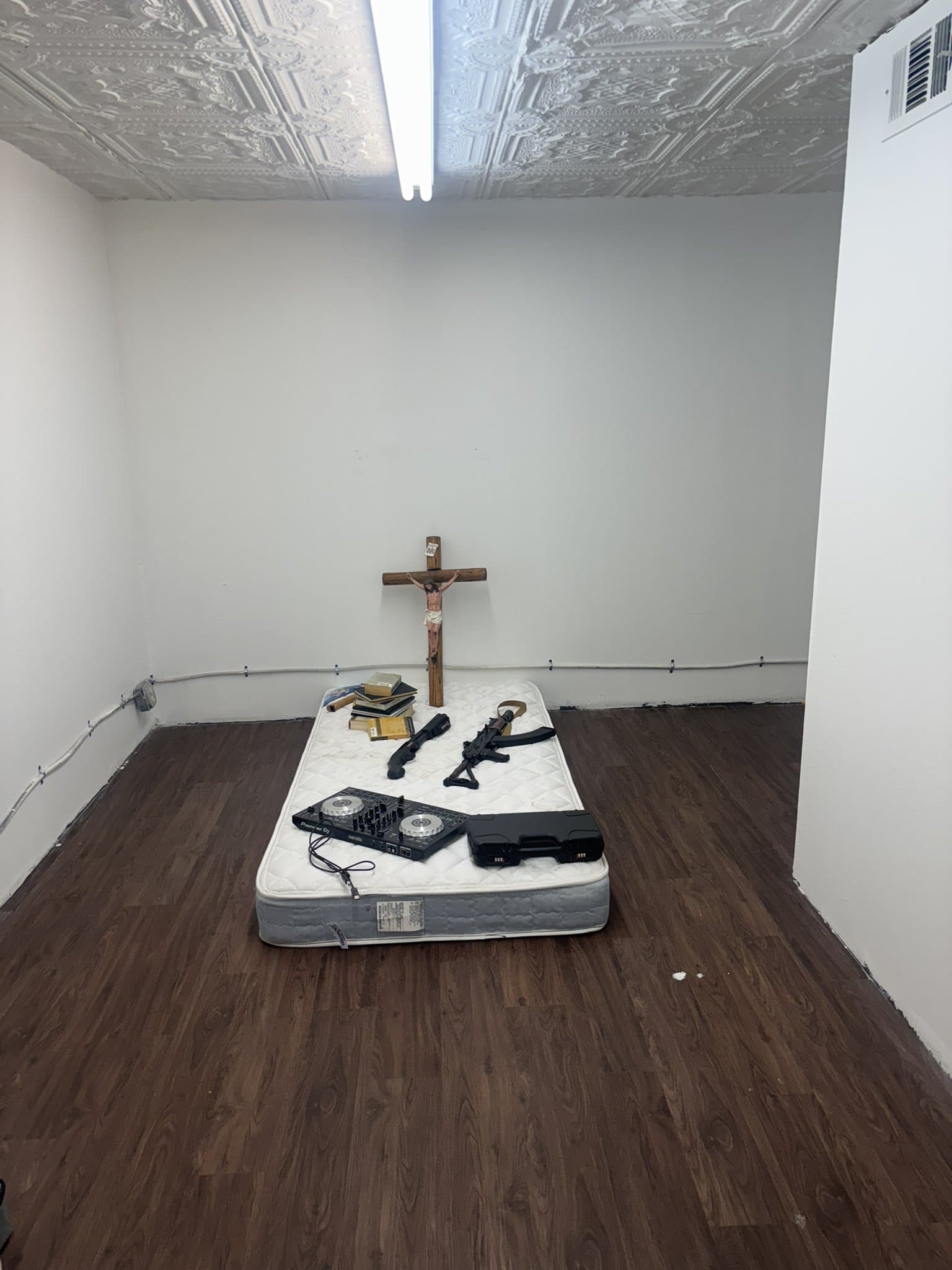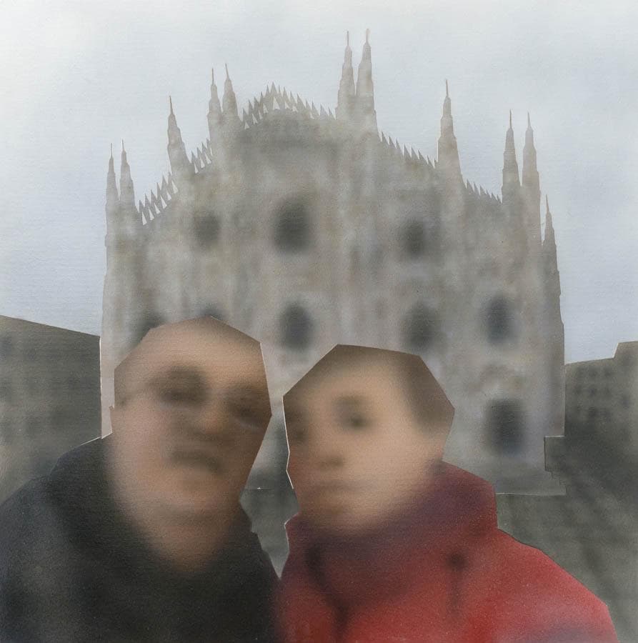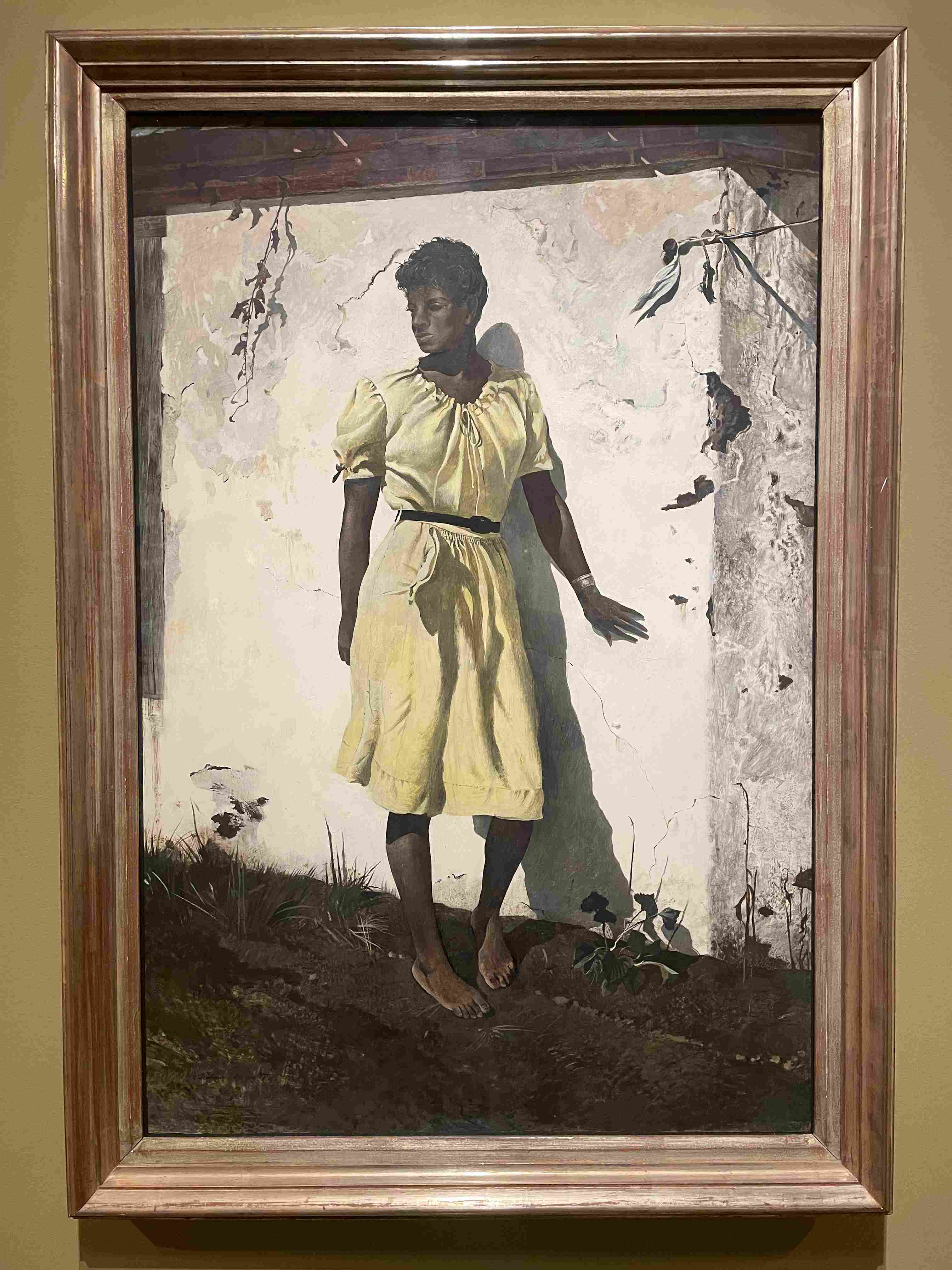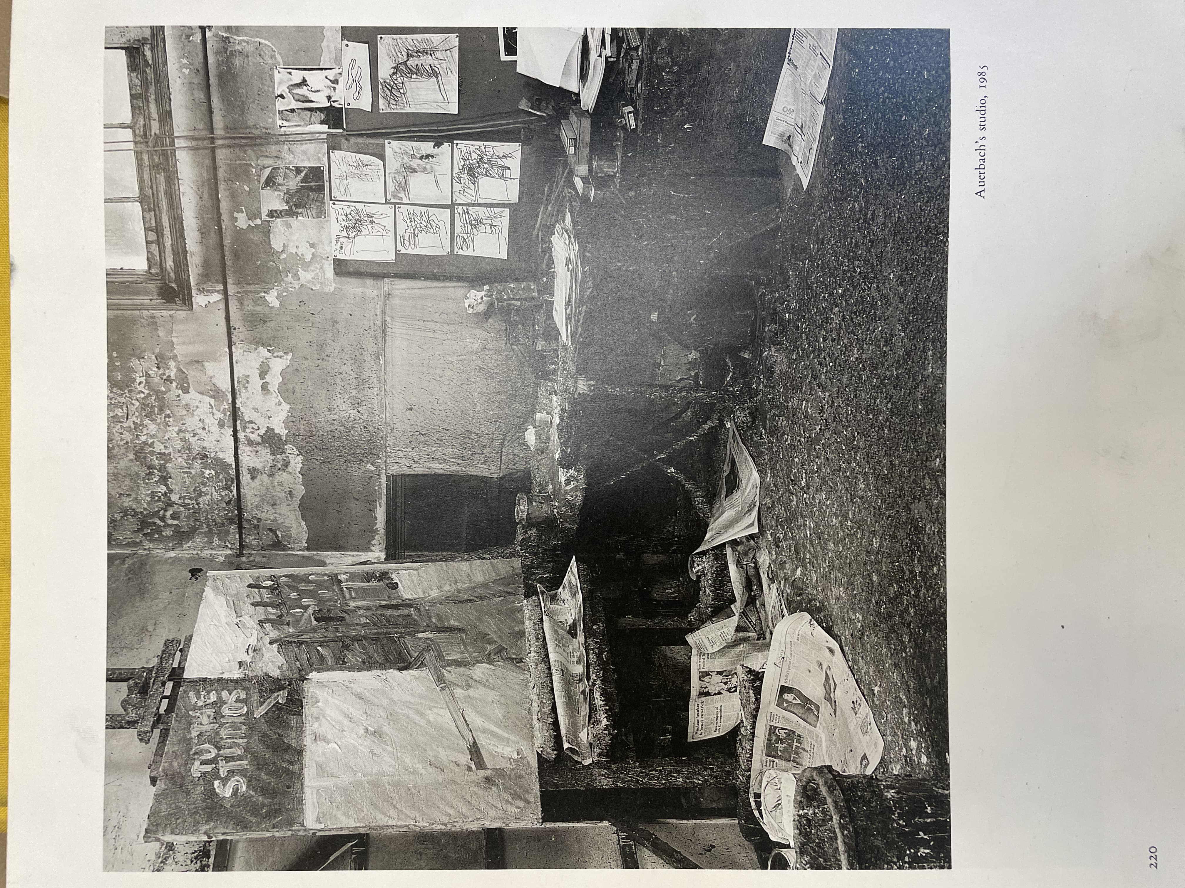 Small photograph of a woman's face taped to a wall