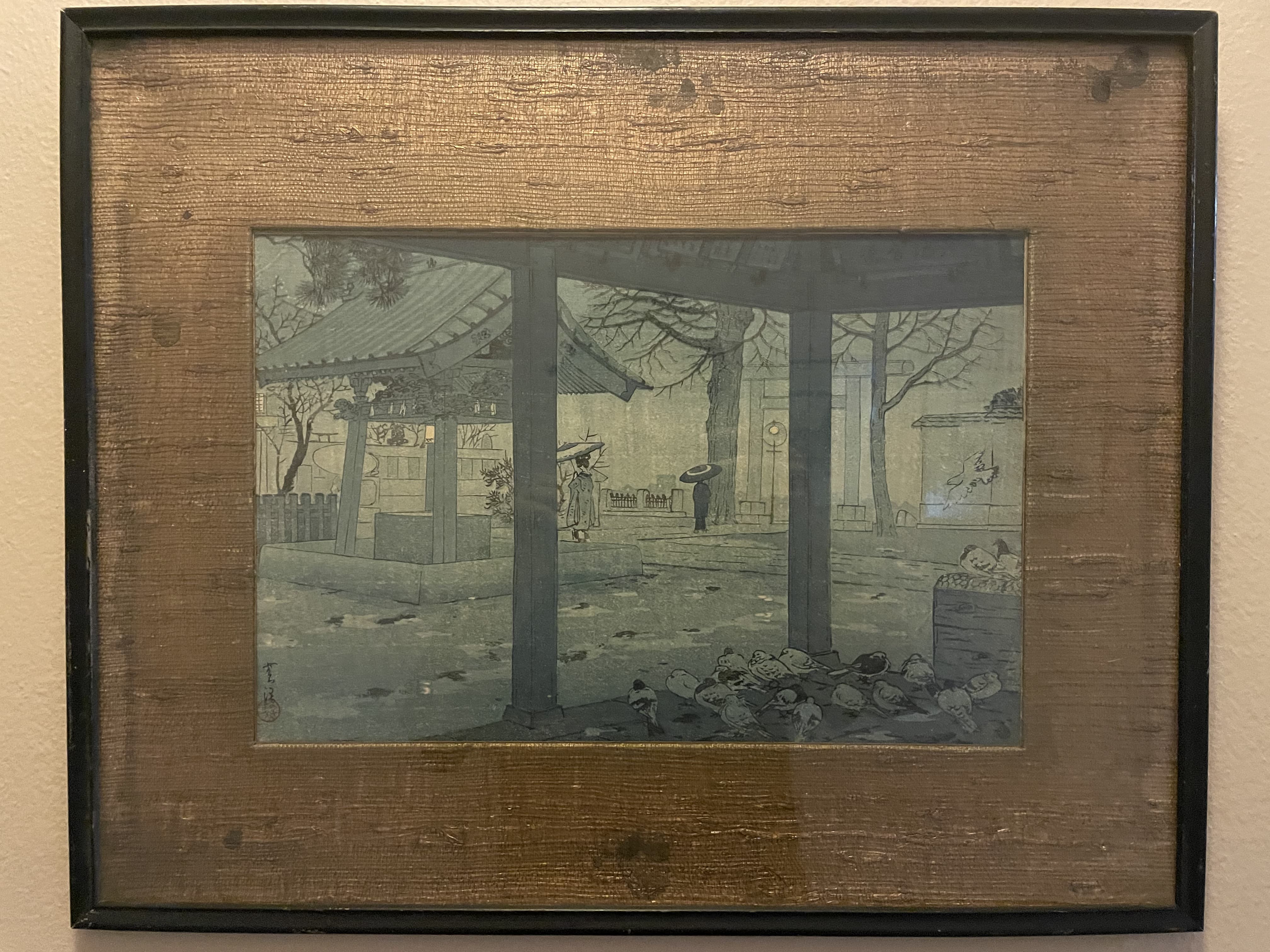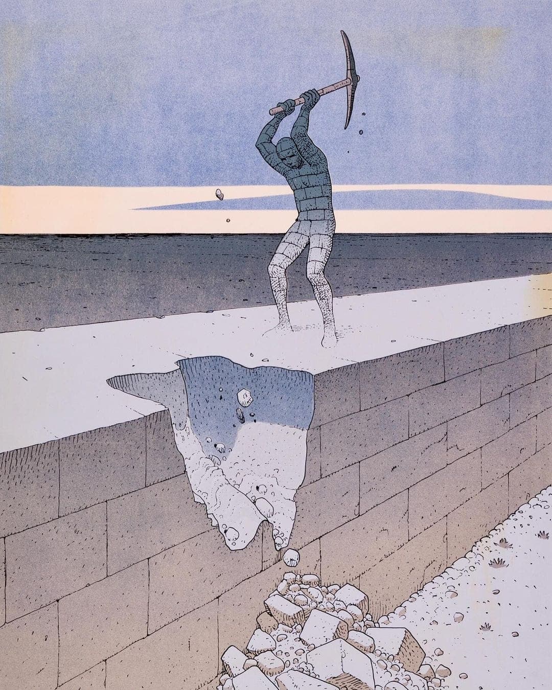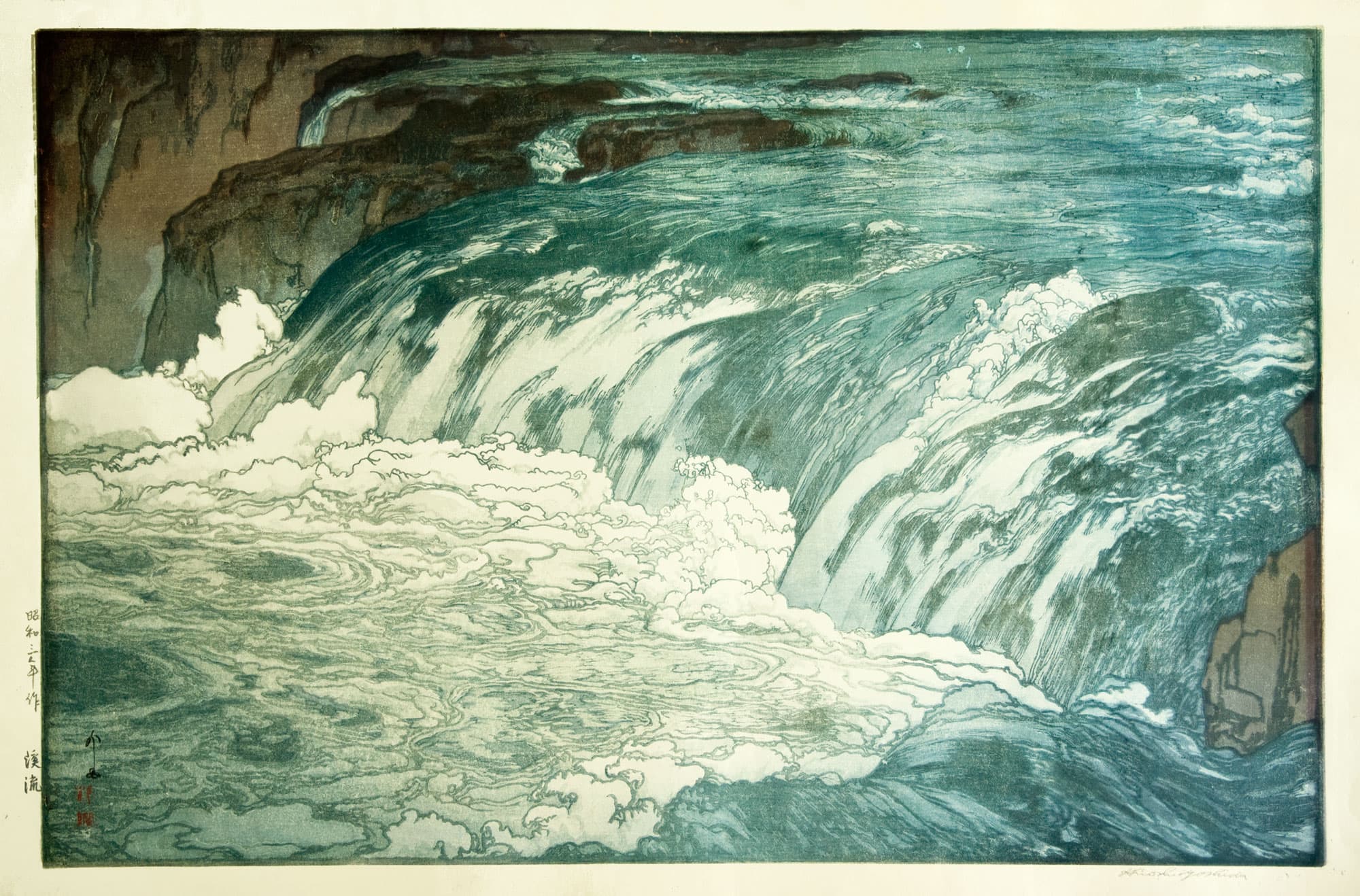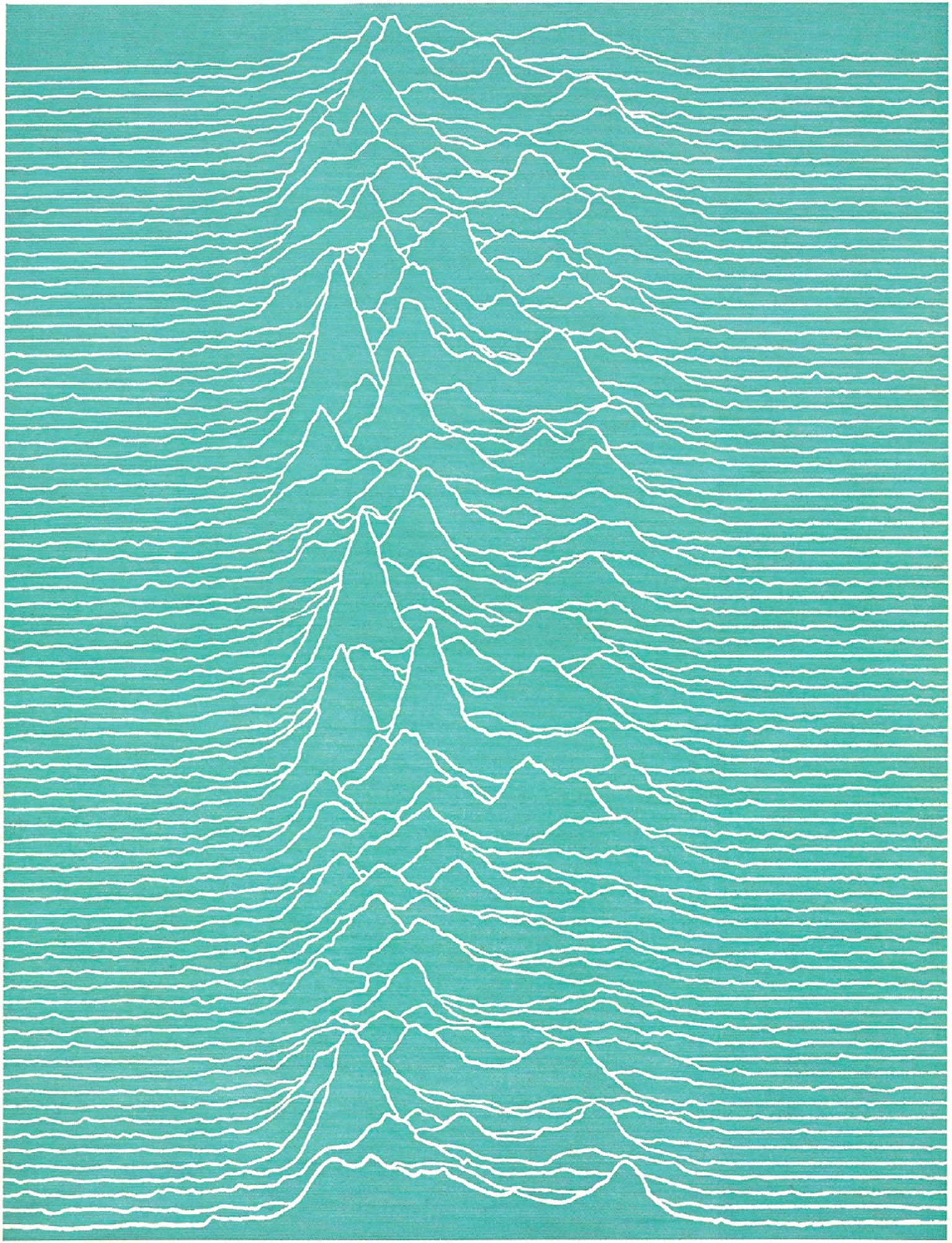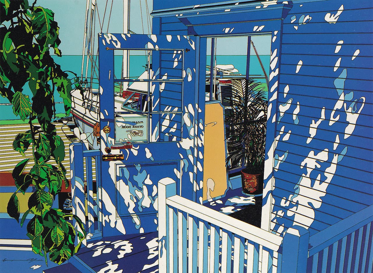 Woven Textile Depicting Steps and Railing Submerged in Blue Water