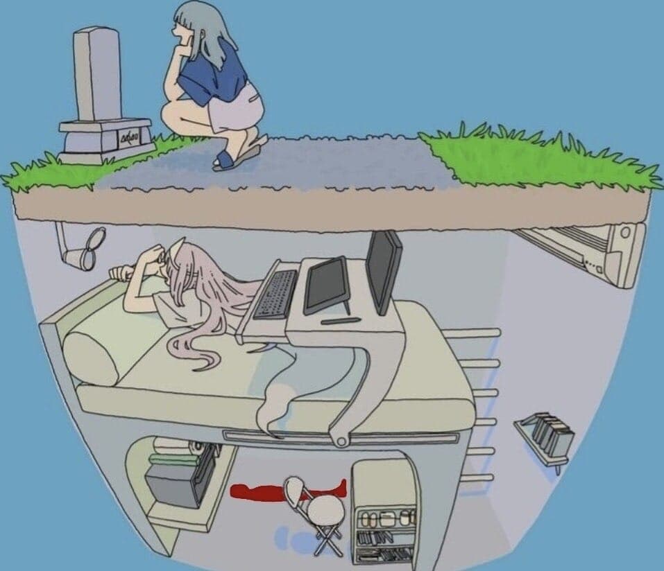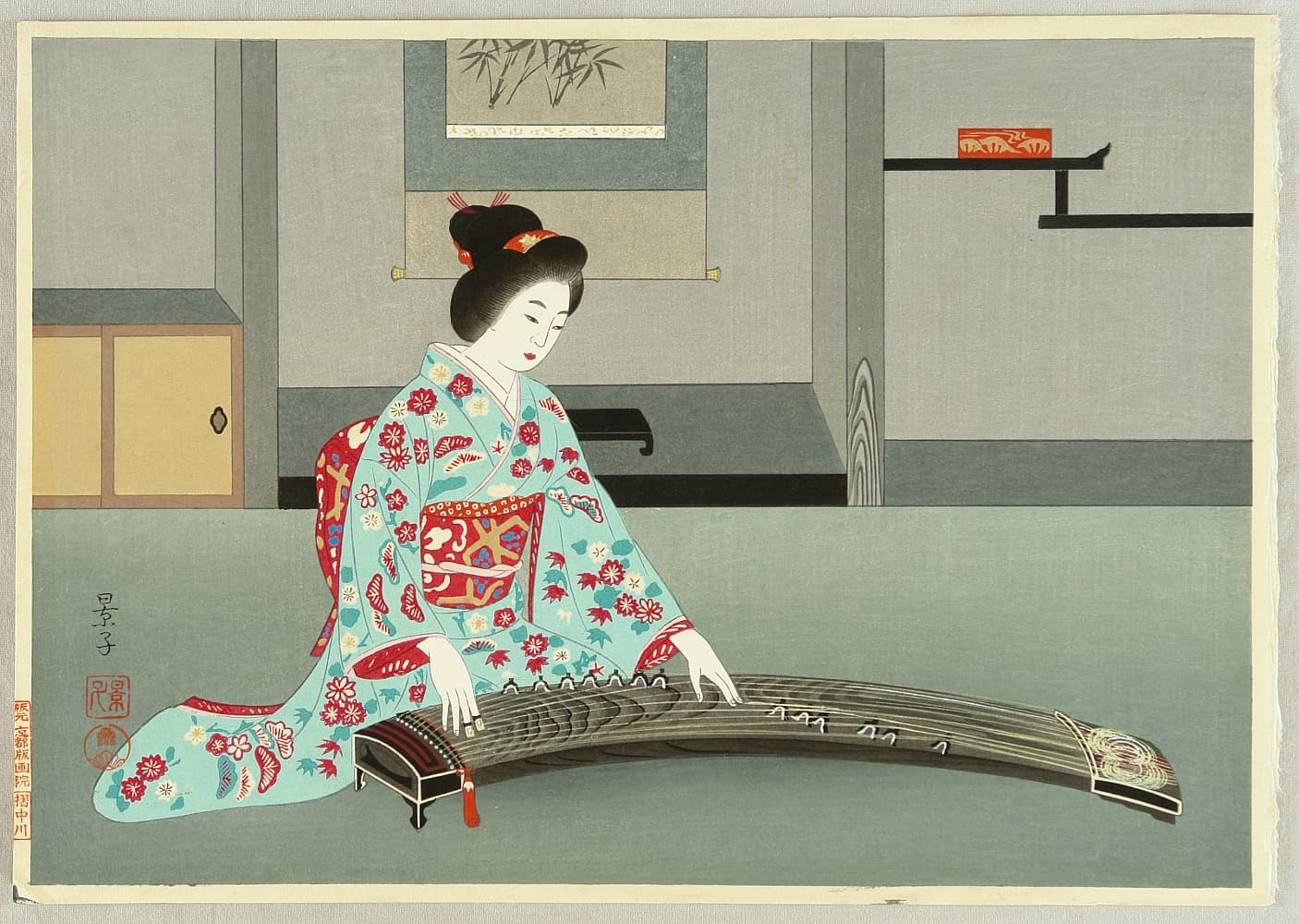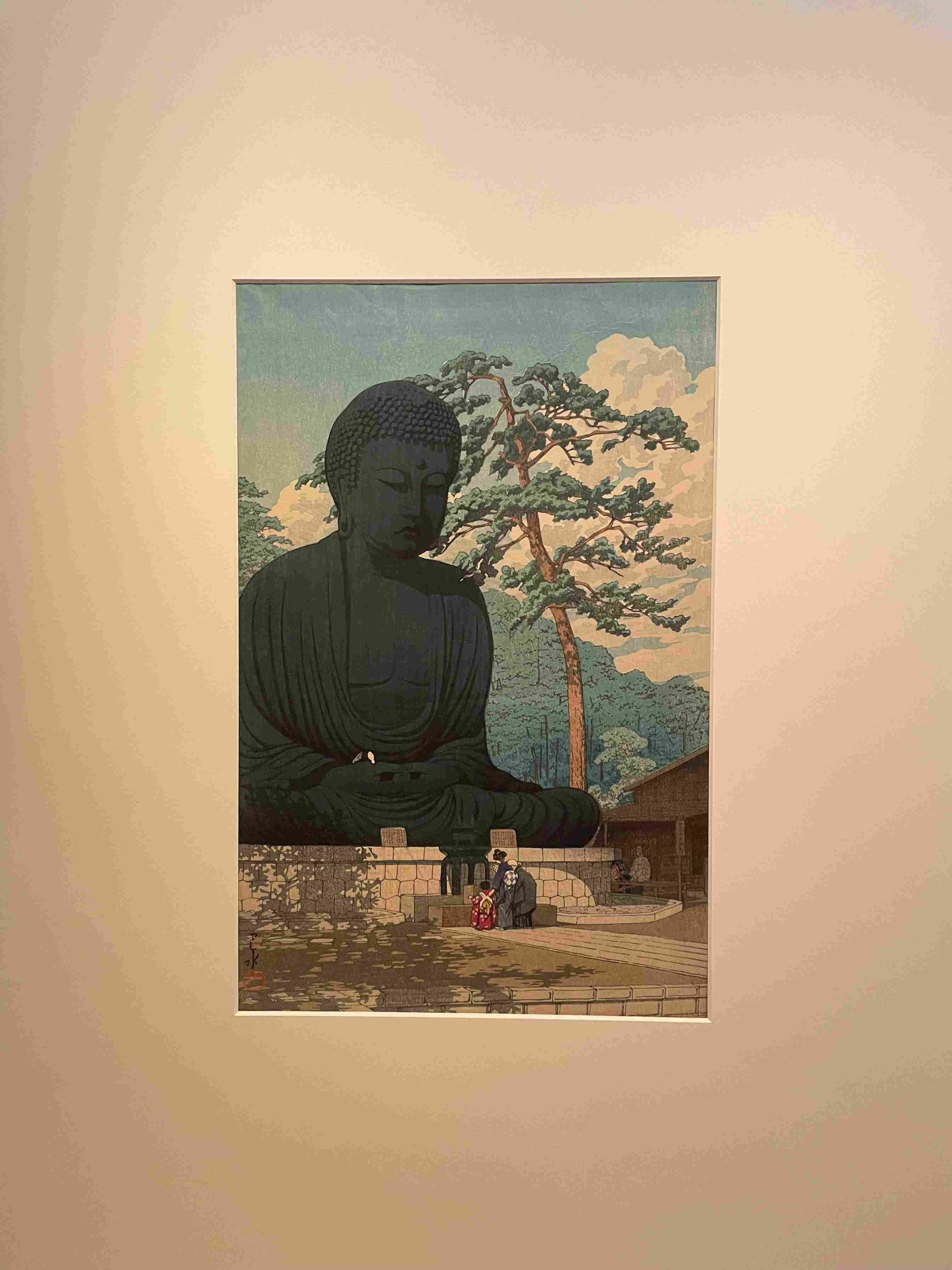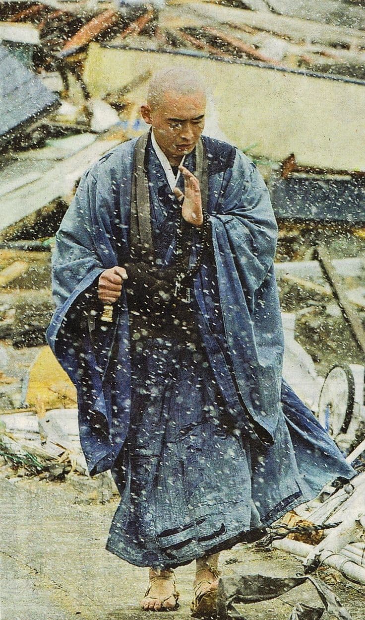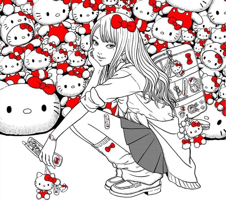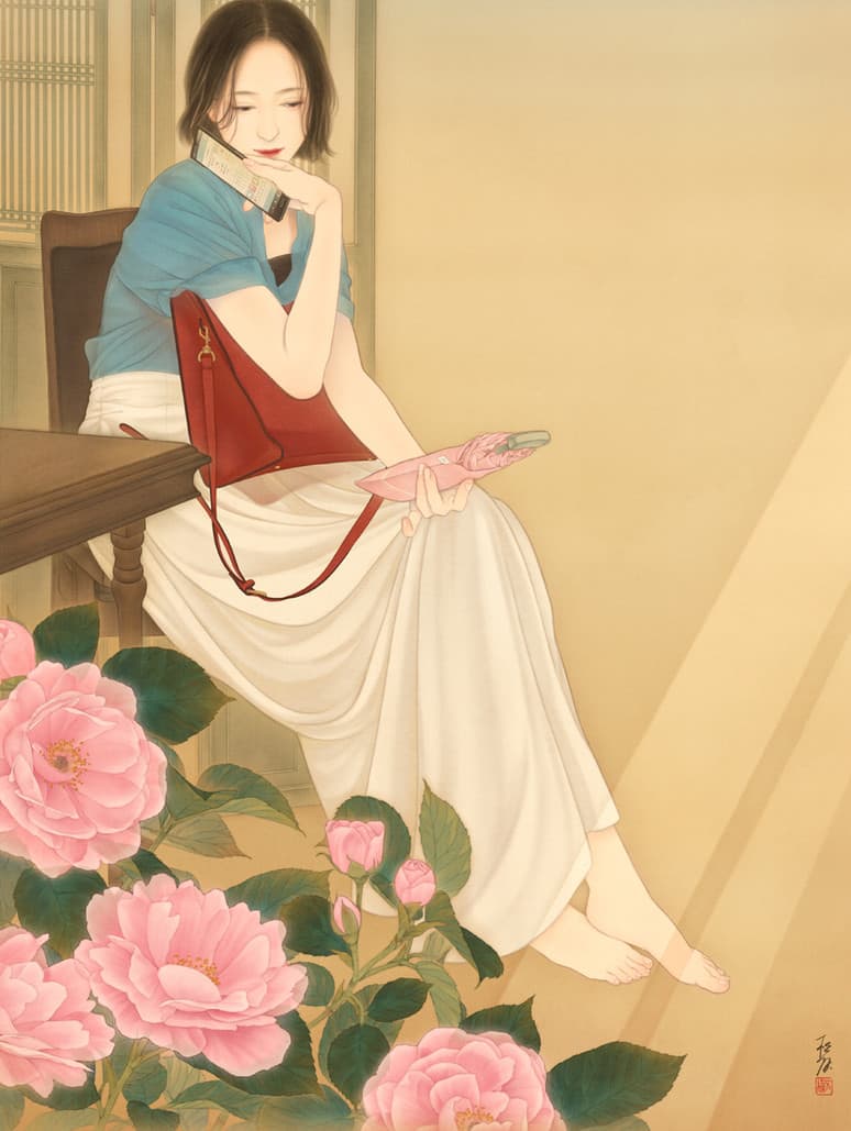 Illustration of a figure in traditional Japanese robes using a smartphone, with a cat and floating hearts