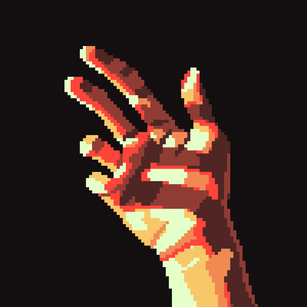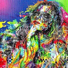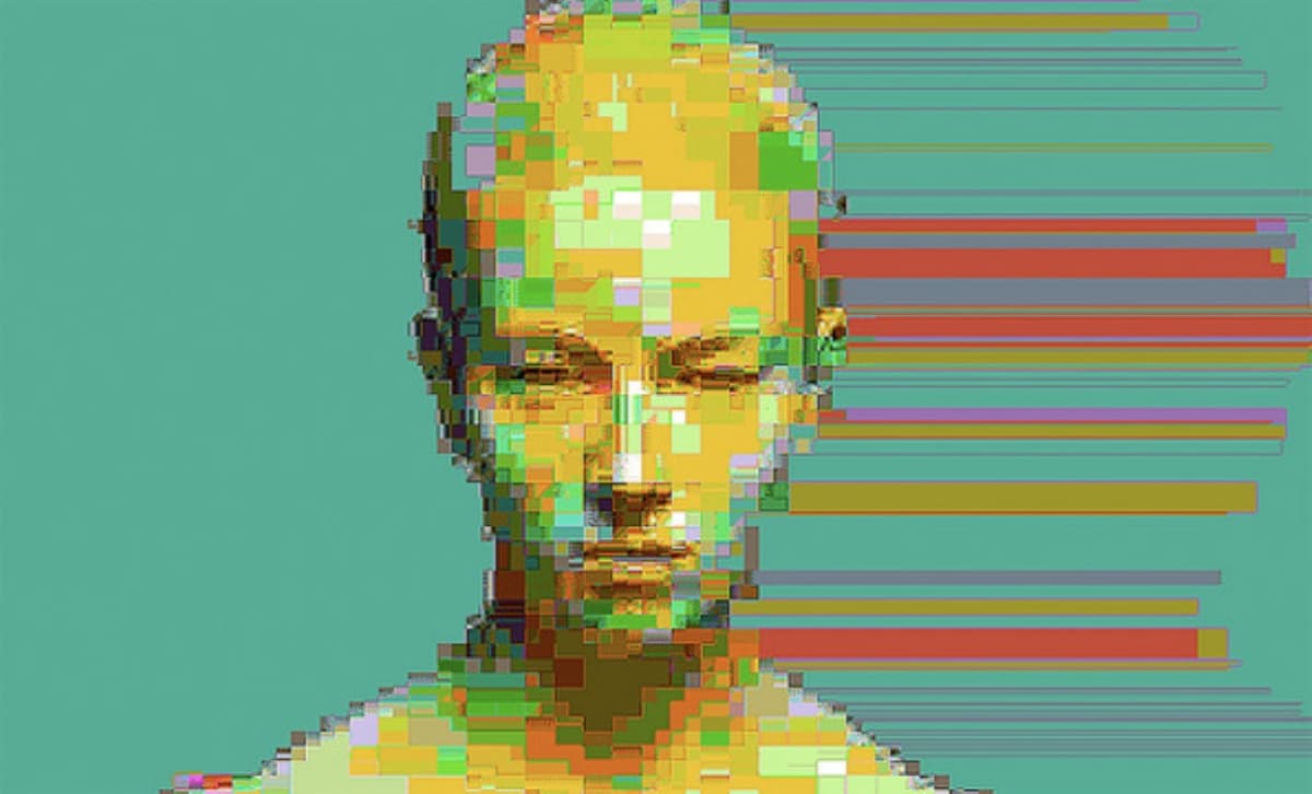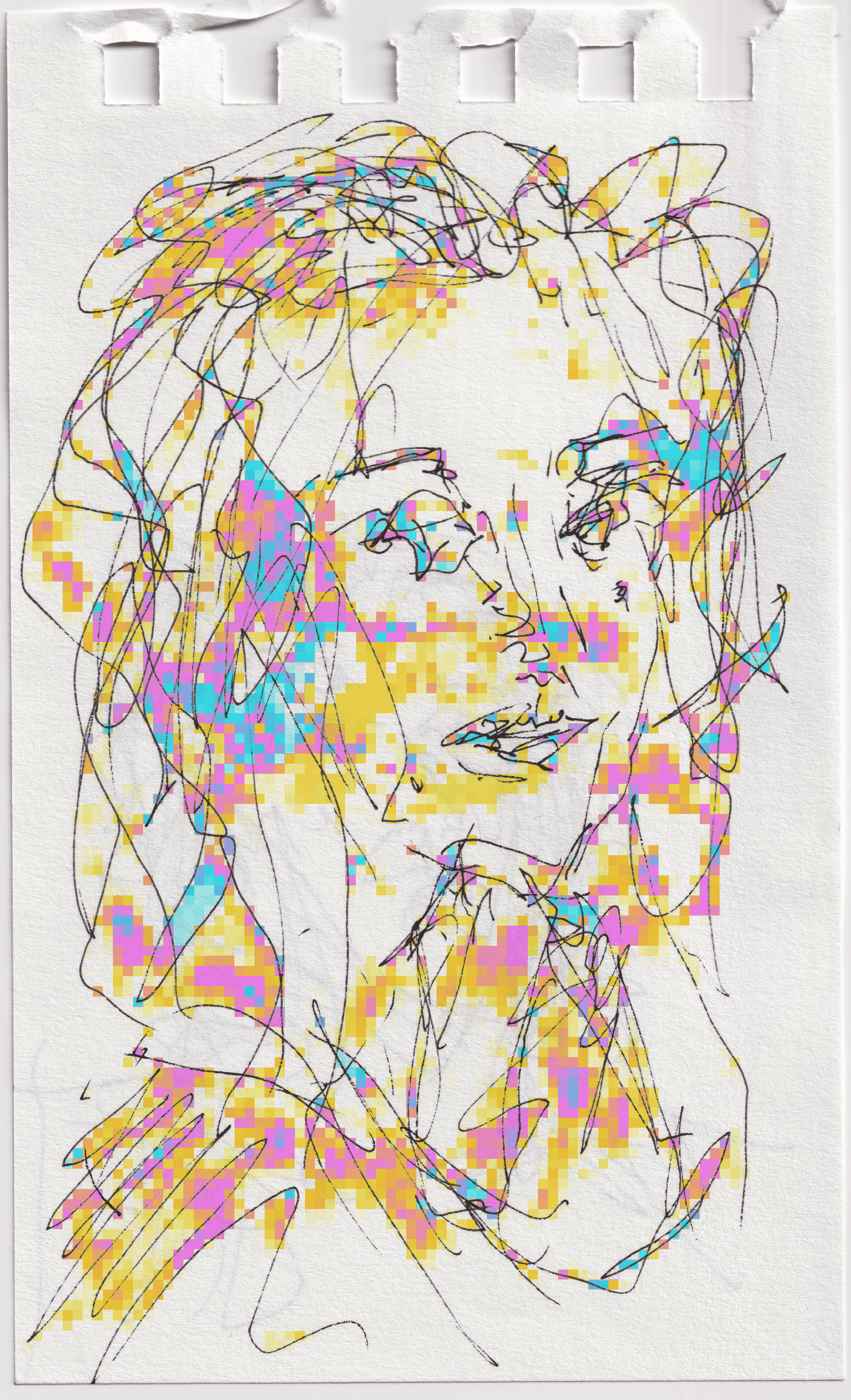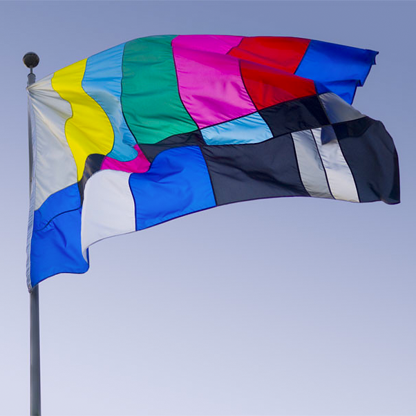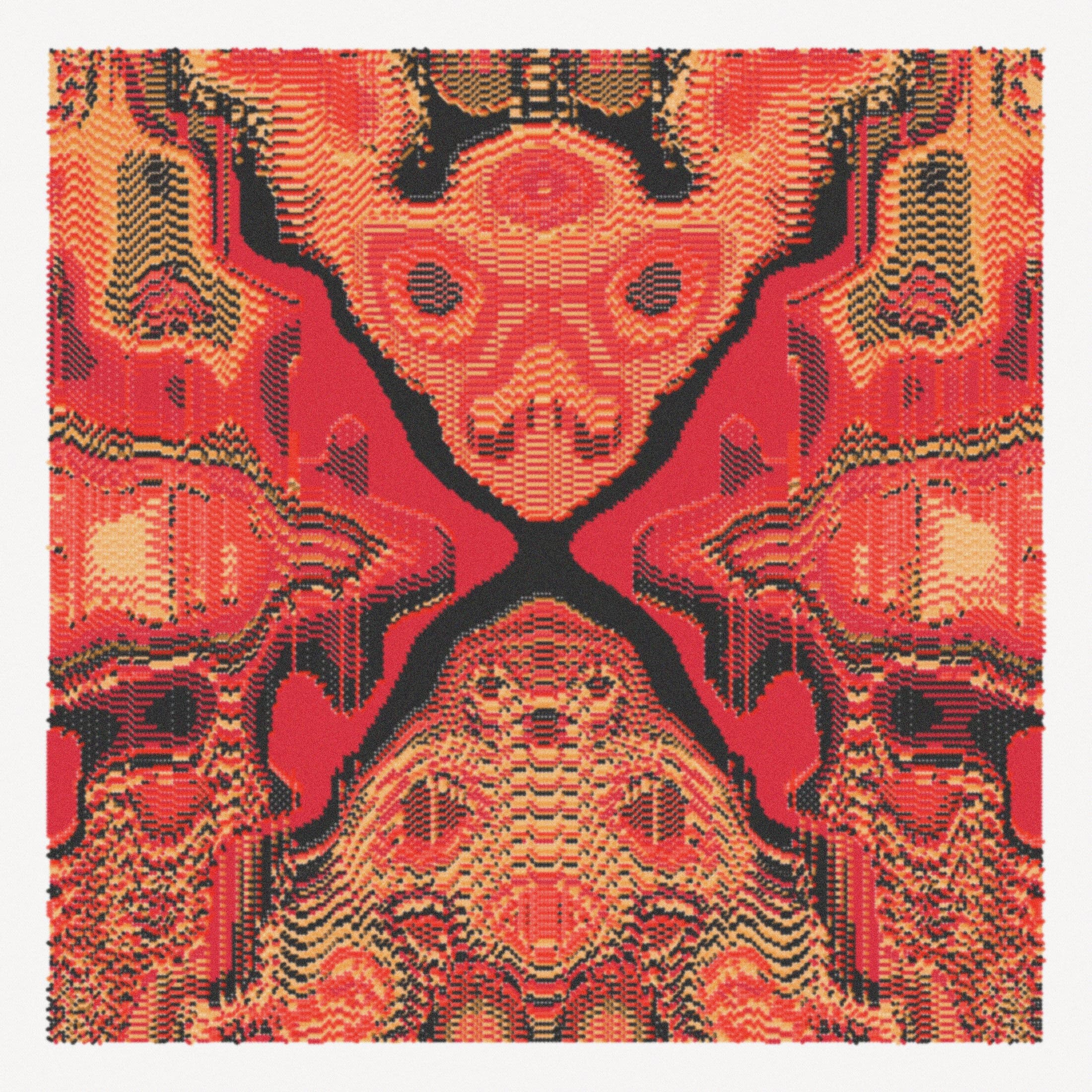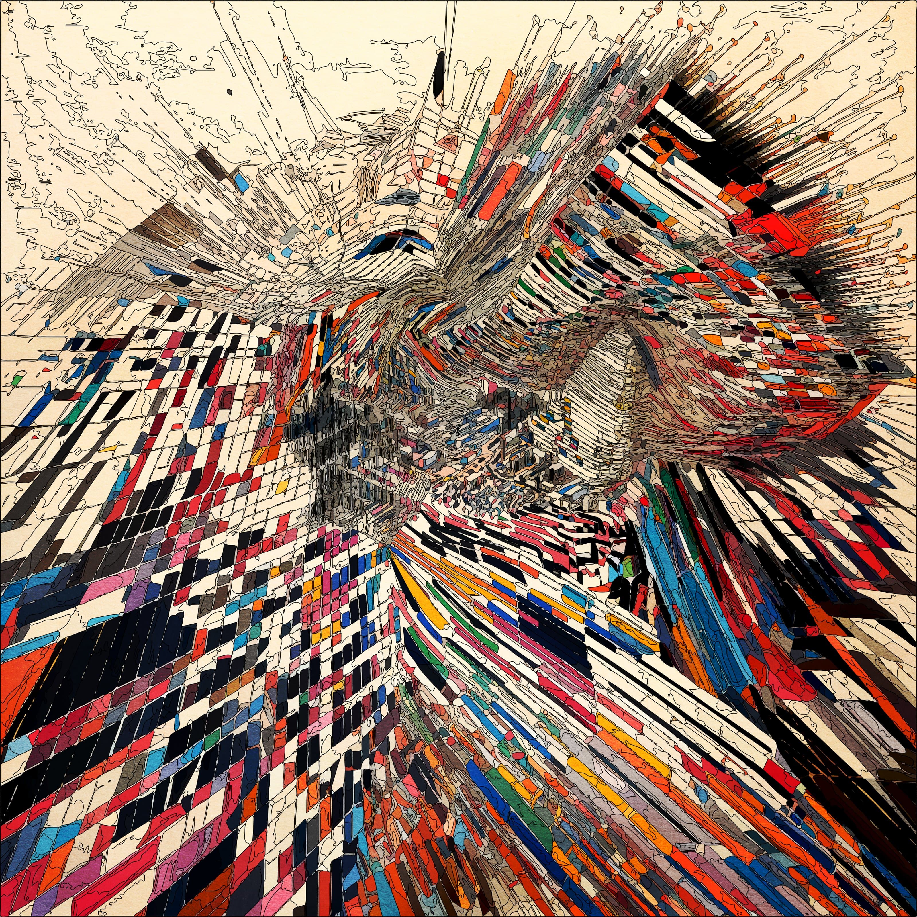 Digital mosaic composed of small colorful squares forming an irregular, abstract shape