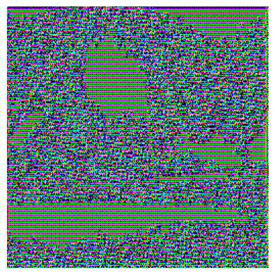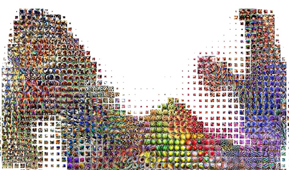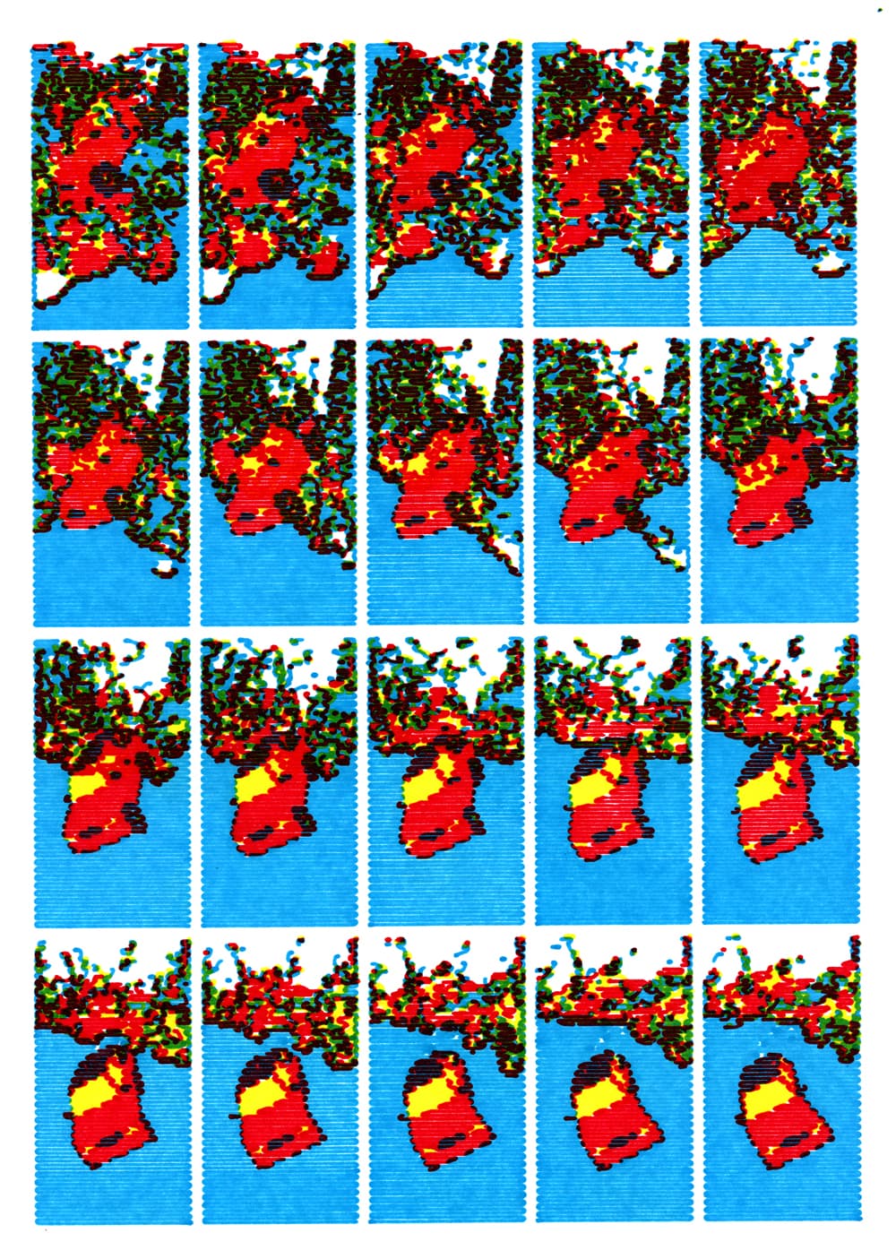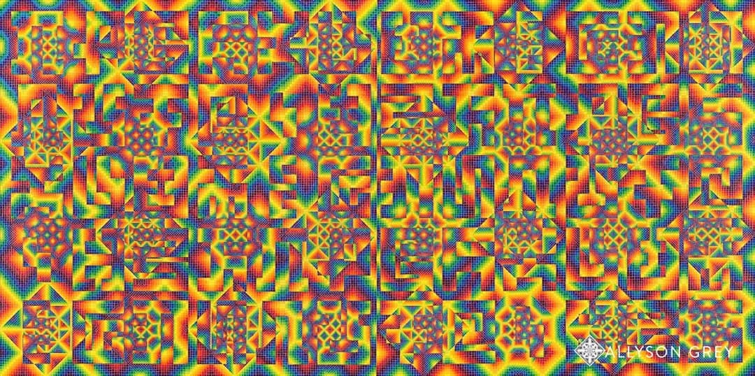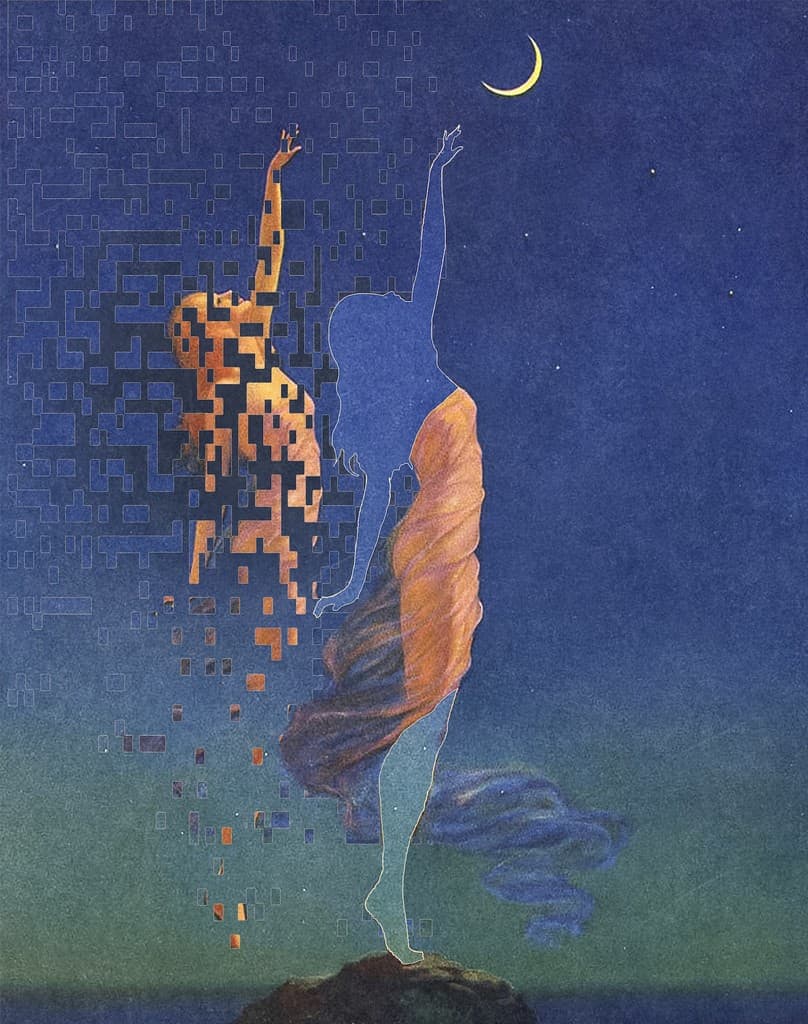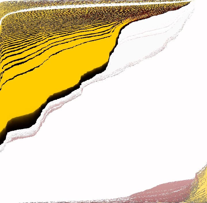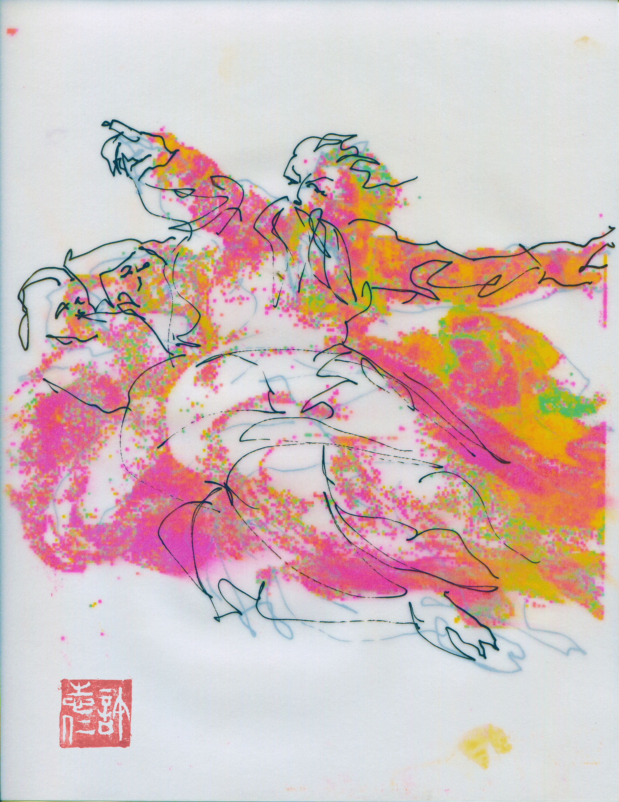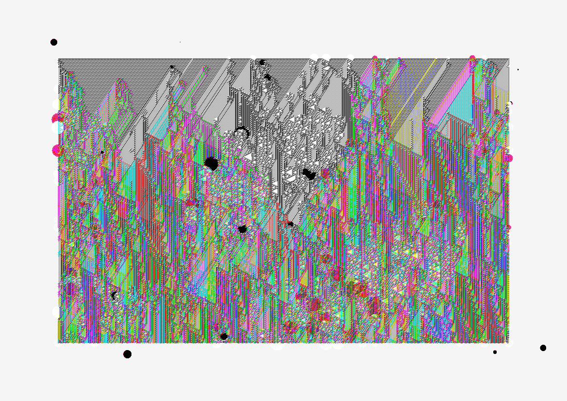 Digital mosaic composed of small colorful squares forming an irregular, abstract shape