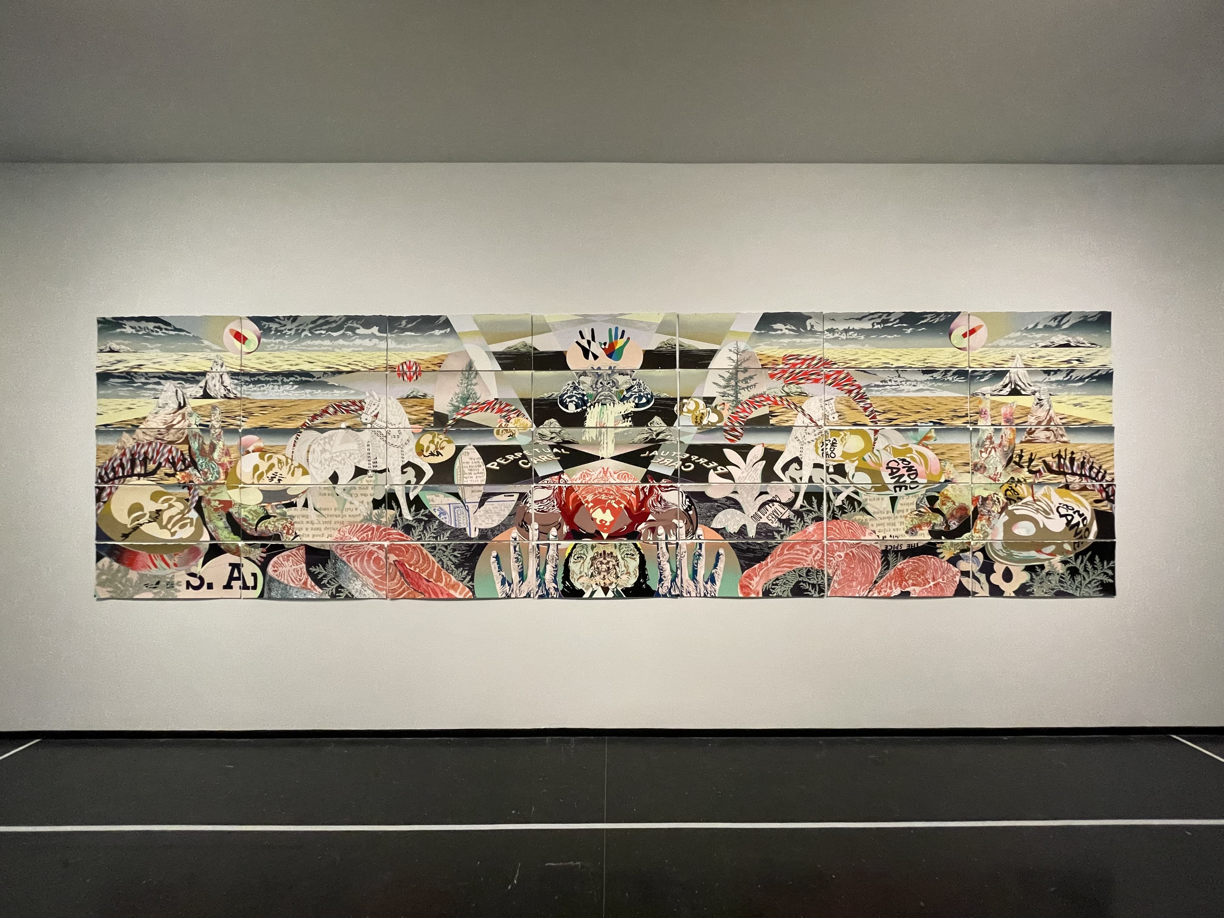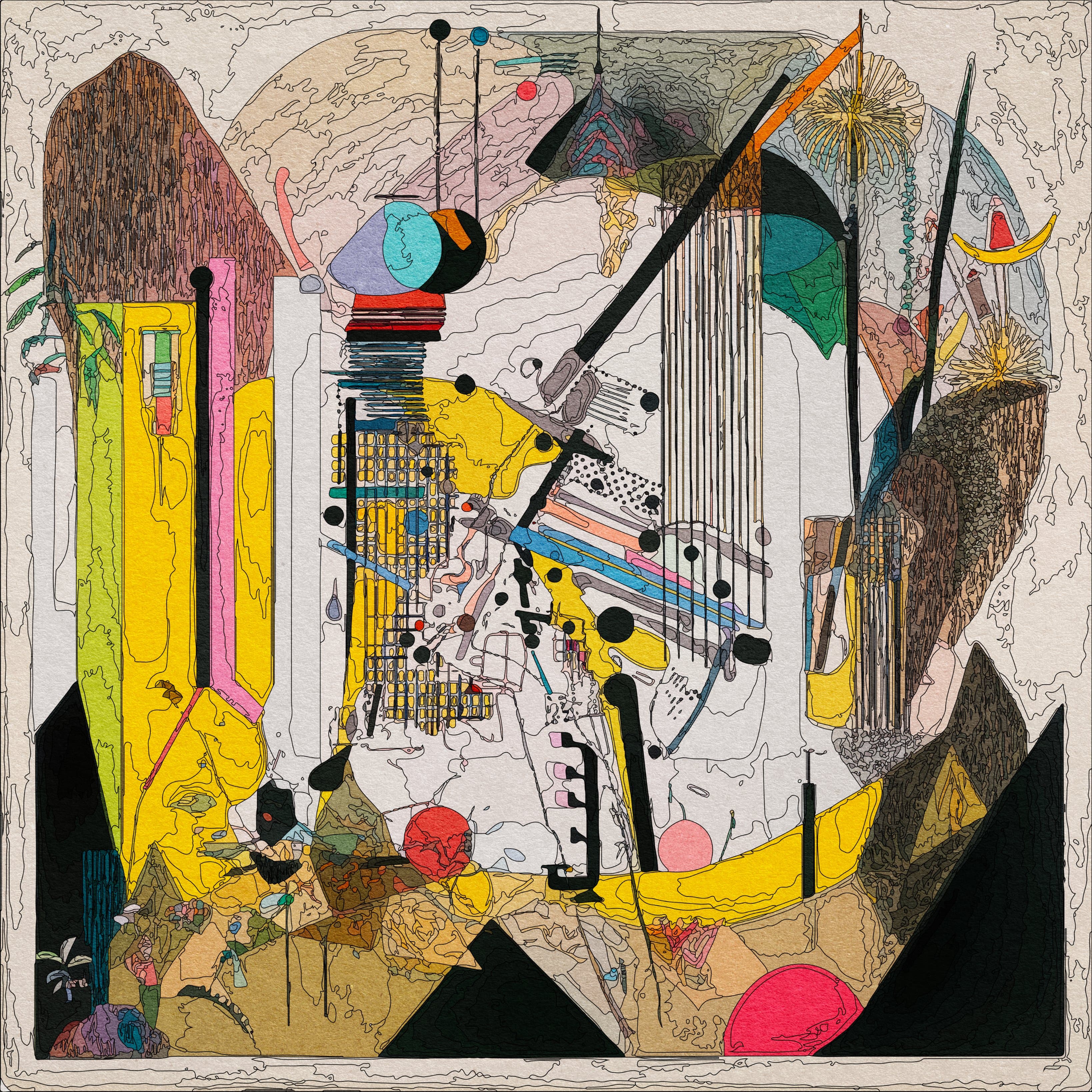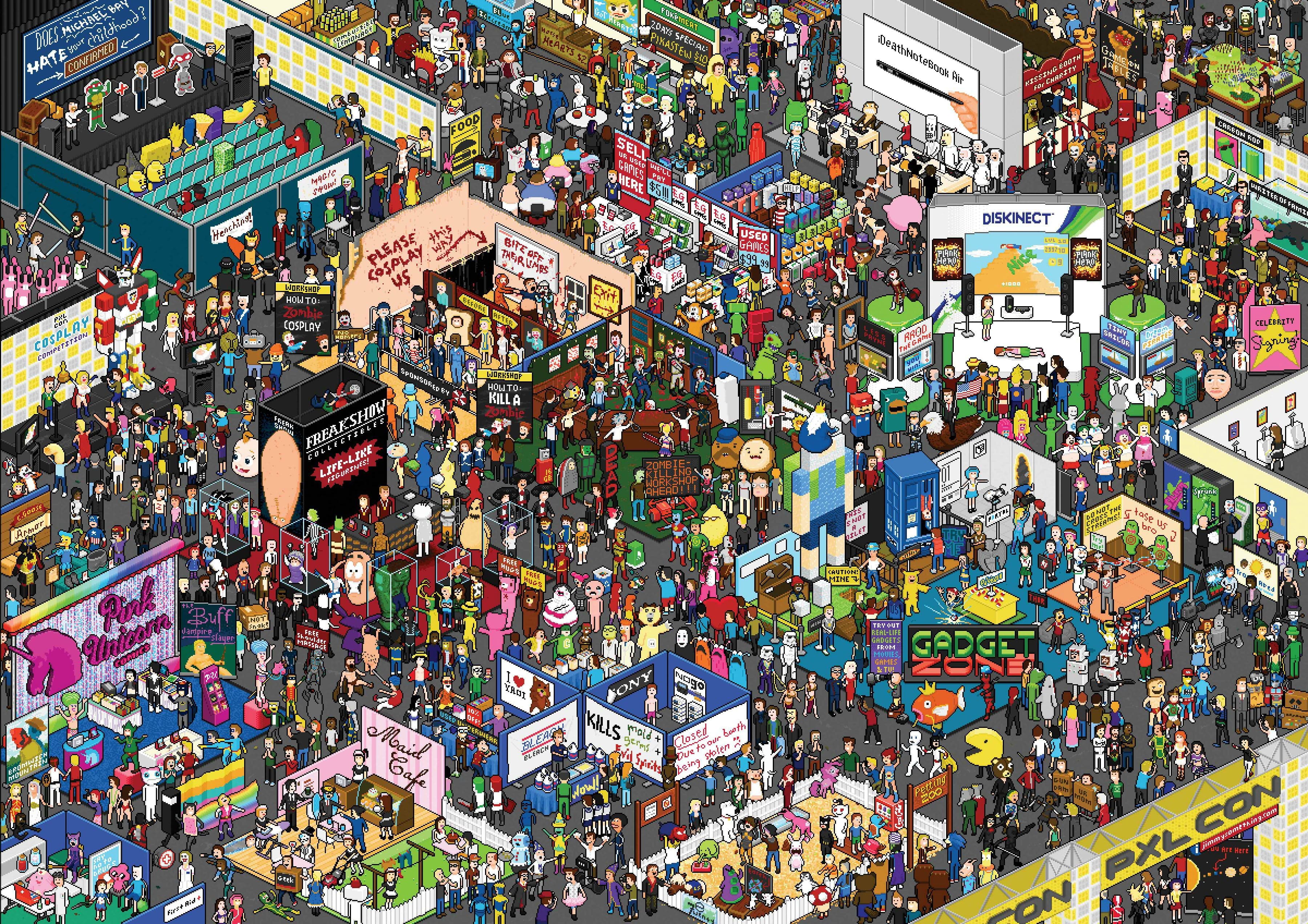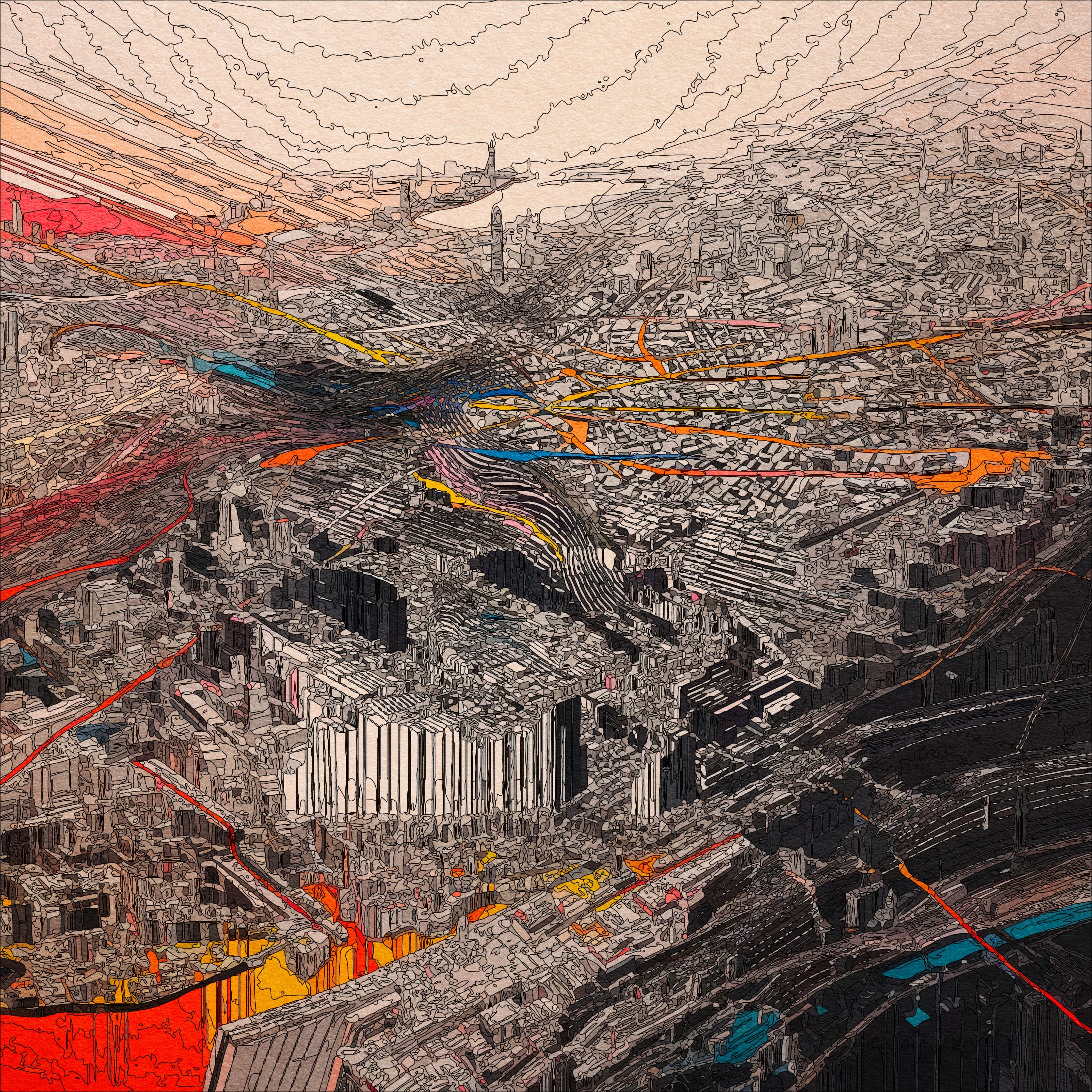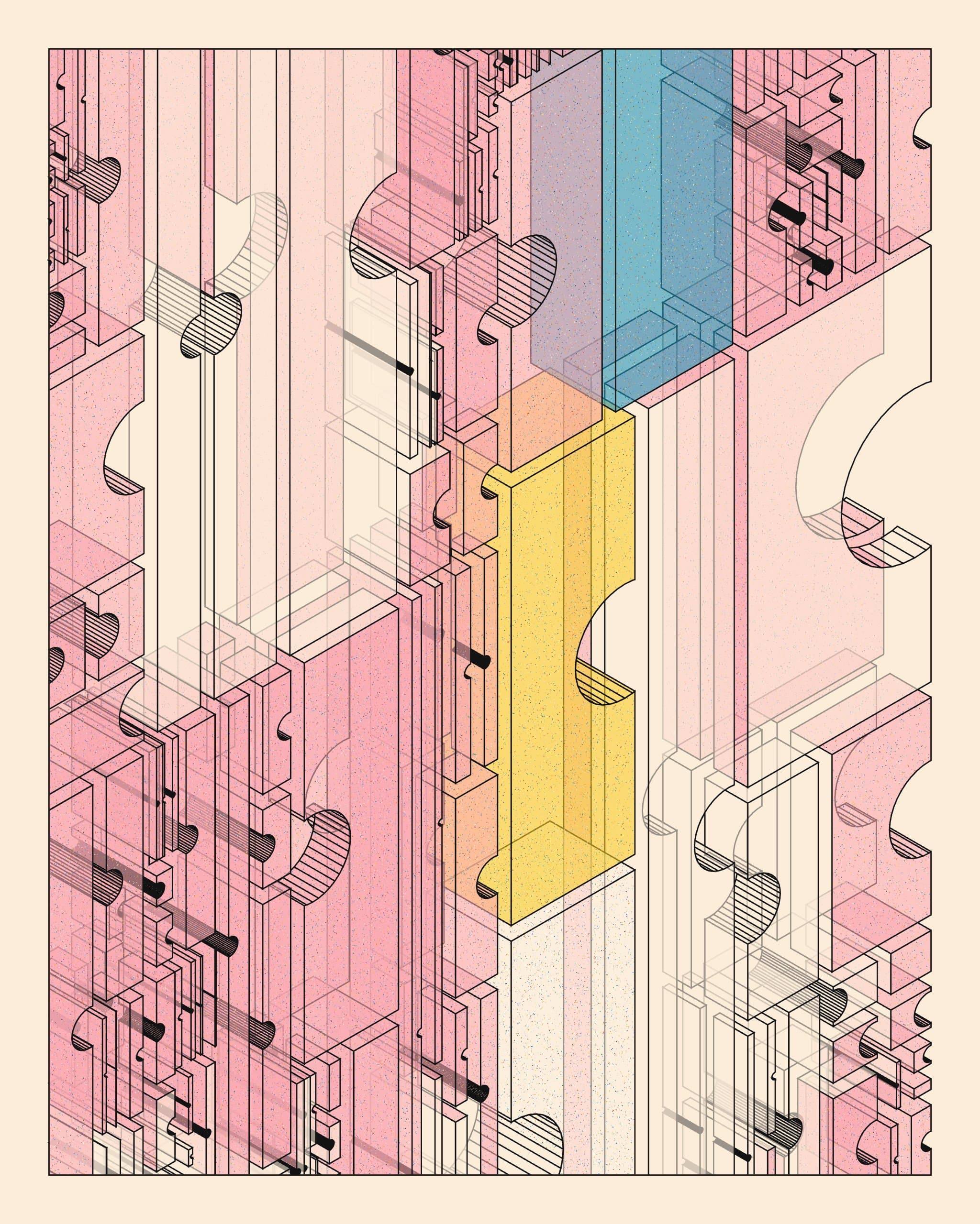 Digital mosaic composed of small colorful squares forming an irregular, abstract shape