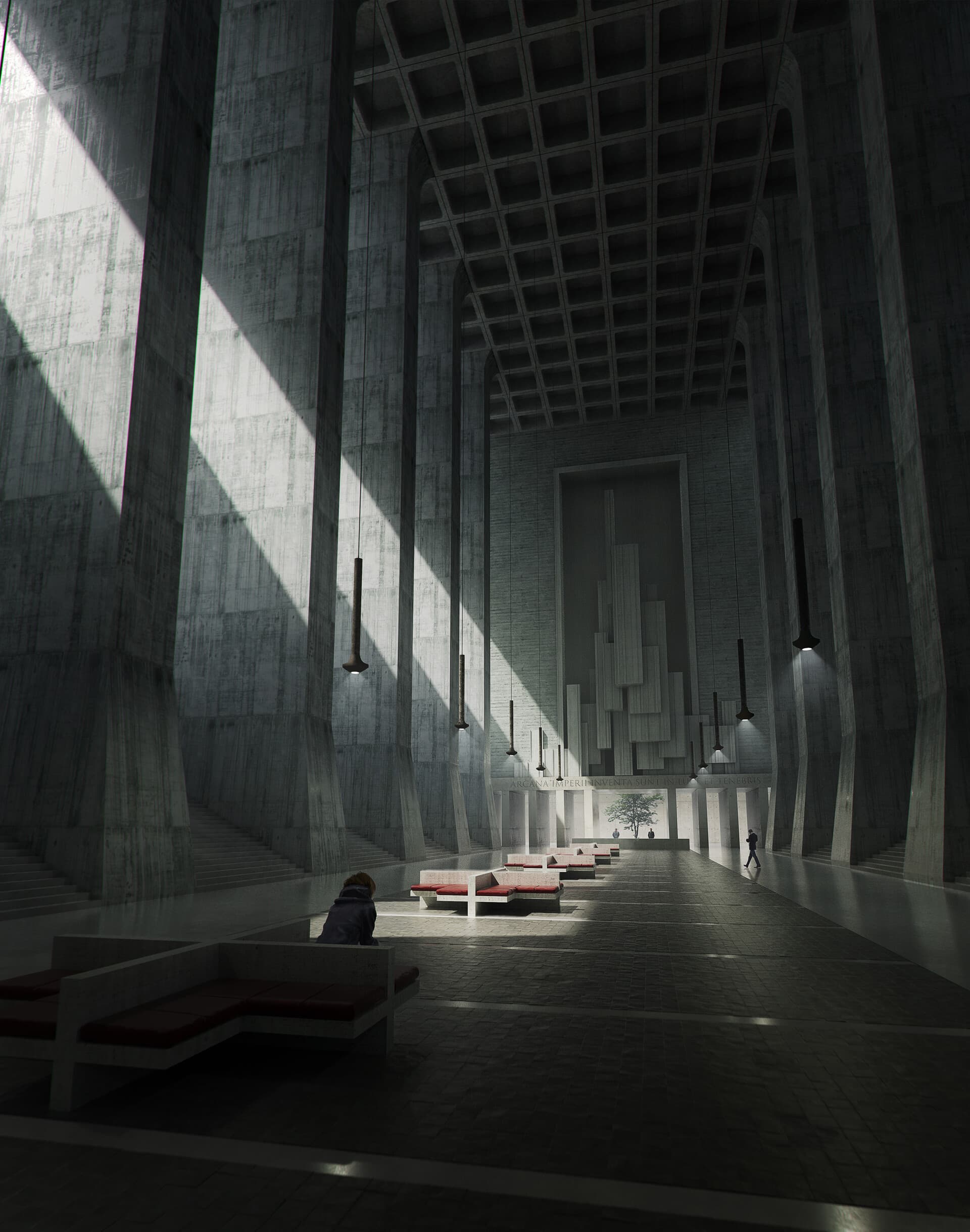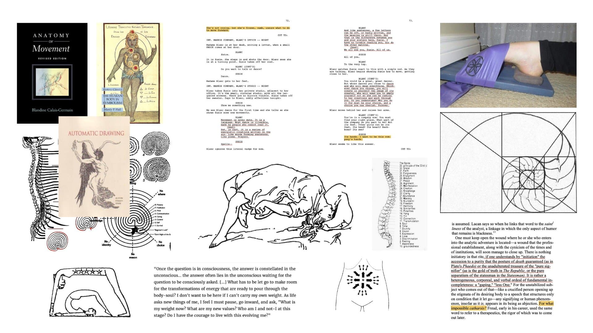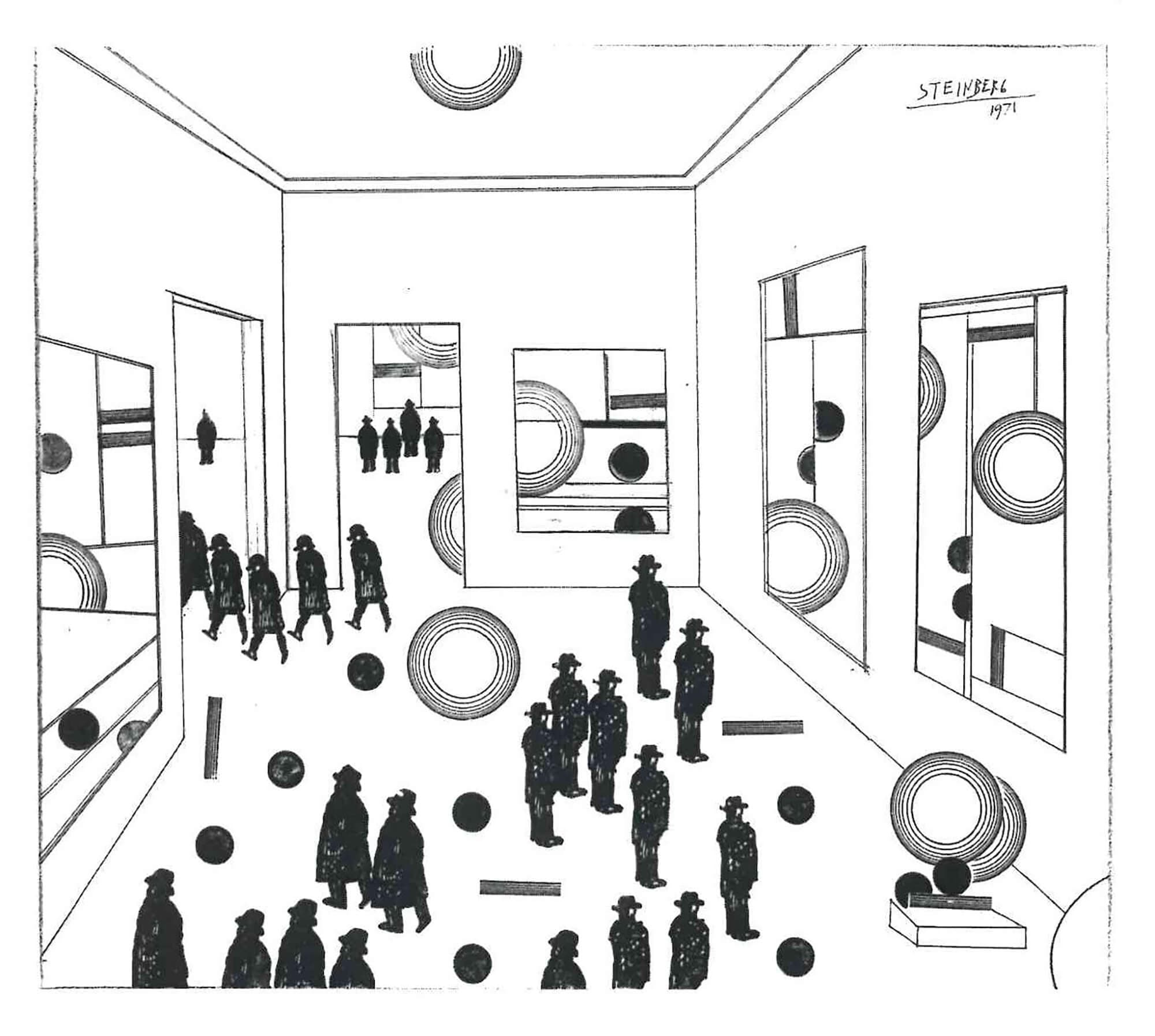 Hand-drawn grid of 20 perspective sketches of interior rooms and spaces