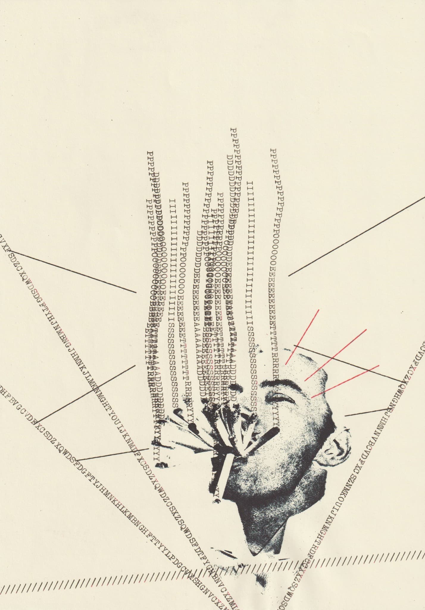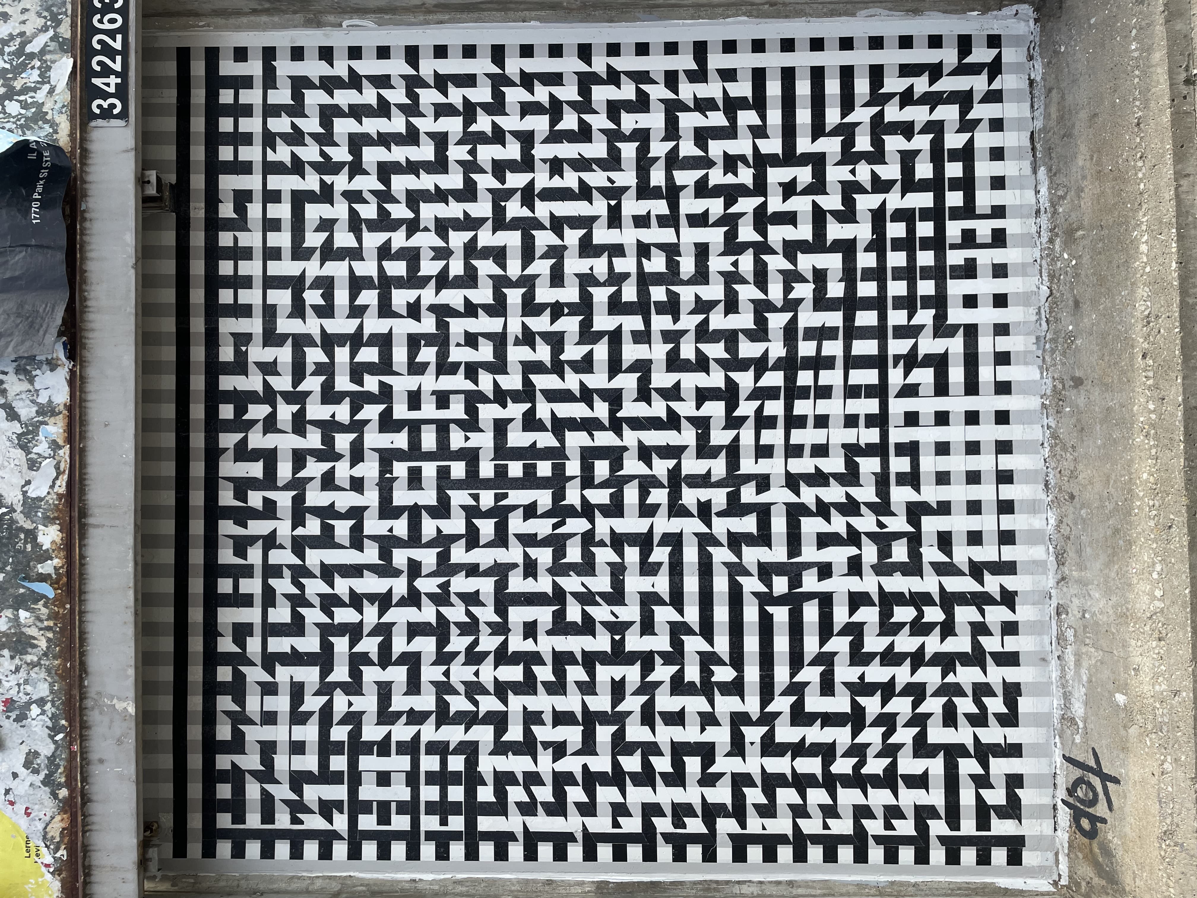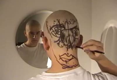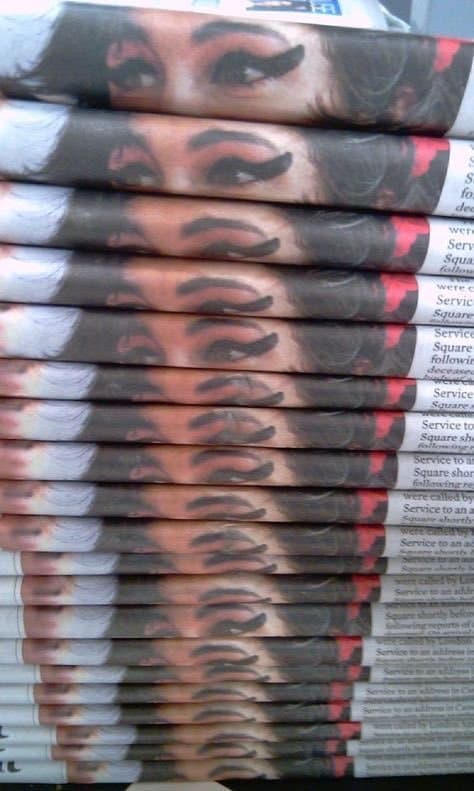 Black and white photograph of a woman's face taped to a wall