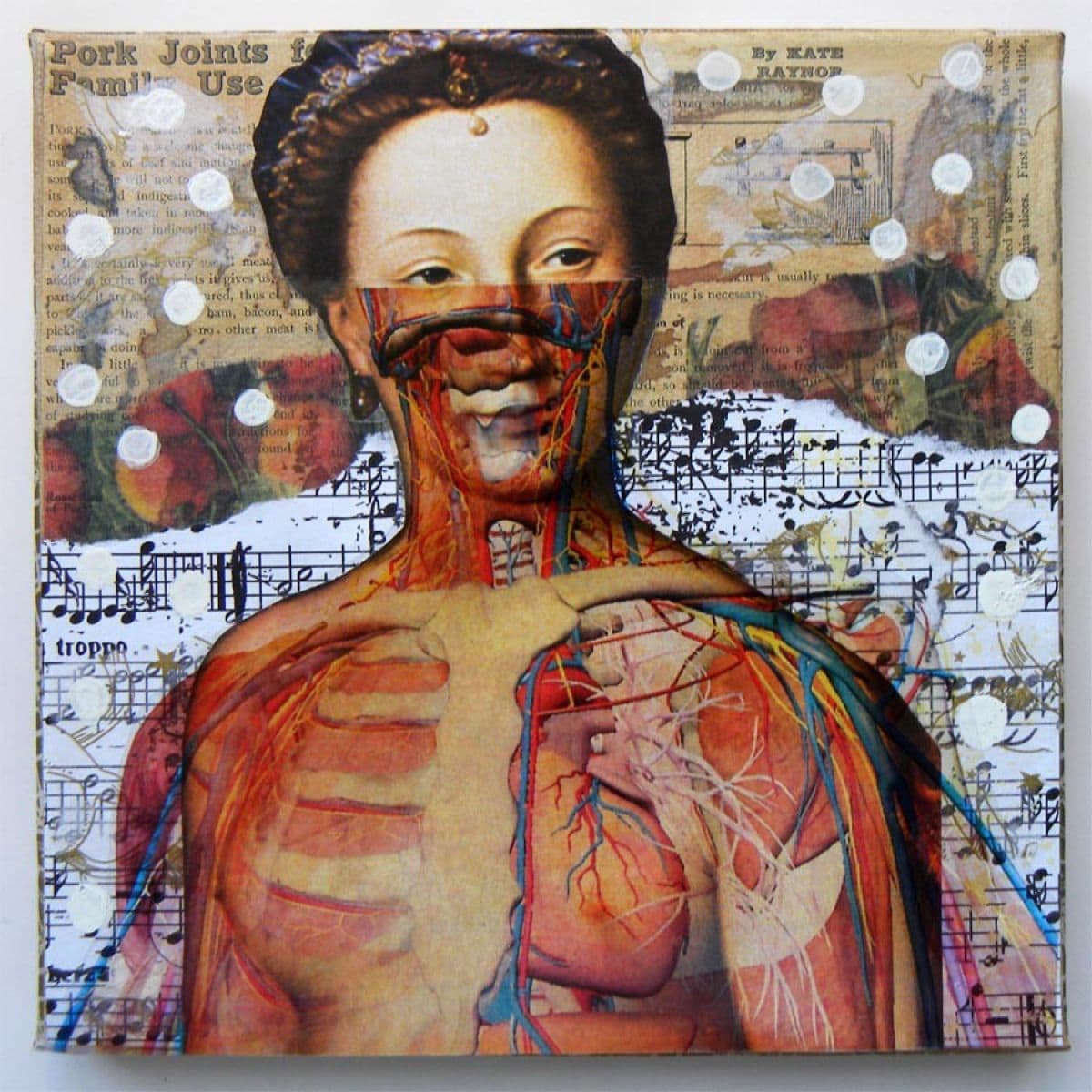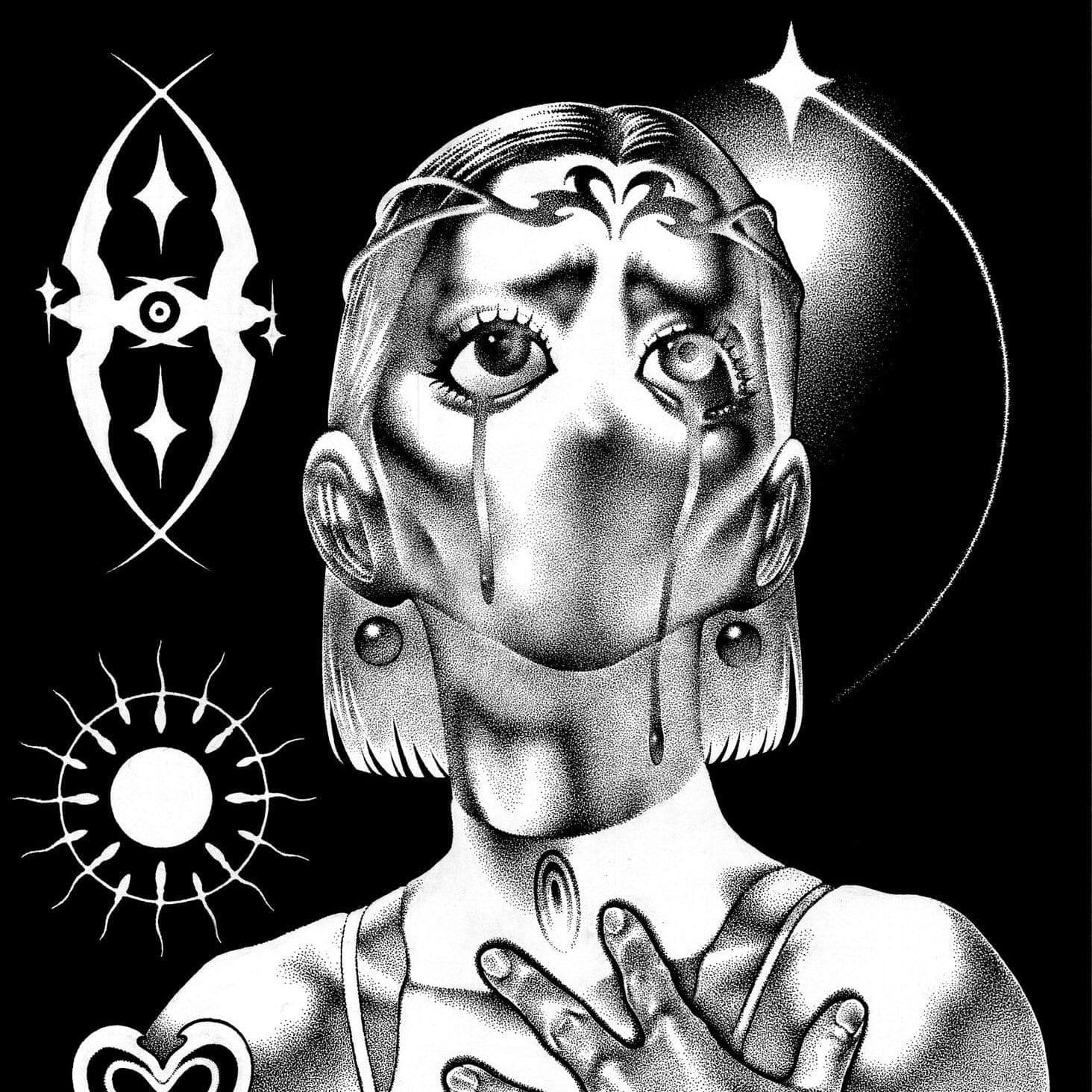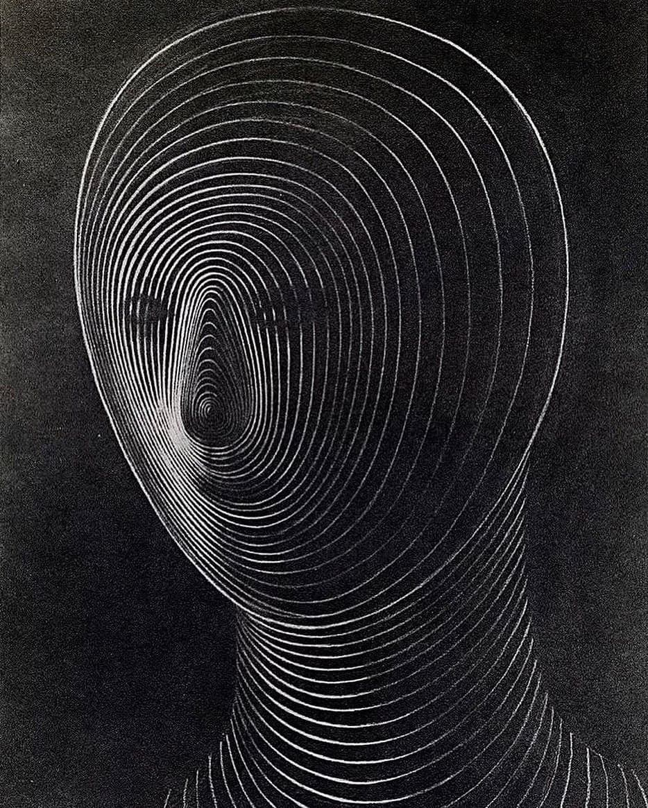 Black and white photograph of a woman's face taped to a wall