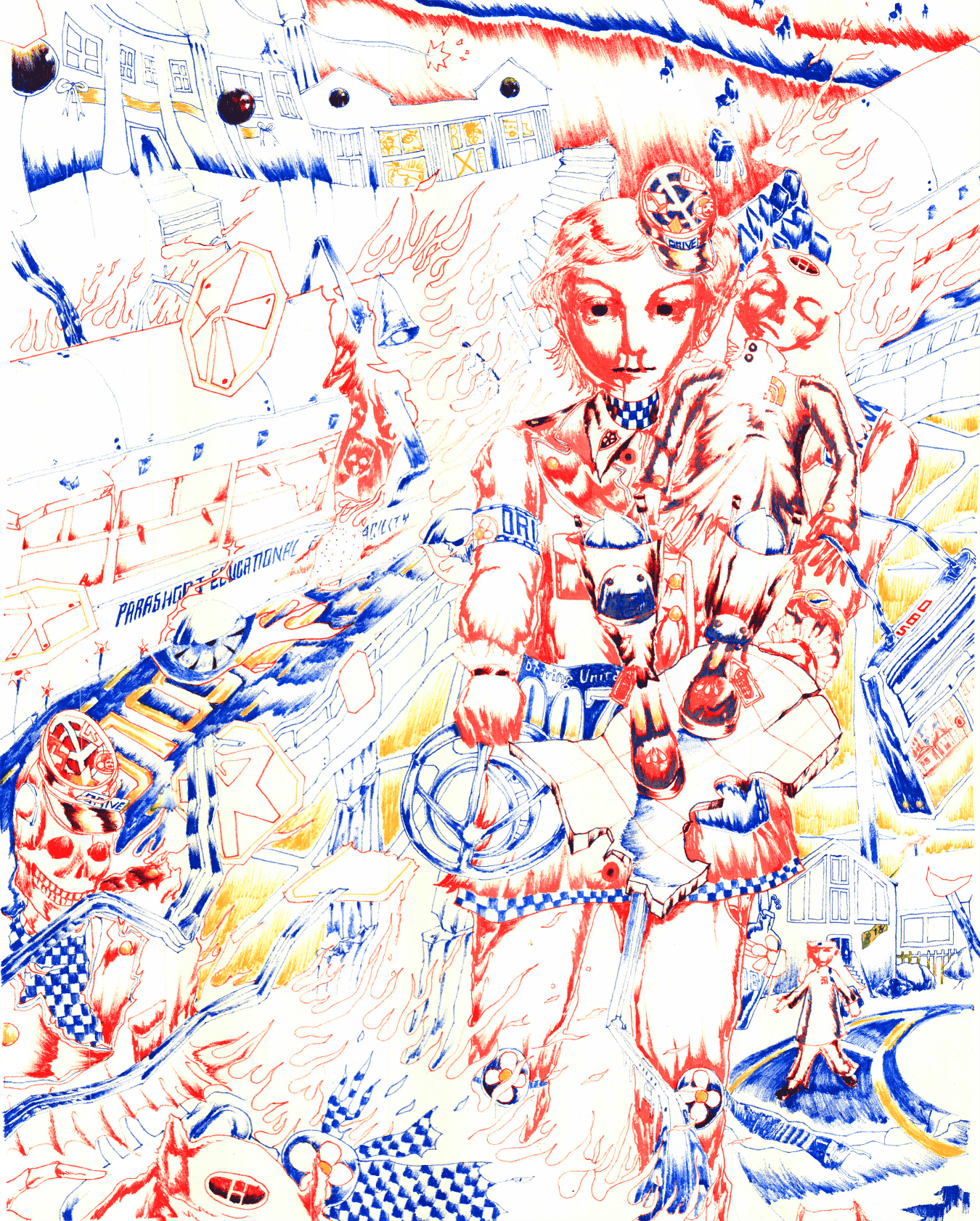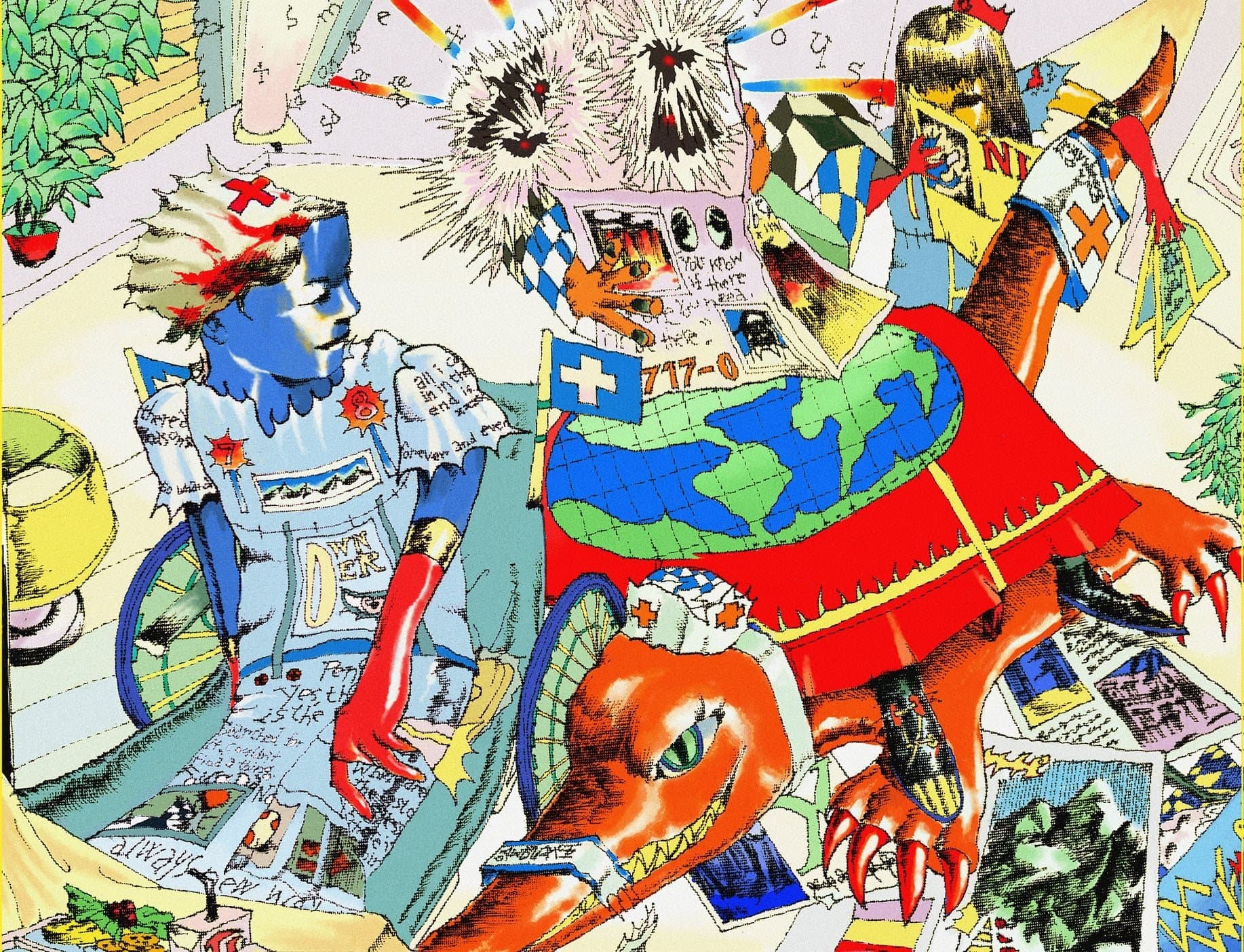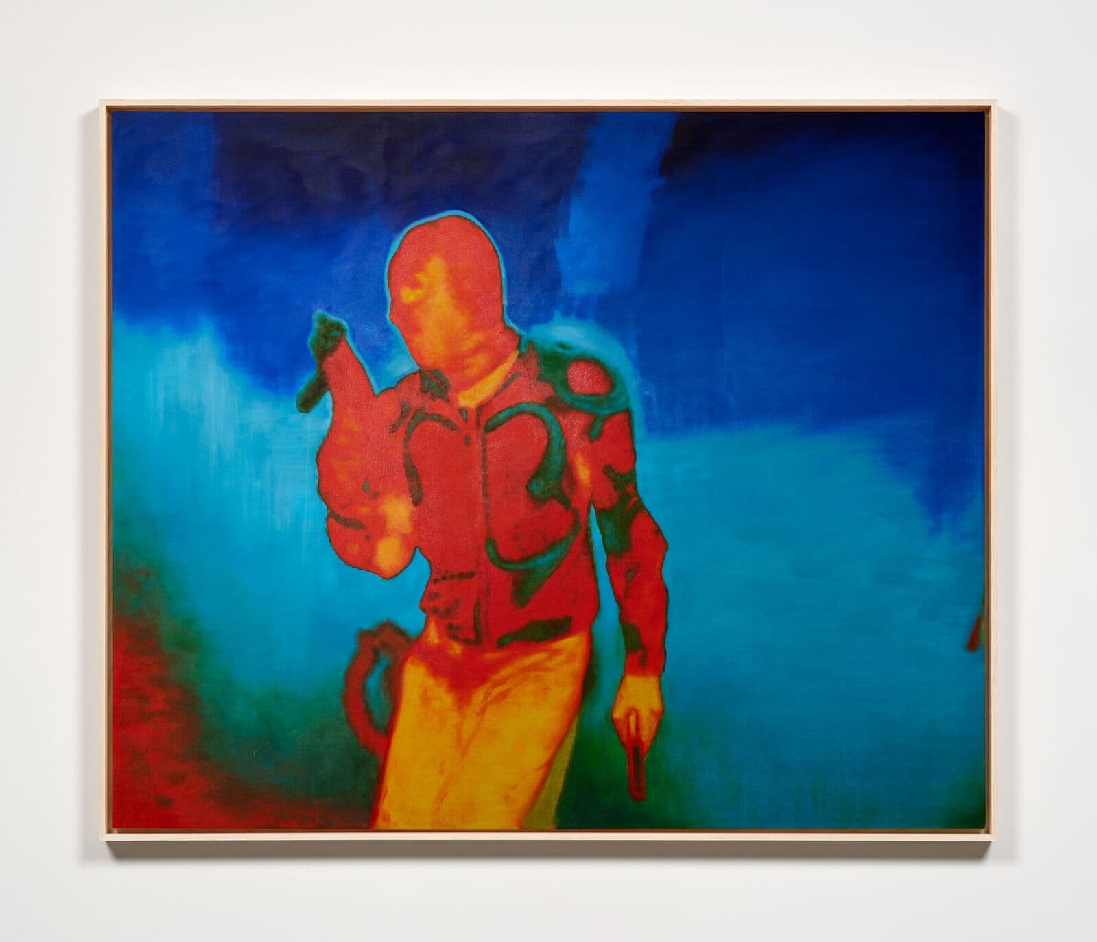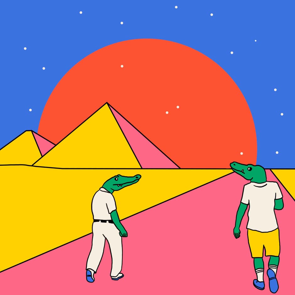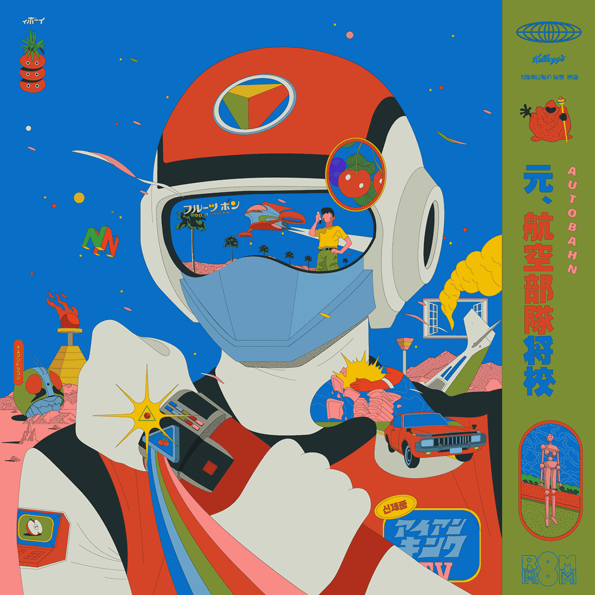 Red figure wearing yellow goggles against a blue background