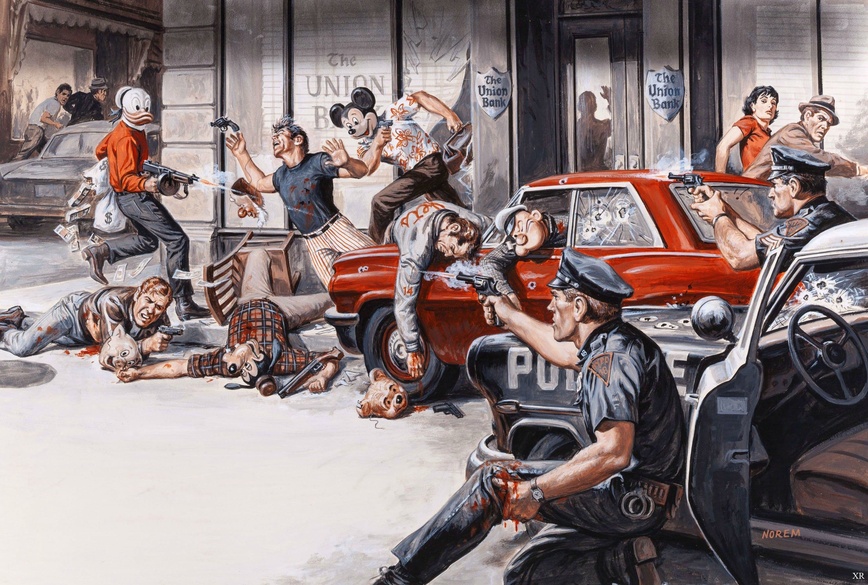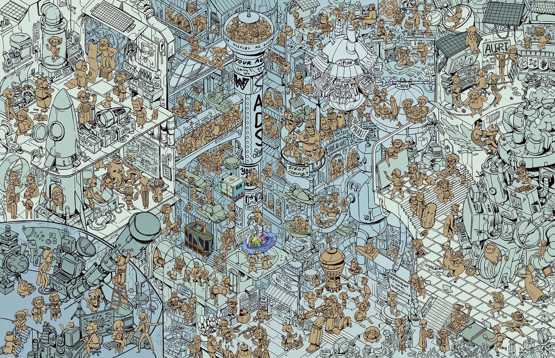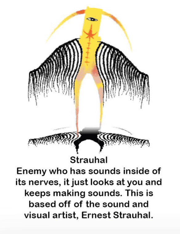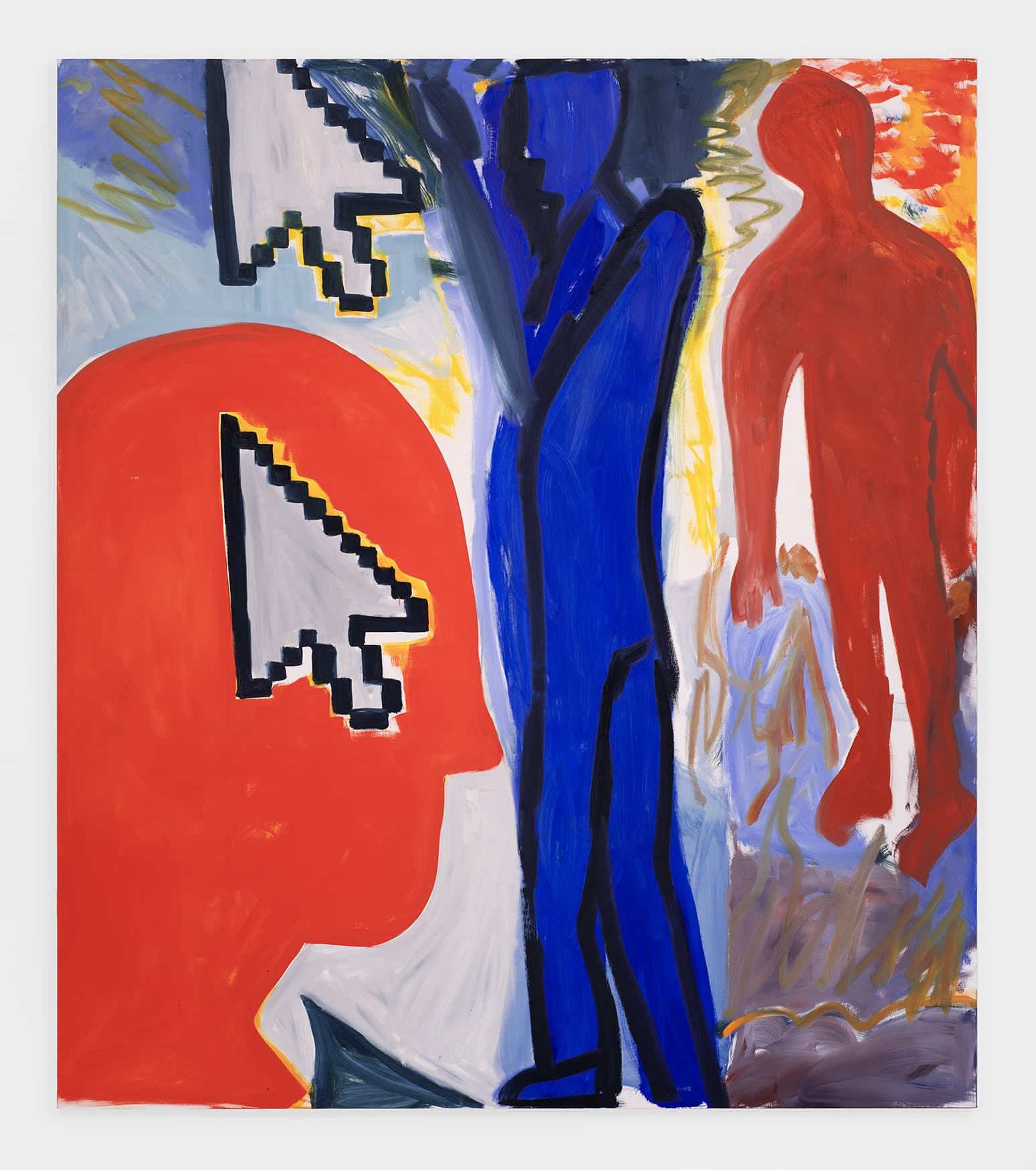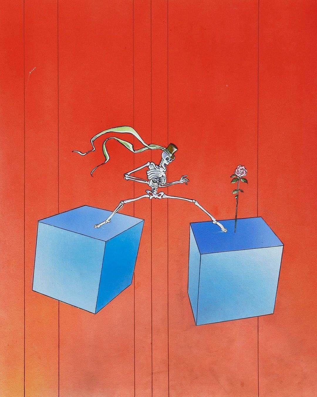 Red figure wearing yellow goggles against a blue background