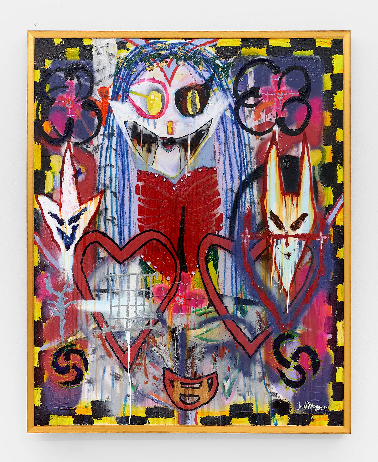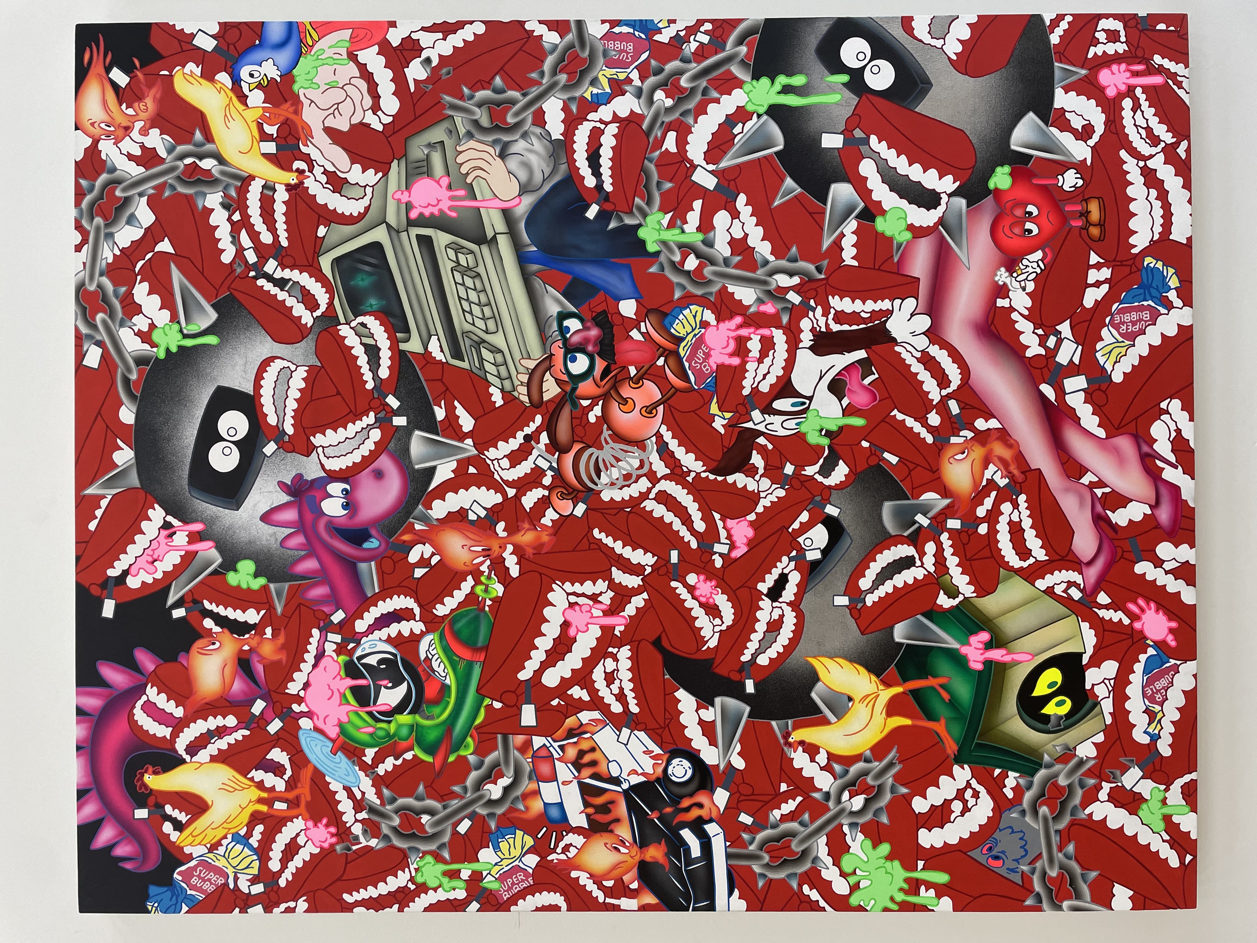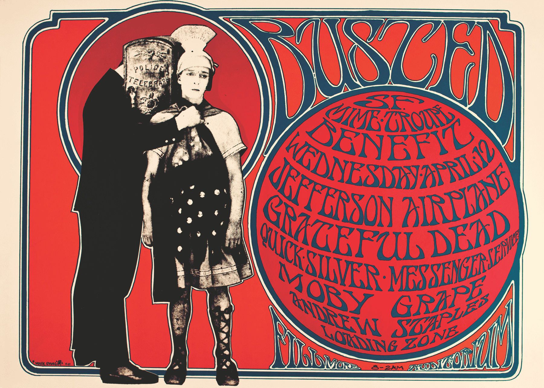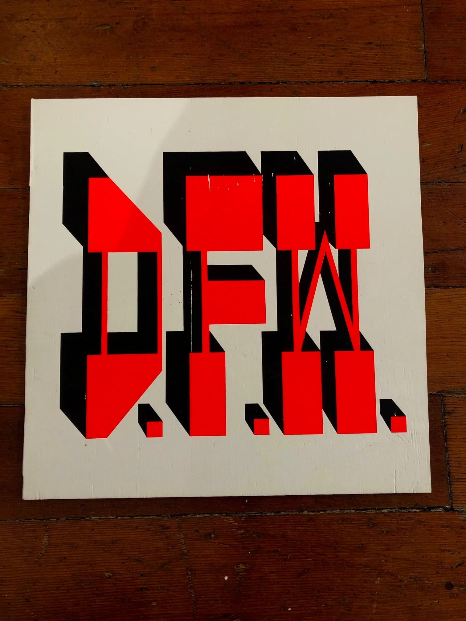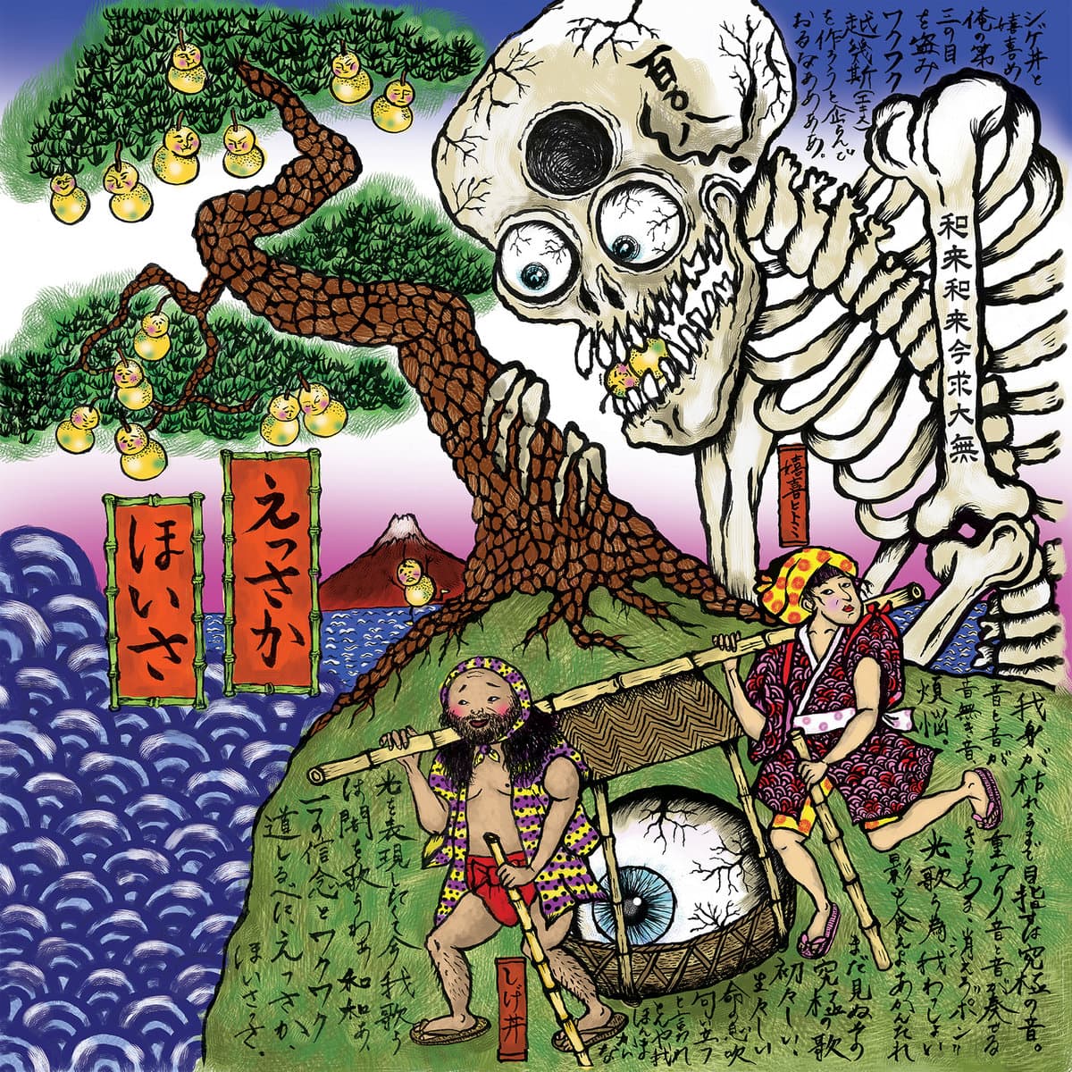 Red figure wearing yellow goggles against a blue background