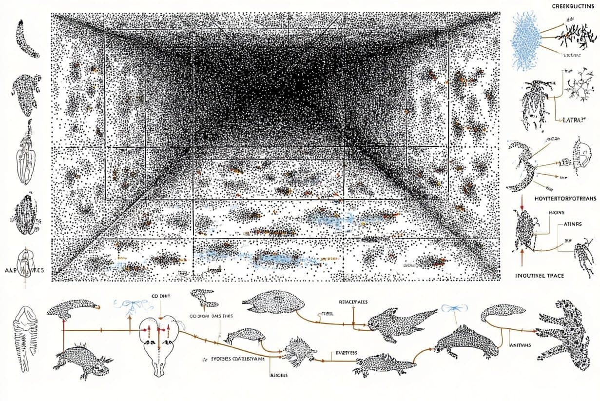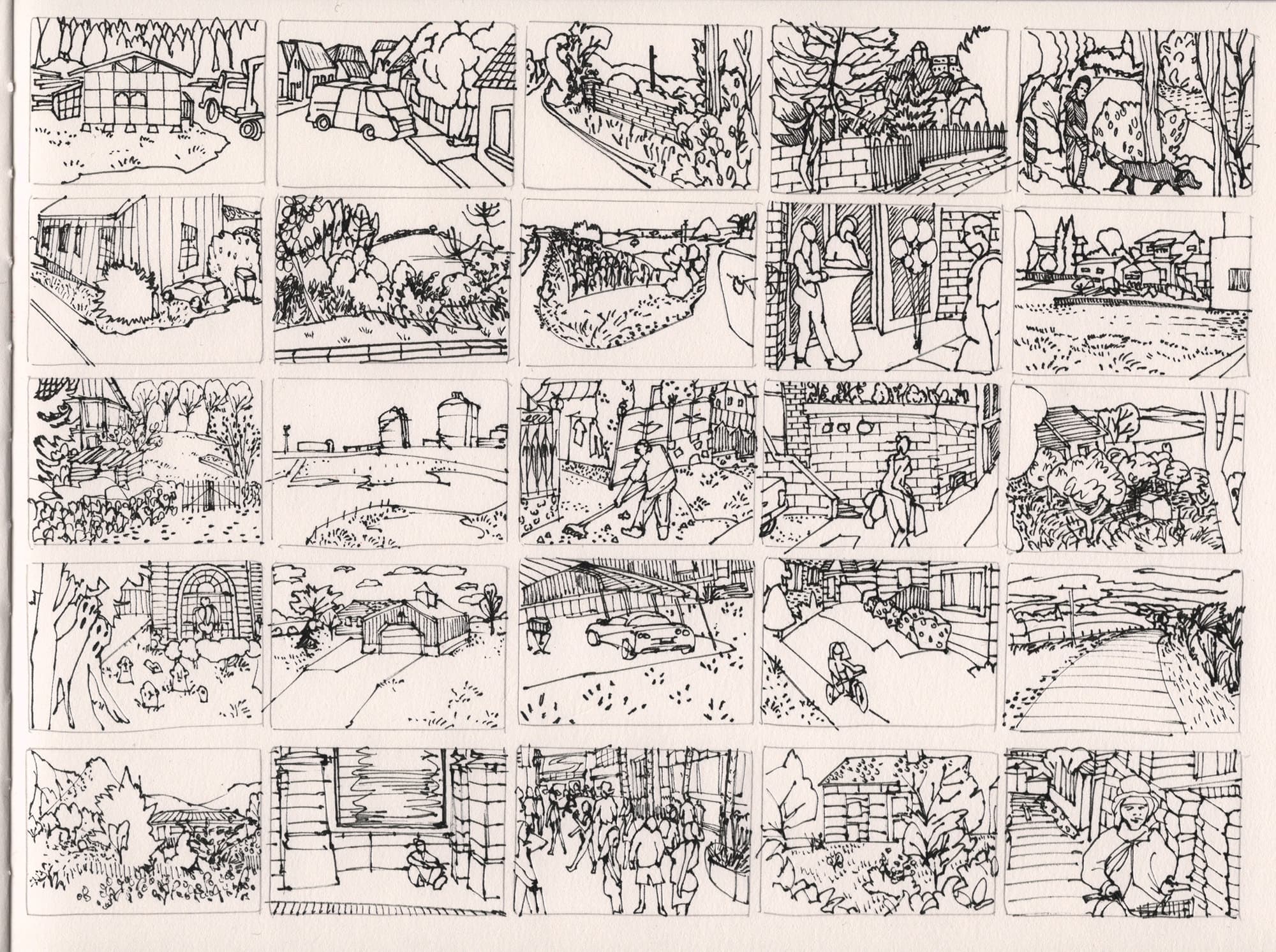 Grid of 30 Black Ink Sketches Depicting Suburban and Rural Scenes (Storyboard Format)
