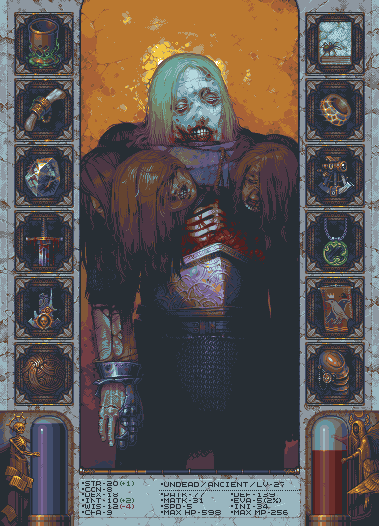 Pixelated Armored Figure with Spear and Shield on a Diagonal Striped Background