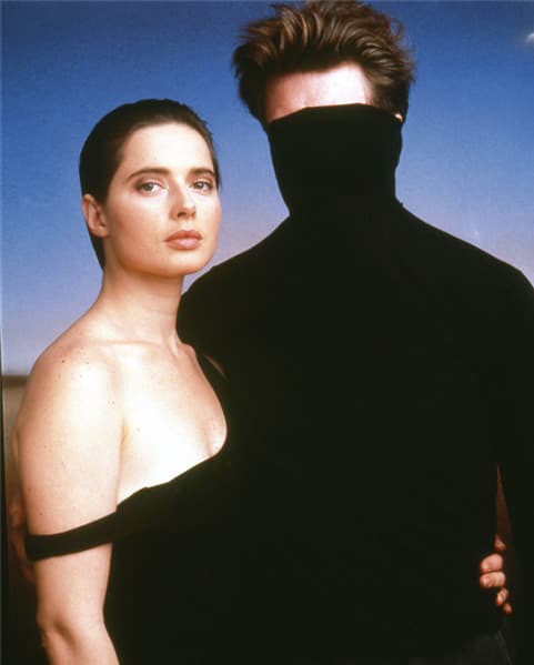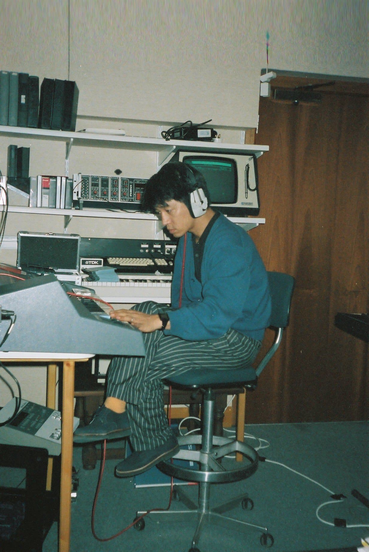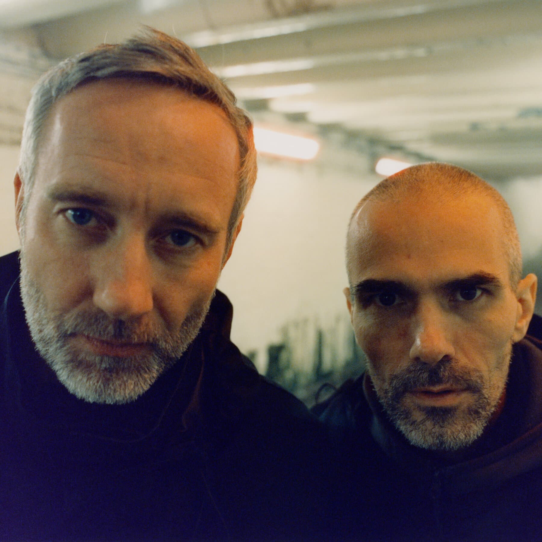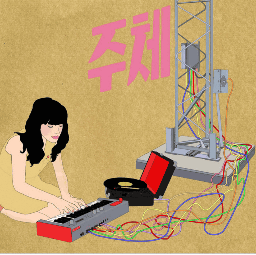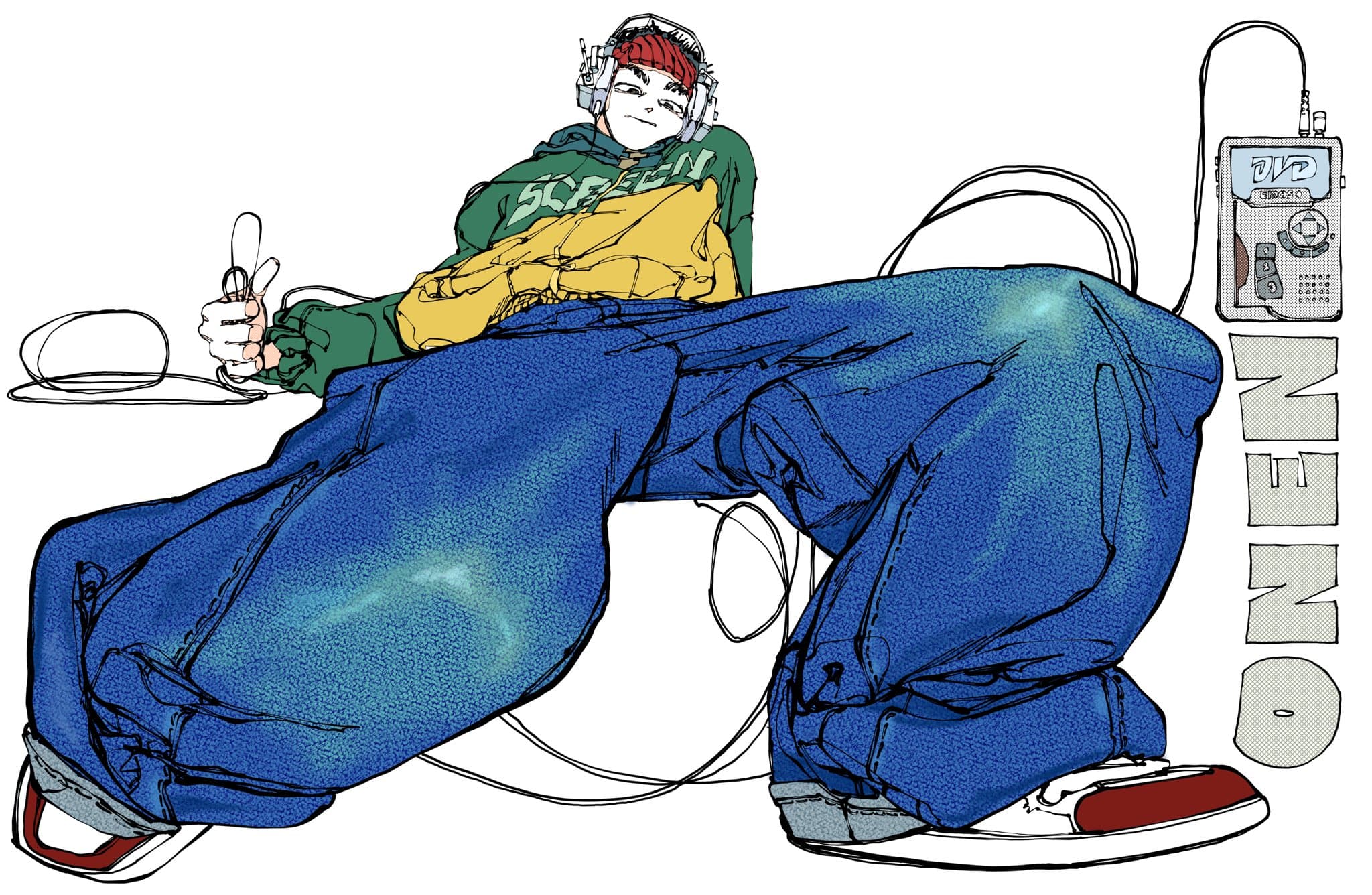 Photograph of a Man in a Hoodie Holding an Electronic Device Connected by a Coiled Cable to a Woman Wearing Headphones