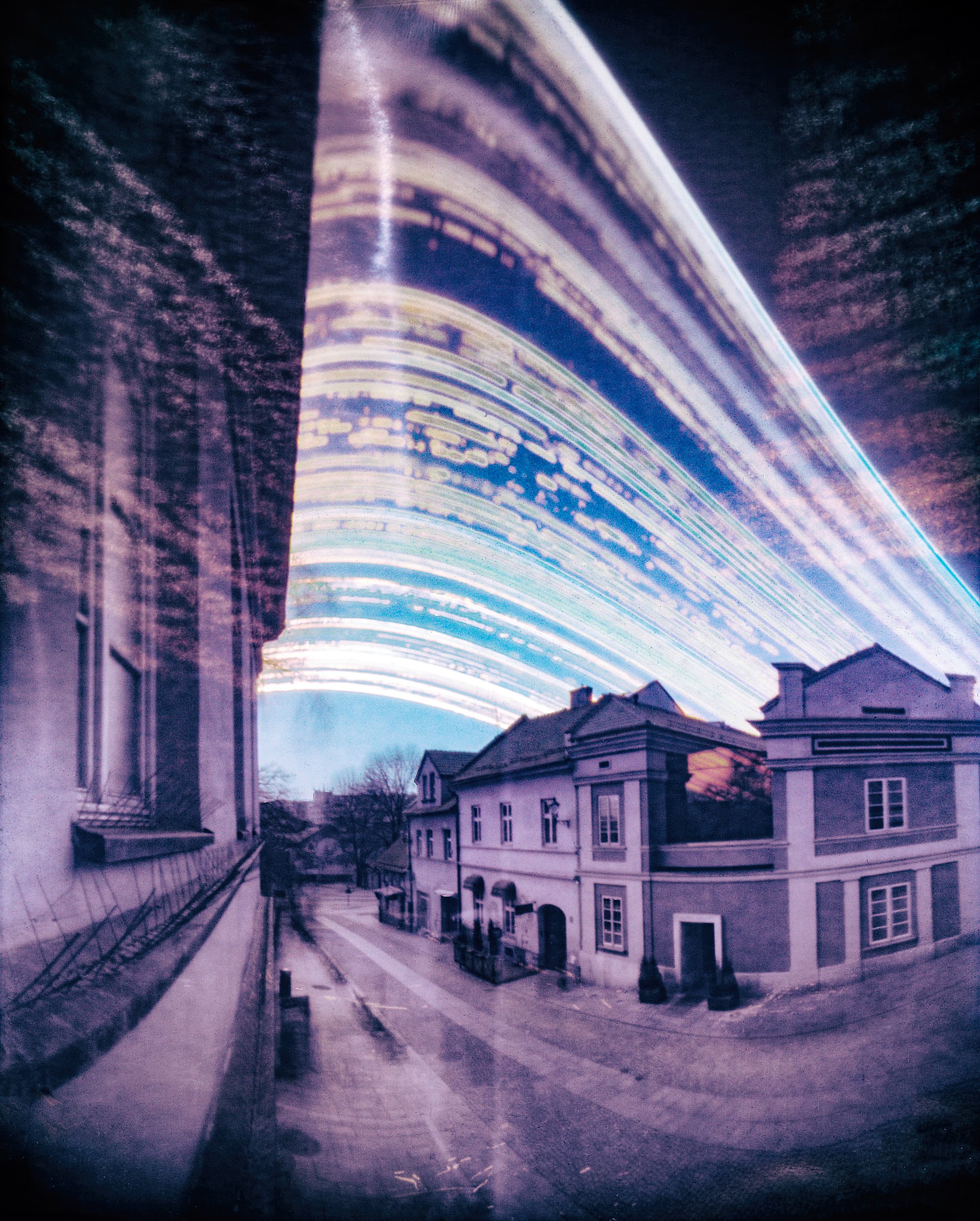 Photograph of White Liquid Streaks Flowing Down Dark Asphalt Road