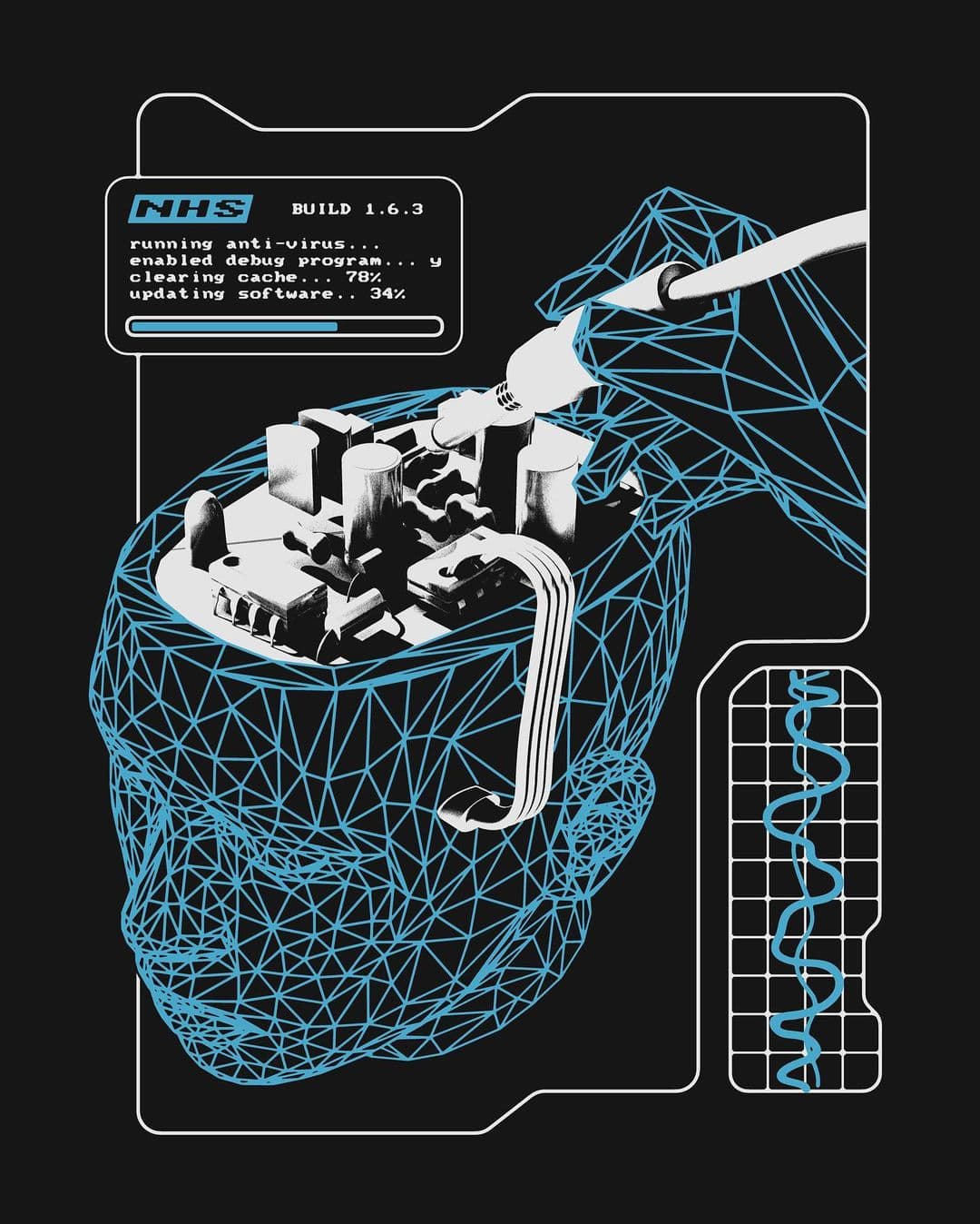 X-ray style image of a transparent Nintendo Game Boy with purple and blue internal lighting and overlaid text