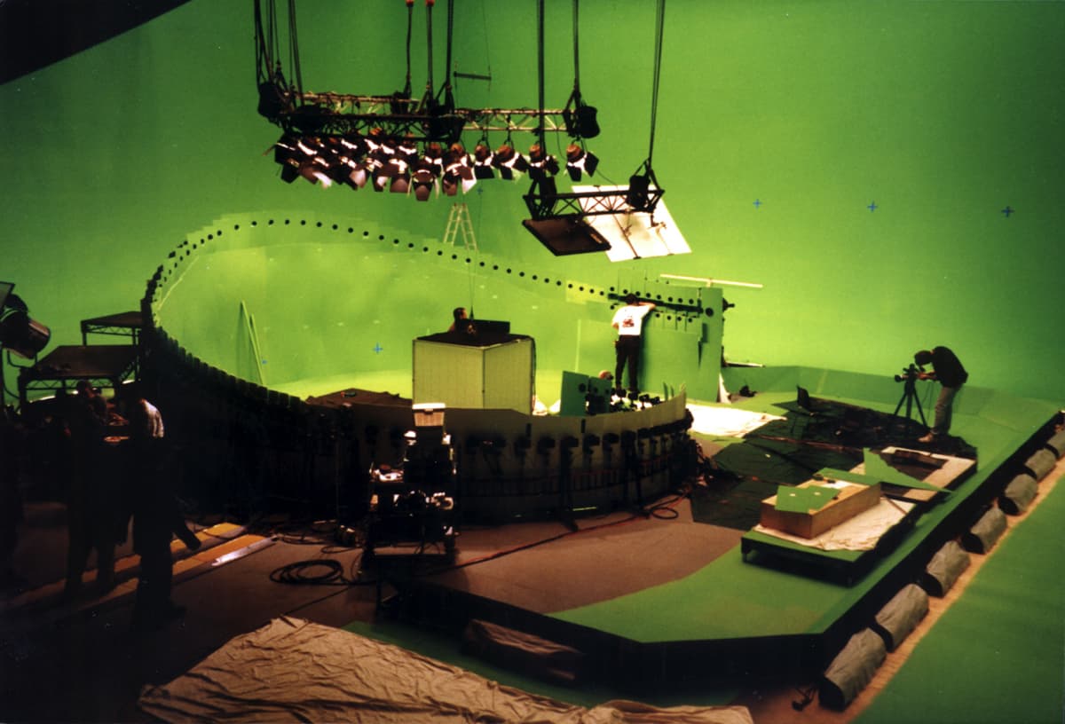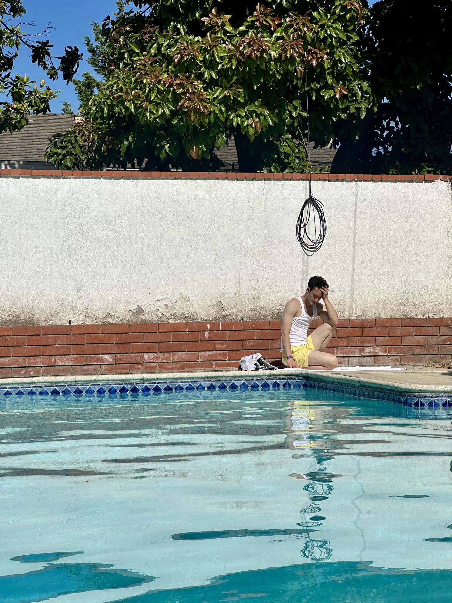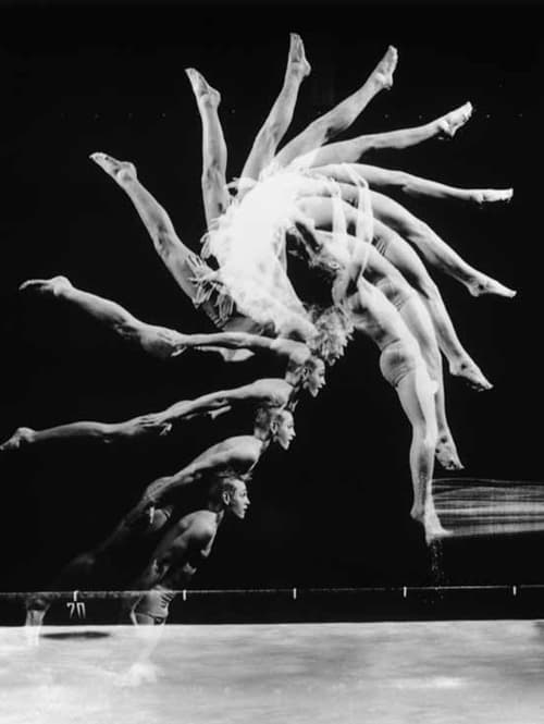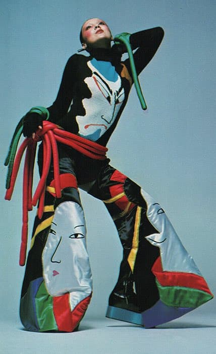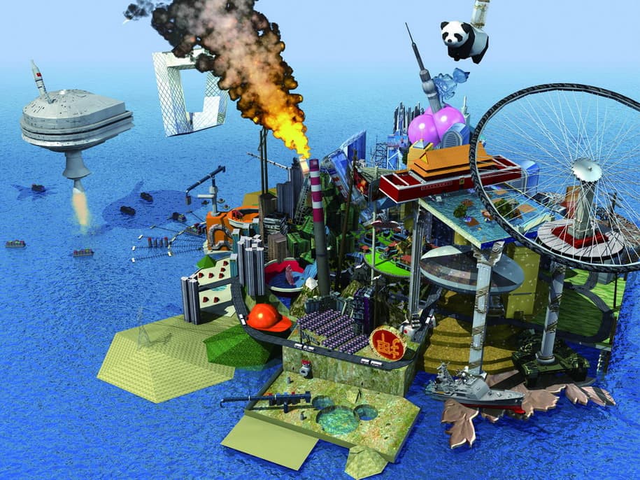Photograph of a person with green skin and red sunglasses being splashed by water against a blue background